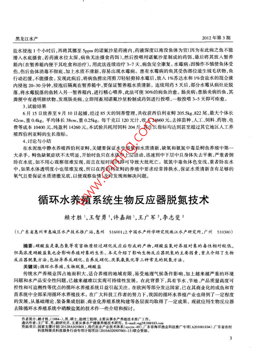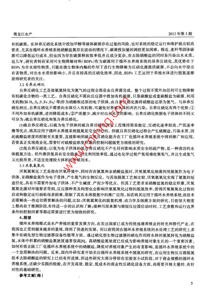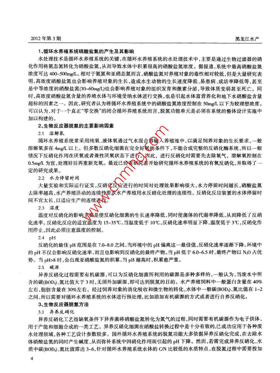 黑龍江水產(chǎn)2012年第3期鹽水浸泡1個小時后,再將其挪至5pm的諾氟沙星藥液內(nèi),藥液深度以淹沒魚體為宜(因為有此病之魚不能潛入水底攝食,若藥液水位太深,病魚無法攝食藥餌),然后投喂用諾氟沙星制成的藥餌最后將其放入暫養(yǎng)箱內(nèi)(在暫養(yǎng)箱內(nèi)便于其吃食和治療)。用此法連續(xù)治療3-7天,病魚完全康復(fù)。水霉病:因操作不慎使魚體受傷傷后魚體消毒不徹底,加上水質(zhì)不清新,容易出現(xiàn)水霉病?;加兴共〉聂~其受傷部位滋生絨毛狀物,魚行動遲緩,不能攝食。發(fā)現(xiàn)此病后將病魚撈出用剪刀輕輕剪掉水霉后放入1%蘇達(dá)水和1%食鹽水的混合液內(nèi)浸泡20-30分鐘,浸泡后隔離在暫養(yǎng)箱中,要保證暫養(yǎng)箱水質(zhì)清新。連續(xù)用藥5天后,部分水霉從病灶處脫落將水霉脫落的魚轉(zhuǎn)入另一暫養(yǎng)箱內(nèi),進(jìn)行精心喂養(yǎng),此法可使30%的病魚治愈。腸炎病惠腸炎病的魚,其糞便中有透明膿狀物,發(fā)現(xiàn)腸炎病,立即用畜用諾氟沙星粉制成藥餌進(jìn)行投哏,一般投喂3-5天即可痊愈3、試驗結(jié)果6月15日放養(yǎng)至9月10日起捕經(jīng)過85天的飼養(yǎng)管理,共收獲西伯利亞鱘205.5kg、822尾,最大個體42cm,重04kg。平均體長38cm,重025kg。每千克以120元計,收入24660元,去掉苗種、人工、飼料、藥物、電費等成本10400元,純盈利14260元。本試驗共耗用飼料204斤,其生長指標(biāo)均達(dá)到甚至超過其它地區(qū)人工養(yǎng)殖西伯利亞鱘的生長指標(biāo)。4、討論與小結(jié)在水泥池中靜水養(yǎng)殖西伯利亞鱘,關(guān)鍵要保證水中溶氧和水質(zhì)清新,缺氧和氨氮中毒是鱘魚養(yǎng)殖中第大殺手。鱘魚缺氧癥狀不太明顯,開始時魚只在水體中上層活動,迅速到中下層中且身體失去平衡,嚴(yán)重者倒臥在水底,如不用心觀察很難發(fā)現(xiàn),而且在短時間內(nèi)即可導(dǎo)致大批死亡。氨氮中毒魚體色變淺,重者臥在水中,如果水體透明度小也很難發(fā)現(xiàn),所以在西伯利亞鱘的養(yǎng)殖中要求經(jīng)常排換水,保證水質(zhì)清新含有足夠的氧氣且要保證水質(zhì)清澈見底,以便觀察魚情,及時發(fā)現(xiàn)和解決問題。循環(huán)水養(yǎng)殖系統(tǒng)生物反應(yīng)器脫氨技術(shù)賴才勝1,王智勇1,許嘉翔',王廣軍2,李志斐2(1廣東省惠州市惠城區(qū)水產(chǎn)技術(shù)推廣站,惠州516001;2中國水產(chǎn)科學(xué)研究院珠江水產(chǎn)研究所,廣州510380)摘要:硝酸鹽是氨態(tài)氮等有害物質(zhì)經(jīng)過硝化反應(yīng)后形成的產(chǎn)物,硝酸鹽氦對養(yǎng)殖對象的毒性相對較低但高濃度硝酸鹽氦也會影響?zhàn)B殖對象的生長。本文介紹了影響生物反應(yīng)器脫氮的主要因素,重點介紹了生物反應(yīng)器脫氨方法,包括異養(yǎng)反硝化、自養(yǎng)反硝化、厭氧氨氧化等三種常見的脫氮方法。關(guān)鍵詞:循環(huán)水養(yǎng)殖,生物脫氮,硝酸鹽傳統(tǒng)水產(chǎn)養(yǎng)殖業(yè)因占地面積大,適合養(yǎng)殖的地域有限,易受地理氣候條件影響,加上越來越嚴(yán)重的環(huán)境問題和水產(chǎn)品安全性問題,已越來越難以實現(xiàn)可持續(xù)性發(fā)展。在此背景下,具有節(jié)水、節(jié)地、產(chǎn)品質(zhì)量高度可控性和可追溯性等優(yōu)點的循環(huán)水養(yǎng)殖系統(tǒng)日益引起關(guān)注。在歐洲等部分發(fā)達(dá)國家,已在其商業(yè)化的成魚和育苗系統(tǒng)中全部采用循環(huán)水養(yǎng)殖技術(shù)。在廣大科技工作者的努力下,我國的循環(huán)水養(yǎng)殖產(chǎn)業(yè)也得到了一定程度的發(fā)展,從基礎(chǔ)理論裝備集成創(chuàng)新商業(yè)化養(yǎng)殖系統(tǒng)構(gòu)建等各層面均取得了一定成果。現(xiàn)就應(yīng)用生物反應(yīng)器去除循環(huán)水養(yǎng)殖系統(tǒng)中硝酸鹽氮的技術(shù)作一些介紹和探討才:4主,敗理程讀要變亦產(chǎn)養(yǎng)殖技術(shù)廣支撐計劃(2012BAD25B0)現(xiàn)代農(nóng)業(yè)產(chǎn)業(yè)技術(shù)體系特派員科技服務(wù)行動專項計劃項目(2010A020507001-13)聯(lián)合資助。東省海洋漁業(yè)科技推廣專項(A201001E04)廣東省農(nóng)村2012年第3期黑龍江水產(chǎn)1、循環(huán)水養(yǎng)殖系統(tǒng)硝酸鹽氮的產(chǎn)生及其影響水處理技術(shù)是循環(huán)水養(yǎng)殖系統(tǒng)的關(guān)鍵,在循環(huán)水養(yǎng)殖系統(tǒng)的水處理技術(shù)中,主要是通過生物過濾器的硝化作用將氨態(tài)氮轉(zhuǎn)化為硝酸鹽氮,從而導(dǎo)致水體中積累很高的硝酸鹽氮濃度。據(jù)報道系統(tǒng)中最高硝酸鹽氮濃度可達(dá)400-500mg/。相對于氨氮和亞硝態(tài)氮而言,硝酸鹽氮對養(yǎng)殖對象的毒性相對較低,但是大量研究表明高濃度硝酸鹽氮也會影響?zhàn)B殖對象的生長,造成水生動物的生長速度降低、易患病、成活率降低等,甚至是中等濃度的硝酸鹽氮(30-60mg/)也會影響?zhàn)B殖對象的組織發(fā)育和激素分泌,導(dǎo)致體質(zhì)變?nèi)跎踔了劳?。同時高濃度硝酸鹽氮含量的養(yǎng)殖水體與環(huán)境受納水體進(jìn)行交換,也是引起水體富營養(yǎng)化和地下水硝酸鹽含量超標(biāo)的因素之一。因此,研究者認(rèn)為將循環(huán)水養(yǎng)殖系統(tǒng)中的硝酸鹽氮濃度控制在50mg/L以下為較理想濃度??梢哉J(rèn)為,對于一個真正“零交換”的閉合循環(h