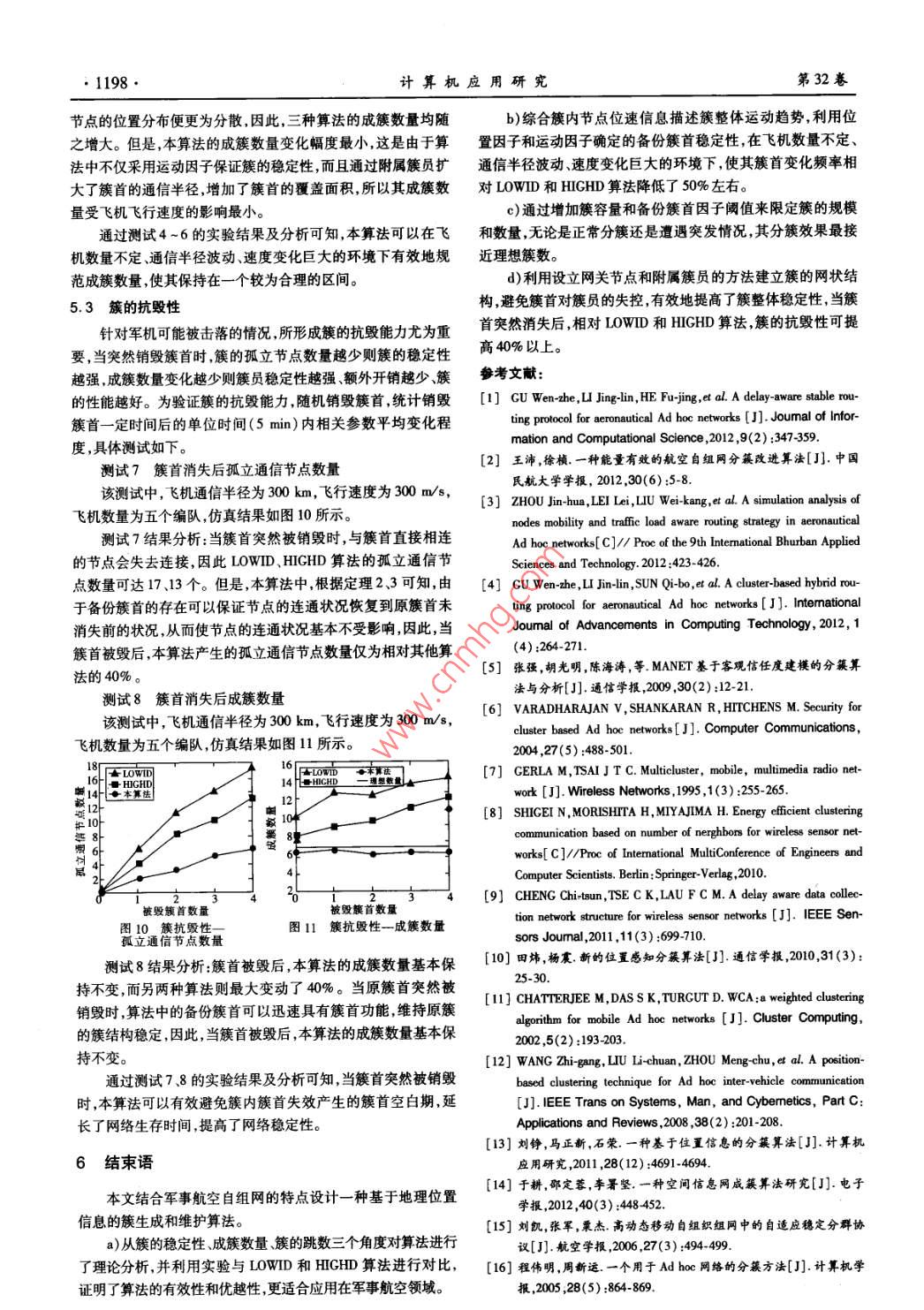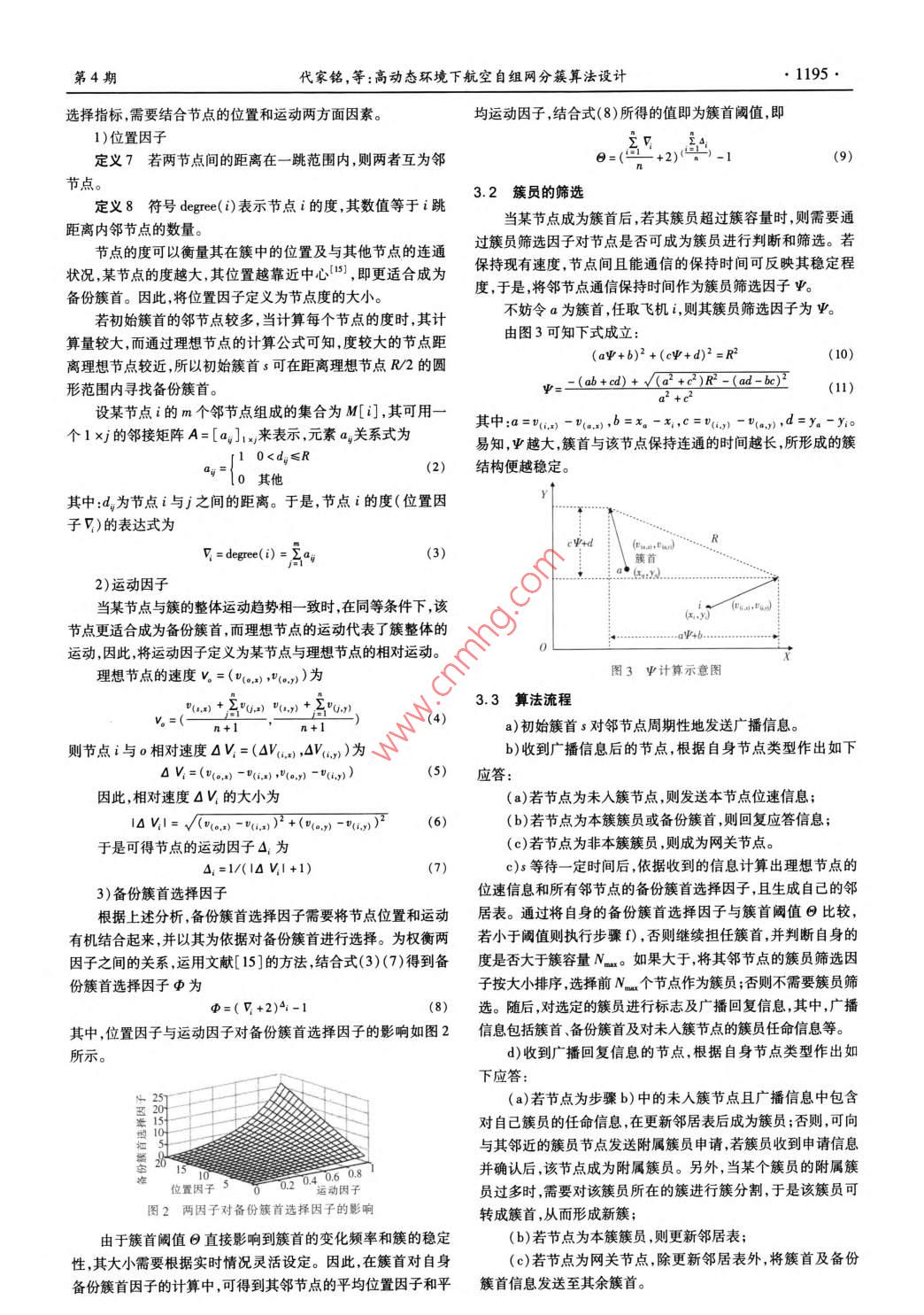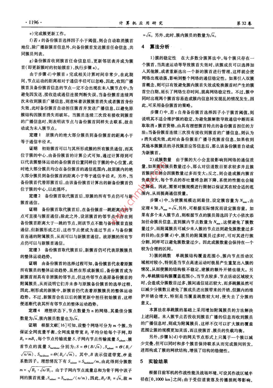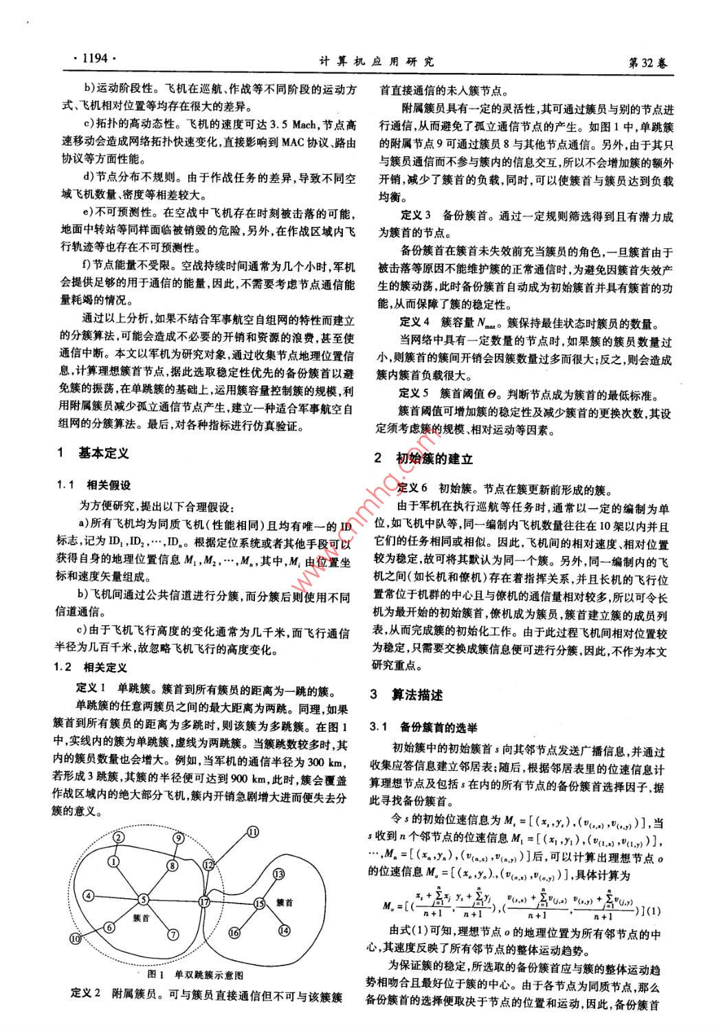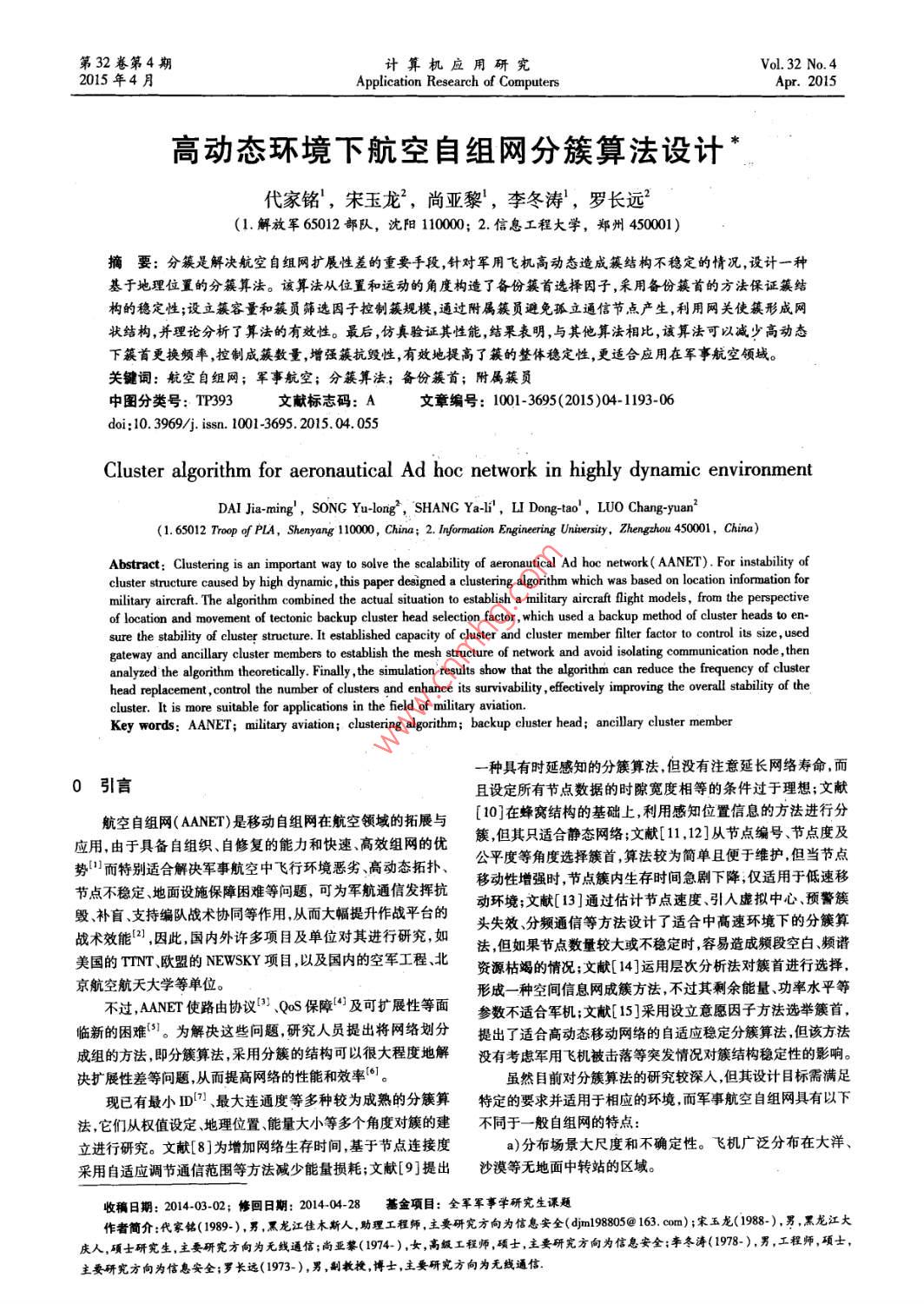 第32卷第4期計算機應(yīng)用研究Vol 32 No 42015年4月Application Research of ComputersApr.2015高動態(tài)環(huán)境下航空自組網(wǎng)分簇算法設(shè)計代家銘!,宋玉龍2,尚亞黎,李冬濤,羅長遠2(1.解放軍65012部隊,沈陽1100002.信息工程大學(xué),鄭州45000摘要:分簇是解決航空自組網(wǎng)擴展性差的重要手段,針對軍用飛機高動態(tài)造成簇結(jié)構(gòu)不穩(wěn)定的情況,設(shè)計一種基于地理位置的分簇算法。該算法從位置和運動的角度構(gòu)造了備份簇首選擇因子,采用備份簇首的方法保證簇結(jié)構(gòu)的穩(wěn)定性;設(shè)立簇容量和簇員篩選因子控制簇規(guī)模,通過附屬簇員避免孤立通信節(jié)點產(chǎn)生,利用網(wǎng)關(guān)使簇形戍網(wǎng)狀結(jié)構(gòu),并理論分析了算法的有效性。最后,仿真驗證其性能,結(jié)果表明,與其他算法相比,該算法可以減少高動態(tài)下簇首更換頻率控制成簇數(shù)量,增強簇抗毀性,有效地提高了簇的整體穩(wěn)定性,更適合應(yīng)用在軍事航空領(lǐng)域。關(guān)鍵詞:航空自組網(wǎng);軍事航空;分簇算法;備份簇首;附屬簇員中圖分類號:TP93文獻標志碼:A文章編號:1001-3695(2015)04-1193-06doi:10.3969/jiss.10013695.2015.04.055Cluster algorithm for aeronautical Ad hoc network in highly dynamic environmentDAI Jia-ming, SONG Yu-long, SHANG Ya-li,LI(1. 65012 Troop of PLA, Shenyang 110000, China; 2. Information Engineering University, Zhengzhou 450001, China)Abstract: Clustering is an important way to solve the scalability of aeronautical Ad hoc network( AANET). For instability ofcluster structure caused by high dynamic, this paper designed a clustering algorithm which was based on location information formilitary aircraft. The algorithm combined the actual situation to establish a military aircraft flight models, from the perspectiveof location and movement of tectonic backup cluster head selection factor, which used a backup method of cluster heads to en-sure the stability of cluster structure. It established capacity of cluster and cluster member filter factor to control its size, usedgateway and ancillary cluster members to establish the mesh structure of network and avoid isolating communication node, thenanalyzed the algorithm theoretically. Finally, the simulation results show that the algorithm can reduce the frequency of clusterhead replacement, control the number of clusters and enhance its survivability, effectively improving the overall stability of thecluster. It is more suitable for applications in the field of military aviationKey words: AANET; military aviation; clustering algorithm; backup cluster head; ancillary cluster member種具有時延感知的分簇算法但沒有注意延長網(wǎng)絡(luò)壽命,而0引言且設(shè)定所有節(jié)點數(shù)據(jù)的時隙寬度相等的條件過于理想;文獻航空自組網(wǎng)(ANET)是移動自組網(wǎng)在航空領(lǐng)域的拓展與[10]在蜂窩結(jié)構(gòu)的基礎(chǔ)上,利用感知位置信息的方法進行分應(yīng)用,由于具備自組織自修復(fù)的能力和快速高效組網(wǎng)的優(yōu)簇,但其只適合靜態(tài)網(wǎng)絡(luò);文獻[11)從節(jié)點編號、節(jié)點度及勢而特別適合解決軍事航空中飛行環(huán)境惡劣高動態(tài)拓撲、公平度等角度選擇簇首,算法較為簡單且便于維護但當(dāng)節(jié)點節(jié)點不穩(wěn)定地面設(shè)施保障困難等問題,可為軍航通信發(fā)揮抗移動性增強時,節(jié)點簇內(nèi)生存時間急劇下降僅適用于低速移動環(huán)境;文獻[13]通過估計節(jié)點速度、引入虛擬中心、預(yù)警簇毀、補盲支持編隊戰(zhàn)術(shù)協(xié)同等作用,從而大幅提升作戰(zhàn)平臺的頭失效分頻通信等方法設(shè)計了適合中高速環(huán)境下的分簇算戰(zhàn)術(shù)效能2,因此國內(nèi)外許多項目及單位對其進行研究如法,但如果節(jié)點數(shù)量較大或不穩(wěn)定時,容易造成頻段空白頻譜美國的TN歐盟的 NEWSKY項目,以及國內(nèi)的空軍工程、北資源枯竭的情況;文獻[14]運用層次分析法對篪首進行選擇京航空航天大學(xué)等單位形成一種空間信息網(wǎng)成簇方法,不過其剩余能量、功率水平等不過ANET使路由協(xié)議、Q0s保障“及可擴展性等面參數(shù)不適合軍機:文獻[5].用設(shè)立意愿因子方法選舉簇首臨新的困難。為解決這些問題研究人員提出將網(wǎng)絡(luò)劃分提出了適合高動態(tài)移動網(wǎng)絡(luò)的自適應(yīng)穩(wěn)定分簇算法但該方法成組的方法即分簇算法采用分簇的結(jié)構(gòu)可以很大程度地解沒有考慮軍用飛機被擊落等突發(fā)情況對簇結(jié)構(gòu)穩(wěn)定性的影響決擴展性差等問題,從而提高網(wǎng)絡(luò)的性能和效率雖然目前對分簇算法的研究較深入,但其設(shè)計目標需滿足現(xiàn)已有最小、最大連通度等多種較為成熟的分簇算特定的要求并適用于相應(yīng)的環(huán)境而軍事航空自組網(wǎng)具有以下法,它們從權(quán)值設(shè)定地理位置能量大小等多個角度對簇的建不同于一般自組網(wǎng)的特點:立進行研究。文獻[8]為增加網(wǎng)絡(luò)生存時間基于節(jié)點連接度a)分布場景大尺度和不確定性。飛機廣泛分布在大洋、采用自適應(yīng)調(diào)節(jié)通信范圍等方法減少能量損耗;文獻[9]提出沙漠等無地面中轉(zhuǎn)站的區(qū)域。收稿日期:2014-03-02;修回日期:201404-28基金項目:全軍軍事學(xué)研究生課題作者簡介:代家銘(1989-),男,黑龍江佳木斯人,助理工程師,主要研究方向為信息安全(dj