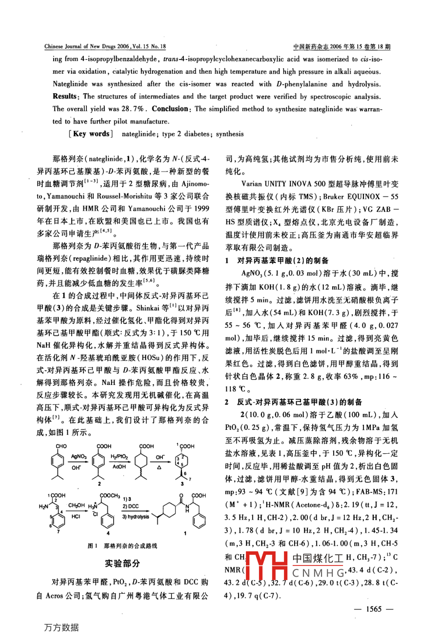 Chinese Jounal of New Drugs 2006 Vol.15 No. 18中國新藥雜志2006年第15婁第18期的藥物,釋藥系統(tǒng)應(yīng)以延長制劑在胃腸道上部的滯2000,3(3);147 -148.留為設(shè)計的主方向。胃滯留時間可認(rèn)為是影響楚個2]陸偉躍,潘俊,劉敏.阿昔洛韋生物粘附微球的動物胃粘膜表釋藥系統(tǒng)轉(zhuǎn)運時間和藥物吸收的主要因素,所以設(shè)面粘附能力和體外級釋效果[J].中國藥學(xué)雜志,000.35(5):313 -317.法提高阿昔洛韋制劑在胃腸道上部的滯留時間和藥[3] WILSON CG, WASHINCTON N, HARDY JC ,et al. The influence物在胃腸道上部的充分釋放,會提高藥物生物利用of food on the absorption of acyelovir: a pharmacokinetic and scinti-度,這對制劑學(xué)的研究具有指導(dǎo)意義。graphic asessmsent [J]. Int J Pharm, 1987, 38(1/3);221 -225. .研究藥物胃腸道吸收的試驗方法,大致可分為4] 崔升森,趙春順,何仲貴,等吲達(dá)帕胺大鼠在體胃、小腸的吸收體外試驗法、在體試驗法和體內(nèi)試驗法等"。目動力學(xué)研究[J]沈陽藥科大學(xué)學(xué)報,2002 ,19(3) :161 - 164.前,動物與人的吸收相關(guān)性已被許多文獻(xiàn)所證5]梁桂賢,高山,李梅.鹽酸地爾硫革大鼠腸道吸收部位研究實[9]) ,其中離體試驗破壞了胃腸道的真實生存環(huán)[J].西北藥學(xué)雜志,2002 ,17(3):117 -119.境,結(jié)果與實際吸收可能產(chǎn)生較大差異;而在體試驗[6] 張向榮,潘衛(wèi)三. 丹參酚酸A在大鼠小腸的吸收動力學(xué)研究[小.沈陽藥科大學(xué)學(xué)報,2002 ,19(1):14-17.較接近正常生理條件,現(xiàn)已發(fā)展有多種方法,如腸段[7]姬靜,方曉玲,崔強.蓁普生鈉在大鼠的腸吸收動力學(xué)[J].復(fù)結(jié)扎、腸道插管、腸血管灌流等,對于不同性質(zhì)的藥且學(xué)報(醫(yī)學(xué)版) ,2002 ,29(2) :98 - 101.物均可通過不同的方法進(jìn)行研究。[8] YU Lx, LIPKA E, CRISON JR, e al. Tramspont appraeches to[作者簡介]劉宏 飛(1979-),男,博士后,主要從事液體the biopharmacuical design of oral drug delivery systems: predic-綴控釋制劑的研究。聯(lián)系電話:(024) 23953241 , E-mail: li-tion of intestinal abopion[J]. Ado Drug Del Rev, 1996, 19uhongfei1979@ sohu. com。(3):359 -376.[通訊作者]潘衛(wèi)三(1958-),男,教授,博士生導(dǎo)師,主要 .[9] SCHURCERS N, BUDENDUK J, TUKKER JI, et al. Compari-從事藥物制劑研究。聯(lián)系電話:(024)23953241 , E-mail:ppw-son of four experimental techniques for studying drug absorplion ki-wss@ 163. com。netics in the anesthelizred rt in siu[J]. J Pharm Sci, 1986. 75(2)117-119.[參考文獻(xiàn)]編輯:周卓/接受日期:2006 -04 -10[1] 高永榮.阿昔洛韋的制劑及其劑型研究進(jìn)展[J]中國藥師,那格列奈的合成'安林坤',郭新東',宋曉虹“,黃仲立’,卜憲章',黃志紓',古練權(quán)'(中山大學(xué)1藥學(xué)院,2生命科學(xué)院,3測試中心,廣州510080)[摘要] 目的:合成抗2型糖尿病藥物那格列奈。方法:以對異丙基苯甲醛為原料,經(jīng)氧化、催化氫化、在高溫高壓堿性條件下,將順式對異丙基環(huán)已甲酸異構(gòu)化為反式異構(gòu)體,然后與D-苯丙氨酸甲酯鹽酸鹽縮合、水解,合成那格列奈。結(jié)果:反應(yīng)中間體以及目標(biāo)產(chǎn)物的化學(xué)結(jié)構(gòu)均經(jīng)過了光譜分析確證,反應(yīng)總收率為28.7%。結(jié)論:本方法步驟簡單,易于工業(yè)化生產(chǎn)。[關(guān)鍵詞]那格列奈;2型糖尿病;藥物合成[中圖分類號] R977. 1S;R914.5 [文獻(xiàn)標(biāo)識碼] A [文章編號] 1003 -3734(2006)18 -1564 -03Synthesis of nateglinideAN Lin-kun' ,GU0 Xin -dong' ,SONG Xiao-hong2 , HUANG Zhong-li' ,BU Xian-zhang' , HUANG Zhi-shu' ,CU Lian-quan'(1 School of Pharmaceutical Sciences, 2 College of Life Sciences .3 InstrumentalAnalysis and Research Cener, Sun Yat-Sen Universi中國煤化工)[ Abstract] Objective :To synthesize nateglinide, an aMHCNMH Gods: Suar.●基金項目:廣東省自然科學(xué)基金(4300235)一1564一Chinese Joumal of New Drugs 2006 ,Vol.15 No. 18中國新藥雜志2006年第15卷第18期ing from 4- isopropylbenzaldehyde , trans 4-isopropyleyclohexanecarboxylic acid was isomerized to cis-iso-mer via oxidation , catalytic hydrogenation and then high temperature and high pressure in alkali aqueous.Nateglinide was synthesized after the cis-isomer was reacted with D-phenylalanine and hydrolysis.Results: The structures of intermediates and the target product were verified by spectroscopic analysis.The overall yield was 28. 7% . Conclusion: The simplified method to synthesize nateglinide was' warran-ted to have further pilot manufacture.[Key words] nateglinide; type 2 diabetes; synthesis那格列奈( nateglinide,1) ,化學(xué)名為N-(反式4-司,為高純氫;其他試劑均為市售分析純,使用前未異丙基環(huán)己基羰基)-_D-苯丙氨酸,是一種新型的餐純化。時血糖調(diào)節(jié)劑1-51 ,適用于2型糖尿病,由Ajinomo-Varian UNITY INOVA 500型超導(dǎo)脈沖傅里葉變to, Yamanouchi和Roussel-Morishitu 等3家公司聯(lián)合換核磁共振儀(內(nèi)標(biāo)TMS) ; Bruker EQUINOX - 55研制開發(fā),由HMR公司和Yamanouchi公司于1999型傅里葉變換紅外光譜儀(KBr壓片);VG ZAB -年在日本上市,在歐盟和美國也已上市。我國也有HS型質(zhì)譜儀;X,型熔點儀,北京光電設(shè)備廠制造,多家公司申請生產(chǎn)(4.51。溫度計使用前未校正;高壓釜為南通市華安超臨界那格列奈為D-苯丙氨酸衍生物,與第一代產(chǎn)品.萃取有限公司制造。瑞格列奈( repaginide)相比,其作用更迅速,持續(xù)時1對異丙基苯甲酸(2)的制備間更短,能有效控制餐時血糖,效果優(yōu)于磺脲類降糖AgNO2