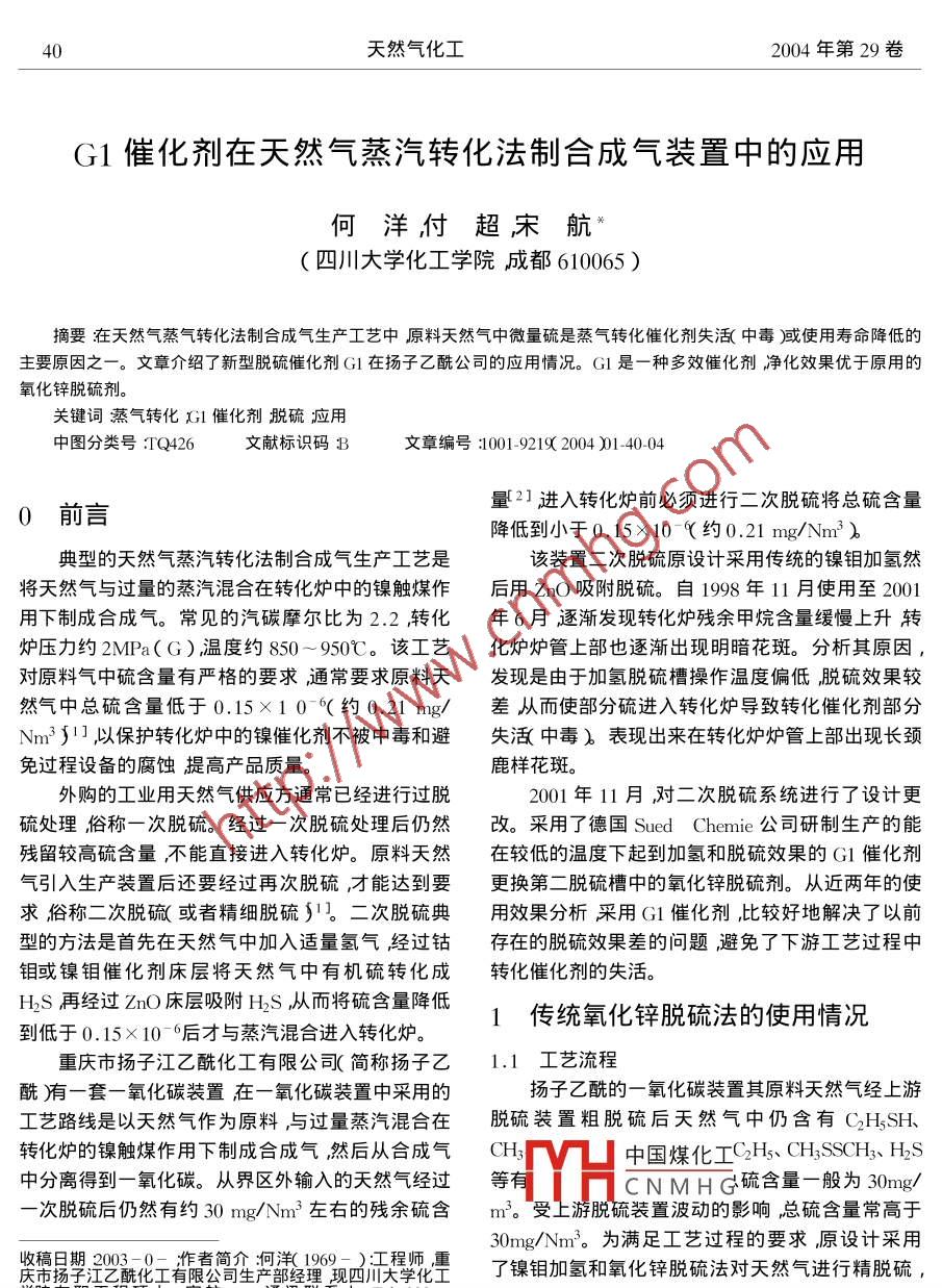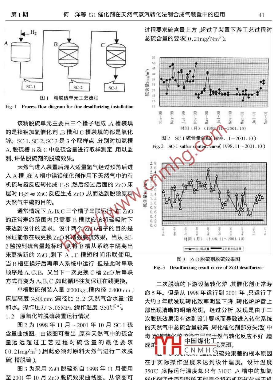 天然氣化工2004年第29卷G1催化劑在天然氣蒸汽轉(zhuǎn)化法制合成氣裝置中的應(yīng)用何洋付超宋航(四川大學(xué)化工學(xué)院成都610065)摘要迕天然氣蒸氣轉(zhuǎn)化法制合成氣生產(chǎn)工藝中原料天然氣中微量硫是蒸氣轉(zhuǎn)化催化劑失泜中毒)使用壽命降低的主要原因之一。文章介紹了新型脫硫催化劑Gl在揚(yáng)子乙酰公司的應(yīng)用情況。Gi是一種多效催化劑凈化效果優(yōu)于原用的氧化鋅脫硫劑。關(guān)鍵詞蒸氣轉(zhuǎn)化Ⅻ1催化劑脫硫應(yīng)用中圖分類號(hào)Q426文獻(xiàn)標(biāo)識(shí)碼3文章編號(hào)1001-92192004)1-40-04量2進(jìn)入轉(zhuǎn)化爐前必須進(jìn)行二次脫硫?qū)⒖偭蚝拷档偷叫∮?.15×10(約0.21mg/Nm3典型的天然氣蒸汽轉(zhuǎn)化法制合成氣生產(chǎn)工藝是該裝置二次脫硫原設(shè)計(jì)采用傳統(tǒng)的鎳鉬加氫然將天然氣與過量的蒸汽混合在轉(zhuǎn)化爐中的鎳觸煤作后用ZnO吸附脫硫。自198年11月使用至2001用下制成合成氣。常見的汽碳摩爾比為2.2轉(zhuǎn)化年6月逐漸發(fā)現(xiàn)轉(zhuǎn)化爐殘余甲烷含量緩慢上升轉(zhuǎn)爐壓力約2Mra〔G)溫度約850~950℃。該工藝化爐爐管上部也逐漸岀現(xiàn)明暗花斑。分析其原因,對原料氣中硫含量有嚴(yán)格的要求通常要求原料天發(fā)現(xiàn)是由于加氫脫硫槽操作溫度偏低脫硫效果較然氣中總硫含量低于0.15×10-(約0.21mg/差從而使部分硫進(jìn)入轉(zhuǎn)化爐導(dǎo)致轉(zhuǎn)化催化劑部分Nm31以保護(hù)轉(zhuǎn)化爐中的鎳催化劑不被中毒和避失泜中毒)表現(xiàn)岀來在轉(zhuǎn)化爐爐管上部岀現(xiàn)長頸免過程設(shè)備的腐蝕提高產(chǎn)品質(zhì)量。鹿樣花斑外購的工業(yè)用天然氣供應(yīng)方通常已經(jīng)進(jìn)行過脫2001年11月對二次脫硫系統(tǒng)進(jìn)行了設(shè)計(jì)更硫處理俗稱一次脫硫。經(jīng)過一次脫硫處理后仍然改。采用了德國 Sued Chemie公司研制生產(chǎn)的能殘留較高硫含量不能直接進(jìn)入轉(zhuǎn)化爐。原料天然在較低的溫度下起到加氫和脫硫效果的G催化劑氣引入生產(chǎn)裝置后還要經(jīng)過再次脫硫,才能達(dá)到要更換第二脫硫槽中的氧化鋅脫硫劑。從近兩年的使求俗稱二次脫硫或者精細(xì)脫硫υ二次脫硫典用效果分析采用Gl催化劑比較好地解決了以前型的方法是首先在天然氣中加入適量氫氣經(jīng)過鈷存在的脫硫效果差的問題避免了下游工藝過程中鉬或鎳鉬催化劑床層將天然氣中有機(jī)硫轉(zhuǎn)化成轉(zhuǎn)化催化劑的失活。HS再經(jīng)過ZnO床層吸附HS從而將硫含量降低到低于0.15×10-6后才與蒸汽混合進(jìn)入轉(zhuǎn)化爐。1傳統(tǒng)氧化鋅脫硫法的使用情況重慶市揚(yáng)子江乙?;び邢薰竞喎Q揚(yáng)子乙1工藝流程酰洧有一套一氧化碳裝置在一氧化碳裝置中采用的揚(yáng)子乙酰的一氧化碳裝置其原料天然氣經(jīng)上游工藝路線是以天然氣作為原料與過量蒸汽混合在脫硫裝置粗脫硫后天然氣中仍含有C2H3SH、轉(zhuǎn)化爐的鎳觸煤作用下制成合成氣然后從合成氣CH中國煤化工C2H、CH3ssH3、H2S中分離得到一氧化碳。從界區(qū)外輸入的天然氣經(jīng)過等有CNMHG硫含量一般為30mg次脫硫后仍然有約30mg/Nm左右的殘余硫含m。受上游脫硫裝置波動(dòng)的影響總硫含量常高于30mg/Nm3。為滿足工藝過程的要求原設(shè)計(jì)采用市揚(yáng)字江之?;び邢薰旧a(chǎn)部經(jīng)理現(xiàn)四大拿化里了鎳鉬加氫和氧化鋅脫硫法對天然氣進(jìn)行精脫硫,學(xué)在職瘧:宋航*-通訊聯(lián)系人,d:028-工藝流程見圖1第1期何洋等1催化劑在天然氣蒸汽轉(zhuǎn)化法制合成氣裝置中的應(yīng)用41H過程要求硫含量上方超過了裝置下游工藝過程對總硫含量的要求0.21mg/Nm3ABSC-1SC2圖1精脫硫單元工藝流程5nFig 1 Process flow diagram for fine desulfurizing installation388早該精脫硫單元主要由三個(gè)槽子組成A槽裝填的是鎳鉬加氬催化劑B槽和C槽裝填的都是氧化時(shí)間t月)(1998.11~2001.10)鋅。SCI、SC2、SC-3是3個(gè)取樣點(diǎn)分別對加氬槽圖2S-1硫含量曲線(1998.11~2001.10)A、脫硫槽B及C中總硫含量進(jìn)行取樣測定用以監(jiān)Fig 2 SC-1 sulfur content curve 1998.. 10)測、評估脫硫劑的脫硫效果。天然氣進(jìn)入裝置后混入適量氫氣經(jīng)過預(yù)熱后進(jìn)入A槽在A槽中鎳鉬催化劑作用下天然氣中的有2.4機(jī)硫與氫反應(yīng)轉(zhuǎn)化成H2S然后經(jīng)過后面的ZnO床8層時(shí)HS與ZnO反應(yīng)生成ZnO從而達(dá)到脫除原料:4天然氣中硫的目的。通常情況下A、BC三個(gè)槽子串聯(lián)運(yùn)行在ZnO的正常壽命范圍內(nèi)只需要B槽就應(yīng)該將硫吸附下來達(dá)到設(shè)計(jì)的要求。設(shè)計(jì)兩個(gè)ZnO槽子的目的是0,0保證能夠在線更換ZnO和增強(qiáng)脫硫效果。當(dāng)從SC時(shí)間(月)(18.11~2001.102監(jiān)控到硫含量超標(biāo)時(shí)則將B槽從系統(tǒng)中隔離岀來更換新的ZnO,剩下A、C槽短時(shí)間串聯(lián)使用。圖3ZnO脫硫劑脫硫效果圖當(dāng)B槽更換好后再串入系統(tǒng)中運(yùn)行但是此時(shí)串聯(lián)順序是AC、B。又當(dāng)下一次更換C槽ZnO后串聯(lián)Fig 3 Desulfurizing result curve of Zno desulfurizer方式再變?yōu)锳、BC如此循環(huán)往復(fù)保證在線更換。二次脫硫的下游設(shè)備轉(zhuǎn)化爐其催化劑正常壽單槽脫硫劑裝入量600kg糟內(nèi)徑:400m命5年。但是從1998