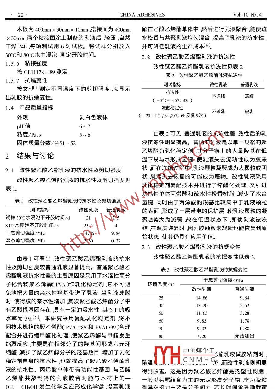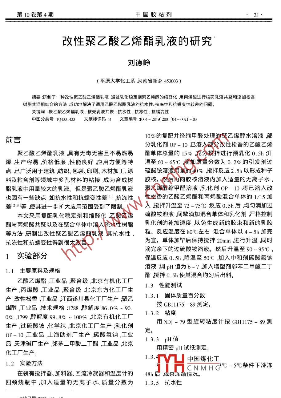 第10卷第4期中國(guó)膠粘劑21.改性聚乙酸乙烯酯乳液的研究劉德崢(平原大學(xué)化工系河南省新鄉(xiāng)453003 )摘要研制了一種改性聚乙酸乙烯酯乳液通過乳化穩(wěn)定劑聚乙烯醇的縮醛化用丙烯酸進(jìn)行核殼乳液共聚和添加松香樹脂共混相結(jié)合的方法成功地解決了通用乙酸乙烯酯乳液的抗水性、抗凍性和抗蠕變性較差的問題。關(guān)鍵詞:聚乙酸乙烯酯乳液;核殼乳液共聚;抗水性;抗凍性;抗蠕變性中圖分類號(hào):TQ433.433 .文獻(xiàn)標(biāo)識(shí)碼:B .文章編號(hào):1004- 2849( 2001 )4- 0021- 0310%的復(fù)配并經(jīng)縮甲醛處理的聚乙烯醇水溶液部前言分乳化劑OP- 10,已溶入部分改性松香的乙酸乙烯聚乙酸乙烯酯乳液具有無毒無害且不易燃易酯單體總量的15% ,充分?jǐn)嚢柽M(jìn)行預(yù)乳化0.5h ;升爆生產(chǎn)容易價(jià)格低廉,性能良好,應(yīng)用方便等特溫至60~ 65C滴加質(zhì)量分?jǐn)?shù)為0.2%的引發(fā)劑過點(diǎn),已廣泛用于建筑紡織、包裝、印刷、木材加工、涂硫酸銨溶液用量的40%攪拌反應(yīng)2.5h以形成種子料及粘合劑等領(lǐng)域中多孔材料的粘接,成為合成樹膠核。然后再向膠核溶液內(nèi)加入適量的無離子水,脂乳液中用量較大的乳液。但是聚乙酸乙烯酯乳液聚乙烯醇縮甲醛溶液乳化劑OP- 10 ,將已溶入改也固有-些缺點(diǎn)如抗水性和抗蠕變性差1]抗凍性性松香的乙酸乙烯酯和丙烯酸混合單體的1/15加差23]等使其進(jìn)一步擴(kuò)大應(yīng)用范圍受到了限制。入攪拌升溫至72~ 75C ;反應(yīng)0.5h后均勻滴加過本文采用復(fù)配乳化穩(wěn)定劑和縮醛化,乙酸乙烯硫酸銨溶液間歇滴加混合單體和乳化劑嚴(yán)格控制酯與丙烯酸共聚以及在聚合單體中溶入疏水性樹脂乳化劑的補(bǔ)加速度,以免生成新的膠束和新的乳膠等方法研制出改性聚乙酸乙烯酯乳液其抗水性,粒。反應(yīng)溫度在80C左右混合單體以4~ 5h加完抗凍性和抗蠕變性得到很大改善。為宜。單體加畢后保持?jǐn)嚢?0min,進(jìn)行升溫,同時(shí)滴完余下的過硫酸銨溶液。然后升溫至90~ 95C ,1實(shí)驗(yàn)部分保溫反應(yīng)0.5h,降溫至50°C ,加入中和劑碳酸氫鈉溶液,調(diào)pH值為6~7加入增塑劑鄰苯二甲酸二丁1.1 主要原料及規(guī)格酯攪拌0.5h使其混合均勻后出料。.乙酸乙烯酯,工業(yè)品聚合級(jí)北京有機(jī)化工廠. 1.3 性能測(cè)試生產(chǎn);丙烯酸,工業(yè)品聚合級(jí)北京東方化工廠生1.3.1 固體質(zhì)量百分?jǐn)?shù)產(chǎn),改性松香工業(yè)品江西遂川縣化工廠生產(chǎn)聚乙按GB11175 - 89測(cè)定。烯醇工業(yè)品技術(shù)規(guī)格:1788 醇解度86.0% ~ 90.1.3.2粘度0% ,1799 醇解度99. 8% ~ 100% ,北京有機(jī)化工廠生產(chǎn)過硫酸銨化學(xué)純北京化工廠生產(chǎn);乳化劑定。用NDJ- 79型旋轉(zhuǎn)粘度計(jì)按GB11175- 89測(cè)OP-10工業(yè)品上海助劑廠生產(chǎn);碳酸氫鈉工業(yè)1.3.3 pH值品天津堿廠生產(chǎn);鄰苯二甲酸二丁酯工業(yè)品北京用精密pH試紙測(cè)定?;S生產(chǎn)。中國(guó)煤化工1.2 實(shí)驗(yàn)方法在裝有攪拌器、加料器、回流冷凝器和溫度計(jì)的JHCN MHGC-5C條件下冷凍48h后觀祭床紹倩況。四頸燒瓶中,加入適量的無離子水、質(zhì)量分?jǐn)?shù)為1.3.5 抗水性*收稿日期2000=06- 19作者簡(jiǎn)外2列德氟( 1952 - )副教授系副主任主要從事精細(xì)化工的教學(xué)和科研。主編出版專著2部發(fā)表論文20余篇開發(fā)產(chǎn)品6項(xiàng)。CHINA ADHESIVESVol.10 No.4 .木板為400mmx30mmx10mm搭接面為400mm解在乙酸乙烯酯單體中然后進(jìn)行乳液聚合能使疏x 30mm,兩個(gè)粘接面涂上制備的乳液后輕壓,自 然水松香與共聚乳液均勻混合提高了乳液的抗水性,干燥24h ,每項(xiàng)測(cè)試用6對(duì)試板。將試樣分別放入并可降低乳液的生產(chǎn)成本[ 6。309C和80C水中浸泡測(cè)定開膠時(shí)間。2.2改性 聚乙酸乙烯酯乳液的抗凍性1.3.6 粘接強(qiáng)度改性聚乙酸乙烯酯乳液抗凍性見表2。按GB11178 - 89測(cè)定。.表2改性聚乙酸乙烯酯乳液抗凍性1.3.7 抗蠕變性測(cè)試指標(biāo)改性乳液普通乳液按文獻(xiàn)4測(cè)定不同溫度下的剪切強(qiáng)度,以顯示抗凍性出乳膠的抗蠕變性。不凍結(jié)凍結(jié)( -3C~ -5C A48h)1.4 產(chǎn)品質(zhì)量指標(biāo)凍融穩(wěn)定性外觀乳白色液體( -20+1C ,18h 20C 6h反復(fù)5次)不破乳破乳pH值6~ 7粘度/Pa.s5~6由表2可見普通乳液的抗凍性差改性后的乳固體質(zhì)量分?jǐn)?shù)/%51~ 52液抗凍性明顯提高。普通的乳液是以單-規(guī)格的聚乙烯醇為乳化穩(wěn)定劑其分子鏈上的大量羥基在低2結(jié)果 與討論溫下易與水形成氫鍵,使乳液失去流動(dòng)性成為膠凍2.1 改性聚乙酸乙酯乳液的抗水性及剪切強(qiáng)度狀,而在凍結(jié)過程中乳液顆粒凝聚成為大顆粒或團(tuán)改性聚乙酸乙烯酯乳液的抗水性及剪切強(qiáng)度見狀乳液失去恢復(fù)的可能成為廢物。改性乳液采用乳化穩(wěn)定劑復(fù)配技術(shù)并進(jìn)行了縮醛化處理,又引進(jìn)表1。功能性單體丙烯酸和疏水性松香樹脂減少了水合表1改性聚乙酸乙烯 酯乳液的抗水性及剪切強(qiáng)度氫鍵同時(shí)由于丙烯酸的羧基比較集中于乳液顆粒改性乳液普通乳液的表面形成了一層帶電的保護(hù)層使乳液顆粒的凝試樣30C水浸泡不開膠時(shí)間/d21聚趨勢(shì)大為減弱,故在低溫狀態(tài)下,即使乳液被凍8