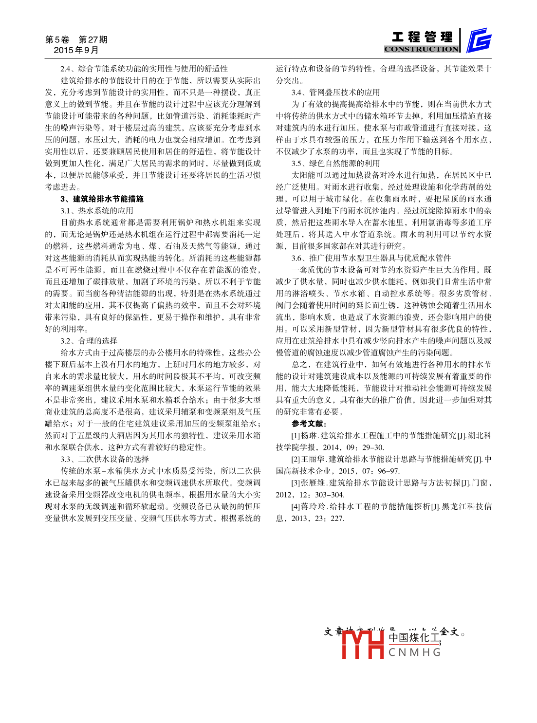 后L工程管理第5卷第27期CONSTRUCTION2015年9月建筑給排水節(jié)能設計思路與節(jié)能措施研究張濤信息產(chǎn)業(yè)電子第十一設計研究院科技工程股份有限公司西安分公司陜西省西安市710100摘要:經(jīng)濟的快速發(fā)展,不僅給自然環(huán)境造成了污染,更是使能源供應越來越緊張。因此,節(jié)能環(huán)保在當今社會顯得異常重要。在建筑給排水設計中將節(jié)能環(huán)保的理念融入到設計中,對于能源的可持續(xù)發(fā)展有著重要的意義。因此,相關(guān)技術(shù)與硏究人員應當加強有關(guān)建筑給排水設計節(jié)能的研究,并不斷引進先進節(jié)能技術(shù)方法與裝置設備,以逐步改善給排水工程的節(jié)能效罘。基于此本文分析了建筑給排水節(jié)能設計與節(jié)能措施。關(guān)鍵詞:建筑給排水;節(jié)能設計;節(jié)能措施中圖分類號:TE08文獻標識碼:A1、建筑給排水工程概述且采取先進的技術(shù)措施,克服給排水工程中的水浪費問題,以1.1、建筑給排水工程布置與組成最大程度的提高水資源的利用效率建筑給排水系統(tǒng)主要由排水管道、局部處理構(gòu)筑物、生產(chǎn)2、建筑給排水節(jié)能設計思路設備與衛(wèi)生器具受水器、抽升設備、清通設備、通氣管系統(tǒng)等對供水進行合理分區(qū)以及選擇合適的供水系統(tǒng)。在實用要組成其管道的敷設與布置方式為求滿足的條件下,充分利用市政壓力供水。應區(qū)分較高層建筑1)敷設排水管道。在連接排水管端部與排水立管時應當?shù)墓┧到y(tǒng),分區(qū)減壓閥的設置,為了更好地節(jié)能,盡量不串此采用彎曲半徑大于4倍管徑的90°彎頭或2個45°的彎頭;聯(lián)設置。在供水系統(tǒng)的選用時應發(fā)散思維,做仔細的計算,充要在基礎、穿樓板與管道穿墻處留設孔洞,且管道與墻、管道分利用市政壓力,盡量避免水泵在低效段工作,以達到節(jié)能的與管道之間應當設置一定的間隔距離;通常將排水管道暗埋于日的。常用的供水方式有:常速泵組十高位水箱疊壓供水、刂建筑墊層與結(jié)構(gòu)層中(暗埋法是指把排水的橫支管在建筑墊層容量髙位水箱與管網(wǎng)疊壓聯(lián)合供水、各種不同供水系統(tǒng)的組合中掩埋),而將衛(wèi)浴間的地面增高60-20om左右的高度將輔使用,應根據(jù)實際情況對供水系統(tǒng)進行合理的選擇。助用水器具的水平主管道和連接管件安設在增高的地面填充層2.1、熱水系統(tǒng)的選擇中,然后在填充層上做好防水層、砂漿找平層與地面面層的施由于熱水的制備占熱水系統(tǒng)的能耗85%以上,因此熱水系排水橫管應當設置在專用的假墻內(nèi)統(tǒng)的選擇十分重要。首先是熱源的選擇,然后是熱水系統(tǒng)的合管道布置。對于熱水系統(tǒng)當采用下行上給式供應熱水理設計。合理地選擇熱源從根本上減少能源的消耗,熱水系統(tǒng)時,回水立管應連接到配水立管上沮連接位置應當在最佳配水的合理設計優(yōu)化了節(jié)能管理的實際操作。點下0.5m距離處同時在其底部設置相應的泄水閥裝置,并采用22、從其他排水系統(tǒng)方面進行考慮最佳配水點進行放氣;若采用上行下給式熱水系統(tǒng)時,則需將首先是循環(huán)冷卻水系統(tǒng)的選擇,其次是分質(zhì)供水的設計循環(huán)管道連接到毎個立管上,并在配水干管的頂部位置安裝消然后是水的循環(huán)使用系統(tǒng)的設計,最后是雨水利用系統(tǒng)的設計音的排氣裝置,同時加設有手動控制放氣閥的膨脹水箱和排氣2.3、水資源方面節(jié)能設計給排水設計與節(jié)能緊密相連,在設計以及材料上進行節(jié)能(3)管道保溫。熱水系統(tǒng)主要包括機械循環(huán)回水干管、回減排有利于我國建筑的綠色發(fā)展。傳統(tǒng)的給排水設計不漢在結(jié)水立管、熱水箱、水加熱設備、熱水供水立管、熱水供水干構(gòu)上還是在選材上,都沒有解決節(jié)能問題,存在浪費,損害了管、貯熱水器等裝置對于這些部位應當進行保溫以降低熱能損業(yè)主的合法權(quán)益。23.1、中水系統(tǒng)(4)管道支架。為了使管道伸縮量盡可能均勻分配熱水管中水系統(tǒng)的優(yōu)化設計,對減輕污染保護環(huán)境減少水資源消道應當采用固定支架方式將其安置在自然補償管道與伸縮器的耗至關(guān)重要。中水回用處理工藝采用生物一物化組合流程還是兩端位置沮支架的間隔距離應當滿足:管段的熱伸長量小于伸物化流程,需據(jù)中水水質(zhì)、水量及回用水質(zhì)要求等因素結(jié)合技縮器標準的補償量術(shù)經(jīng)濟比較后確定。一般情況中水系統(tǒng)設置可使高層建筑水資5)通氣管道系統(tǒng)。建筑內(nèi)部的排水管道系統(tǒng)要采用通氣源消耗降低40%左右,有利于降低水資源消耗保證水資源的可管與大氣連通其通氣方式有:器具通氣管、專用通氣管、結(jié)合持續(xù)開發(fā)。通氣管環(huán)形通氣管、伸頂通氣管、副通氣管、主通氣管等2.3.2、變頻水泵,控制計量2、建筑給排水工程的節(jié)能現(xiàn)狀變頻水泵在實際運行過程中可以將變頻調(diào)速技術(shù)、可編程目前國內(nèi)的建筑給排水工程施工中岀現(xiàn)的浪費問題有:衛(wèi)序控制技術(shù)、水位顯示控制特術(shù)、壓為傳感技術(shù)等綜合運用生器具和給水配件缺少相應的節(jié)水功能;雨水及中水的