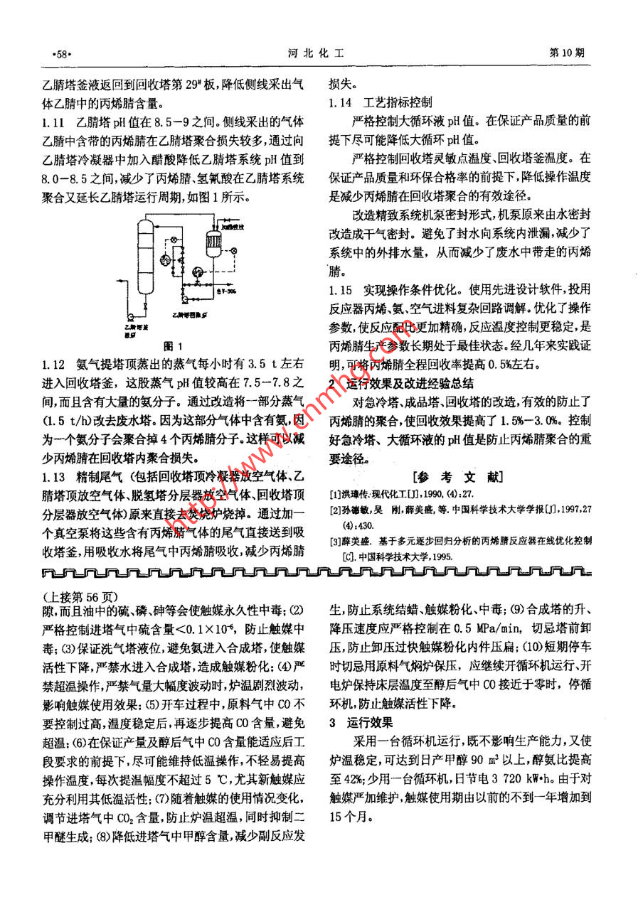 第30卷第10期Vo1.30 Na10阿北化工2007年10 月Oct. 2007甲醇單臺(tái)循環(huán)機(jī)運(yùn)行小結(jié)楊翠敬(石家莊滹沱河化肥有限責(zé)任公司,河北石家莊050041)[摘要]采用一臺(tái)循環(huán)機(jī)運(yùn)行 ,達(dá)到節(jié)能降耗的目的:加強(qiáng)甲醇爐溫的調(diào)節(jié)與觸媒的使用與維護(hù),延長(zhǎng)觸媒的使用壽命。[關(guān)鍵詞]單臺(tái)循環(huán)機(jī):節(jié)電;觸媒:維護(hù)[中圖分類(lèi)號(hào)] TQ 113. 25'1[文獻(xiàn)標(biāo)識(shí)碼] B[文章編號(hào)] 1003 -5095 (2007) 10-0056-02石家莊滹沱河化肥有限責(zé)任公司為合成氨聯(lián)產(chǎn)溫。 正常生產(chǎn)中,工藝流程示意圖如圖1所示。甲醇工藝,甲醇系統(tǒng)原設(shè)計(jì)為兩臺(tái)φ 800 合成塔串原料氣聯(lián)使用,兩臺(tái)2. 2 m2/min 循環(huán)機(jī)同時(shí)運(yùn)行。在運(yùn)行中油分寓器]_?從木院井] ,水分寓器,「合成煤][預(yù)熱2我們發(fā)現(xiàn),塔內(nèi)件均溫效果差,觸媒利用率低,操作彈性小。為了在原有甲醇系統(tǒng)的基礎(chǔ)上提高生產(chǎn)能力,增加操作手段,對(duì)系統(tǒng)進(jìn)行了一些調(diào)整:更換了合成/本凈卻暴]-它限分高路]昂壞機(jī)]-抽分寓器塔內(nèi)件,將內(nèi)件換熱段長(zhǎng)度減少,增加下絕熱段長(zhǎng)度,國(guó)將液回收若]-水分真操]◆ 后[霞使觸媒裝填量增加。增設(shè)了塔前預(yù)熱器。為了在觸媒使用前期,增加調(diào)節(jié)手段,在更換合成塔內(nèi)件時(shí),在合圖1工藝流程示意圖成塔頂部增加了一條冷激副線。經(jīng)過(guò)開(kāi)-臺(tái)循環(huán)機(jī)及在用主閥調(diào)節(jié)時(shí),要嚴(yán)格控制主閥開(kāi)關(guān)量,由于兩臺(tái)循環(huán)機(jī)操作運(yùn)行比較,總結(jié)出了-套單臺(tái)循環(huán)機(jī)合成塔出口材質(zhì)要求,出口溫度嚴(yán)禁超180 C運(yùn)行。運(yùn)行的操作方法。為了延長(zhǎng)觸媒的使用壽命,在觸媒2觸媒的使用與 日常維護(hù)的裝填、升溫還原及日常維護(hù)上都進(jìn)行了嚴(yán)格管理,2.1觸媒的裝填保證了一臺(tái)循環(huán)機(jī)穩(wěn)定運(yùn)行,達(dá)到了穩(wěn)定生產(chǎn)能力,我公司一直使用C 207型聯(lián)醇觸媒,在裝填時(shí)制節(jié)能降耗的目的。定嚴(yán)格的裝填方案,避免觸媒破碎,杜絕觸媒進(jìn)入中1單臺(tái)循環(huán)機(jī)運(yùn)行操作方法心管、引氣管、溫度計(jì)套管、合成塔外簡(jiǎn)與內(nèi)件環(huán)隙甲醇爐溫的調(diào)節(jié),在經(jīng)過(guò)不斷地摸索操作后,逐等,采用均勻撤布法,使觸媒裝填均勻,防止局部過(guò)松漸確定了目前的操作方法,開(kāi)一臺(tái)循環(huán)機(jī),循環(huán)機(jī)經(jīng)或過(guò)緊。在觸媒升溫還原前,對(duì)系統(tǒng)進(jìn)行嚴(yán)格的吹除。過(guò)改造后,打氣量為2. 4 m/min.兩塔串聯(lián)使用(循環(huán)2.2觸媒的升溫還原機(jī)進(jìn)出口閥門(mén)開(kāi)啟方式為1*進(jìn)2*出或2*進(jìn)1*出,雙為了避免在觸媒還原后期,在出水的同時(shí)有甲醇塔循環(huán)),前塔補(bǔ)充氣閥門(mén)開(kāi)展,塔副線閥全開(kāi),用塔生成,要加盲板隔斷原料氣。升溫還原過(guò)程中,采用兩主線閥調(diào)節(jié),不調(diào)節(jié)循環(huán)機(jī)循環(huán)量,后塔在使用前期,臺(tái)循環(huán)機(jī)進(jìn)行操作,嚴(yán)格按升溫還原曲線進(jìn)行。為了補(bǔ)充氣閥門(mén)微開(kāi),以不加電維持溫度為基準(zhǔn)。隨著前避免觸媒粉化,嚴(yán)格控制還原過(guò)程中的出水量(水汽塔觸媒活性的變化,微調(diào)后塔補(bǔ)充氣閥門(mén),后塔仍以濃度)。出現(xiàn)電爐斷電等特殊情況,要采取果斷措施,塔副線閥門(mén)調(diào)節(jié)爐溫,如果產(chǎn)品結(jié)構(gòu)調(diào)整需增加甲醇將床層溫度降低10-20 C,然后再停塔。如果循環(huán)產(chǎn)量,后塔采用主閥調(diào)節(jié)維持爐溫。只有在觸媒使用機(jī)與電爐-起斷電,開(kāi)塔后放空適當(dāng)降低壓力, 由于氣體流初期,觸媒活性好,爐溫難以控制時(shí),偶用冷激副線調(diào)動(dòng),可將塔內(nèi)的水分帶出,以達(dá)到保護(hù)觸媒的目的。節(jié)。在觸媒使用后期,用預(yù)熱器提塔進(jìn)口溫度,穩(wěn)定爐2.3日常操作中, 為延長(zhǎng)觸媒的使用壽命,要做好以[收稿日期]2007-08 -14下工作:(1)嚴(yán)禁油污帶入合成塔,油在高溫下分解[作者簡(jiǎn)們]楊翠敬(1968)女,工程師,從事化工企業(yè)技術(shù)成碳和高碳膠質(zhì)物,沉積于觸媒表面,堵塞觸媒內(nèi)孔管理工作。(下轉(zhuǎn)第58頁(yè))●58+河北化工第10期乙腈塔釜液返回到回收塔第29#板,降低側(cè)線采出氣損失。體乙腈中的丙烯腈含量。1. 14工藝指標(biāo)控制1.11 乙腈塔pHl值在8. 5-9之間。側(cè)線采出的氣體嚴(yán)格控制大循環(huán)液pH值。在保證產(chǎn)品質(zhì)量的前乙腈中含帶的丙烯腈在乙腈塔聚合損失較多,通過(guò)向提下盡可能降低大循環(huán)pH值.乙腈塔冷凝器中加入醋酸降低乙腈塔系統(tǒng)pH值到嚴(yán)格控制回收塔靈敏點(diǎn)溫度、回收塔釜溫度。在8.0-8.5之間,減少了丙烯腈、氫氰酸在乙腈塔系統(tǒng)保證產(chǎn)品質(zhì)量和環(huán)保合格率的前提下,降低操作溫度聚合又延長(zhǎng)乙腈塔運(yùn)行周期,如圖1所示。是減少丙烯腈在回收塔聚合的有效途徑。改造精致系統(tǒng)機(jī)泵密封形式,機