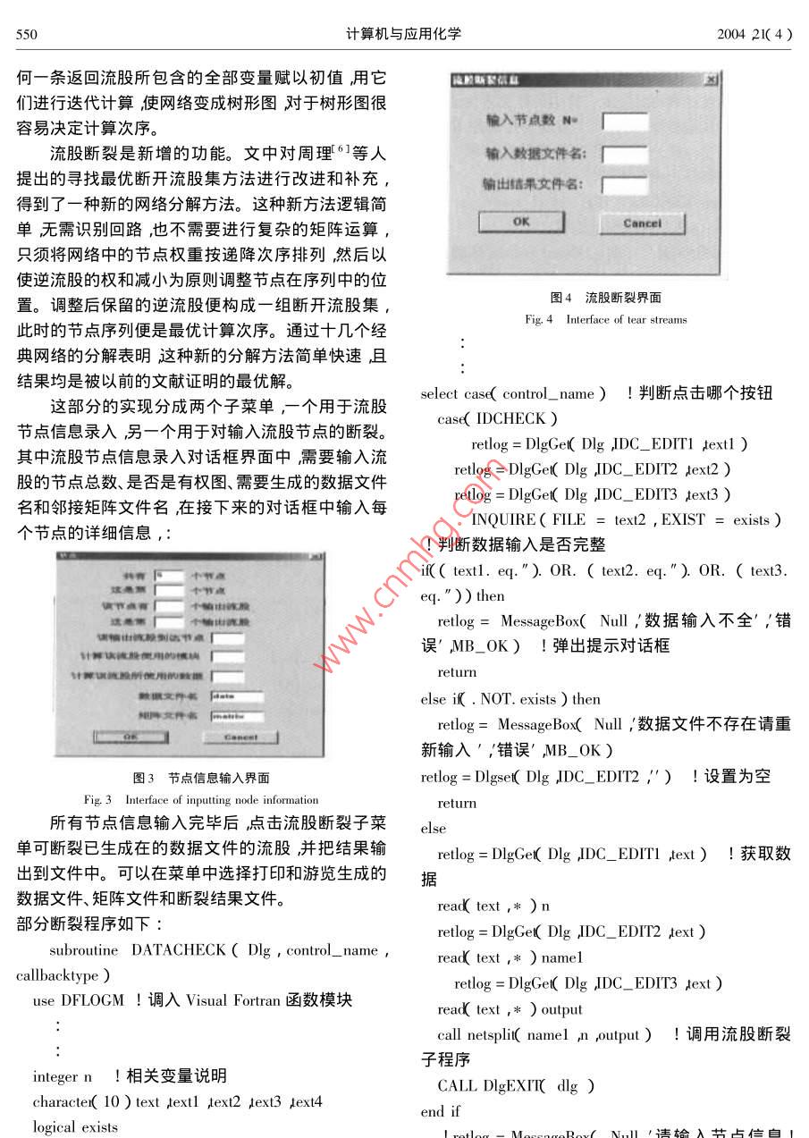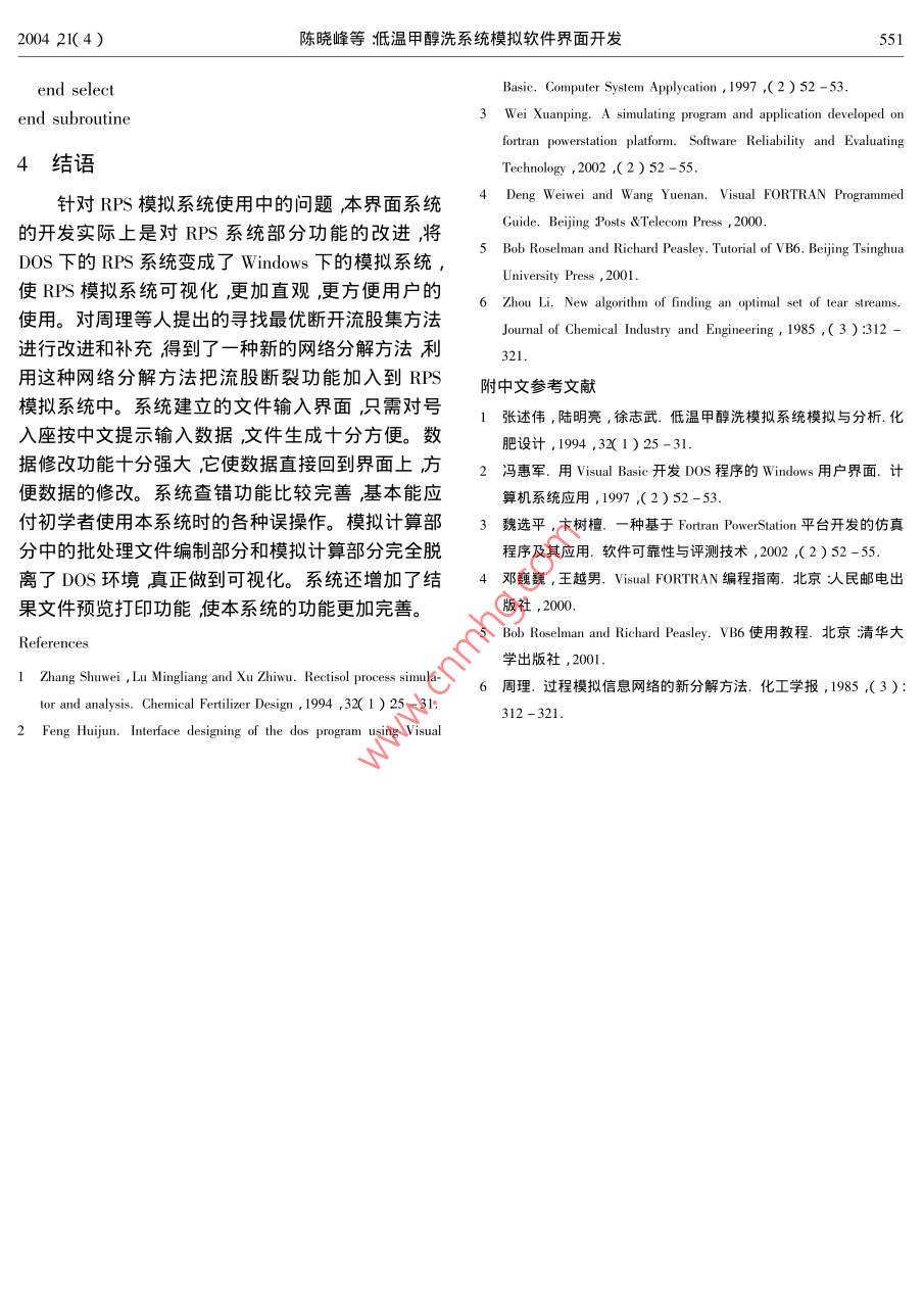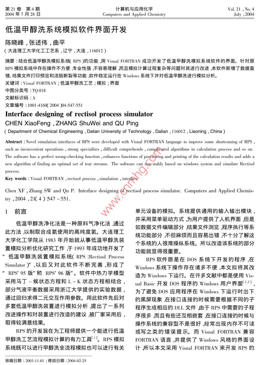 第21卷第4期計算機與應(yīng)用化學(xué)Vol. 21, No 42004年7月28日Computers and Applied ChemistryJuly 2004低溫甲醇洗系統(tǒng)模擬軟件界面開發(fā)陳曉峰,張述偉,曲平大連理工大學(xué)化工工藝系,遼寧,大連,116012)摘要:結(jié)合低溫甲醇洗模擬系統(tǒng)(RS〕旳功能用 Visual FORTRAN成功開發(fā)了低溫甲醇洗模擬系統(tǒng)軟件的界面。針對原RⅣS模擬系統(tǒng)中存在操作不方便專業(yè)性強不容易理解而且模擬計算過程復(fù)雜等問題對其進行改進本軟件新増了數(shù)據(jù)査錯、結(jié)果文件打印預(yù)覽和流股斷裂等功能軟件穩(wěn)定運行在 Windows系統(tǒng)下并對低溫甲醇洗進行模擬分析關(guān)鍵詞: Visual FORTRAN;低溫甲醇洗工藝;模擬;界面中圖分類號:TQO18文獻標(biāo)識碼:A文章編號:10014160(2004)4547551Interface designing of rectisol process simulatorCHEN XiaoFeng, ZHANG ShuWei and QU PingDepartment of Chemical Engineering Dalian University of Technology Dalian, 116012, Liaoning, ChinaAbstract: Novel simulation interfaces of RPS were developed with Visual FORTRAN language to improve some shortcoming of RPSsuch as inconvenient operations strong specialties, difficult comprehends, complicated algorithms in calculation process and so onThe software has a perfect wrong-checking function enhances functions of previewing and printing of the calculation results and adds anew algorithm of finding an optimal set of tear streams. The software can run stably based on windows system and simulate RectisolKey words: Visual FORTRAN, rectisol process simulation interfaceChen XF, Zhang SW and Qu P. Interface designing of rectisol process simulator. Computers and Applied Chemis-try,2004,21(4)547-5511前言單元設(shè)備的模擬。系統(tǒng)提供通用的輸入輸岀模塊,并采用菜單驅(qū)動方式,為用戶提供了人機界面但是低溫甲醇洗凈化法是一種原料氣凈化法通過如數(shù)據(jù)文件編輯部分結(jié)果文件瀏覽程序執(zhí)行等系此方法以制取合成氨使用的高純度氫。大連理工大學(xué)化工學(xué)院從1983年開始就從事低溫甲醇洗裝統(tǒng)功能部分不但麻煩而且容易岀錯不十分了解這個系統(tǒng)的人很難操縱系統(tǒng)。所以改造該系統(tǒng)的部分置模擬分析優(yōu)化研究工作于1993年成功地開發(fā)了功能就顯得很重要?!ǖ蜏丶状枷囱b置模擬系統(tǒng)(RPS: Rectisol processRPS軟件原是在DOS系統(tǒng)下開發(fā)的程序,在Simulator",以后又對此軟件不斷完善,形成了Windows系統(tǒng)下操作存在諸多不便本文擬將其改〃RPS95版”和RPS'96版”。軟件中熱力學(xué)模型造為 Windows下運行。在許多文獻中都是使用Ⅴi采用馬丁-候狀態(tài)方程和L-K狀態(tài)方程相結(jié)合, I Basic開發(fā)DOs程序的 Windows用戶界面231,部分氣液平衡數(shù)據(jù)采用浙江大學(xué)提供的實驗數(shù)據(jù)為了避免DOS應(yīng)用程序在 Windows下運行時出下通過回歸求得二元交互作用參數(shù)。用此軟件先后對的黑屏現(xiàn)象在接口連接的時候需要根據(jù)不同的子多套低溫甲醇洗裝置進行模擬分析提出了一系列程序生成相應(yīng)的DL文件由于RPS中需要的子程改進操作和對裝置進行改造的建議被廠家采用后,序很多而且有些還互相嵌套在接口連接的時候與取得較滿意結(jié)果。操作系統(tǒng)的兼容型不是很好經(jīng)常岀現(xiàn)內(nèi)存不可讀RPS的開發(fā)旨在為工程師提供一個能進行低溫或?qū)懼惖腻e誤提示。而Ⅴ isual FOrtraN兼容甲醇洗工藝流程模擬計算的有力工具山。RPS模擬 FORTRAN語言,并提供了 Windows風(fēng)格的界面設(shè)系統(tǒng)既可以進行甲醇洗全流程模擬也可以進行有關(guān)計所以本文采用Ⅴ isual FOrtraN來開發(fā)RPS的收稿日期:2003-1101;修回日期:20040225計算機與應(yīng)用化學(xué)200421(4)界面,一些 Visual FOrtran不易實現(xiàn)的功能如磁盤路徑查找和批處理文生成和文件打印等則用模擬系統(tǒng)主界面Ⅴ isual basic來實現(xiàn)本文將RPS系統(tǒng)的部分功能進行改造使其在Windows下運行這樣一來RS系統(tǒng)的可視化程度流股斷裂文件生成界面結(jié)果預(yù)覽及打印就大大加強看起來就更直觀。另外通過本文的設(shè)模擬計算界面幫計RPS系統(tǒng)的功能有很大程度上的加強像文件生成、模擬計算等功能。此外在RPS系統(tǒng)原有功能及基礎(chǔ)上新增加了一些功能,如文件輸入差錯功圖1程序結(jié)構(gòu)圖能、結(jié)果文件瀏覽及打印功能和流股斷裂功能。使Fig 1 Structure of program用本系統(tǒng)脫離了DOS下操作。并且大量運用了界單有相應(yīng)的ID號然后需要在窗體主程序Main面設(shè)計把實現(xiàn)功能的代碼隱藏在界面的背后用戶WndPrd)中寫上具有相應(yīng)I菜單點擊時所需調(diào)無需面對程序的本身即可在可視化界面上完成各用對話框的函數(shù)在相應(yīng)的對話框中添加所需要的項功能控件和相應(yīng)的子程序。甲PA君2Ⅴ isual fortran簡介DigitaⅤ isual Fortran是 Compac公司下屬的DEC公司推出的功能強大的 FORTRAN開發(fā)工具。Visual FORtRaN基于 Microsoft公司的 DeveloperStudio集成開發(fā)環(huán)境因此除了具有 FORTRAN語言擅長科學(xué)計算的優(yōu)勢以外還可以像Ⅴ isual c++甚至 Visual basic一樣輕松開發(fā)出基于 Windows的應(yīng)用程序。 Visual Fortran不僅繼承了傳統(tǒng)FOR圖2低溫甲醇洗系統(tǒng)主界面TRAN程序的高效專業(yè)的科學(xué)計算能力支持最新Fig 2 Main interface of RPS的 FORTRAN語言標(biā