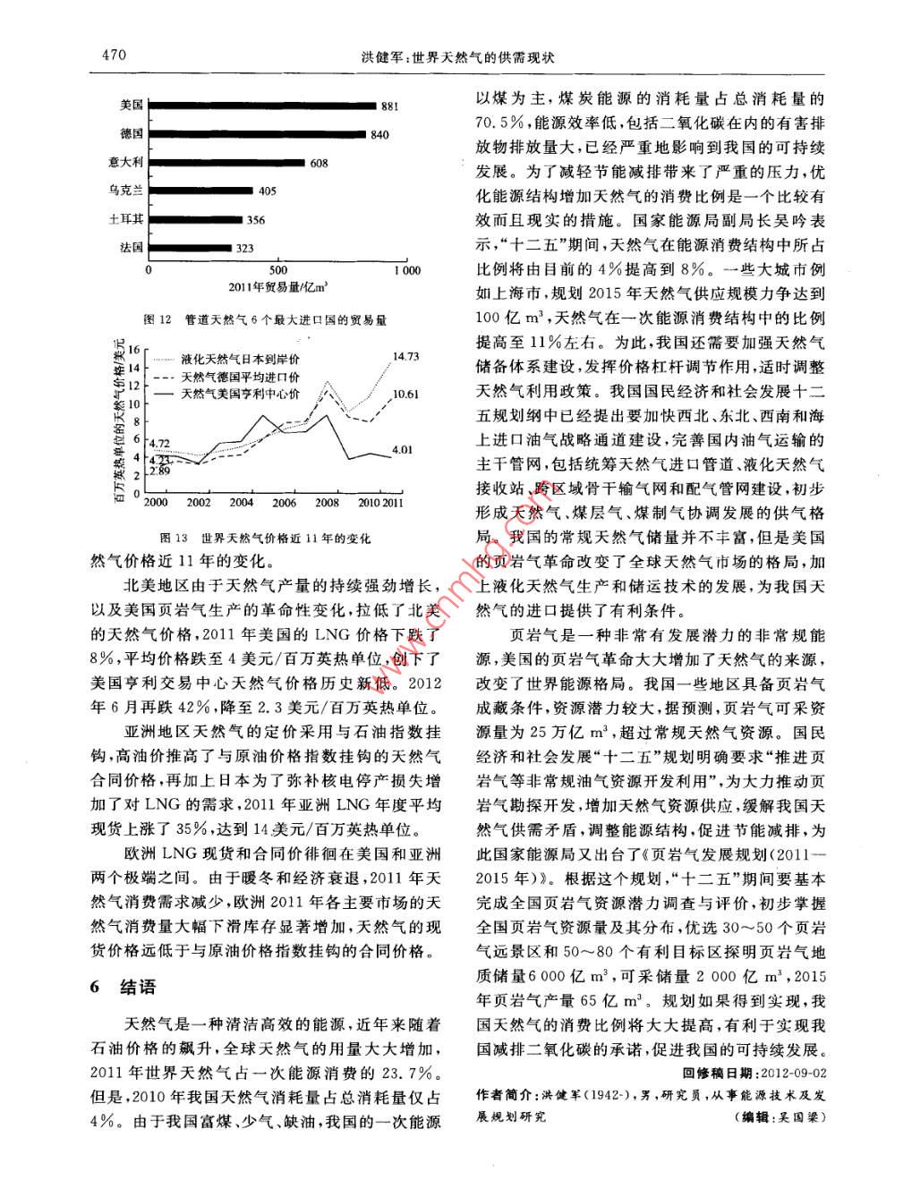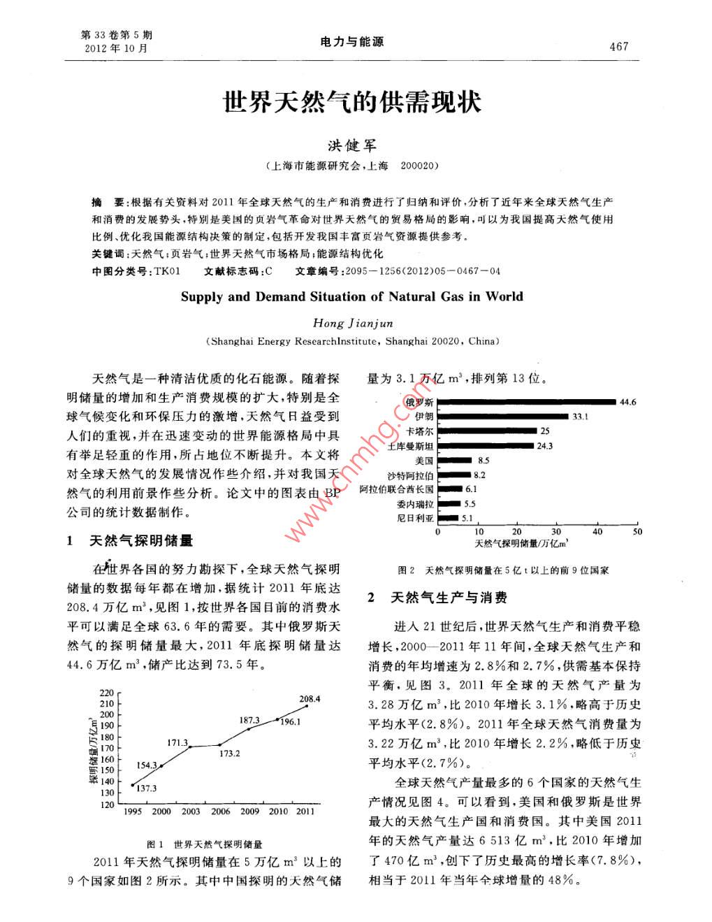第33卷第5期2012年10月電力與能源467世界天然氣的供需現(xiàn)狀洪健軍(.上海市能源研究會(huì),上海 200020)摘要:根據(jù)有關(guān)資料對(duì) 2011年全球天然氣的生產(chǎn)和消費(fèi)進(jìn)行了歸納和評(píng)價(jià),分析了近年來(lái)全球天然氣生產(chǎn)和消費(fèi)的發(fā)展勢(shì)頭,特別是美國(guó)的貞巖氣革命對(duì)世界天然氣的貿(mào)易格局的影響,可以為我國(guó)提高天然氣使用比例、優(yōu)化我國(guó)能源結(jié)構(gòu)決策的制定,包括開發(fā)我國(guó)豐富頁(yè)巖氣資源提供參考。關(guān)鍵詞:天然氣:頁(yè)巖氣;世界天然氣市場(chǎng)格局;能源結(jié)構(gòu)優(yōu)化中圖分類號(hào):TK01文獻(xiàn)標(biāo)志碼:C文章編號(hào):2095- 1256<2012)05 - 0467- -04Supply and Demand Situation of Natural Gas in WorldHong Jianjun(Shanghai Energy ResearchInstitute, Shanghai 20020, China)天然氣是一種清潔優(yōu)質(zhì)的化石能源。隨著探量為3.1萬(wàn)億m' ,排列第13位。明儲(chǔ)量的增加和生產(chǎn)消費(fèi)規(guī)模的擴(kuò)大,特別是全俄羅斯球氣候變化和環(huán)保壓力的激增,天然氣日益受到.33.人們的重視,并在迅速變動(dòng)的世界能源格局中具卡塔爾有舉足輕重的作用,所占地位不斷提升。本文將土庫(kù)曼斯坦8.5m 24.3美國(guó)對(duì)全球天然氣的發(fā)展情況作些介紹,并對(duì)我國(guó)天沙特阿拉伯'18.2然氣的利用前景作些分析。論文中的圖表由BP阿拉伯聯(lián)合酋長(zhǎng)國(guó)'6.1委內(nèi)瑞拉5.5公司的統(tǒng)計(jì)數(shù)據(jù)制作。尼日利亞401天 然氣探明儲(chǔ)量天然氣探明儲(chǔ)量/萬(wàn)億m'在世界各國(guó)的努力勘探下,全球天然氣探明圖2天然氣探明儲(chǔ)量在5億t以上的前9位國(guó)家儲(chǔ)量的數(shù)據(jù)每年都在增加,據(jù)統(tǒng)計(jì)2011年底達(dá)2天然氣生產(chǎn) 與消費(fèi)208.4萬(wàn)億m' ,見(jiàn)圖1,按世界各國(guó)目前的消費(fèi)水平可以滿足全球63. 6年的需要。其中俄羅斯天進(jìn)入21世紀(jì)后,世界天然氣生產(chǎn)和消費(fèi)平穩(wěn)然氣的探明儲(chǔ)量最大,2011年底探明儲(chǔ)量達(dá)增長(zhǎng),2000- 2011 年11年間,全球天然氣生產(chǎn)和44.6萬(wàn)億m3 ,儲(chǔ)產(chǎn)比達(dá)到73.5年。消費(fèi)的年均增速為2.8%和2.7%,供需基本保持平衡,見(jiàn)圖3。2011年全球的天然氣產(chǎn)量為220210208.43.28萬(wàn)億m3,比2010年增長(zhǎng)3.1%,略高于歷史100 [187.3- 196.1平均水平(2.8%)。2011 年全球天然氣消費(fèi)量為0171.3.3.22萬(wàn)億m3,比2010年增長(zhǎng)2.2%,略低于歷史150F 1543*>平均水平(2.7%)。全球天然氣產(chǎn)量最多的6個(gè)國(guó)家的天然氣生30-137.3120 4,產(chǎn)情況見(jiàn)圖4??梢钥吹?,美國(guó)和俄羅斯是世界1995 2000 2003 2006 2009 2010 2011最大的天然氣生產(chǎn)國(guó)和消費(fèi)國(guó)。其中美國(guó)2011圖1世界天然 氣探明儲(chǔ)量年的天然氣產(chǎn)量達(dá)6 513億m*,比2010年增加2011年天然氣探明儲(chǔ)量在5萬(wàn)億m3以上的了470億m3,創(chuàng)下了歷史最高的增長(zhǎng)率(7.8%),9個(gè)國(guó)家如圖2所示。其中中國(guó)探明的天然氣儲(chǔ)相當(dāng)于2011年當(dāng)年全球增量的48%。468洪健軍:世界天然氣的供需現(xiàn)狀34 300 r32 300 t32762800r700-690?303030472 , 32 229。600300s1整28300俄羅斯42526 300多300-梵24 300二_天然氣清費(fèi)s 200-伊朗153223002000 2002 2004 2006 2008 2010201 .可30 百本1062000 2002 2004 20062008 200201圖3世界天然氣生產(chǎn)與消費(fèi)圖6天然氣消費(fèi)最多的5個(gè)國(guó)家20000 -2011 年的消費(fèi)量700r600-俄羅60----中國(guó)天然氣市場(chǎng)規(guī)模在過(guò)去5年里擴(kuò)大了一00-倍多。天然氣供應(yīng)主要來(lái)自于國(guó)內(nèi)天然氣增產(chǎn).400-美國(guó)651(增長(zhǎng)8%)、管道天然氣進(jìn)口(來(lái)自于土庫(kù)曼斯300-坦,143億m'),以及LNG進(jìn)口(主要來(lái)自澳大利.00加拿大161亞、卡塔爾、印度尼西亞和馬來(lái)西亞,166億m*)。o伊朗52... ..3 頁(yè)巖氣開發(fā)2000 2002 2004 2006 2008 2010 2011用4天然氣生產(chǎn)最多的5 個(gè)國(guó)家20000 2011 年產(chǎn)量近幾年,在美國(guó)頁(yè)巖氣勘探開發(fā)技術(shù)取得突2011年全球天然氣生產(chǎn)增速最快的國(guó)家還破、產(chǎn)量快速增長(zhǎng)的推動(dòng)下,世界主要資源國(guó)家都有卡塔爾、土庫(kù)曼斯坦和秘魯,增長(zhǎng)率分別為加大了對(duì)頁(yè)巖氣的勘探開發(fā)力度,不少國(guó)家取得25.8%,40. 6%和56. 9%。特別是卡塔爾,2011了重要進(jìn)展。頁(yè)巖氣已經(jīng)并將進(jìn)一- 步對(duì)國(guó)際天然年的產(chǎn)量已經(jīng)超過(guò)中國(guó),成為全球第五大天然氣氣市場(chǎng)及世界能源格局產(chǎn)生重大影響。生產(chǎn)國(guó)。相反,由于老氣田產(chǎn)量的衰減、設(shè)備陳舊目前,美國(guó)已形成一套先進(jìn)有效的 頁(yè)巖氣開維修時(shí)間的增加和區(qū)域消費(fèi)需求的萎靡,2011年采技術(shù),這些先進(jìn)技術(shù)的大規(guī)模應(yīng)用提高了單井歐盟的天然氣的產(chǎn)量出現(xiàn)了有史以來(lái)的最大降幅產(chǎn)量,降低了頁(yè)巖氣開采的成本,促進(jìn)了頁(yè)巖氣的(降低11.4%);特別是英國(guó),天然氣減產(chǎn)20. 8%。大規(guī)模開發(fā),被稱為美國(guó)的頁(yè)巖氣革命。2007-全球天然氣消費(fèi)在世界-次能源消費(fèi)中的比2010年期間,美國