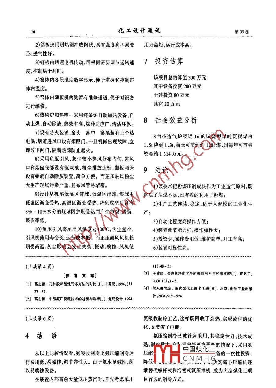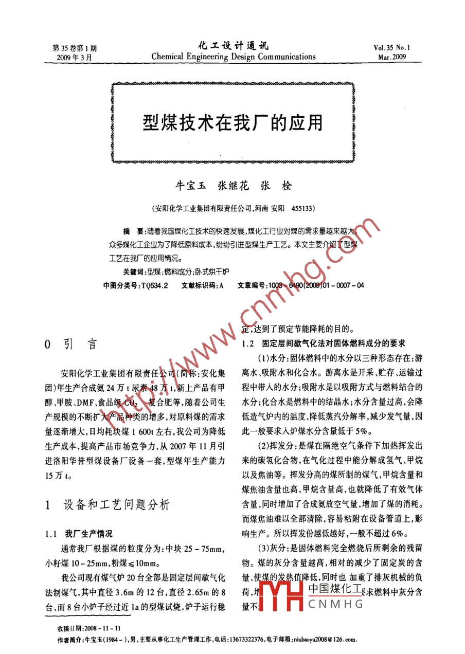 第35卷第1期化工設(shè)計(jì)通訊.Vol.35 No.12009年3月Chemical Engineering Design CommunicationsMar. 2009型煤技術(shù)在我廠的應(yīng)用牛寶玉張繼花張栓(安陽(yáng)化學(xué)工業(yè)集團(tuán)有限責(zé)任公司,河南安陽(yáng)455133)摘要:隨著我國(guó)煤化工技術(shù)的快速發(fā)展, 煤化工行業(yè)對(duì)煤的需求量越來(lái)越大,眾多煤化工企業(yè)為了降低原料成本,紛紛引進(jìn)型煤生產(chǎn)工藝。本文主要介紹了型煤工藝在我廠的應(yīng)用情況。關(guān)鍵詞:型煤;燃料成分;臥式烘干爐中圖分類號(hào):TQ534.2文獻(xiàn)標(biāo)識(shí)碼:A 文章編號(hào):1003- 6490(2009)01 -0007 -04定,達(dá)到了預(yù)定節(jié)能降耗的目的。0引言1.2 固定層間歇?dú)饣▽?duì)固體燃料成分的要求(1)水分:固體燃料中的水分以三種形態(tài)存在:游安陽(yáng)化學(xué)工業(yè)集團(tuán)有限責(zé)任公司(簡(jiǎn)稱:安化集離水、吸附水和化合水。游離水是開(kāi)采貯存、運(yùn)輸過(guò)團(tuán))年生產(chǎn)合成氨24萬(wàn)t尿素48萬(wàn)1,新上產(chǎn)品有甲程中帶人的水分;吸附水是以吸附方式與燃料結(jié)合的醇甲胺、DMF、食品級(jí)CO2復(fù)合肥等 ,隨著公司生.水分;化合水是燃料中的結(jié)晶水;水分含量過(guò)高,會(huì)降產(chǎn)規(guī)模的不斷打大產(chǎn)品種類的增多,對(duì)原料煤的需求低造氣爐內(nèi)的溫度,降低蒸汽分解率,或少發(fā)氣量,因量逐漸增大,日均耗塊煤1 600t左右,我公司為降低此- -般要求人爐煤水分含量低于5%。生產(chǎn)成本,提高產(chǎn)品市場(chǎng)競(jìng)爭(zhēng)力,從2007年11月引(2)揮發(fā)分:是煤在隔絕空氣條件下加熱揮發(fā)出進(jìn)洛陽(yáng)華譽(yù)型煤設(shè)備廠設(shè)備一套,型煤年生產(chǎn)能力來(lái)的碳氨化合物,在氣化過(guò)程中能分解成氫氣、甲烷15萬(wàn)t。以及焦油等。揮發(fā)分高的煤所制的煤氣,甲烷含量和煤焦油含量也高,甲烷含量高,也就降低了有效氣體1設(shè)備和工藝問(wèn)題分析含量,同時(shí)增加了合成氨放空氣量,增加了煤的消耗。而煤焦油難以全部清除,容易粘附在設(shè)備管道上,影1.1 我廠生產(chǎn)情況響生產(chǎn)。所以揮發(fā)份越低越好,-般不超過(guò)6%。通常我廠根據(jù)煤的粒度分為:中塊25 - 75mm,(3)灰分:是固體燃料完全燃燒后所剩余的殘留小籽煤10- 25mm,粉煤≤10mm。物。煤的灰分含量越高,相對(duì)的減少了固定炭的含我公司現(xiàn)有煤氣爐20臺(tái)全部是固定層間歇?dú)饣?使煤的發(fā)熱值降低,同時(shí)也加重了排灰機(jī)械的負(fù)法制煤氣,其中直徑3.6m的12臺(tái),直徑2.65m的8荷,增中國(guó)煤化工求燃料中灰分含臺(tái),而8臺(tái)小爐子經(jīng)過(guò)近la的型煤試燒,爐子運(yùn)行穩(wěn)量不YHCNMHG收稿日期:2008-11-11作者簡(jiǎn)介:牛寶五(1984- ),男,主要從事化工生產(chǎn)管理工作,電話13673322376,電子郵箱:ibuwy2008@2 126. com.化工設(shè)計(jì)通訊第35卷(4)固定炭:固體燃料中除去灰分、揮發(fā)分、水分僅對(duì)設(shè) 備管道有腐蝕作用,而且也會(huì)使催化劑中毒。和硫分以外,其余的可燃性物質(zhì)稱為固定碳,是固體燃料中的有效物質(zhì)。因此固定炭越高越好,一般不低2型煤于80%。(5)灰熔點(diǎn):灰熔點(diǎn)通常用三種溫度表示:t一開(kāi)型煤是用一種或數(shù)種煤粉與一定比例的粘結(jié)劑始變形溫度,h-軟化溫度,t3- -熔融溫度,一般要求或固硫劑在一定壓力下加工形成的,具有一定形狀和t2軟化溫度大于1 250%。煤的灰熔點(diǎn)越高越有利于--定理化性能的煤炭產(chǎn)品。(通常是35~50mm的橢提高氣化率,有利于高產(chǎn)低耗。圓煤球)(6)機(jī)械強(qiáng)度:固體燃料抗破碎的能力。一般煤型煤生產(chǎn)工藝按原料含水區(qū)分歸納起來(lái)有兩種,的機(jī)械強(qiáng)度與煤的形成年代有關(guān),年代愈久,強(qiáng)度越我們簡(jiǎn)稱為濕式工藝和干式工藝。采用濕式工藝生大。機(jī)械強(qiáng)度差的煤,其熱穩(wěn)定性也差,它在運(yùn)輸過(guò)產(chǎn)的型煤,原煤一般不用經(jīng)過(guò)干燥,在生產(chǎn)過(guò)程中加程中和入爐之后,破碎量較大,造成爐膛阻力增大和入各種添加劑后壓成濕的煤球(此時(shí)型煤沒(méi)有強(qiáng)度),通風(fēng)不均,使?fàn)t內(nèi)工況惡化,帶出物增加。經(jīng)過(guò)24- 48h固化,強(qiáng)度逐漸增大,達(dá)到運(yùn)輸、儲(chǔ)存要(7)熱穩(wěn)定性:是指燃料在高溫作用下,是否容易求。由于我廠造氣煤氣爐的工藝要求必須采用干式破碎的性質(zhì)。熱穩(wěn)定性好的煤,在燃燒或氣化過(guò)程中生產(chǎn)技術(shù),并且生產(chǎn)出具有固體燃料所具有的基本性能以其原來(lái)的粒度燃燒或氣化掉而不碎成小塊,或破質(zhì),因型煤跟我廠要求的中塊煤很相近,同時(shí)又用廉碎較少;熱穩(wěn)定性差的煤在燃燒或氣化過(guò)程中則迅速價(jià)的粉煤制做。裂成小塊或煤粉。這樣,輕則爐內(nèi)結(jié)渣,增加爐內(nèi)阻2.1煤氣爐對(duì)型煤的指標(biāo)要 求如下:力和帶出物,降低燃燒或氣化效率,重則破壞整個(gè)氣冷態(tài)強(qiáng)度≥ 50kg/個(gè);化過(guò)程,甚至造成停爐事故。因此,要求煤有足夠的熱態(tài)強(qiáng)度適應(yīng)制氣要求, 在制氣過(guò)程中不熱穩(wěn)定性。粉化;(8)硫分:在元素分析中的硫是指可燃硫,并不包固定炭在原煤的基礎(chǔ)