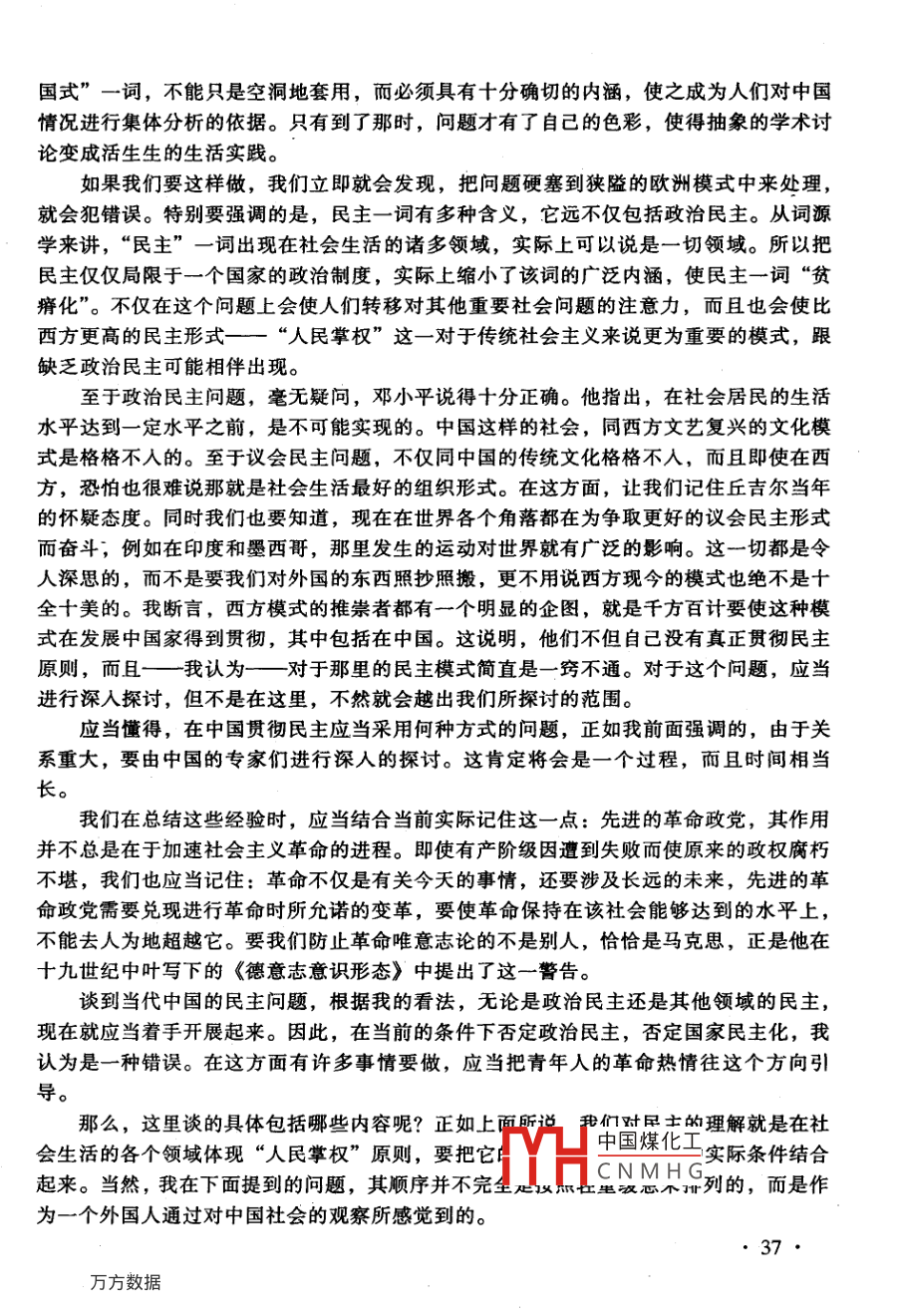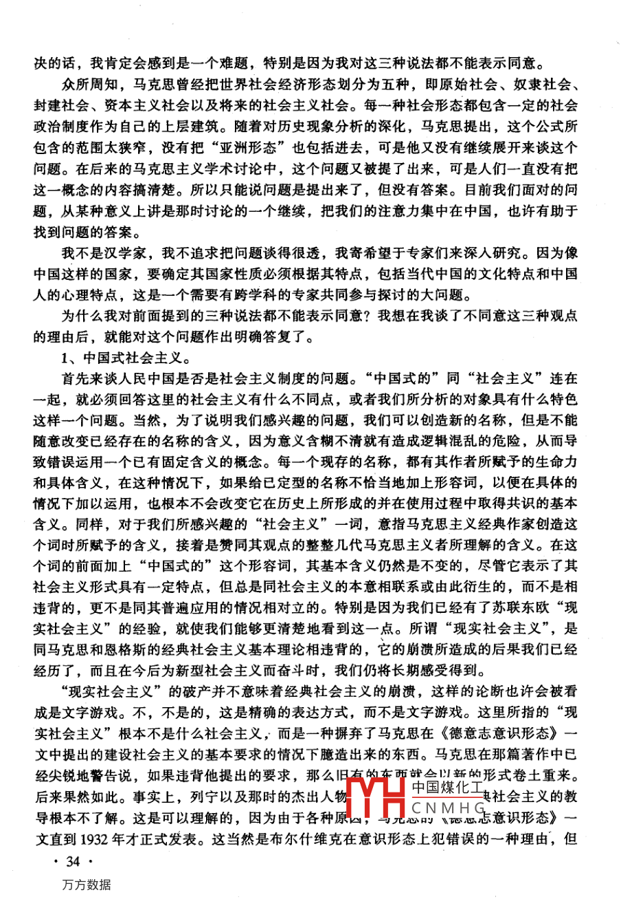 2001年第4期當代世界社會主義問題De.2001(總第70期)Issues of Contemporary World SocialismA Quarterly, No 4【中國社會主義的理論與實踐】我的中國觀[波蘭]亞當·沙夫【摘要】在目前世界所面臨的許多重大問題中,國家制度是首要問題之一,與此相關(guān)的就是民主問題,這也是中國在目前就應考慮的大問題。由于中國正處于大變革過程中,有許多不確定的因素,所以尚未形成穩(wěn)定的國家制度,只能說是一種混合型制度。關(guān)于中國當代的民主化進程,最重要的首先是婦女的公民地位和權(quán)益問題、地方自治權(quán)問題和如何給公民提供法律保護的問題?!娟P(guān)鍵詞】國家制度;政治民主;中國【作者簡介】亞當沙夫( Adam Schaff),生于1913年3月,波蘭哲學教授、科學院院士,東歐著名的馬克思主義理論家。【中圖分類號】D61,D2【文獻標識碼】A【文章編號】1001-5574(2001)04-0033-06中國問題,在我以往的著作中提的不多。這倒不是因為我對中國不感興趣,實際上,我一直在關(guān)注著中國形勢的發(fā)展。我一直想寫點什么,但又擔心我對中國的特點了解不多,談不深刻。我在《探索總結(jié)》(1999年華沙出版)一書中曾經(jīng)專門寫了關(guān)于中國問題的一章,可是因為所依據(jù)的材料主要來自西方報刊,而不是直接來自中國,所以雖然有了初稿,為了慎重起見還是撤下來了。我知道,中國關(guān)于社會主義問題的討論進行得很熱烈,所以現(xiàn)在我決定談談我的中國觀,盡管我對中國了解有限,但還是以負責的精神說說我的看法我認為,在目前世界所面臨的許多重大問題中,國家制度問題是首要問題之一,與此相關(guān)的就是民主問題。這也是中國在目前就應考慮的大問題。、關(guān)于中國的制中國煤化工CNMHG關(guān)于中國當前的制度問題,我對目前社會上存仕的三種說法都衣示懷疑,即中國式的社會主義、中國式的資本主義、中國式的封建主義。對于這三種說法,如果要我來裁33決的話,我肯定會感到是一個難題,特別是因為我對這三種說法都不能表示同意。眾所周知,馬克思曾經(jīng)把世界社會經(jīng)濟形態(tài)劃分為五種,即原始社會、奴隸社會、封建社會、資本主義社會以及將來的社會主義社會。每一種社會形態(tài)都包含一定的社會政治制度作為自己的上層建筑。隨著對歷史現(xiàn)象分析的深化,馬克思提出,這個公式所包含的范圍太狹窄,沒有把“亞洲形態(tài)”也包括進去,可是他又沒有繼續(xù)展開來談這個問題。在后來的馬克思主義學術(shù)討論中,這個問題又被提了出來,可是人們一直沒有把這一概念的內(nèi)容搞清楚。所以只能說問題是提出來了,但沒有答案。目前我們面對的問題,從某種意義上講是那時討論的一個繼續(xù),把我們的注意力集中在中國,也許有助于找到問題的答案。我不是漢學家,我不追求把問題談得很透,我寄希望于專家們來深入研究。因為像中國這樣的國家,要確定其國家性質(zhì)必須根據(jù)其特點,包括當代中國的文化特點和中國人的心理特點,這是一個需要有跨學科的專家共同參與探討的大問題為什么我對前面提到的三種說法都不能表示同意?我想在我談了不同意這三種觀點的理由后,就能對這個問題作出明確答復了。1、中國式社會主義。首先來談人民中國是否是社會主義制度的問題。“中國式的”同“社會主義”連在起,就必須回答這里的社會主義有什么不同點,或者我們所分析的對象具有什么特色這樣一個問題。當然,為了說明我們感興趣的問題,我們可以創(chuàng)造新的名稱,但是不能隨意改變已經(jīng)存在的名稱的含義,因為意義含糊不清就有造成邏輯混亂的危險,從而導致錯誤運用一個已有固定含義的概念。每一個現(xiàn)存的名稱,都有其作者所賦予的生命力和具體含義,在這種情況下,如果給已定型的名稱不恰當?shù)丶由闲稳菰~,以便在具體的情況下加以運用,也根本不會改變它在歷史上所形成的并在使用過程中取得共識的基本含義。同樣,對于我們所感興趣的“社會主義”一詞,意指馬克思主義經(jīng)典作家創(chuàng)造這個詞時所賦予的含義,接著是贊同其觀點的整整幾代馬克思主義者所理解的含義。在這個詞的前面加上“中國式的”這個形容詞,其基本含義仍然是不變的,盡管它表示了其社會主義形式具有一定特點,但總是同社會主義的本意相聯(lián)系或由此衍生的,而不是相違背的,更不是同其普遍應用的情況相對立的。特別是因為我們已經(jīng)有了蘇聯(lián)東歐“現(xiàn)實社會主義”的經(jīng)驗,就使我們能夠更清楚地看到這一點。所謂“現(xiàn)實社會主義”,是同馬克思和恩格斯的經(jīng)典社會主義基本理論相違背的,它的崩潰所造成的后果我們已經(jīng)經(jīng)歷了,而且在今后為新型社會主義而奮斗時,我們?nèi)詫㈤L期感受得到?,F(xiàn)實社會主義”的破產(chǎn)并不意味著經(jīng)典社會主義的崩潰,這樣的論斷也許會被看成是文字游戲。不,不是的,這是精確的表達方式,而不是文字游戲。這里所指的“現(xiàn)實社會主義”根本不是什么社會主義,而是一種摒棄了馬克思在《德意志意識形態(tài)》文中提出的建設社會主義的基本要求的情況下臆造出來的東西。馬克思在那篇著作中已經(jīng)尖銳地警告說,如果違背他提出的要求,那么舊有的車西就仝以新的形式卷土重來。后來果然如此