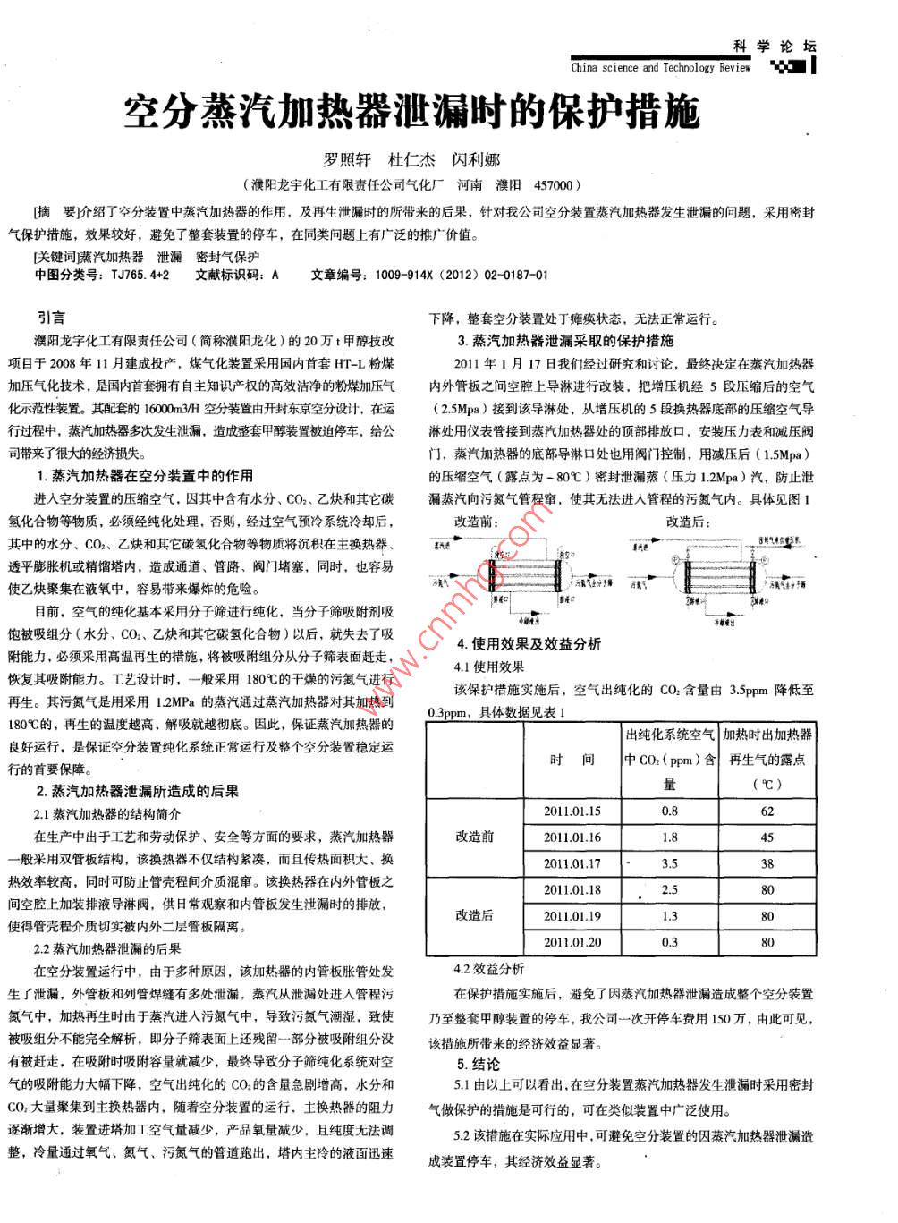 China science and Technology Re空分蒸汽加熱器泄漏時(shí)的保護(hù)措施羅照軒杜仁杰閃利娜(濮陽(yáng)龍宇化工有限責(zé)任公司氣化廠河南濮陽(yáng)457000摘要價(jià)介紹了空分裝置中蒸汽加熱器的作用,及再生泄漏時(shí)的所帶來的后果,針對(duì)我公司空分裝置蒸汽加熱器發(fā)生泄漏的問題,采用密封氣保護(hù)措施,效果較好,避免了整套裝置的停車,在同類問題上有廣泛的推廣價(jià)值。關(guān)鍵詞蒸汽加熱器泄漏密封氣保護(hù)中圖分類號(hào):TJ765.4+2文獻(xiàn)標(biāo)識(shí)碼:A文章編號(hào):1009-914X(2012)02-0187-01引言下降,整套空分裝置處于癱瘓狀態(tài),無(wú)法正常運(yùn)行。濮陽(yáng)龍宇化工有限責(zé)任公司(簡(jiǎn)稱濮陽(yáng)龍化)的20萬(wàn)t甲醇技改3.蒸汽加熱器泄漏采取的保護(hù)措施項(xiàng)目于2008年11月建成投產(chǎn),煤氣化裝置采用國(guó)內(nèi)首套HT-L粉煤2011年1月17日我們經(jīng)過研究和討論,最終決定在蒸汽加熱器加壓氣化技術(shù),是國(guó)內(nèi)首套擁有自主知識(shí)產(chǎn)權(quán)的高效潔凈的粉煤加壓氣內(nèi)外管板之間空腔上導(dǎo)淋進(jìn)行改裝,把增壓機(jī)經(jīng)5段壓縮后的空氣化示范性裝置。其配套的160m3MH空分裝置由開封東京空分設(shè)計(jì),在運(yùn)(25Mpa)接到該導(dǎo)淋處,從增壓機(jī)的5段換熱器底部的壓縮空氣導(dǎo)行過程中,蒸汽加熱器多次發(fā)生泄漏,造成整套甲醇裝置被迫停車,給公淋處用儀表管接到蒸汽加熱器處的頂部排放口,安裝壓力表和減壓閥司帶來了很大的經(jīng)濟(jì)損失門,蒸汽加熱器的底部導(dǎo)淋口處也用閥門控制,用減壓后(1.5Mpa1.蒸汽加熱器在空分裝置中的作用的壓縮空氣(露點(diǎn)為-80℃)密封泄漏蒸(壓力1Mpa)汽,防止泄進(jìn)入空分裝置的壓縮空氣,因其中含有水分、CO2、乙炔和其它碳漏蒸汽向污氮?dú)夤艹谈Z,使其無(wú)法進(jìn)入管程的污氮?dú)鈨?nèi)。具體見圖氫化合物等物質(zhì),必須經(jīng)純化處理,否則,經(jīng)過空氣預(yù)冷系統(tǒng)冷卻后改造前改造后:其中的水分、CO2、乙炔和其它碳?xì)浠衔锏任镔|(zhì)將沉積在主換熱器5氣侶系透平膨脹機(jī)或精餾塔內(nèi),造成通道、管路、閥門堵塞,同時(shí),也容易使乙炔聚集在液氧中,容易帶來爆炸的危險(xiǎn)。擊,指目前,空氣的純化基本采用分子篩進(jìn)行純化,當(dāng)分子篩吸附劑吸飽被吸組分(水分、CO2、乙炔和其它碳?xì)浠衔?以后,就失去了吸4.使用效果及效益分析附能力,必須采用高溫再生的措施,將被吸附組分從分子篩表面趕走41使用效果恢復(fù)其吸附能力。工藝設(shè)計(jì)時(shí),一般采用180℃的干燥的污氮?dú)膺M(jìn)行該保護(hù)措施實(shí)施后,空氣出純化的CO2含量由3.5pm降低至再生。其污氮?dú)馐怯貌捎?2MPa的蒸汽通過蒸汽加熱器對(duì)其加熱到3ppm,具體數(shù)據(jù)見表1L80℃的,再生的溫度越高,解吸就越徹底。因此,保證蒸汽加熱器的出純化系統(tǒng)空氣加熱時(shí)出加熱器良好運(yùn)行,是保證空分裝置純化系統(tǒng)正常運(yùn)行及整個(gè)空分裝置穩(wěn)定運(yùn)行的首要保障時(shí)間仲中CO2(pm)含再生氣的露點(diǎn)2蒸汽加熱器泄漏所造成的后果21蒸汽加熱器的結(jié)構(gòu)簡(jiǎn)介0ll01.150.8在生產(chǎn)中出于工藝和勞動(dòng)保護(hù)、安全等方面的要求,蒸汽加熱器改造前201101.161.845一般采用雙管板結(jié)構(gòu),該換熱器不僅結(jié)構(gòu)緊湊,而且傳熱面積大、換2011.01.17熱效率較高,同時(shí)可防止管殼程間介質(zhì)混竄。該換熱器在內(nèi)外管板之201101.18間空腔上加裝排液導(dǎo)淋閥,供日常觀察和內(nèi)管板發(fā)生泄漏時(shí)的改造后201101191.380使得管殼程介質(zhì)切實(shí)被內(nèi)外二層管板隔離22蒸汽加熱器泄漏的后果2011.01.200.3在空分裝置運(yùn)行中,由于多種原因,該加熱器的內(nèi)管板脹管處發(fā)42效益分析生了泄漏,外管板和列管焊縫有多處泄漏,蒸汽從泄漏處進(jìn)入管程污在保護(hù)措施實(shí)施后,避免了因蒸汽加熱器泄漏造成整個(gè)空分裝置氮?dú)庵?加熱再生時(shí)由于蒸汽進(jìn)入污氮?dú)庵?導(dǎo)致污氮?dú)獬睗?致使乃至整套甲醇裝置的停車,我公司一次開停車費(fèi)用150萬(wàn),由此可見被吸組分不能完全解析,即分子篩表面上還殘留一部分被吸附組分沒該措施所帶來的經(jīng)濟(jì)效益顯著。有被趕走,在吸附時(shí)吸附容量就減少,最終導(dǎo)致分子篩純化系統(tǒng)對(duì)空5結(jié)論氣的吸附能力大幅下降,空氣出純化的CO2的含量急劇增高,水分和51由以上可以看出,在空分裝置蒸汽加熱器發(fā)生泄漏時(shí)采用密封CO2大量聚集到主換熱器內(nèi),隨著空分裝置的運(yùn)行,主換熱器的阻力氣做保護(hù)的措施是可行的,可在類似裝置中廣泛使用。逐漸增大,裝置進(jìn)塔加工空氣量減少,產(chǎn)品氧量減少,且純度無(wú)法調(diào)52該措施在實(shí)際應(yīng)用中,可避免空分裝置的因蒸汽加熱器泄漏造整,冷量通過氧氣、氮?dú)狻⑽鄣獨(dú)獾墓艿琅艹?塔內(nèi)主冷的液面迅速成裝置停車,其經(jīng)濟(jì)效益顯著。