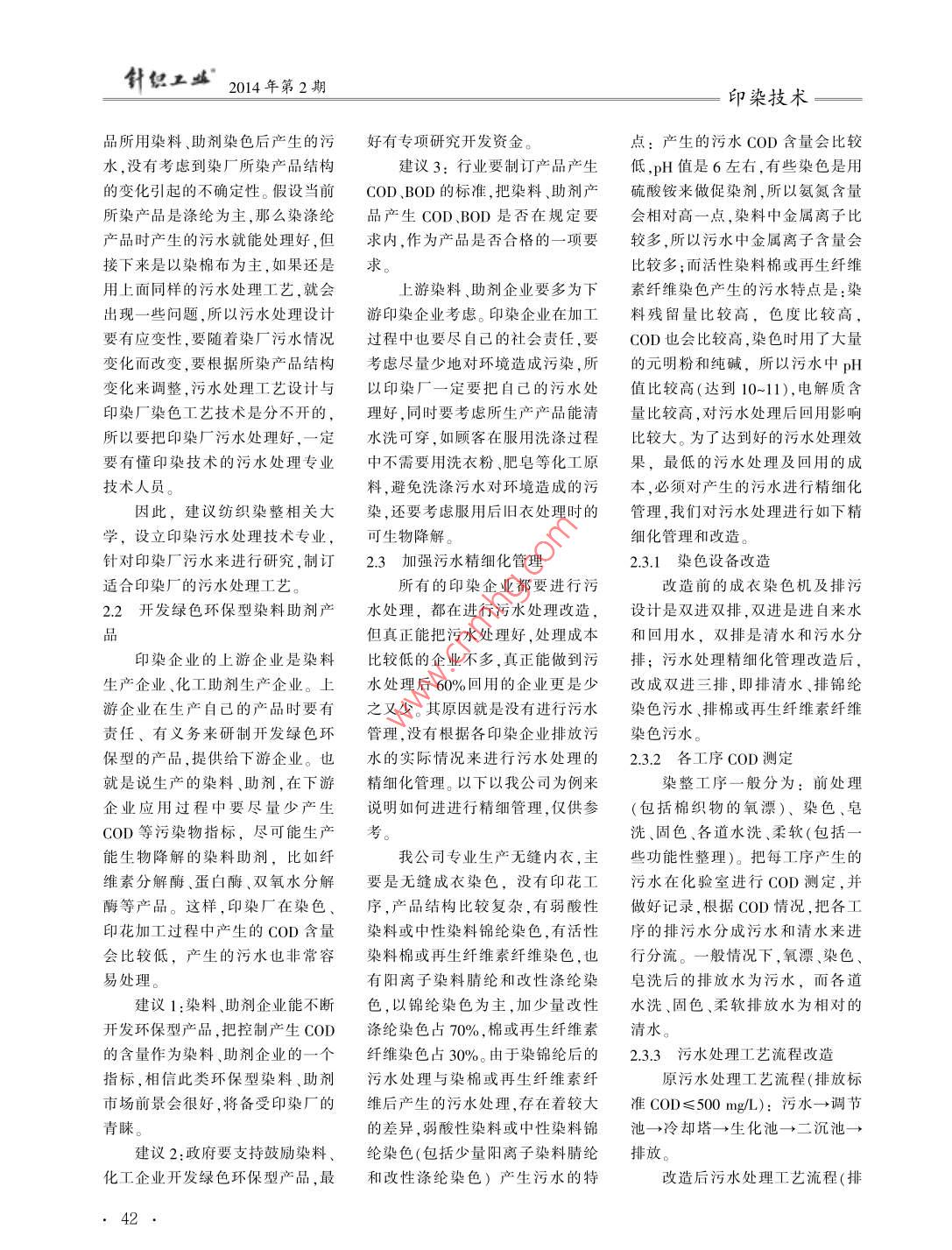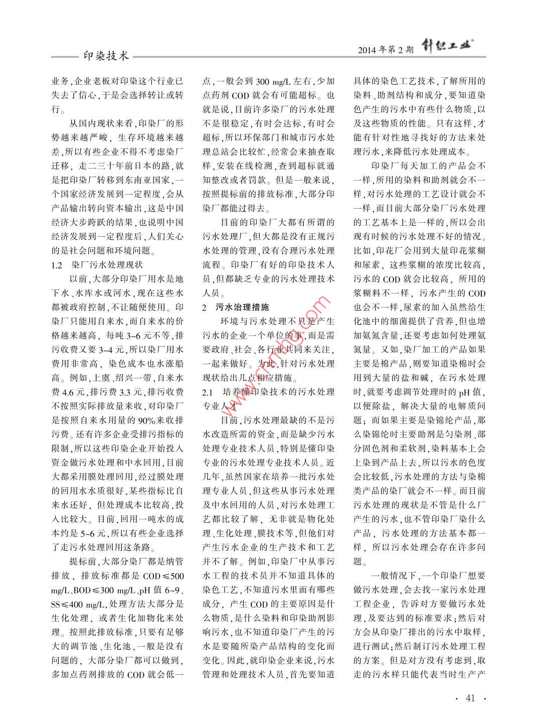 針工盛2014年第2期印染技術污水處理現(xiàn)狀及污水管理梁佳鈞浙江俏爾婷婷服飾有限公司,浙江上虞312300摘要:文中介紹了環(huán)境保護標準及染廠污水處理的現(xiàn)狀,分析了目前印染企業(yè)污水處理存在的主要題,提出了污水處理必須培養(yǎng)專業(yè)化的污水處理技術人才,指出了污水處理的重點是熟悉印染廠加工產(chǎn)品變化情況和加工工藝技術,舉例說明了污水處理工藝及精細化管理。旨為印染企業(yè)應對越發(fā)嚴峻的環(huán)境保護形勢,進行污水處理和管理提供一定的建議和參考。關鍵詞:污水處理;污水管理:印染廠:環(huán)境保護中圖分類號:X791文獻標志碼:B文章編號:1000-4033(2014)02-0040-04The Present Situation of Sewage Treatment and the sewage managementLiang jiajun(Zhejiang Qiaoer Tingting Garment Co, Ltd, Shangyu, Zhejiang 312300, ChAbstract: The present situation of environmental pollution and sewage treatment of dyeing factory is introducedThe main problems of sewage treatment at present is analyzed. It suggests that professional talents with sewagetreatment knowledge must be educated. It also points out that the key points of sewage treatment are knowing wellthe changing of processed products and the technologies of processing technology in printing and dyeing factory. Itllustrates the process of sewage treatment and the refined management. It aims at offering some suggestions andreferences about sewage treatment and sewage management under the situation of increasingly serious environmentalKey words Sewage Treatment; Sewage Management; Printing and Dyeing Factory; Environmental Protection1環(huán)境保護現(xiàn)狀或污水提標改造,這樣一來將會有確,就是要關閉部分環(huán)保不合格的1.1環(huán)境保護標準要求及印染企大部分印染廠面臨倒閉。從浙江印染廠。因此,上半年紹興的所有業(yè)現(xiàn)狀紹興一些印染廠了解到,新標準出印染廠都在考慮企業(yè)的生存問題2013年1月1日開始,國家把臺后,年初政府環(huán)保部門就召集紹印染廠出現(xiàn)了下面幾種情況:一是印染廠污水排放標準從原來的興所有的印染企業(yè)開會,政府要求企業(yè)現(xiàn)狀比較好,有業(yè)務,利潤還COD≤500mg/L、BOD≤300mg/L、所有印染企業(yè)必須定期進行整改,可以,會選擇進行污水處理整改,pH值6-9SS≤400mgL,提升要求有些地區(qū)要求在2013年6月份前把污水處理達標;二是企業(yè)不景為COD≤200mg、BOD≤50mg、提標整改完成,有的地區(qū)是9月氣,業(yè)務量少,本身處于困難之中pH值6-9SS≤100mg、色度≤80份,再晚是2013年底前完成,否則在這沉重的壓力之下,沒有資金來倍、氨氮≤30mg/L,這意味著現(xiàn)有沒整改或者整改沒達標者一律強投入污水處理和改造,企業(yè)會選擇印染廠都必須重新進行污水處理制關閉。這次政府的目的非常明放棄;三是企業(yè)不是很景氣,但有獲獎情況:“第26屆(2013年)全國針織染整學術研討會”優(yōu)秀論文作者簡介:梁佳鈞(1966-),男,技術副總,碩士。主要從事印染技術及管理工作印染技術2014年第2期針您盛業(yè)務,企業(yè)老板對印染這個行業(yè)已點,一般會到300mg左右,少加具體的染色工藝技術,了解所用的失去了信心,于是會選擇轉(zhuǎn)讓或轉(zhuǎn)點藥劑COD就會有可能超標。也染料、助劑結(jié)構和成分,要知道染行就是說,目前許多染廠的污水處理色產(chǎn)生的污水中有些什么物質(zhì),以從國內(nèi)現(xiàn)狀來看,印染廠的形不是很穩(wěn)定,有時會達標,有時會及這些物質(zhì)的性能。只有這樣,才勢越來越嚴峻,生存環(huán)境越來越超標,所以環(huán)保部門和城市污水處能有針對性地尋找好的方法來處差,所以有些企業(yè)不得不考慮染廠理總站會比較忙,經(jīng)常會來抽查取理污水,來降低污水處理成本。遷移,走二三十年前日本的路,就樣,安裝在線檢測,查到超標就通印染廠每天加工的產(chǎn)品會不是把印染廠轉(zhuǎn)移到東南亞國家知整改或者罰款。但是一般來說樣,所用的染料和助劑就會不個國家經(jīng)濟發(fā)展到一定程度,會從按照提標前的排放標準,大部分印樣,對污水處理的工藝設計就會不產(chǎn)品輸出轉(zhuǎn)向資本輸出,這是中國染廠都能過得去樣,而目前大部分染廠污水處理經(jīng)濟大步跨躍的結(jié)果,也說明中國目前的印染廠大都有所謂的的工藝基本上是一樣的,所以會出經(jīng)濟發(fā)展到一定程度后,人們關心污水處理廠,但大都是沒有正規(guī)污現(xiàn)有時候的污水處理不好的情況。的是社會問題和環(huán)境問題水處理的管理,沒有合理污水處理比如,印花廠會用到大量印花漿糊1.2染廠污水處理現(xiàn)狀流程。印染廠有好的印染技術人和尿素,這些漿糊的濃度比較高,以前,大部分印染廠用水是地員,但都缺乏專業(yè)的污水處理技術污水的COD就會比較高,所用的下水、水庫水或河水,現(xiàn)在這些水人員。漿糊料不一樣,污水產(chǎn)生的COD都被政府控制,不讓隨便使用。印2污水治理措施也會不一樣,尿素的加入雖然給生染廠只能用自來水,而自來水的價環(huán)境與污水處理不只是產(chǎn)生化池中的細菌提供了營養(yǎng),但也增格越來越高,每噸3~6元不等,排污水的企業(yè)一個單位的事,而是需加氨氮含量,還要考慮如何處理氨污收費又要3-4元,所以染廠用水要政府、社會、各行業(yè)共同來關注,氮量。又如,染廠加工的產(chǎn)品如果費用非常高,染色成本也水漲船起來做好。為此,針對污水處理