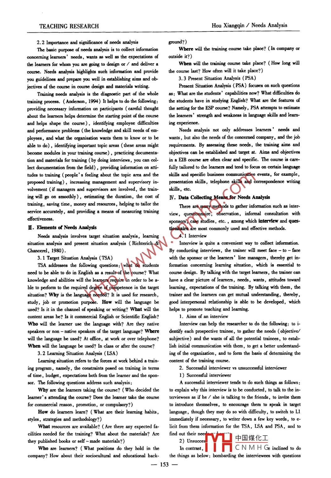 語文學(xué)利●外語教育赦學(xué)2014年第4期Needs Analysis0 Hou Xiangqin(Cuangdong University of Foreign Sudies , Guangzhou, Guangdong, 510420)[ Abstract] Needs analysis, involving target situation analyeis, leaming situation analysis and preent situationanalysis, plays an indispensible role in the succes of a training program. Conducted in terms of instuments such 8 inter-view, questionnaire, needs analysis can help us to idenify the needs and wants of the trainces and provide sugstions andguidelines accordingly for the training.[Key words]needs analysis,signifcance, elements, data olleting means[中圖分類號] H319[文獻(xiàn)標(biāo)識碼] A [ 文章編號] 1672-8610(2014)04-0152-03sities, wants and lacks. Dudley - Evans & St John state thatL IntroductionNeeds Analysis is the process of the identifing the wbo,needs analysis in ESP encompases the fllowing: Profesionaldetermining the what and deigning the bow of a traininginformation about the learmers - - target situation analysis and ob-jective needs; Personal inforation about the leamer: wants,course. It is erucial to ESP courses.Broadly speaking, two diferent types of needs analysis aremeans , subjective needs; Their curent 8kills and language ube:involved before designing a course: leamer analysis vs task anal-present situation analysis.Between TSA and PSA there is lacks.ysis The former is based on information about the leamers;2.1 Types of needs(that is: For what purpoes are tbe leamers leaming the lan-1. Target needs: objective, perceived, product - orientedguage) ; while the ltter is to specify and categorize the languageTarget needs is kind of an umbrella temm, under which arekills required to carry out real - world communication tasks,and tbus to etblih the comicaive pupoe for which the leamen' necsitis, lacks and wants.ecessities belong to the type of need determined by the delearmer wishes to achieve.The process of cllcting and interpreing data on the leam-mands of the target situatin ( the destination) , that is, what theens' likely use of the target language has been a idisensable leamer has to know in order 0o fumction efectively in the targetfeature of ESP.situation. For example, a businessman may need meeting skillsBrieger (1997) suggeats that noeds analysis for busines to call a meig. To make an eective metig, he may need toEnglish will et out to identify the range of general and specialitdevelop communication skills needed for chairing and participat-language knowledge required, together with general and profes-ing in metigs. Or he may need language knowledge such a8 in-sional communication skills.terrupting, clarifying, agreeing or disagreeing.Lacks refers to the gap between the target proficiency andI. An Overview of Learners' NeedsAccording to Robinson (1991), needs refer to students'the existing proficiency of the leamers (the starting point). Bstudy or job requirements, namely, what tbey have to be able todeciding lacks, you need to know what the leamner knows alread-do at the end of their language course. This is goal - onientedy, so that you ca then decide which of the necessities the leamnerdefnition of needs. Needs can be seen as obijectives. They canlacks.Wants indicates the leamer's view a to what their needsbe regarded as“what the leamer needs to do to actually acquireare or their aspirations for achieving a certain goal in the future.the language.”This is process - oriented definition of needs.2. Leaming needs: subjective, felt, process - orientedBrindley (1989) describes needs in terms of bijective andLeamers' needs are subjective, felt and process - oriented.subjective needs. The formner refers to needs of leamersmation: their use of language in real - life communication situa-In this sense, the trainer should knowing how to get from thetions, their curent language proficiency and language difcul-starting point to the destination and defie the leaming purposeties. The latter refers to the cognitive and afective needs of theboth for job - experienced leamer and pre - experienced leamer.learmer in the leaming situaion, factors such as personality,On the other hand, the trainer should know information a-confidence, atitude, expectations concening leaming English.bout the leamer factors ffecting the leamer' s response to train-Whereas Hutchinson & Waters (1993) see needs as neces-ing, moivation中國煤化工[基金項目]本文系2013年度全國高校外語教學(xué)科研項目(粵-0013 -B)“商務(wù)英語多MYHCN M H G成果之一。[作者簡介]侯香勤,女,廣東外語外貿(mào)大學(xué)商務(wù)英語學(xué)院講師,硬士,研究方向:語言學(xué)與應(yīng)用語言學(xué)、商務(wù)英語教學(xué)。-152-TEACHING RESEARCHHou Xiangqin / Needs Analysis2. 2 Importance and signifcance of needs analysisground?)The basic purpose of needs analysis is to collect informationWbere will the training course take place? ( In company orconcemning leamers’needs, wants 8 well as the expectations ofoutside it?)the learmers for whom you are going to design or/ and deliver &Wben will the training course take place? (How long willcourse. Needs analysis highlights such informnation and providethe course last? How often will it take place?)you guidelines and prepare you well in establishing aims and ob-3.3 Present Situation Analysis (PSA)jectives of the course in course design and materials writing.Present Situation Analysis (PSA) focuses on such quetionsTraining needs analysis is the diagnostic part of the wholeas: What are the students' capabilities now? What difculies dotraining proces. ( Anderson, 1994) It helps to do the fllowing:the students have in studying English? What are the features ofproviding necessary information on participants ( careful thoughtthe setting for the ESP course? Namely, PSA attempts to estimateabout the learmers helps determine the starting point of the coursethe learmers' strength and weakness in language skills and leam-and helps