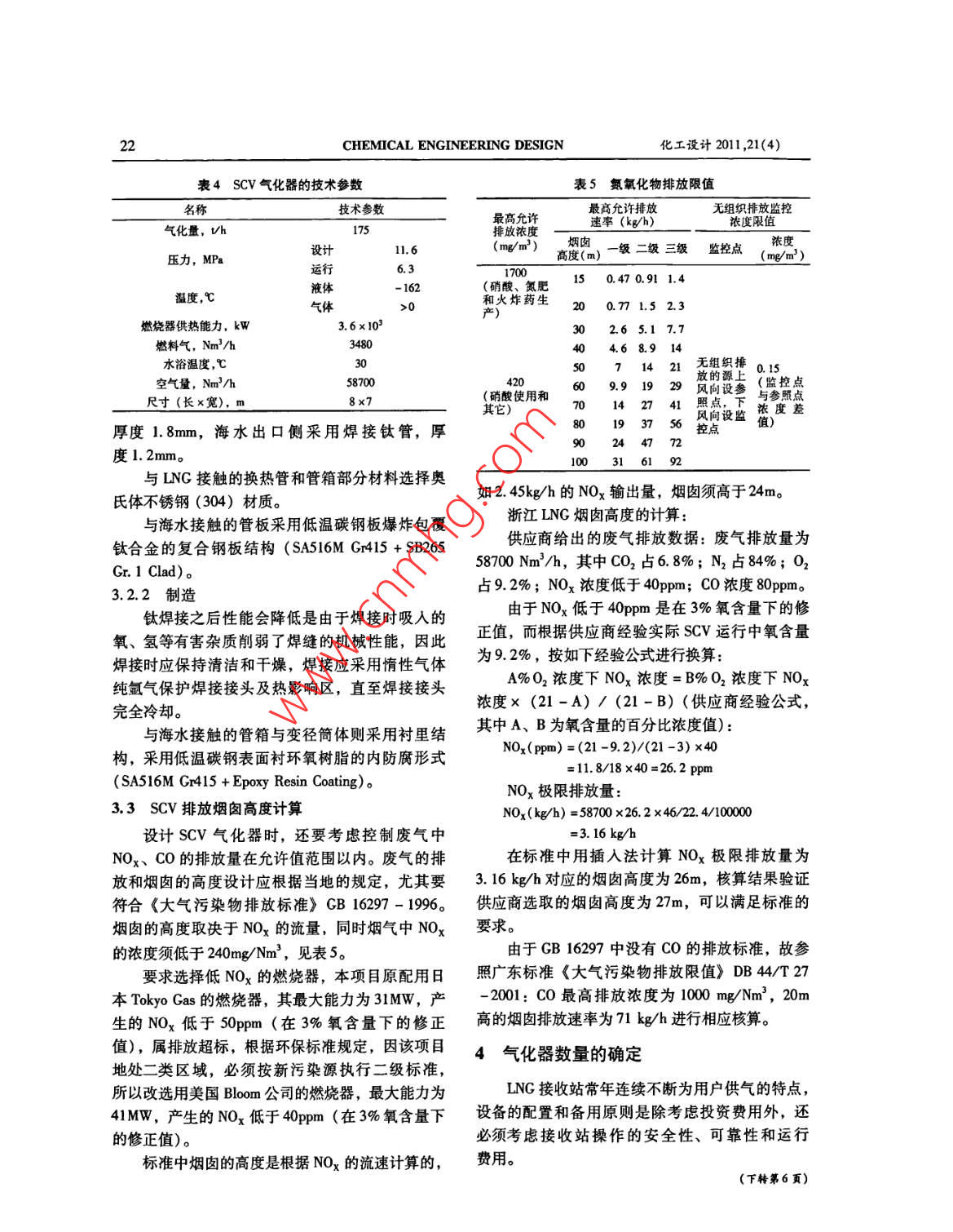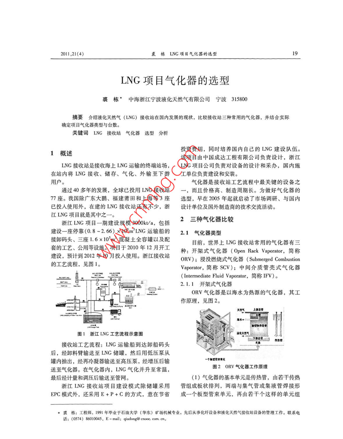 2011,21(4)裘棟LNC項目氣化器的選型LNG項目氣化器的選型裘棟中海浙江寧波液化天然氣有限公司寧波 315800摘要介紹液化天然氣 (LNG)接收站在國內(nèi)發(fā)展的現(xiàn)狀,比較接收站三種常用的氣化器,并結(jié)合實際確定項目氣化器類型與臺數(shù)。關(guān)鍵詞LNG 接收站氣化器選型分析投資費用,同時培養(yǎng)國內(nèi)自己的LNG建設(shè)隊伍。1概述該項目由中國成達工程有限公司負責(zé)設(shè)計,浙江LNG接收站是接收海上LNG運輸?shù)慕K端站場,LNG項目公司負責(zé)對設(shè)備的設(shè)計和采辦,國內(nèi)施在站內(nèi)將LNG接收、儲存、氣化、外輸至下游工單位負責(zé)建設(shè)和安裝。用戶氣化器是接收站工藝流程中最關(guān)鍵的設(shè)備之通過40多年的發(fā)展,全球已投用LNG接收站一,而且價格高、制造周期長。為做好氣化器的77座。我國除廣東大鵬、福建莆田和上海等3座選型,早在2005年起就啟動了市場調(diào)研、與國內(nèi)已投人使用外,在建的LNG接收站還有不少,浙設(shè)計單位及國外制造商的技術(shù)交流活動。江LNG項目就是其中之一一。浙江LNG項目一期建設(shè)規(guī)模3000kv/a,包括2三種氣化器比較建設(shè)- - 座停靠(0.8~2.66) x 10'm3 LNG運輸船的2.1氣化器類型接卸碼頭、三座1.6x10'm'混凝土全容罐以及配.目前,世界上LNG接收站常用的氣化器有三套的工藝、公用等設(shè)施。項目于2010年12月開工種:開架式氣化器( Open Rack Vaporator, 簡稱建設(shè),預(yù)計到2012年10月投入使用。浙江接收站ORV);浸沒燃燒式氣化器(Submerged Combustion的工藝流程,見圖1。Vaporator, 簡稱SCV);中間介質(zhì)管殼式氣化器( Intermediate Fluid Vaporator,簡稱IFV)。2.1.1開架式氣化器ORV氣化器是以海水為熱源的氣化器,其工作原理,見圖2。無然___上都總管m換空換熱管來圖1 浙江LNG工藝流程示意圖接收站工藝流程:LNG運輸船到達卸船碼頭..后,經(jīng)卸料臂輸送至LNG儲罐,然后用低壓泵從罐內(nèi)抽出,經(jīng)再冷凝器輸送至高壓泵,經(jīng)增壓后輸一個瓶整管來單元圖2 ORV 氣化器工作原理送至氣化器。在氣化器內(nèi),LNG氣化并升至常溫,最后經(jīng)計量和調(diào)壓后輸送至管網(wǎng)。(1)氣化器的基本單元是傳熱管,由若干傳熱浙江LNG接收站項目建設(shè)模式除儲罐采用管組成板狀排列,兩端與集氣管或集液管焊接形.EPC模式外,還采用E+P+C的方式,意在節(jié)省成一個板型管束單元,再由若干個這樣的單元組*裘棟:工程師。1991年畢業(yè)于石油大學(xué)(華東)礦場機械專業(yè)。先后從事化纖設(shè)備和液化天然氣接收站設(shè)備的管理工作。聯(lián)系電話: (0574) 86010045, E- mail: qiudong@ cnooe. com. cn。2011 ,21(4)裘棟LNG項目氣化器的選型21熱器中與管程中的LNG進行熱交換,LNG受熱氣表2水質(zhì)監(jiān)測結(jié)果統(tǒng)計(mg/L)化,而丙烷則被冷凝。在第三段E3換熱器中,用目平均值最大值最小值平均值 最大值最小值S管程中的海水加熱NG,使輸出的天然氣溫度達到要求。丙烷始終在E1殼體中進行氣-液態(tài)的閉式懸浮固體1370 187760010循環(huán),運行過程中無需添加。用丙烷作為中間介從表2可以看出,現(xiàn)場海水含沙量很高,懸浮質(zhì)就是利用其較低的沸點這一特點,避免了直接固體顆粒指標(biāo)平均在1000 ~ 1300 mg/L。根據(jù)廠家用海水換熱時由于結(jié)冰對傳熱效果的影響。使用記錄,在最大懸浮固體顆粒濃度不大于80目前,IFV氣化器的制造商僅有日本神戶鋼鐵mg/L的情況下,ORV防腐涂層有效時間為7 ~8一家。自1978年以來,在日本大坂瓦斯、廣島瓦年。然而,浙江LNG的海水水質(zhì)已超出了ORV要斯、上海LNG等LNC項目上已投用了總計33臺。求水質(zhì)條件的 15倍以上,供應(yīng)商估計涂層至少1其最大天然氣流量達到205th。~2年就須維護- -次。2.2三種氣化器適用性比較通過與廠商的交流,以及對周邊電力行業(yè)的三種氣化器的適用性分析比較,見表1。調(diào)研(使用同樣海水用于發(fā)電機凝汽器冷卻),選擇鈦管材質(zhì)的管殼式氣化器是解決海水含沙量高表1三種氣化器的適 用性比較比較內(nèi)容ORVFV_的方法,因而浙江LNG采用以IFV氣化器作為主氣化器,SCV 氣化器作為調(diào)峰和備用。業(yè)績及使用情況業(yè)績廣泛,主要在日本使業(yè)績廣泛,使用良好用,使用良好使用良好3.2選材和制造技術(shù)可靠性安全可靠安全可靠安 全可靠IFV氣化器主要性能參數(shù),見表3。本地海水適用性基本適用表3 IFV 的主要性能參數(shù)維護要求較高般單臺設(shè)備價格次之高運行能耗一般名稱器介質(zhì)壓力任萬最低沒修材(MPa) (MPa)度(C)運行費用供貨情況二家廠商22-24個月約15個月獨家E3管程-海水0.2 0.8 -5/60 .SB338制造周期.約14個月調(diào)溫器. t1.8*L3510從表1可見,SCV雖然啟動迅速,但負荷調(diào)節(jié)”殼程皿NG 6.28 11.6 -60/60O pitch 25和操作不像ORV和IFV那樣簡單方便,而且運行SA213M TP304成本較高,只能作為主氣化器的備用。結(jié)合與上E-2管程mLING 6.3 11.6 -165/600.D.15.9 *述各廠商的技術(shù)交流情況,ORV與IFV使用的全蒸發(fā)器”殼程皿丙燒0.262.03-40/60 *ST.L9000 .t1.6壽命周期費用相當(dāng),因此二者均可作為項目的主△ptich 21氣化器。E-1管程-海水0.17 0.8 -5/60 S888丙烷.0. D. 19.053氣化器選用加熱器殼程I丙烷0.26 2.03-40/60T1.2 * L9008△pitch 25氣化器的處理能力代表了接收站的實際處理注: E-3NG 調(diào)溫器自重34800 kg; 