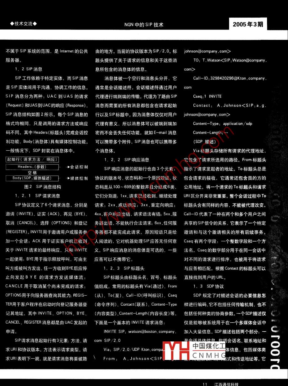 江西通信科技2005年3期Jiangxi Communication Science & Technology◆技術(shù)交流◆文章編號(hào): 1009-0940(2005)-03-0010-03引言隨著以軟交換為核心的NGN(Next Generation Network, 下一代網(wǎng)絡(luò))在我國(guó)成功啟動(dòng).傳統(tǒng)網(wǎng)絡(luò)向NGN演進(jìn)的工作已全面展開(kāi)。NGN是 - -個(gè)基于IP的全新通信網(wǎng)絡(luò),融合了語(yǔ)音、數(shù)據(jù)、多媒體等多種業(yè)務(wù)。它具有三大特點(diǎn):首先, NGN采用開(kāi)放的網(wǎng)絡(luò)架構(gòu)體系:其次,NGN是業(yè)務(wù)驅(qū)動(dòng)的網(wǎng)絡(luò),業(yè)務(wù)與呼叫控制分離,呼叫與承載分離:再次, NGN是基于統(tǒng)一的IP協(xié)議的分組網(wǎng)絡(luò)。謝軟交換技術(shù)是NGN語(yǔ)音.通信及多媒體和數(shù)據(jù)交互的核心技術(shù)。軟交換技術(shù)體現(xiàn)了剛NGN的第二個(gè)特點(diǎn)即控制/業(yè)務(wù)與承載分離的思想。作為控制實(shí)體的軟交換機(jī),完成呼叫接續(xù),業(yè)務(wù)控制和用戶管理等功能,而業(yè)務(wù)媒體流的傳送由IP基礎(chǔ)網(wǎng)絡(luò)完成。在整個(gè)中南軟交換體系中,完成接續(xù)、控制功能的信令協(xié)議起到核心作用,決定了業(yè)務(wù)提供能力的強(qiáng)弱。SIP (Session Initiation Protocol, 會(huì)話啟動(dòng)協(xié)議)就是這樣一種信令協(xié)議, 具有簡(jiǎn)的單,開(kāi)放、靈活、可擴(kuò)展等多方面明顯的優(yōu)點(diǎn),已成為NGN軟交換體系的重要技術(shù)。學(xué)1.SIP技術(shù)SIP是由IETF MMUSIC工作組定義的一一個(gè)通用的會(huì)話建立協(xié)議(這里的會(huì)話泛指IP網(wǎng)通絡(luò)客戶和服務(wù)器之間任意的一個(gè)事務(wù)).它設(shè)計(jì)思想和Internet常用協(xié)議一致,基于文本.語(yǔ)法簡(jiǎn)單,易于擴(kuò)展。它也采用URL地址機(jī)制,可方便的與Web應(yīng)用融合,從而有利于系IP電話和網(wǎng)上業(yè)務(wù)的結(jié)合。利用SIP可實(shí)現(xiàn)會(huì)話的發(fā)起、建立和釋放.并支持單播、組播和移動(dòng)性。同時(shí),SIP 還可以與SDP (Session Description Protocol, 會(huì)話描述協(xié)議)配合.技懲動(dòng)態(tài)調(diào)整和修改會(huì)話屬性,如通話帶寬、傳輸媒體類型及媒體的編解碼格式等,來(lái)實(shí)現(xiàn)呼叫和控制合一的功能。術(shù)京1. 1 SIP網(wǎng)絡(luò)結(jié)構(gòu)如圖1所示為SIP 網(wǎng)絡(luò)結(jié)構(gòu)。SIP 網(wǎng)絡(luò)采用IP網(wǎng)絡(luò)常用的客戶機(jī)/服務(wù)器(C/S) 結(jié)構(gòu),包括兩類服務(wù)器:用戶代理(User Agent) 和網(wǎng)絡(luò)服務(wù)器(Network Server)。SUAC"SUAS摘要: NGN是一個(gè)基于IP的全新通信網(wǎng)圖1 SIP 系統(tǒng)網(wǎng)絡(luò)結(jié)構(gòu)絡(luò),融合了語(yǔ)青、數(shù)據(jù)。多媒體等多種業(yè)務(wù)。NGV用戶代理又分為用戶代理客戶端(UAC. User Agent Client) 和用戶代理服務(wù)器(UAS,以軟交換為核心,SIP 作為軟交換的呼叫控制信Jser Agent Server), 其中, UAC負(fù)責(zé)發(fā)起SIP的呼叫請(qǐng)求. UAS負(fù)責(zé)對(duì)呼叫請(qǐng)求作出響令協(xié)議,簡(jiǎn)單、開(kāi)放,靈活,可擴(kuò)展,已成為NGN的重要技術(shù)。本文主要分析了SIP網(wǎng)絡(luò)結(jié)應(yīng)。網(wǎng)絡(luò)服務(wù)器分為代理服務(wù)器(PS. Proxy Server). 重定位服務(wù)器(RS, Redirect Server)構(gòu)、SIP消息內(nèi)容。SDP協(xié)議以及SIP在NGN中和注冊(cè)服務(wù)器(RS, Register Server) 三種,主要為用戶代理提供注冊(cè)。認(rèn)證.鑒權(quán)、路的應(yīng)用。由等服務(wù)。PS提供路由功能年專醬r”工過(guò)中nt發(fā)到相應(yīng)的下一跳。RS 提供中國(guó)煤化工關(guān)鍵詞: NGN, SIP, SDP,款交換地址解析服務(wù),將SIP呼叫CNMHG%t。PS和AS在確定下一跳服務(wù)器時(shí)都有可能向定位服務(wù)n. wJounu化山查詢請(qǐng)求。定位服務(wù)器本身收稿日期: 2005 -07 - 1910 江西通信科技◆技術(shù)交流◆NGN中的SIP技術(shù)2005年3期不屬于SIP系統(tǒng)的范圍,是Internet的公共由的地方。 當(dāng)前的協(xié)議版本為SIP/2.0。 標(biāo)johnson@company . com>服務(wù)器。題頭提供了關(guān)于請(qǐng)求的信息和關(guān)于這些消TO: T. Watson