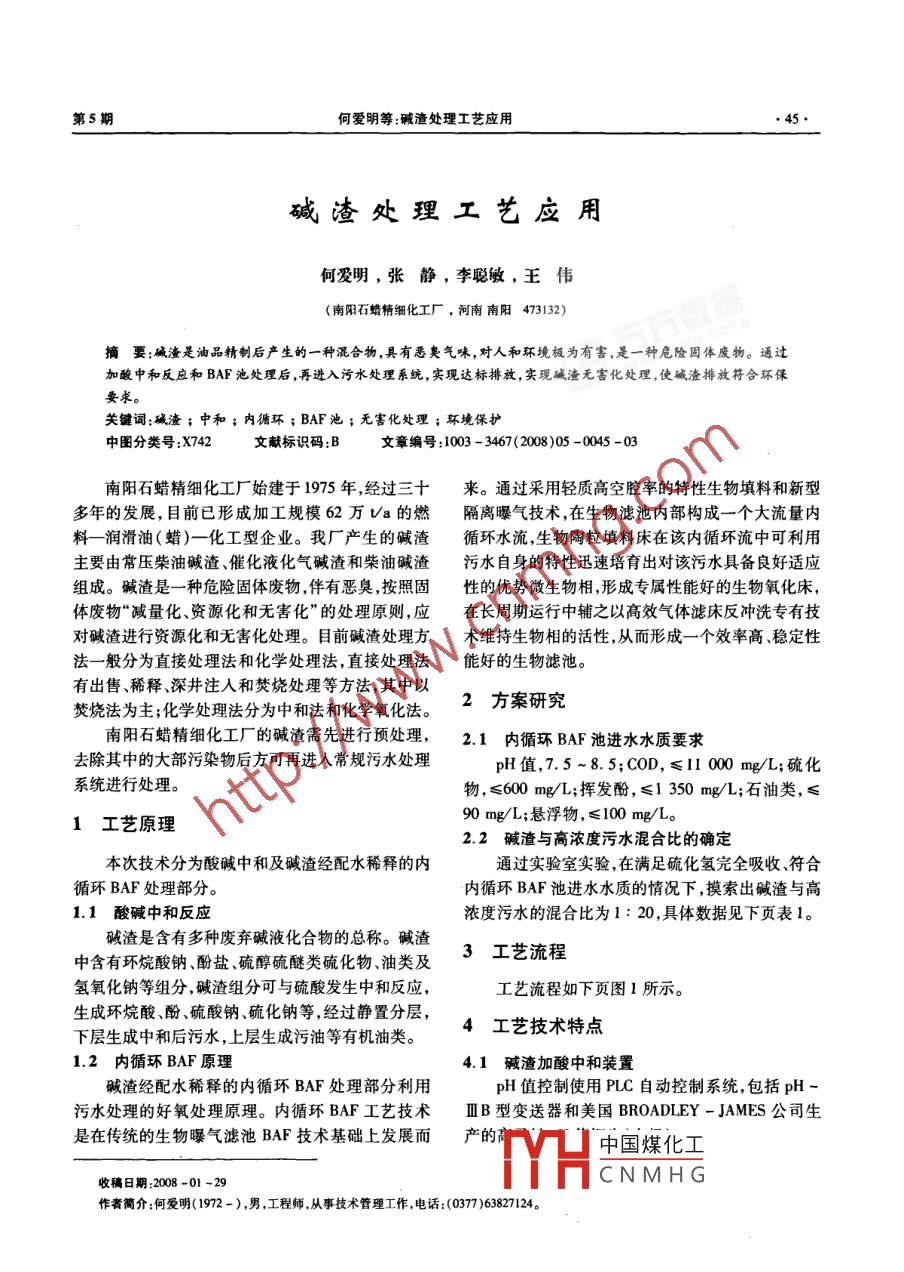 第5期何愛明等:堿渣處理工藝應(yīng)用45堿渣處理工藝應(yīng)用何愛明,張靜,李聰敏,王偉(南陽石蠟精細化工廠,河南南陽473132)摘要:堿渣是油品精制后產(chǎn)生的一種混合物,具有惡奧氣味,對人和環(huán)境極為有害,是一種危險固體廢物。通過加酸中和反應(yīng)和BAF池處理后,再進入污水處理系統(tǒng),實現(xiàn)達標排放,實現(xiàn)堿渣無害化處理,使堿渣排放符合環(huán)保要求。關(guān)鍵詞:堿渣;中和;內(nèi)循環(huán);BAF池;無害化處理;環(huán)境保護中圖分類號:X74文獻標識碼:B文章編號:1003-3467(2008)05-0045-03南陽石蠟精細化工廠始建于1975年,經(jīng)過三十來。通過采用輕質(zhì)高空腔率的特性生物填料和新型多年的發(fā)展,目前已形成加工規(guī)模62萬va的燃隔離曝氣技術(shù),在生物濾池內(nèi)部構(gòu)成一個大流量內(nèi)料一潤滑油(蠟)一化工型企業(yè)。我廠產(chǎn)生的堿渣循環(huán)水流,生物陶粒填料床在該內(nèi)循環(huán)流中可利用主要由常壓柴油堿渣、催化液化氣堿渣和柴油堿渣污水自身的特性迅速培育出對該污水具備良好適應(yīng)組成。堿渣是一種危險固體廢物,伴有惡臭,按照固性的優(yōu)勢微生物相形成專屬性能好的生物氧化床體廢物“減量化、資源化和無害化”的處理原則,應(yīng)在長周期運行中輔之以高效氣體濾床反沖洗專有技對堿渣進行資源化和無害化處理。目前堿渣處理方術(shù)維持生物相的活性,從而形成一個效率高穩(wěn)定性法一般分為直接處理法和化學(xué)處理法,直接處理法能好的生物濾池。有出售、稀釋、深井注入和焚燒處理等方法,其中以焚燒法為主;化學(xué)處理法分為中和法和化學(xué)氧化法。2方案研究南陽石蠟精細化工廠的堿渣需先進行預(yù)處理,2.1內(nèi)循環(huán)BAF池進水水質(zhì)要求去除其中的大部污染物后方可再進入常規(guī)污水處理pH值,7.5-8.5;COD,≤11000mg/L;硫化系統(tǒng)進行處理。物,≤600mg/L;揮發(fā)酚,≤1350mg/L;石油類,≤1工藝原理90mg/L;懸浮物,≤100mg/L。2.2堿渣與高濃度污水混合比的確定本次技術(shù)分為酸堿中和及堿渣經(jīng)配水稀釋的內(nèi)通過實驗室實驗,在滿足硫化氫完全吸收、符合循環(huán)BAF處理部分內(nèi)循環(huán)BAF池進水水質(zhì)的情況下,摸索出堿渣與高11酸堿中和反應(yīng)濃度污水的混合比為1:20,具體數(shù)據(jù)見下頁表1。堿渣是含有多種廢棄堿液化合物的總稱。堿渣中含有環(huán)烷酸鈉、酚鹽、硫醇硫醚類硫化物、油類及3工藝流程氫氧化鈉等組分,堿渣組分可與硫酸發(fā)生中和反應(yīng)工藝流程如下頁圖1所示。生成環(huán)烷酸、酚、硫酸鈉、硫化鈉等,經(jīng)過靜置分層,下層生成中和后污水,上層生成污油等有機油類。4工藝技術(shù)特點1.2內(nèi)循環(huán)BAF原理4.1堿渣加酸中和裝置堿渣經(jīng)配水稀釋的內(nèi)循環(huán)BAF處理部分利用pH值控制使用PLC自動控制系統(tǒng),包括pH污水處理的好氧處理原理。內(nèi)循環(huán)BAF工藝技術(shù)ⅢB型變送器和美國 BROADLEY- JAMES公司生是在傳統(tǒng)的生物曝氣濾池BAF技術(shù)基礎(chǔ)上發(fā)展而產(chǎn)的中國煤化工收稿日期:2008-01-29CNMHG作者簡介:何愛明(1972-),男,工程師從事技術(shù)管理工作,電話:(0377)63827124河南化工HENAN CHEMICAL INDUSTRY2008年第25卷表1堿渣高濃度污水和混合后堿渣的水質(zhì)、水量流量pH值硫化物揮發(fā)酚石油類項目第8.8mg/L稀釋用高濃度污水4.1042.65235.82040.382.5常壓直餾柴油堿渣0.1412.23064.5153439.592.6催化液化氣堿渣0.0512624045.027366174144.02100.027.2催化柴油堿渣>14.016030.08636.01014489.67560.020.0混合水質(zhì)5001:20)1478.81619.819148.62227.3稀釋水曝氣尾氣吸收設(shè)4.77m3/h硫酸中和罐-兩級內(nèi)循環(huán)BAF池含油污水處理系統(tǒng)達標排放0.23m3/h中和pH值中和pH值8%濃硫酸至8左右至7-8左右圖1工藝流程圖4.2內(nèi)循環(huán)BAF處理裝置向上膨脹,使填料層處于微變速膨脹狀態(tài),從而提高4.2.1高品質(zhì)填料了濾料層擾動強度和系統(tǒng)應(yīng)力中的附加切應(yīng)力。生生物床采用粘土陶粒,具有較大的比表面積和物膜及雜質(zhì)在強烈的剪切、碰撞作用下快速脫落,從總孔容積,抗機械磨損強度高,表面粗糙,化學(xué)穩(wěn)定而提高了系統(tǒng)的反沖洗效果,避免了濾料的粘結(jié)堵性強。采用獨特的空腔率和比表面積相匹配的填塞保持了反應(yīng)器的活性達到穩(wěn)定處理的目的。料,構(gòu)成了一個有利于生物相形成的濾床。4.2.4完善的監(jiān)測控制系統(tǒng)4.2.2新型曝氣技術(shù)生物濾池的反沖洗是保障系統(tǒng)正常運行的關(guān)在傳統(tǒng)BAF技術(shù)中,因其所采用的濾速較低而鍵對出水水質(zhì)、運行周期、運行狀況的影響很大。使得污染物的氧化與過濾主要集中在反應(yīng)器端部本系統(tǒng)的整個反沖洗過程由程序控制,自動按次序(約0.5m),整個濾池的容積利用率低,同時由于填控制管道上的閥門,使系統(tǒng)保持穩(wěn)定運行。料層中氣液固三相的分配不均勻,容易出現(xiàn)曝氣溝流短路現(xiàn)象降低處理效率。本技術(shù)采用獨有的隔5主要參數(shù)和質(zhì)量控制指標離式曝氣技術(shù),在曝氣的同時使污水沿曝氣器管道5.1酸堿反應(yīng)工藝參數(shù)提升,再經(jīng)過生物床,形成大流量內(nèi)循環(huán),這樣既強pH值,7.5~8.5;工業(yè)風壓力,不低于0