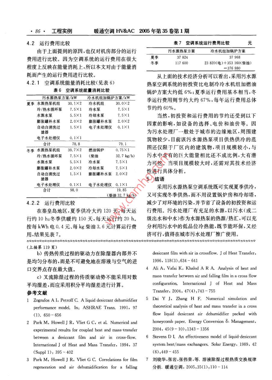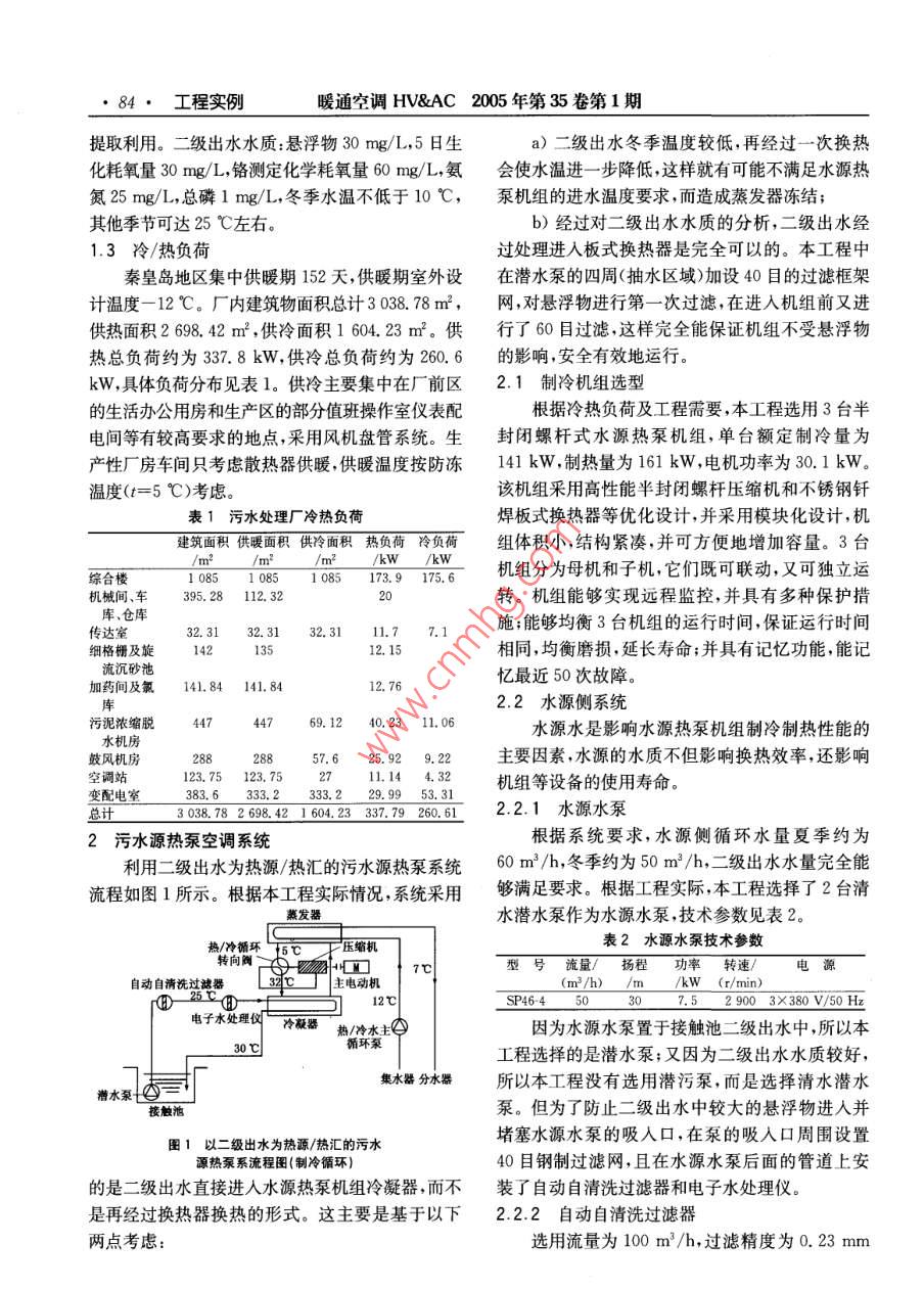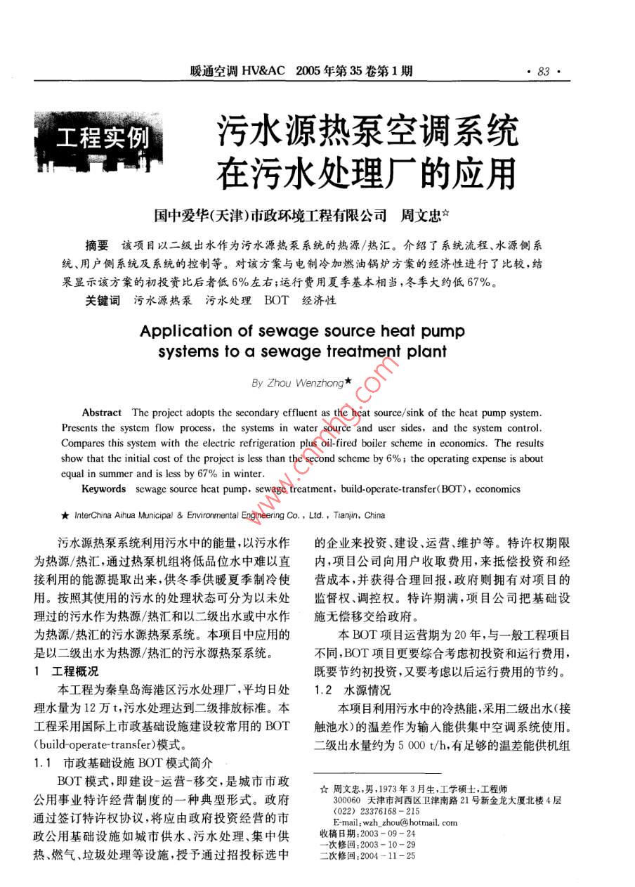 暖通空調(diào)H&AC2005年第35卷第1期83工程實(shí)例污水源熱泵空調(diào)系統(tǒng)在污水處理廠的應(yīng)用國(guó)中愛(ài)華(天津)市政環(huán)境工程有限公司周文忠☆摘要該項(xiàng)目以二級(jí)出水作為污水源熱泵系統(tǒng)的熱源/熱匯。介紹了系統(tǒng)流程、水源側(cè)系統(tǒng)、用戶側(cè)系統(tǒng)及系統(tǒng)的控制等。對(duì)該方案與電制冷加燃油鍋爐方案的經(jīng)濟(jì)性進(jìn)行了比較,結(jié)果顯示該方案的初投資比后者低6%左右;運(yùn)行費(fèi)用夏季基本相當(dāng),冬季大約低67%。關(guān)鍵詞污水源熱泵污水處理BOT經(jīng)濟(jì)性Application of sewage source heat pumpsystems to a sewage treatment plantBy Zhou Wenzhong★Abstract The project adopts the secondary effluent as the heat source/sink of the heat pump systerresents the system flow process, the systems in water source and user sides, and the system controlCompares this system with the electric refrigeration plus oil-fired boiler scheme in economics. The resultsshow that the initial cost of the project is less than the second scheme by 6%: the operating expense is aboutequal in summer and is less by 67% in winterKeywords sewage source heat pump, sewage treatment, build-operate-transfer(BOT), economicsInterChina Aihua Municipal Environmental Engineering Co, Ltd, Tianjin, China污水源熱泵系統(tǒng)利用污水中的能量,以污水作的企業(yè)來(lái)投資、建設(shè)、運(yùn)營(yíng)、維護(hù)等。特許權(quán)期限為熱源/熱匯,通過(guò)熱泵機(jī)組將低品位水中難以直內(nèi),項(xiàng)目公司向用戶收取費(fèi)用,來(lái)抵償投資和經(jīng)接利用的能源提取出來(lái),供冬季供暖夏季制冷使?fàn)I成本,并獲得合理回報(bào),政府則擁有對(duì)項(xiàng)目的用。按照其使用的污水的處理狀態(tài)可分為以未處監(jiān)督權(quán)、調(diào)控權(quán)。特許期滿,項(xiàng)目公司把基礎(chǔ)設(shè)理過(guò)的污水作為熱源熱匯和以二級(jí)出水或中水作施無(wú)償移交給政府為熱源/熱匯的污水源熱泵系統(tǒng)。本項(xiàng)目中應(yīng)用的本BOT項(xiàng)目運(yùn)營(yíng)期為20年,與一般工程項(xiàng)目是以二級(jí)出水為熱源/熱匯的污水源熱泵系統(tǒng)不同,BOT項(xiàng)目更要綜合考慮初投資和運(yùn)行費(fèi)用,1工程概況既要節(jié)約初投資,又要考慮以后運(yùn)行費(fèi)用的節(jié)約本工程為秦皇島海港區(qū)污水處理廠,平均日處1.2水源情況理水量為12萬(wàn)t,污水處理達(dá)到二級(jí)排放標(biāo)準(zhǔn)。本本項(xiàng)目利用污水中的冷熱能,采用二級(jí)出水(接工程采用國(guó)際上市政基礎(chǔ)設(shè)施建設(shè)較常用的BOT觸池水)的溫差作為輸入能供集中空調(diào)系統(tǒng)使用( build-operate-transfer)模式。二級(jí)出水量約為5000t/h,有足夠的溫差能供機(jī)組1.1市政基礎(chǔ)設(shè)施BOT模式簡(jiǎn)介BOT模式,即建設(shè)-運(yùn)營(yíng)-移交,是城市市政☆周文忠,男,1973年3月生,工學(xué)碩士,工程師公用事業(yè)特許經(jīng)營(yíng)制度的一種典型形式。政府300060天津市河西區(qū)衛(wèi)津南路21號(hào)新金龍大廈北樓4層通過(guò)簽訂特許權(quán)協(xié)議,將應(yīng)由政府投資經(jīng)營(yíng)的市(022)23376168-215E-mail:wzhzhou@hotmail.com政公用基礎(chǔ)設(shè)施如城市供水、污水處理、集中供收稿日期:2003-09-24一次修回:2003-10-29熱、燃?xì)?、垃圾處理等設(shè)施,授予通過(guò)招投標(biāo)選中二次修回:2004-11-2584·工程實(shí)例暖通空調(diào)HV&AC2005年第35卷第1期提取利用。二級(jí)出水水質(zhì):懸浮物30mg/L,5日生a)二級(jí)出水冬季溫度較低,再經(jīng)過(guò)一次換熱化耗氧量30mg/L,鉻測(cè)定化學(xué)耗氧量60mg/L,氨會(huì)使水溫進(jìn)一步降低,這樣就有可能不滿足水源熱氮25mg/L,總磷1mg/IL,冬季水溫不低于10℃,泵機(jī)組的進(jìn)水溫度要求,而造成蒸發(fā)器凍結(jié)其他季節(jié)可達(dá)25℃左右。b)經(jīng)過(guò)對(duì)二級(jí)出水水質(zhì)的分析,二級(jí)出水經(jīng)1.3冷/熱負(fù)荷過(guò)處理進(jìn)入板式換熱器是完全可以的。本工程中秦皇島地區(qū)集中供暖期152天,供暖期室外設(shè)在潛水泵的四周(抽水區(qū)域)加設(shè)40目的過(guò)濾框架計(jì)溫度-12℃。廠內(nèi)建筑物面積總計(jì)3038.78m2,網(wǎng),對(duì)懸浮物進(jìn)行第一次過(guò)濾,在進(jìn)入機(jī)組前又進(jìn)供熱面積2698.42m2,供冷面積1604.23m2。供行了60目過(guò)濾,這樣完全能保證機(jī)組不受懸浮物熱總負(fù)荷約為337.8kW,供冷總負(fù)荷約為260.6的影響,安全有效地運(yùn)行。kW,具體負(fù)荷分布見(jiàn)表1。供冷主要集中在廠前區(qū)2.1制冷機(jī)組選型的生活辦公用房和生產(chǎn)區(qū)的部分值班操作室儀表配根據(jù)冷熱負(fù)荷及工程需要,本工程選用3臺(tái)半電間等有較高要求的地點(diǎn),釆用風(fēng)機(jī)盤(pán)管系統(tǒng)。生封閉螺桿式水源熱泵機(jī)組,單臺(tái)額定制冷量為產(chǎn)性廠房車間只考慮散熱器供暖,供暖溫度按防凍141kW,制熱量為161kW,電機(jī)功率為30.1kW。溫度(t=5℃)考慮。該機(jī)組釆用高性能半封閉螺桿壓縮機(jī)和不銹鋼釬表1污水處理廠冷熱負(fù)荷焊板式換熱器等優(yōu)化設(shè)計(jì),并采用模塊化設(shè)計(jì),機(jī)建筑面積供暖面積供冷面積熱負(fù)荷冷負(fù)荷組體積小,結(jié)構(gòu)緊湊,并可方便地增加容量