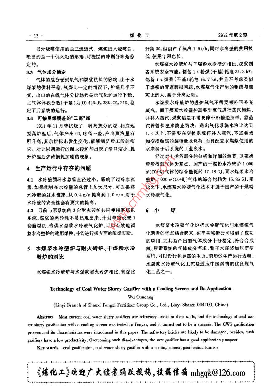 第2期(總第159期)化No.2(Total No 159)2012年4月Coal Chemical IndustApr.2012水煤漿水冷壁氣化工藝及生產(chǎn)運行吳存?zhèn)}(山西陽煤豐喜集團(tuán)臨猗分公司,山西臨猗044100)摘要以水煤漿水冷壁氣化技術(shù)在山西陽煤豐喜集團(tuán)臨猗分公司應(yīng)用為例,主要介紹了水煤漿水冷壁氣化的工藝及設(shè)計特點,總結(jié)了水煤漿水冷壁氣化爐的優(yōu)勢,運用該技術(shù)可解決現(xiàn)有耐火磚爐存在的爐體易損耗、工作效率低等問題,具有良好的應(yīng)用前景。關(guān)鍵詞煤氣化,水煤漿水冷壁,氣化爐文章編號:1005-9598(2012)02-001003類號:TQ534.4文獻(xiàn)標(biāo)識碼:B1項目概況產(chǎn)合成氨。至2012年1月9日,連續(xù)運行了140d刨新了煤氣化試車歷史山西陽煤豐喜集團(tuán)與清華大學(xué)合作研發(fā)的水煤漿水冷壁氣化技術(shù)的成功運行,為開發(fā)利用豐富的2工藝流程及設(shè)計特點“三高”煤資源走出了一條創(chuàng)新之路。該技術(shù)擁有煤種適應(yīng)性廣、投資省維修費用低、自動化程度高、運轉(zhuǎn)2.1水冷壁爐工藝流程周期長、產(chǎn)出氣體成分穩(wěn)定等優(yōu)勢,是具有先進(jìn)水平水煤漿水冷壁氣化工藝以煤漿加壓氣化方式供的煤氣化技術(shù)之料,利用氧氣對煤漿進(jìn)行部分氧化來生產(chǎn)水煤氣,煤陽煤豐喜集團(tuán)臨猗分公司(簡稱豐喜臨猗公司)漿通過隔膜式煤漿泵和燒嘴進(jìn)入氣化爐,采用純氧作氨醇系統(tǒng)氣化工段原有3臺耐火磚爐存在著耐火磚為氣化劑氣化溫度在水冷壁爐膛內(nèi)達(dá)到灰熔融性溫壽命有限、需定期換磚、檢修周期長、煤種適應(yīng)范圍窄度以上采用液態(tài)排渣氣體及熔渣經(jīng)過激冷后,完成等弊端,為此氨醇優(yōu)化項目中采用了水煤漿水冷壁氣全部的氣化過程化技術(shù)。在新增的第4臺氣化爐內(nèi)使用水冷壁技術(shù)在氣化爐的燃燒室內(nèi),以水冷壁代替耐火磚,可設(shè)計單臺爐投煤量600t/d,單臺爐發(fā)氣量10000以提高燃燒室的燃燒溫度,不再擔(dān)心提溫后對耐火磚m/h,設(shè)計壓力40M的高溫侵蝕損毀極大地擴展了煤種適應(yīng)范圍。氣化豐喜臨猗公司水煤漿水冷璧爐工程總投資9000萬爐內(nèi)的水冷壁采用強制循環(huán),使水一直處于過冷狀元,涵蓋水冷壁氣化爐、破渣機、鎖斗、鎖斗沖洗水罐、態(tài),有效地增加了水冷壁向火面熔渣層的凝固厚度,激冷水過濾器、汽包、工藝燒嘴、碳洗塔等設(shè)備以及氣以減少蒸汽的產(chǎn)生量保護(hù)水冷壁管在安全穩(wěn)定的狀化框架的土建、安裝的費用(由于系統(tǒng)原有磨煤和渣態(tài)下運行。汽包中的水通過鍋爐水循環(huán)泵,送入水冷水處理等裝置,不在本次改造范圍)。其中主要設(shè)備包壁主系統(tǒng)(筒體、膜式壁),上盤管系統(tǒng)(爐口)、下盤括:氣化爐主體、水冷壁及汽包、工藝燒嘴和鍋爐水循管系統(tǒng)(渣口)和燒嘴冷卻水系統(tǒng),通過水冷壁系統(tǒng)和環(huán)泵。首臺水冷壁爐于2009年10月在豐喜臨猗公司燒嘴冷卻水系統(tǒng)的鍋爐水進(jìn)入汽包,在汽包中產(chǎn)生部開始土建,2010年6月開始設(shè)備安裝,2011年6月系分蒸汽,產(chǎn)生的蒸汽進(jìn)入全廠蒸汽管網(wǎng),汽包液位補統(tǒng)安裝完成,經(jīng)過了2個月的系統(tǒng)調(diào)試,于2011年8充水經(jīng)本廠的中壓鍋爐工段供水管進(jìn)行補充。水煤漿月22日一次投料成功并且同時送氣供給后系統(tǒng),生水冷壁氣化爐流程示意圖見下頁圖1收稿日期:2012-02-28作者簡介:吳存?zhèn)}(1969—),男,山西臨猗,工程師,大專,1990年畢業(yè)于北京煤炭工業(yè)學(xué)校采煤專業(yè),現(xiàn)從事煤化工生產(chǎn)技術(shù)管理工作,E-mail:baiwei163.com。2012年4月倉:水煤漿水冷壁氣化工藝及生產(chǎn)運行1.3MPa蒸汽外送2.2.2煤漿投料過程汽包補充水水煤漿水冷壁氣化爐使用“火點火"的方式進(jìn)行(汽包D煤漿投料,通過汽包加蒸汽的辦法,在鍋爐水提前循鍋爐水循環(huán)泵環(huán)運行到200℃后,開始點火烘爐,烘爐溫度升到800℃即可,主要靠烘爐的燃料氣與純氧燃燒的火焰點燃入爐煤漿,利用反應(yīng)生成熱來完成自身的熱反應(yīng)煤氣去碳洗塔平衡,在投料成功后,觀火孔的攝像探頭及光敏探頭黑水去高壓閃蒸均有顯示,通過程控閥切換,退出烘爐的燃料氣及烘爐氧氣,使中心氧氣管線由烘爐燃料氣切換成氧氣爐頭的燃料氣與氧氣切換流程示意圖見圖2。隔式煤娛漿烘爐燃料調(diào)節(jié)閥2妖爐料8多a口電子打火裝置圖1水煤漿水冷壁氣化爐流程示意圖高溫煤氣經(jīng)過激冷水激冷后,進(jìn)入氣化爐下半部切換閥換閥分激冷室,產(chǎn)生的黑水經(jīng)過渣水處理系統(tǒng)處理后,循主氧氣調(diào)節(jié)閥煤漿環(huán)利用。粗渣經(jīng)過破渣機與鎖斗,間歇式排出系統(tǒng)主氧氣22點火及投料燒嘴2.2.1烘爐點火過程調(diào)節(jié)閥烘爐的燃料氣管線與燒嘴的中心氧氣管線公用烘爐氧氣點火氧氣送入正式氧氣管線。待投料正常后程控實氣化爐現(xiàn)切換。最終的點火烘爐與投料在1個燒嘴上一體烘爐氧氣調(diào)節(jié)閥2化完成,不需要更換燒嘴,也不需要提前標(biāo)定氧氣和燃料氣的流量,可以根據(jù)計算值,在進(jìn)燒嘴前通過放圖2燃料氣與氧氣切換流程示意圖空和調(diào)節(jié)閥把燃料氣與點火氧氣的流量調(diào)整至合理的數(shù)值