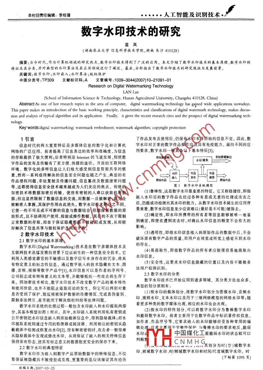 本欄目責任編輯:李桂瑾.......人工智能及識別技術(shù)●數(shù)字水印技術(shù)的研究藍嵐(湖南農(nóng)業(yè)大學信息科學技術(shù)學院,湖南長沙410128)摘要:當今時代,作為計算機領(lǐng)域的研究熱點,數(shù)字水印技術(shù)得到了廣泛的應用。本文介紹了數(shù)字水印技術(shù)的基本原理、數(shù)字水印的特征及其分類,并對典型的水印算法及其應用領(lǐng)域進行了闡述。最后,分析指出了數(shù)字水印技術(shù)的研究現(xiàn)狀與發(fā)展前景。關(guān)鍵詞:數(shù)字水印;水印嵌入;水印算法;版衩保護中圖分類號:TP309文獻標識碼:A文章編號:1009- -3044(2007)10- -21091-01Research on Digital Watermarking TechnologyLAN Lan(School of Information Science & Technology, Hunan Agricultural University, Changsha 410128, China)Abstract:As one of hot research topics in the area of computer, digital watermarking technology has gained wide applications nowadays.This paper makes an introduction of the basic working principle, characteristics and casifications of digtal watermark technology, makes discus-sion and analysis of typical algorithm and is application. Finally, it gives the recent research circs and the prospect of digital watermarking tech-nology.Key'words.digtal watermarking; watermark embedment; watermark algoithm; copyright protection.1引言了作品發(fā)布及使用后,仍保有水印本身原始的信息不變。因此,數(shù)信息時代的兩大重要特征是多媒體信息的數(shù)字化和計算機字水印對正常的數(shù)字作品操作應該具有免疫能力。面向不同的應網(wǎng)絡的廣泛應用。前者提高了信息表達的效率和準確度,為信息用要求,數(shù)字水印一般具備以下基本特征[3]:的存取提供了極大便利;后者特別是Intermet的飛速發(fā)展,則使數(shù)附加數(shù)據(jù)輸入水印提取字作品的發(fā)布及傳輸有了更方便、快捷的途徑。開放的互聯(lián)網(wǎng)絡環(huán)境、數(shù)字化的多樣信息讓人們極大感受到信息資源共享的愜意,然而一系列亟待解決的信息安全問題也隨之產(chǎn)生,典型的有水印.作晶L作品侵權(quán)問題、非法復制及傳播問題、信息篡改及數(shù)據(jù)泄密問題原始作晶嵌入原始作品等,這都使得信息安全技術(shù)越來越成為人們關(guān)注的焦點。傳統(tǒng)的圈1數(shù)字水印系 統(tǒng)模型加密技術(shù)將數(shù)據(jù)加密后傳輸,使沒有密鑰的人難以獲取機密數(shù)(1)魯棒性,這是數(shù)字水印最重要的特征。它又稱穩(wěn)健性,即指據(jù);但這顯然限制了數(shù)據(jù)信息的交流,而數(shù)據(jù)一旦被解密,就完全嵌入水印后的數(shù)字作品在經(jīng)過各種有意或無意的處理或攻擊之被解密人掌握,其保護作用由此消失。數(shù)字水印技術(shù)則與之不同,后,仍能成功檢測出其水印的能力。從數(shù)字水印技術(shù)誕生的應用背它使一些不可見或不可察的信息與數(shù)據(jù)結(jié)合,但能保留數(shù)據(jù)的原最來看,數(shù)字水印信息至少應該難以(最好是不可能)被除去。始形式,且不妨礙用戶使用、檢驗或操作數(shù)據(jù)。其目的不在于限制(2)確定性,即水印所攜帶的所有者等信息能夠被唯- -地鑒正常數(shù)據(jù)的存取,而在于保證隱藏數(shù)據(jù)不被侵犯或發(fā)現(xiàn),從而較別確定,即使在遭到攻擊時,對確認水印信息的精度不會有大的好解決了信息共享與版權(quán)保護之間的矛盾。影響。2數(shù)字水印技術(shù)(3)透明性,即指水印信息植入到原始作品的數(shù)據(jù)中后,不會破壞原有數(shù)字產(chǎn)品的質(zhì)量,而用戶在視覺或聽覺上感覺不到水印2.1數(shù)字水印的基本原理數(shù)字水印(Digital Watermarking)技術(shù)是在數(shù)字多媒體技術(shù)及的存在?;ヂ?lián)網(wǎng)技術(shù)迅猛發(fā)展的背景下應運而生的一種信息安全技術(shù)。它.水印信息。(4)易提取性.即指數(shù)字作品的所有者應能很容易地提取出利用人類感覺器官的不敏感以及數(shù)字信號本身存在的冗余,將具.(5)安全性,這要求水印信息隱藏的位置以及內(nèi)容不能被非有特定意義的標志性信息,通過數(shù)字嵌入的技術(shù)隱藏在文本、圖法用戶檢測識別。像、音頻、視頻等數(shù)字產(chǎn)品中[I],水印信息可以是作者的序列號、公司標志或有特殊意義的文本等,并能夠抵抗一些攻擊而生存下2.3數(shù)字水印的分類數(shù)字水印技術(shù)已開始應用到諸多領(lǐng)域,其分類方法也眾多,來。同加密技術(shù)相比,數(shù)字水印技術(shù)不改變數(shù)字產(chǎn)品的基本特性典型的劃分原則有:和使用價值,也并不能阻止盜版活動的發(fā)生。但它可以判別對象(1)按水印的載體劃分將數(shù)字水印劃分為圖像水印、音頻水是否受到了保護,能監(jiān)視被保護數(shù)據(jù)的傳播情況完成真?zhèn)舞b別、印、視頻水印、文本水印以及用于三維網(wǎng)格模型的網(wǎng)格水印等;隨限制非法拷貝、甚至能用于解決版權(quán)糾紛等法律問題。數(shù)字水印系統(tǒng)的處理過程一般包含水印嵌人和水印提取兩部著更多種類的數(shù)字媒體出現(xiàn),相應的水印也會出現(xiàn)。分,其基本模型如圖I所示。其中,水印嵌入系統(tǒng)利用私有密鑰或(2)按水印的特性劃分,可以將數(shù)字水印分為魯棒數(shù)字水印公開密鑰把水印信息嵌人到原始載體信息中,得到隱秘載體;而水和脆弱數(shù)字水印。前者主要用于在數(sh