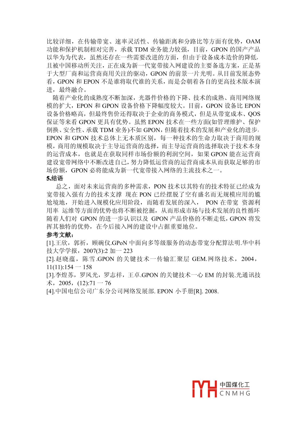 談GPON技術(shù)及應(yīng)用朱寧兵廣東省通信產(chǎn)業(yè)服務(wù)有限公司通信建設(shè)分公司摘要:從市場的需求現(xiàn)狀和發(fā)展趨勢來看,新興寬帶業(yè)務(wù)的不斷出現(xiàn),國內(nèi)外運(yùn)營商也在不斷探索新通信環(huán)境下的接入技術(shù)應(yīng)用和網(wǎng)絡(luò)轉(zhuǎn)型。GPON技術(shù)從傳統(tǒng)的以太網(wǎng)技術(shù)演進(jìn)而來,技術(shù)簡單且成熟、成本較低,芯片和產(chǎn)品均已經(jīng)成熟,并且在國內(nèi)外市場上得到了一定規(guī)模的應(yīng)用。關(guān)鍵詞:GPON技術(shù);特點;組網(wǎng)方式;寬帶分配;中圖分類號:D91101文獻(xiàn)標(biāo)識碼:A文章編號引言:目前,光進(jìn)銅退在全球范圍內(nèi)己經(jīng)成為接入網(wǎng)建設(shè)的趨勢?;跓o源光網(wǎng)路PON方式的EPON和GPON技術(shù)是目前光纖接入網(wǎng)的兩種主流技術(shù)。GPON相對于EPON而言,具有高寬帶、高傳輸效率、大覆蓋范圍、用戶接口豐富、提供電信級的保護(hù)等優(yōu)越性能。1GPON技術(shù)特點GPON主要由光網(wǎng)絡(luò)單元、光線路終端和光配線網(wǎng)/光配線終端等單元組成。GPON技術(shù)特征主要體現(xiàn)在傳輸匯聚層。其中傳輸匯聚又分為PON成幀子層和適配子層。GTe的成幀子層完成GTC幀的封裝,終結(jié)所要求的ODN的傳輸功能。PON的特定功能(如測距、帶寬分配等)也在PON的成幀子層終結(jié),在適配子層看不到。GTC的適配子層提供PDU與高層實體的接口。ATM和GFP信息在各自的適配子層完成SDU與PDu的轉(zhuǎn)換。OMCI適配子層高于AM和GFP適配子層,它識別 vpl/VCI和Port一ID,并完成OMCI通道數(shù)據(jù)與高層實體的交換2.GPON的組網(wǎng)方式21FTB+LAN為光纖到樓,然后通過大容量ONU(稱為MDU用五類線作為入戶線將業(yè)務(wù)接入多個用戶,多個用戶共享一個ONU、一根光纖的帶寬資源,成本自然就低,該方式下共享的帶寬與現(xiàn)階段用戶帶寬的需求相匹配,且能滿足未來一段時間的帶寬需求,運(yùn)營商在有盈利空間前提下提供的價格也能很容易被用戶接受,是目前正在大規(guī)模商用的新一代寬帶接入的主要方式22 FRITB+DSL為光纖到樓,然后以ⅩDSL的方式將業(yè)務(wù)接入多個用戶,也是多用戶共享一個ONU,成本主要體現(xiàn)在用戶雙絞線和用戶終端上,在120米范圍之內(nèi)每個用戶的入戶線十終端投資成本將高于FFTB+LAN,且在上下行速率是的非對稱的,不符合未來發(fā)展趨勢。23NTN+DSL為光纖到小區(qū),接入特點基本與FTRB+DSL相類似,是一種在光纜價格昂貴的時候節(jié)省光纜的接入方式,隨著光纜價格的不斷降低和銅價、的不斷上升,目前該方式已不作為主用組網(wǎng)方式被采用24FJTH為光纖到戶,ONU設(shè)置于用戶室內(nèi),用戶獨享ONU,一個ONU僅供個用戶使用,以現(xiàn)有的絕大多數(shù)用戶需求帶寬來看,這樣的方式極大的浪費了接入網(wǎng)光纖帶寬,而且由于資源獨享帶來的高成本很難被用戶所接受,因此,該種方式在一段時間內(nèi)很難被規(guī)模應(yīng)用,僅會被極少數(shù)的田戶所接感隨絡(luò)流量的日新月異,該種接入方式使用效果還受限于城中國煤化了看網(wǎng)絡(luò)CNMHG使用高峰時期的富余情況,很容易引起服務(wù)質(zhì)量的投訴,所以在實際商業(yè)推廣中并不關(guān)注。3.GPoN動態(tài)帶寬分配(OBA)動態(tài)帶寬分配(DBA)技術(shù)是指通過GPON系統(tǒng)中各個ONU的上行使用帶寬實時動態(tài)的改變來適應(yīng)用戶速率的各種變化,以提高系統(tǒng)的帶寬利用率的技術(shù)PON系統(tǒng)的上行接入一般采用中央控制按需分配和固定分配相結(jié)合的方式,也就是 ITU.TG983.4規(guī)定的靜態(tài)帶寬分配和動態(tài)帶寬分配兩種方式,按照業(yè)務(wù)等級進(jìn)行優(yōu)先級分配。對于GPON中的數(shù)據(jù)通信這種變速率業(yè)務(wù),用靜態(tài)帶寬分配是不合適的,需要通過動態(tài)帶寬分配使系統(tǒng)帶寬利用率大幅度提高,即DBA技術(shù)根據(jù)ONU的突發(fā)業(yè)務(wù)的要求,通過在ONU之間動態(tài)調(diào)節(jié)帶寬來提高上行帶寬利用效率。根據(jù)GPON的特點和G983建議,可以知道動態(tài)帶寬分配的具體要求是:業(yè)務(wù)要透明、帶寬利用率盡量高、具備低抖動與時延特性、公平分配帶寬、信號健壯、實時性強(qiáng)、保證不同業(yè)務(wù)的QOS等。31帶寬類型GPON標(biāo)準(zhǔn)沿用了BPoN中對QoS支持的規(guī)定JITU一在BPoN標(biāo)準(zhǔn)Q.983.4和GPON標(biāo)準(zhǔn)G984.3中明確提出了四種優(yōu)先級別的帶寬[2].它們分別是F議ed、Assod、Non- assured和 Best-effort四種類型的帶寬,也就是固定類型、確保類型、非確保類型和盡力而為類型的帶寬。同時,GPON上行系統(tǒng)中帶寬分配基本單元的傳輸容器( T-CONT則按照其使用的帶寬類型組合一共分為五種類型?;跇I(yè)務(wù)等級的優(yōu)先級分配方案能夠在實現(xiàn)高效的DBA的同時為業(yè)務(wù)提供良好的Qos保障,所以,清晰地認(rèn)識到各種帶寬資源的特性以及理解 T-CONT的適用范圍對DBA有著重要意義。32傳輸容器 T-CONT前面指出了GPoN有四種類型的帶寬,每種類型的帶寬都可以支持一定的QoS要求的業(yè)務(wù);而 T-CONT通過為業(yè)務(wù)提供特定類型的帶寬間接保證該業(yè)務(wù)的QoS要求。一種 T-CONT能否支持某種QoS要求的業(yè)務(wù),完全取決于該T-coNT能否提供滿足該業(y
