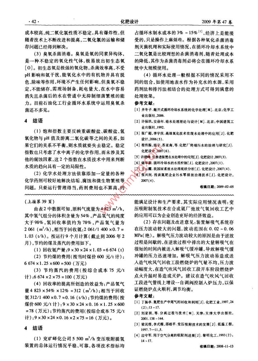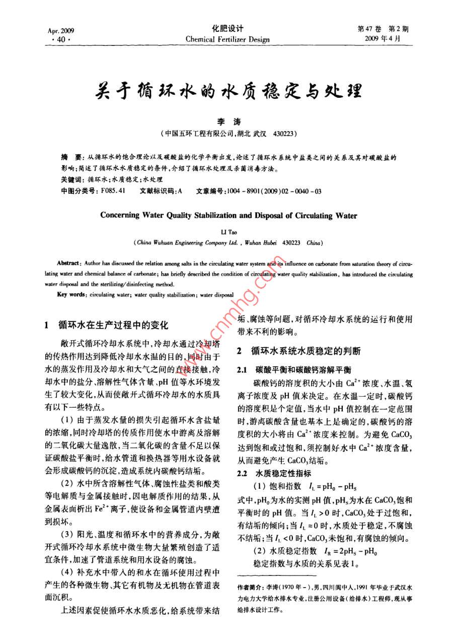 Apr.2009化肥設(shè)計(jì)第47卷第2期Chemical Fertilizer Des2009年4月關(guān)亍循環(huán)水的水質(zhì)穩(wěn)定與處理李濤(中國(guó)五環(huán)L程有限公司湖北武漢430223)摘要:從循環(huán)水的飽合理論以及碳酸鹽的化學(xué)平衡出發(fā),論逑了循環(huán)水系統(tǒng)中鹽類之間的關(guān)系及其對(duì)碳酸鹽的影響;簡(jiǎn)迷了循環(huán)水水質(zhì)穩(wěn)定的條件,介紹了循環(huán)水處理及殺菌消毒方法。關(guān)鍵詞:循環(huán)水;水質(zhì)穩(wěn)定;水處理中圖分類號(hào):F085.41文獻(xiàn)標(biāo)識(shí)碼:A文章編號(hào):1004-8901(2009)02-0040-03Concerning Water Quality Stabilization and Disposal of Circulating WaterChina Wuhuan Engineering Company Lid, Wuhan Hubei 430223 China)Abstract: Author has discussed the relation among salts in the circulating water system and its influence on carbonate from saturation theory of circu-Lating water and chemical balance of carbonate; has briefly described the condition of circulating water quality stabilization, has introduced the cireulatingwater disposal and the sterilizing/disinfecting methodKey words: circulating water; water quality stabilization; water disposal1循環(huán)水在生產(chǎn)過程中的變化垢腐蝕等問題,對(duì)循環(huán)冷卻水系統(tǒng)的運(yùn)行和使用帶來不利的影響。敞開式循環(huán)冷卻水系統(tǒng)中,冷卻水通過冷卻塔的傳熱作用達(dá)到降低冷卻水水溫的目的,同時(shí)由于2循環(huán)水系統(tǒng)水質(zhì)穩(wěn)定的判斷水的蒸發(fā)作用及冷卻水和大氣之間的直接接觸冷2,1碳酸平衡和碳酸鈣溶解平衡卻水中的鹽分、溶解性氣體含量、pH值等水環(huán)境發(fā)碳酸鈣的溶度積的大小由Ca2濃度、水溫、氫生了較大變化從而使敞開式循環(huán)冷卻水的水質(zhì)具離子濃度及pH值來決定。在水溫一定時(shí),碳酸鈣有以下一些特點(diǎn)。的溶度積是個(gè)定值,當(dāng)水中pH值控制在一定范圍(1)由于蒸發(fā)水量的損失引起循環(huán)水含鹽量時(shí)游離碳酸含量也基本上是確定的,碳酸鈣的溶的濃縮,同時(shí)冷卻塔的傳質(zhì)作用使水中游離及溶解度積的大小將由Ca2濃度來控制。為避免CaCO3的二氧化碳大量逸散,當(dāng)二氧化碳的含量不足以保達(dá)到飽和或過飽和,須控制好水中Ca2濃度含量,證碳酸鹽平衡時(shí)給水管道和換熱器等用水設(shè)備就從而避免產(chǎn)生CaCO2結(jié)垢。會(huì)形成碳酸鈣的沉淀,造成系統(tǒng)內(nèi)碳酸鈣結(jié)垢。22水質(zhì)穩(wěn)定性指標(biāo)(2)水中所含溶解性氣體腐蝕性鹽類和酸類(1)飽和指數(shù)l=pH-pHs等電解質(zhì)與金屬接觸時(shí),因電解質(zhì)作用的結(jié)果,從式中,pH為水的實(shí)測(cè)pH值,pH為水在caCO,飽和金屬表面析出Fe離子,使設(shè)備和金屬管道內(nèi)壁遭平衡時(shí)的pH值。當(dāng)l1>0時(shí),CaCO,處于過飽和,到損壞有結(jié)垢的傾向;當(dāng)l1=0時(shí),水質(zhì)處于穩(wěn)定,不腐蝕(3)陽光溫度和循環(huán)水中的營(yíng)養(yǎng)成分,為散不結(jié)垢;當(dāng)1<0時(shí),CaCo2未飽和有腐蝕的傾向。開式循環(huán)冷卻水系統(tǒng)中微生物大量繁殖創(chuàng)造了適(2)水質(zhì)穩(wěn)定指數(shù)IB=2pHs-pH宜條件,加速了管道系統(tǒng)和用水設(shè)備的腐蝕。穩(wěn)定指數(shù)與水質(zhì)的關(guān)系見表1。(4)補(bǔ)充水中帶入的和水在循環(huán)使用過程中產(chǎn)生的各種微生物其它有機(jī)物及無機(jī)物在管道表作者簡(jiǎn)介:李濤(1970年-),男四川闐中人,19年畢業(yè)于武漢水面沉積。力電力大學(xué)給水排水專業(yè),注冊(cè)公用設(shè)備(給排水)工程師現(xiàn)從事上述因素促使循環(huán)水水質(zhì)惡化,給系統(tǒng)帶來結(jié)給排水設(shè)計(jì)工作第2期李濤關(guān)于循環(huán)水的水質(zhì)穩(wěn)定與處理表1穩(wěn)定指數(shù)與水質(zhì)的關(guān)系水、環(huán)境保護(hù)、換熱設(shè)備構(gòu)造和運(yùn)行的嚴(yán)格要求,此穩(wěn)定指數(shù)I水質(zhì)傾向法已不再使用了。4.0-5.0嚴(yán)重結(jié)垢3.13排污輕微結(jié)垢循環(huán)水系統(tǒng)的濃縮倍數(shù)越高,則補(bǔ)充水水量、水質(zhì)基本穩(wěn)定排污水量也就越小,對(duì)企業(yè)生產(chǎn)用水量的需求和環(huán)7.0-7.5輕微腐蝕境的污染也就越少。綜合節(jié)水、環(huán)保及內(nèi)循環(huán)水7.0-9.0嚴(yán)承腐蝕系統(tǒng)阻垢緩蝕處理技術(shù)水平等因素,一般設(shè)計(jì)中將9.0以上極嚴(yán)重腐蝕循環(huán)水系統(tǒng)的濃縮倍數(shù)控制在3~5。實(shí)際生產(chǎn)中23循環(huán)冷卻水的鹽類平衡通過調(diào)整循環(huán)水系統(tǒng)的排污水量來挖制系統(tǒng)的濃縮倍數(shù),以使循環(huán)水的碳酸鹽硬度小于極限碳酸鹽失,循環(huán)冷卻水系統(tǒng)中含鹽量將不斷增加相應(yīng)水硬度,防止碳酸鈣垢的形成。實(shí)際生產(chǎn)中在補(bǔ)充水中碳酸鹽硬度會(huì)逐漸增大,當(dāng)碳酸鹽達(dá)到飽和狀態(tài)量充足且暫時(shí)硬度較低的水質(zhì)條件下僅靠排污法時(shí),水中溶解狀念的碳酸鹽硬度將達(dá)到最大值,并也不能解決循環(huán)冷卻水的水質(zhì)穩(wěn)定間題,還需采用穩(wěn)定在此數(shù)值,即碳酸鹽硬度的最大數(shù)值為常數(shù)。排污法和藥劑法相結(jié)合的措施才能比較好的解決實(shí)際生產(chǎn)中循環(huán)水水質(zhì)結(jié)垢或腐蝕問題3循環(huán)水