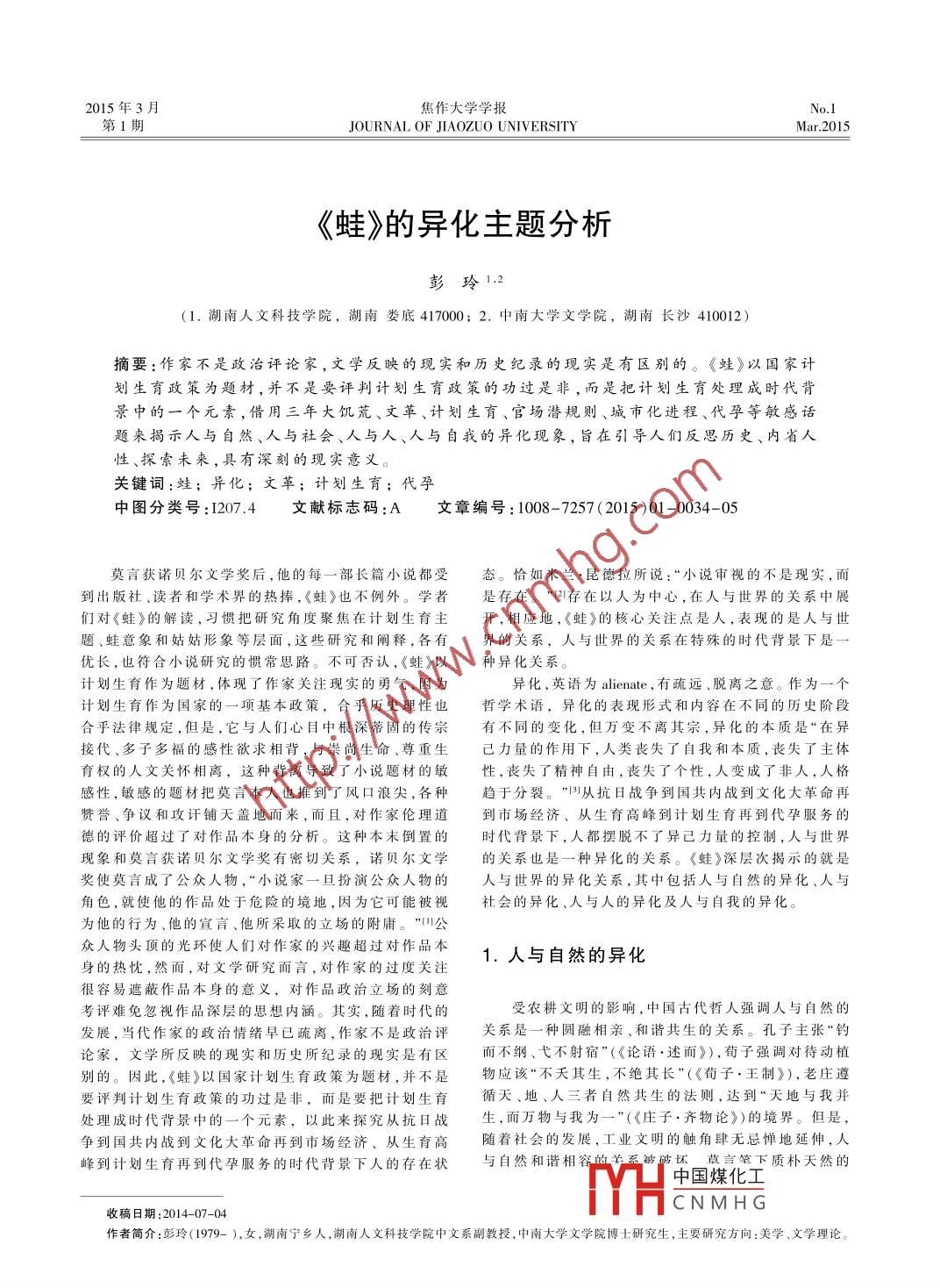 2015年3月焦作大學(xué)學(xué)報(bào)第1期JOURNAL OF JIAOZUO UNIVERSITYMar.2015《蛙》的異化主題分析彭玲1.2(1.湖南人文科技學(xué)院,湖南婁底417000; 2.中南大學(xué)文學(xué)院,湖南長(zhǎng)沙410012 )摘要:作家不是政治評(píng)論家,文學(xué)反映的現(xiàn)實(shí)和歷史紀(jì)錄的現(xiàn)實(shí)是有區(qū)別的。《蛙》以國(guó)家計(jì)劃生育政策為題材,并不是要評(píng)判計(jì)劃生育政策的功過(guò)是非,而是把計(jì)劃生育處理成時(shí)代背景中的一個(gè)元素,借用三年大饑荒、文革、計(jì)劃生育、官場(chǎng)潛規(guī)則、城市化進(jìn)程、代孕等敏感話題來(lái)揭示人與自然、人與社會(huì)、人與人、人與自我的異化現(xiàn)象,旨在引導(dǎo)人們反思?xì)v史、內(nèi)省人性、探索未來(lái),具有深刻的現(xiàn)實(shí)意義。關(guān)鍵詞:蛙;異化;文革;計(jì)劃生育;代孕中圖分類號(hào):1207.4文 獻(xiàn)標(biāo)志碼:A文章編號(hào): 1008-7257( 2015)01 -0034-05莫言獲諾貝爾文學(xué)獎(jiǎng)后,他的每一部長(zhǎng)篇小說(shuō)都受態(tài)。恰如米蘭●昆德拉所說(shuō):“小說(shuō)審視的不是現(xiàn)實(shí),而到出版社、讀者和學(xué)術(shù)界的熱捧,《蛙》也不例外。學(xué)者.是存在?!?2存在以人為中心,在人與世界的關(guān)系中展們對(duì)《蛙》的解讀,習(xí)慣把研究角度聚焦在計(jì)劃生育主.開(kāi),相應(yīng)地,《蛙》的核心關(guān)注點(diǎn)是人,表現(xiàn)的是人與世題、蛙意象和姑姑形象等層面,這些研究和闡釋,各有界的關(guān)系,人與世界的關(guān)系在特殊的時(shí)代背景下是一優(yōu)長(zhǎng),也符合小說(shuō)研究的慣常思路。不可否認(rèn),《蛙》以種異化關(guān)系。計(jì)劃生育作為題材,體現(xiàn)了作家關(guān)注現(xiàn)實(shí)的勇氣,因?yàn)楫惢?英語(yǔ)為alienate,有疏遠(yuǎn)、脫離之意。作為一個(gè)計(jì)劃生育作為國(guó)家的-項(xiàng)基本政策,合乎歷史理性也哲學(xué)術(shù)語(yǔ),異化的表現(xiàn)形式和內(nèi)容在不同的歷史階段合乎法律規(guī)定,但是,它與人們心目中根深蒂固的傳宗有不同的變化,但萬(wàn)變不離其宗,異化的本質(zhì)是“在異接代、多子多福的感性欲求相背,與崇尚生命、尊重生已力量的作用下,人類喪失了自我和本質(zhì),喪失了主體育權(quán)的人文關(guān)懷相離,這種背離導(dǎo)致了小說(shuō)題材的敏性,喪失了精神自由,喪失了個(gè)性,人變成了非人,人格感性,敏感的題材把莫言本人也推到了風(fēng)口浪尖,各種.趨于分裂?!盉)從抗日戰(zhàn)爭(zhēng)到國(guó)共內(nèi)戰(zhàn)到文化大革命再贊譽(yù)、爭(zhēng)議和攻訐鋪天蓋地而來(lái),而且,對(duì)作家倫理道到市場(chǎng)經(jīng)濟(jì)、從生育高峰到計(jì)劃生育再到代孕服務(wù)的德的評(píng)價(jià)超過(guò)了對(duì)作品本身的分析。這種本末倒置的時(shí)代背景下,人都擺脫不了異已力量的控制,人與世界.現(xiàn)象和莫言獲諾貝爾文學(xué)獎(jiǎng)有密切關(guān)系,諾貝爾文學(xué)的關(guān)系也是一種異化的關(guān)系?!锻堋飞顚哟谓沂镜木褪?獎(jiǎng)使莫言成了公眾人物,“小說(shuō)家一旦扮演公眾人物的人與世界的異化關(guān)系,其中包括人與自然的異化、人與.角色,就使他的作品處于危險(xiǎn)的境地,因?yàn)樗赡鼙灰暽鐣?huì)的異化、人與人的異化及人與自我的異化。為他的行為、他的宣言、他所采取的立場(chǎng)的附庸?!苯泄娙宋镱^頂?shù)墓猸h(huán)使人們對(duì)作家的興趣超過(guò)對(duì)作品本1.人與自然的異化身的熱忱,然而,對(duì)文學(xué)研究而言,對(duì)作家的過(guò)度關(guān)注很容易遮蔽作品本身的意義,對(duì)作品政治立場(chǎng)的刻意考評(píng)難免忽視作品深層的思想內(nèi)涵。其實(shí),隨著時(shí)代的受農(nóng)耕文明的影響,中國(guó)古代哲人強(qiáng)調(diào)人與自然的發(fā)展,當(dāng)代作家的政治情緒早已疏離,作家不是政治評(píng)關(guān)系是一種圓融相親、 和諧共生的關(guān)系。孔子主張“釣論家,文學(xué)所反映的現(xiàn)實(shí)和歷史所紀(jì)錄的現(xiàn)實(shí)是有區(qū)而不綱、弋不射宿"(《論語(yǔ)●述而》),荀子強(qiáng)調(diào)對(duì)待動(dòng)植別的。因此,《蛙》以國(guó)家計(jì)劃生育政策為題材,并不是物應(yīng)該“不天其生,不絕其長(zhǎng)"(《荀子.王制》),老莊遵要評(píng)判計(jì)劃生育政策的功過(guò)是非,而是要把計(jì)劃生育.循天、地、人三者自然共生的法則,達(dá)到“天地與我并處理成時(shí)代背景中的一個(gè)元素,以此來(lái)探究從抗日戰(zhàn).生,而萬(wàn)物與我為一”(《莊子.齊物論》)的境界。但是,爭(zhēng)到國(guó)共內(nèi)戰(zhàn)到文化大革命再到市場(chǎng)經(jīng)濟(jì)、從生育高隨著社會(huì)的發(fā)展,工業(yè)文明的觸角肆無(wú)忌憚地延伸,人峰到計(jì)劃生育再到代孕服務(wù)的時(shí)代背景下人的存在狀.與自然和諧相容的關(guān)系被破壞直言筆下質(zhì)樸天然的中國(guó)煤化工YHCNMHG收稿日期:2014-07-04作者簡(jiǎn)介:彭玲(1979- ),女,湖南寧鄉(xiāng)人,湖南人文科技學(xué)院中文系副教授,中南大學(xué)文學(xué)院博士研究生,主要研究方向:美學(xué)、文學(xué)理論。第1期彭玲:《蛙》的異化主題分析35山東高密東北鄉(xiāng)也無(wú)法幸免。鄉(x