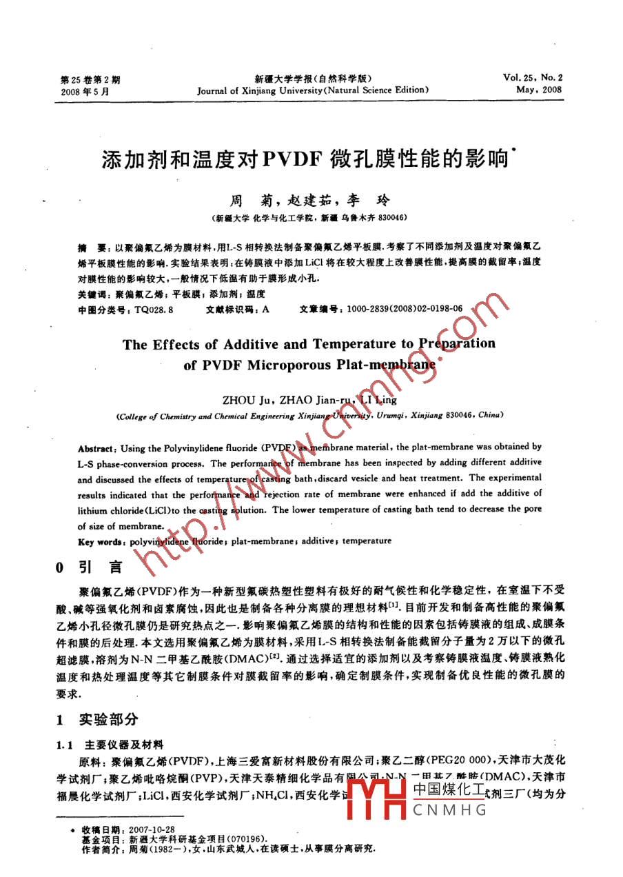 第25卷第2期新疆大學(xué)學(xué)報(bào)(自然科學(xué)版)Vol. 25, No.22008年5月.ournal ofXinjiang University(Natural Science Edition)May. 2008添加劑和溫度對(duì)PVDF微孔膜性能的影響'周菊,趙建茹,李玲(新疆大學(xué)化學(xué)與化工學(xué)院,新疆烏魯木齊830046)摘要: 以聚偏氟乙烯為膜材料,用L-S相轉(zhuǎn)換法制備聚偏氟乙烯平板膜.考察了不同添加劑及溫度對(duì)聚偏氟乙烯平板膜性能的影響.實(shí)驗(yàn)結(jié)果表明:在鑄膜液中添加LiCl將在較大程度上改善膜性能,提高膜的截留率;溫度對(duì)膜性能的影響較大,一般情況下低溫有助于膜形成小孔關(guān)鍵詞:聚偏氟乙烯;平板膜;添加劑;溫度中圖分類號(hào): TQ028.8文獻(xiàn)標(biāo)識(shí)碼: A文章編號(hào): 1000-2839(2008)02-0198-06The Effects of Additive and Temperature to Preparationof PVDF Microporous Plat-membraneZHOU Ju, ZHAO Jian-ru, LI Ling .(Collge of Chermitry and Chemical Enginering Xinjiang Unersity, Urumqi, Xinjiang 830046. China)Abstract; Using the Polyvinyidene fluoride (PVDF ) as membrane material, the plat membrane was obtained byL-S phase-conversion proces. The performance of membrane has been inpected by adding diferet additiveand discussed the effects of temperature of casting bath ,discard vesicle and heat treatment. The experimentalresults indicated that the performance and rejection rate of membrane were enhanced if add the additive oflithium chloride(LiCl)to the casting solution. The lower temperature of casting bath tend to decrease the poreof size of membrane.Key words; polyvinylidene fluoride; plat-membrane ; additive; temperature0引言聚偏氟乙烯(PVDF)作為一種新型氟碳熱塑性塑料有極好的耐氣候性和化學(xué)穩(wěn)定性,在室溫下不受酸、堿等強(qiáng)氧化劑和鹵素腐蝕,因此也是制備各種分離膜的理想材料[0].目前開發(fā)和制備高性能的聚偏氟乙烯小孔徑微孔膜仍是研究熱點(diǎn)之-.影響聚偏氟乙烯膜的結(jié)構(gòu)和性能的因素包括鑄膜液的組成、成膜條件和膜的后處理.本文選用聚偏氟乙烯為膜材料,采用L-S相轉(zhuǎn)換法制備能截留分子量為2萬(wàn)以下的微孔超濾膜,溶劑為N-N二甲基乙酰胺(DMAC)[.通過(guò)選擇適宜的添加劑以及考察鑄膜液溫度、鑄膜液熟化溫度和熱處理溫度等其它制膜條件對(duì)膜截留率的影響,確定制膜條件,實(shí)現(xiàn)制備優(yōu)良性能的微孔膜的要求.1實(shí)驗(yàn)部分1.1 主要儀器及材料原料:聚偏氟乙烯(PVDF),上海三愛(ài)富新材料股份有限公司;聚乙二醇(PEG20000),天津市大茂化學(xué)試劑廠;聚乙烯吡咯烷酮(PVP),天津天泰精細(xì)化學(xué)品有限公司.N-N一用其7酶膿(DMAC),天津市福晨化學(xué)試劑廠;LiCl,西安化學(xué)試劑廠;NH,Cl,西安化學(xué)中國(guó)煤化工劑三廠(均為分CNMHG●收稿日期: 2007-10-28社會(huì)項(xiàng)目:新疆大學(xué)科研基金平泉00106)讀碩土,從事膜分離研究作者簡(jiǎn)介:周菊(1982- ),女.山東武城人,第2期周菊,等:黍加劑和溫度對(duì)PVDF微孔膜性能的影響199析純).儀器:恒溫水浴槽;潔凈玻璃板;分光光度計(jì);膜性能測(cè)試裝暨;DF-1集熱式磁力攪拌器,江蘇省金壇市醫(yī)療器械廠;XTL-1型攝影體式顯微鏡,南京江南光電(集團(tuán))股份有限公司;LRH-250-G光照培養(yǎng)箱,廣東省醫(yī)療器械廠.1.2 膜的制備由于聚合物性質(zhì)、膜的結(jié)構(gòu)和形狀不同,其制備方法很多,我們常用相轉(zhuǎn)化濕法制膜,即浸沉凝膠法也稱為L(zhǎng)-S相轉(zhuǎn)化法,其基本原理是將溶于一定介質(zhì)中的聚合物溶液流涎成膜后,直接或部分蒸發(fā),再放入非溶劑中,在- -定 的溫度、濕度等環(huán)境條件的影響下,非溶劑分子與溶劑分子發(fā)生交換,隨著薄層中溶劑逐步揮發(fā),膜液組成發(fā)生變化,高分子隨其溶解性逐漸降低而開始締合.由締合生成的凝聚滴與原基質(zhì)液產(chǎn)生相分離.隨著溶劑進(jìn)--步的揮發(fā),凝聚滴變大、相互靠攏形成凝膠,當(dāng)凝膠中殘留的溶劑揮發(fā)后就留下細(xì)孔.本實(shí)驗(yàn)具體做法是,將一定量的聚偏氟乙烯和添加劑溶于一定量的N-N二甲基乙酰胺中配制成鑄膜液,靜止脫泡,然后在平整的玻璃板上流延刮膜,以水為凝固劑制得聚偏氟乙烯平板膜,將膜進(jìn)行熱處理,自然條件下風(fēng)干,然后在0.2MPa壓力下進(jìn)行預(yù)壓處理半小時(shí).由于膜此時(shí)疏水性較強(qiáng),將其放入異丙醇中浸泡一段時(shí)間,用于形態(tài)結(jié)構(gòu)和膜性能的測(cè)試.1.3 膜性能的測(cè)試1.3.1 水通量測(cè)試以蒸餾水為料液,將浸泡好的膜置于膜裝置中測(cè)得膜的水通量為J(L/m'h),其中:產(chǎn)水量J =有效膜面積文時(shí)間1.3.2聚乙二醇的測(cè)定配制聚乙二醇(PEG20000)濃度分別為10~ 50(mg/L)標(biāo)準(zhǔn)溶液,各取1.00 mL,加人高氯酸溶液(0.5mol/L)5.0mL,混勻,室溫放置15min,離心分離10min,取4mL.上清液加入1.0mLBaCl2溶液和0.5mL碘溶液混勻,室溫反應(yīng)15min,在535nm波長(zhǎng)處測(cè)定吸光值;繪制標(biāo)準(zhǔn)曲線.在相同條件下測(cè)定待測(cè)樣的吸光值,由標(biāo)準(zhǔn)曲線得樣品中聚乙二醇含量G(mg/L).1.3.3截留率測(cè)試按聚乙二醇測(cè)定法,以0. 1%(質(zhì)量百分比)聚乙二醇PEG(分子量為20 000)溶液為料液.膜經(jīng)過(guò)預(yù)壓處理后在0.2MPa操作壓力下測(cè)試PEG20000的通量,將餾出液和原液分別在分光光度計(jì)上測(cè)定吸光度,.由標(biāo)準(zhǔn)曲線得到聚乙二醇的含量,計(jì)算出原液和餾出