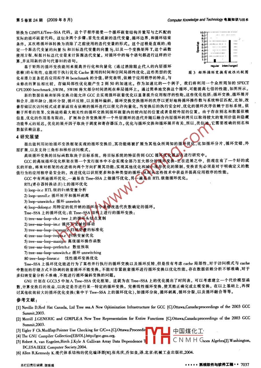 ISSN 1009 -3044E-mail: xsjl@ccc.net.cnComputer Knowedge and Technology電脯知識與技術htp://www.dnzs.net.cnVol.5,No.24, August 2009, pp.7035- -7037Tel:+86- -551-5690963 5690964基于Tree--SSA優(yōu)化框架的高級循環(huán)優(yōu)化楊夏(湖南科技職業(yè)學院.湖南長鈔410004)摘要:現代的計算機處理器和計算機系統(tǒng)實現了很多先進技術,要利用這些技術更需要編譯器的支持以取得高性能。GCC中Tree SSA 優(yōu)化框架提供了一個功能強大的程序分析框架。增強的數據依賴分析信息允許編譯器變換一個算法以取得更大的局部性,提高資源的利用率以增大吞吐量,提高性能。該文對數據依賴、矩陣變換、循環(huán)變換進行了研究,分析了它們的特點,算法和性能,陳述了GCC中循環(huán)變換的現狀,對以后的研究做出了一定的展望。關鍵詞:敏據依賴;遞歸鏈;矩陣變換;循環(huán)依賴,循環(huán)變換,Tree SSA中圈分類號:TP202文獻標識碼:A文章編號:1009- -3044(2009)24 -7035- -03High Loop Optimization of the Tree SSA Optimization InfrastructureYANG Xia(Science and Technology Occupaion College of Hunan, Changsha 410004, China)Abstract: Modem compute processos and systemns have put many technologies into practice, while compliers make highpossible when these technologies are used.The Tree- SSA Optimization Infiastructure in GCC suppies a powerful program analysis frame-work.The enhanced data dependence analysis information allows complicrs to change the algorithm for widen locality .Whereby the uti-lizaton ratio of the tesources can be improved which leads to increasing throughput and higher performance.The study focuses on data de-pendence, matrix transform and cyclic ransformation by analyzing their features,lgorithm and performance and stating the staus quo ofGCC cyclic transfornation whereby outlook of the study has been made.Key words: data dependence; recursive chain; matix transform; cyclic transformation; Tree SSA由于GNU/Linux面臨高性能科學計算和企業(yè)計算的挑戰(zhàn),所以GCC也面臨同樣的挑戰(zhàn)。現代的計算機處理器和計算機系統(tǒng)都實現了很多先進技術,要利用這些特點更需要編譯器的支持以取得高性能。許多之前已開發(fā)的用于向量和并行體系結構的技術,在超標量和超長指令字計算機體系結構Overview of LNO以及具有較大存儲延遲、更復雜功能部件流水線、多級cache的計算機系統(tǒng)中有了新的應用。GCC中TreeSSA優(yōu)化框架提供了-個程序分析的功能強大的框架。增強的數據依賴分析信息允許編譯器變換- -個算法以取得更大的局部性,提高資源的利用皋以Laop Nest Opininer Rranch增大吞吐量,提高性能。GCC的循環(huán)嵌套優(yōu)化器將功能強大的循環(huán)嵌套分析器與矩Cm陣變換引擎相結合,提供了一個可擴展的循環(huán)變換優(yōu)化器,循環(huán)變換優(yōu)化器進行幺模(5-變換和編放操作(ecaling operations)。數據相關分析器是基于- -個新算法來跟蹤歸納變量而不局限于某一特定模式。矩陣變換功能使用一個類似積木的設計.允許利用該血Analyer3 Optinizers矩陣變換功能去實現許多通用的優(yōu)化工具程序。某些專有的商業(yè)編譯器中使用了類似的矩陣變換工具。圖1 GCC的循環(huán)嵌套優(yōu)化器圖1數據依賴分析經過genericiation和gimplfcation后,被編譯的語言循環(huán)結構變成了與命令式語言相同的低級結構:三地址賦值語句.goto語句,標號語句。為了從程序的GIMPIE表示形式中檢索傳統(tǒng)的循環(huán)表示,就要檢測自然循環(huán)(natualloop),然后基于對包含在循環(huán)體內的語句的分析.檢測循環(huán)索引和循環(huán)邊界。通過分析循環(huán)中標量變量的更新屬性,抽取循環(huán)的迭代次數和允許對于任一給定迭代次數可以快速計算變量的值的表示形式,有了這兩者后,可能將復制常量傳播遍擴展到跨循環(huán)之后,消除冗余檢查。還可以進行這樣的分析:抽取數組訪問對存儲空間的讀和寫的關系的表示,進行傳統(tǒng)的數據相關分析。分析器提取的信息使用遞歸鏈來記錄。這種表示形式使用牛頓插值公式.允許快速計算一個函數在一個給定的整數點的值。我們介紹遞歸鏈的基于它們的表示的直觀描述.然后將遞歸鏈的記號與多項式函數聯(lián)系起來。遞歸鏈所表示的主要的屬性是一一個程序在存儲位置上的迭代執(zhí)行。每個存儲點包含有一個循環(huán)的人口點。在循環(huán)執(zhí)行期間,存儲的值隨著更新語句的操作而變化。更新表達式的描述嵌人在遞歸鏈的表示中,這樣就可能從遞歸鏈的表示中檢索到原來程序的表示形式。換句話說.僅選取感興趣的標量屬性,不能確定的標量屬性描述成未知元素。1.1遞歸鏈遞歸鏈- -中國煤化工收稿日期:2009-04-21YHCNMHG基金項目:國家863軟件專項資助(202AA1Z2101、2004AA1Z2210)作者簡介:楊夏(1976-),女,湖南常德人,講師,碩士研究生,主要研究方向為程序設計語言與編譯系統(tǒng)。本欄目責任編輯:邀媛媛....系統(tǒng)軟件與軟件工程..7035Computer Knowledge and Technloy電脯知諷與技術第5卷第24期(2009年8月)r1=0r2=1r3=2loor2*=r3endl:遞歸鏈二r4= 9Loop(1)loop(2)r6 += r5end25 +=r4end1遞歸鏈一中寄存器r1,r2,t3初始化為遞歸鏈的系數。然后,這些寄存器的值在遞歸鏈指定的索引的循環(huán)中更新:圖1中的循環(huán)中,寄存器r2的值在循環(huán)中更新,它的演化由{1,*,2}1遞歸鏈描述。r1從它的初始值0開始累加r2的后繼值,因此r1由{.+{1,*,2]11}1遞歸鏈描述。遞歸鏈二中寄存器r6可以用多變量的標量