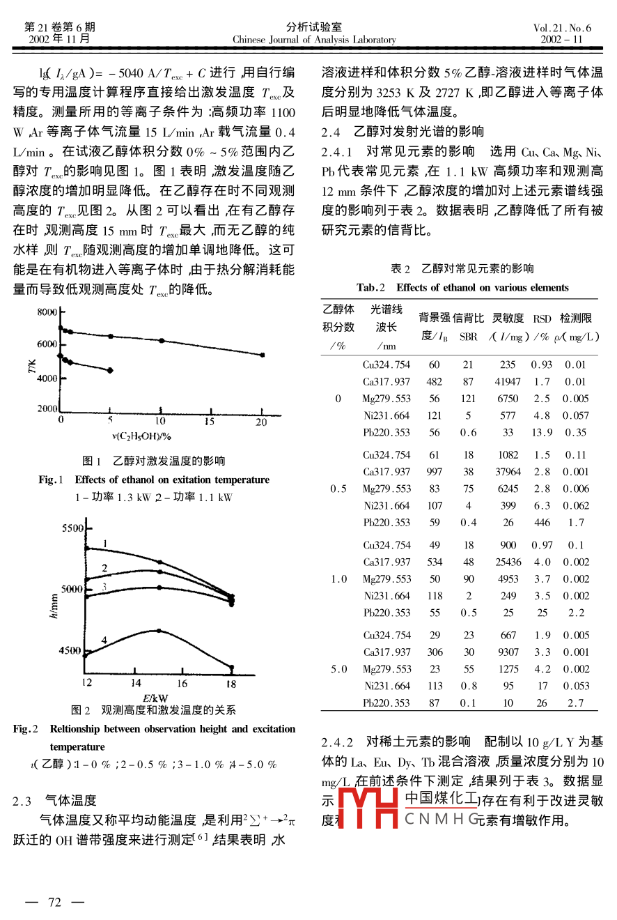 第21卷第6期分析試驗(yàn)室Vol 21. No 62002年11月Chinese Journal of Analysis Laboratory乙醇對(duì)低功率ICP光源的影響辛仁軒*唐亞平清華大學(xué)核能技術(shù)研究院北京10004)摘要研究了在低功率他激高頻發(fā)生器條件下乙醇對(duì) ICP-AES的影響。乙醇引入試液后導(dǎo)致粘度增加表面張力、密度下降試樣提升量降低等離子體激發(fā)溫度和氣體溫度下降Ca、 Mg, Ni Cu, PH等常見元素靈敏度降低而稀土元素的靈敏度得到改善。討論了乙醇對(duì)低功率ICP光源的影響關(guān)鍵詞電感耦合等離子體光譜分析乙醇激發(fā)溫度稀土元素中圖分類號(hào)X657.31文獻(xiàn)標(biāo)識(shí)碼:文章編號(hào):007202002)6.0071-03有機(jī)溶液ICP光源進(jìn)樣是一個(gè)比較困難的問物性的影響首先考查了乙醇對(duì)試液密度、粘度及題,般采用較高的高頻功率和較低的進(jìn)樣量以保表面張力和試液提升率的影響。密度用密度瓶法持光源的穩(wěn)定性。文獻(xiàn)1服導(dǎo)了乙醇進(jìn)樣時(shí)ICP測(cè)量用毛細(xì)管粘度計(jì)測(cè)定粘度用液滴法測(cè)定表光源的光譜特性并用乙醇作為稀釋劑測(cè)定了磷酸面能力測(cè)定結(jié)果列于表1。三丁酯煤油體系中微量鈿23文獻(xiàn)45琛深入地研究了乙醇對(duì)ICP光源激發(fā)特性的影響并測(cè)定了表1乙醇對(duì)試液物性及提升量的影響酒類樣品中多種元素。上述研究多應(yīng)用簡(jiǎn)單線路ab.1 Effects of ethane on physical performable and uptake的自激發(fā)生器或高功率的他激高頻發(fā)生器。本文探討乙醇水溶液體系在低功率他激發(fā)生器條件下體積分?jǐn)?shù)密度粘度表面張力提升量進(jìn)樣對(duì) ICP-AES的影響研究了乙醇對(duì)試液物理性/%/g/mL)/mPas)/ dy/cm)/mL/min質(zhì)的影響測(cè)量了氣體溫度及激發(fā)溫度比較了乙1.00240.945972.6741.754醇存在時(shí)對(duì)各類元素譜線的影響。0.95481實(shí)驗(yàn)部分1.00040.96251.1儀器與試劑0.99211.088459.8571.5710.98521.242653.2761.408等離子體光譜儀:美國(guó) Jarrell-Ash公司Atom-0.96931.552344.0161.036san-2000型等離子體光譜儀順序掃描型,固定型交叉霧化器高頻電源27.120MHz,ApleⅡPls微表1表明乙醇對(duì)試液的粘度和表面張力均有機(jī)控制系統(tǒng)。顯著影響對(duì)提升量也產(chǎn)生明顯影響。由于物性的無水乙醇(AR) u, Ph Ca、Mg變化也將改變霧滴分散度及顆粒直徑最終將會(huì)影D、T標(biāo)準(zhǔn)儲(chǔ)備液1.0mg/m酸度0.5 mol/L hcl響譜線強(qiáng)度。溶液。2.2激發(fā)溫度T。2結(jié)果與討論激發(fā)溫度測(cè)量采用鐵線組FeI388.628mm,Fel2.1乙醇對(duì)試液物性的影響381.584mm,Fel376.554mm,Fel382.043mm,Fel由于氣動(dòng)霧化器試液提升量及霧滴分散度受382中國(guó)煤化工式CNMHG收稿日期2001-08-21修訂日期2001-1201基金項(xiàng)目國(guó)家自然科學(xué)基金經(jīng)費(fèi)資助D10187)作者簡(jiǎn)介辛仁軒(1939-)男教授第21卷第6期分析試驗(yàn)室Vol 21. No 62002年11月Chinese Journal of Analysis Laborate002-11sⅠgA)=-5040A/Ta+C進(jìn)行用自行編溶液進(jìn)樣和體積分?jǐn)?shù)5%乙醇溶液進(jìn)樣時(shí)氣體溫寫的專用溫度計(jì)算程序直接給出激發(fā)溫度T。及度分別為3253K及2727K,即乙醇進(jìn)入等離子體精度。測(cè)量所用的等離子條件為滈高頻功率1100后明顯地降低氣體溫度。WAr等離子體氣流量15L/min,Ar載氣流量0.42.4乙醇對(duì)發(fā)射光譜的影響min。在試液乙醇體積分?jǐn)?shù)0%~5%范圍內(nèi)乙2.4.1對(duì)常見元素的影響選用Cu、 Ca Mg N醇對(duì)T。的影響見圖1。圖1表明激發(fā)溫度隨乙P代表常見元素在1.1kW高頻功率和觀測(cè)高醇濃度的增加明顯降低。在乙醇存在時(shí)不同觀測(cè)12mm條件下乙醇濃度的增加對(duì)上述元素譜線強(qiáng)高度的T見圖2。從圖2可以看出在有乙醇存度的影響列于表2。數(shù)據(jù)表明乙醇降低了所有被在時(shí)觀測(cè)高度15mm時(shí)T最大而無乙醇的純研究元素的信背比。水樣則T、隨觀測(cè)高度的增加單調(diào)地降低。這可能是在有機(jī)物進(jìn)入等離子體時(shí)由于熱分解消耗能表2乙醇對(duì)常見元素的影響量而導(dǎo)致低觀測(cè)高度處T的降低Tab 2 Effects of ethanol on various elements8000乙醇體光譜線積分?jǐn)?shù)波長(zhǎng)背景強(qiáng)信背比靈敏度RSD檢測(cè)限o /IB SBR AI/mg )/%o( mg/L)Cu324.75460212350.930.014000Ca317.937482419471.70.010Mg279.5535612167502.50.005Ni231.66412155774.80.057v(C2HSOH)%P220.353560.63313.90.35圖1乙醇對(duì)激發(fā)溫度的影響Cu324.754611810821.50.11Ca317.93799738379642.80ig. 1 Effects of ethanol on exitation temperature7562452.80.0061-功率13kW2-功率1.1kW0.5Mg279.5538550P220.353590.4264461.79000.970.1Ca317,93753448254364,00.0021.0Mg279.5535049533.70.002SO1182493.50.002P220Cu324.754296671.90.005Ca317.937306093073.30.005.0Mg279.553235512754.20.002Ni231.6641130.8170.053Ekw圖2觀測(cè)高度和激發(fā)溫度的關(guān)系Pb220.353870.110Fig 2 Reltionship between observation height and excitation2.4.2對(duì)稀土元素的影響配制以10g/LY為基(乙醇)1-0%;2-0.5%;3-1.0%-5.0%體的Ia、E、DT混合溶液質(zhì)量濃度分別為10mgL在前述條件下測(cè)定結(jié)果列于表3。數(shù)據(jù)顯2.3氣體溫度中國(guó)煤化存在有利于改進(jìn)靈敏氣體溫度又稱平均動(dòng)能溫度是利用2∑+→2度CNMHG素有增敏作用躍遷的OH譜帶強(qiáng)度來進(jìn)行測(cè)定6結(jié)果表明水第21卷第6期分析試驗(yàn)室Vol 21. No 62002年11
