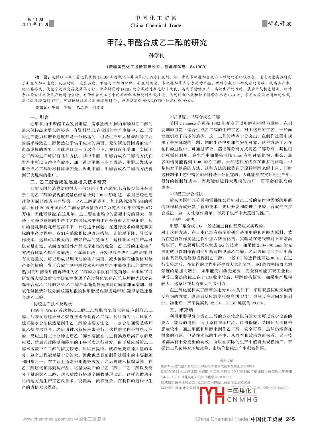 11期中國(guó)化工貿(mào)易013年11月China Chemical trade研完開發(fā)甲醇、甲醛合成乙二醇的研究孫學(xué)良(新疆美克化工股份有限公司,新疆庫(kù)爾勒841000)摘要:選擇以二叔丁基過氧化物①DTBP和過氧化二異兩笨⑦DCP為引發(fā)劑,經(jīng)一步或多次疊加合成乙二醇的效果比較理想。通過大量實(shí)驗(yàn)硏究了引發(fā)劑加入速度、反應(yīng)時(shí)間、反應(yīng)溫度、甲醛與甲醇的配比、引發(fā)劑用量、多次疊加等多個(gè)方面對(duì)甲醛、甲醇合成乙二醇反應(yīng)的影響,提高其產(chǎn)率優(yōu)化其路線,使整個(gè)過程變得更簡(jiǎn)單可行。此次硏究對(duì)DIB的合成的過程進(jìn)行了改良,達(dá)到了清潔生產(chǎn),高效生產(chǎn)的目的。最后用氣相色譜法,紅外表征等方法對(duì)最終產(chǎn)物進(jìn)行分析。對(duì)傳統(tǒng)合成工藝中的原料配比和進(jìn)料方式改進(jìn),達(dá)到過氧化氫和叔丁醇摩爾比為0.64時(shí),采用雙股同時(shí)滴加的方式,反應(yīng)溫度提高到15℃、可以使繼續(xù)反應(yīng)時(shí)間縮短到2h,產(chǎn)率提高到92.5%,DTBP純度達(dá)到996關(guān)鍵詞:甲醇甲醛乙二醇引發(fā)劑引言2以甲醛、甲醇合成乙二醇近年來,由于聚酯工業(yè)發(fā)展迅速,需求量增大國(guó)內(nèi)市場(chǎng)對(duì)乙二醇的美國(guó) Celanese公司在1982年開發(fā)了以甲醇和甲醛為原料,在引需求保持高速增長(zhǎng)的勢(shì)頭。有資料顯示,在我國(guó)的生產(chǎn)發(fā)展中,乙二醇發(fā)劑的引發(fā)下縮合生成乙二醇的生產(chǎn)工藝。對(duì)于這樣的工藝,一經(jīng)面的生產(chǎn)能力和增長(zhǎng)速度都是十分迅猛的,但是生產(chǎn)中大量聚酯等工業(yè)世就引發(fā)了很多的追捧,這一工藝的特點(diǎn)十分突出,在制作過程中規(guī)的需求導(dǎo)致乙二醇仍然處于供不應(yīng)求的局面,無法滿足我國(guó)當(dāng)前生產(chǎn)避了很多麻煩的問題,同時(shí)生產(chǎn)中更加的安全可靠,這種方法工藝在市場(chǎng)發(fā)展的需要,因此進(jìn)口量一直居高不下,并且逐年增加。實(shí)際上制作的過程中,可通過萃取、蒸餾等分離方式將乙二醇分離,其他組乙二醇的生產(chǎn)可以有幾種方法,其中甲醛、甲醇合成乙二醇的方法在分可循環(huán)利用。在生產(chǎn)中如果每消耗1mol有機(jī)過氧化物,那么,最生產(chǎn)中可以節(jié)約生產(chǎn)成本,加上通過甲醛三步合成法、甲醇二聚法制多的情況能得到13m的乙二醇。雖然這種方法存在很多的問題,取合成乙二醇的材料簡(jiǎn)單安全,因此甲醛、甲醇合成乙二醇的方法得是相對(duì)于以前的方法,這種方法的優(yōu)勢(shì)在于原料甲醇來源豐富,同時(shí)到了大規(guī)模的推廣。這種制作工藝中需要的材料是十分便宜的,因此能夠在實(shí)際的生產(chǎn)中,二、乙二醇合成發(fā)展及相關(guān)技術(shù)研究很好的控制好成本,因此能夠進(jìn)行大規(guī)模的推廣,而不會(huì)有很高的目前我國(guó)的消費(fèi)結(jié)構(gòu)很大一部分用于生產(chǎn)聚酯只有極少部分是對(duì)成本于目前乙二醇的表觀消費(fèi)量已經(jīng)增長(zhǎng)到508.8萬(wàn)噸,這一數(shù)據(jù)已經(jīng)已超3甲醛三步合成法過美國(guó)而已經(jīng)成為世界第一大乙二醇消費(fèi)國(guó),加上防凍液等5%的需后來美國(guó)杜邦公司和雪佛隆公司針對(duì)乙二醇的制作中需要的甲醛預(yù)計(jì)2008年國(guó)內(nèi)乙二醇總需求量約617萬(wàn)噸2010年約需要677的制作和合成開發(fā)了新的技術(shù),先后開發(fā)和改進(jìn)了甲醛、合成氣三步萬(wàn)噸。因此可以說在這幾年,乙二醇在市場(chǎng)中的需要十分的巨大,但合成法。這一方法制作簡(jiǎn)單,得到了生產(chǎn)中大范圍的推廣。是目前來說我國(guó)的生產(chǎn)工藝跟國(guó)際水平相比還是有很大的差距的,其4.甲醇二聚法中的能耗和物耗都居高不下,針對(duì)這個(gè)問題,在進(jìn)行技術(shù)的研究和實(shí)甲醇二聚合成EG一般是通過自由基反應(yīng)來實(shí)現(xiàn)的際的生產(chǎn)過程中,我們應(yīng)釆取積極地改進(jìn)措施,讓能耗下降,降低制對(duì)于這種方法,在日本已經(jīng)有很多的研究是用甲醇和丙酮為原料作成本,這樣可以極大的,增強(qiáng)產(chǎn)品的競(jìng)爭(zhēng)力,這樣我國(guó)相關(guān)產(chǎn)品可后在進(jìn)行制作實(shí)驗(yàn)過程中加入鍺催化劑,實(shí)驗(yàn)是在光線照射下在常溫以立足市場(chǎng),從而改變國(guó)外產(chǎn)品充斥市場(chǎng)的現(xiàn)象。乙二醇的工業(yè)生產(chǎn)常壓下,那么就可以反應(yīng)生成EG的技術(shù)。如果使250-330mum的光方法有環(huán)氧乙烷再水解法,乙烯氧化法。開發(fā)甲醇合成乙二醇路線具照射就可以制作得到經(jīng)甲基與四甲基乙二醇,之后再通過兩個(gè)經(jīng)甲基有重要意義,可以形成以煤代油的生產(chǎn)局面,減少國(guó)際石油價(jià)格對(duì)該自由基偶聯(lián)最終形成得到乙二醇。一股EG的選擇性可達(dá)80%。在進(jìn)產(chǎn)業(yè)的影響。鑒于合成氣制甲醇技術(shù)和甲醇生產(chǎn)甲醛技術(shù)已經(jīng)非常成行實(shí)驗(yàn)之后,在制作的過程中還生成大量的氫氣。EG的收率隨著光源熟因而甲醇制甲醛再轉(zhuǎn)化為乙二醇的方案很有開發(fā)前景。日本原字能強(qiáng)度的增加而增