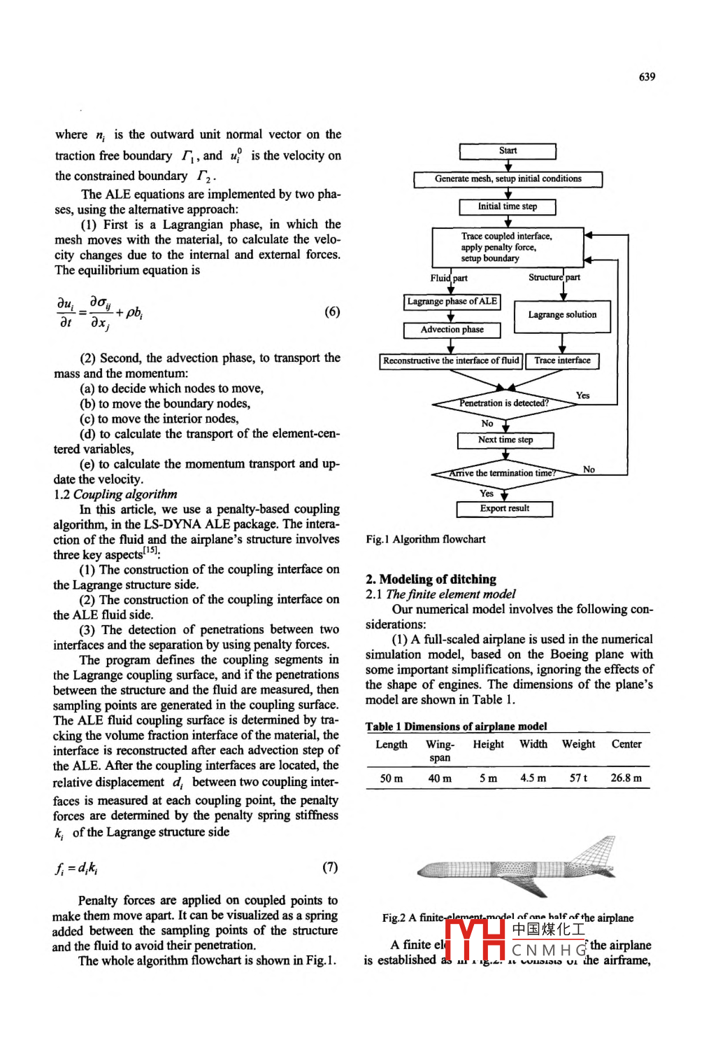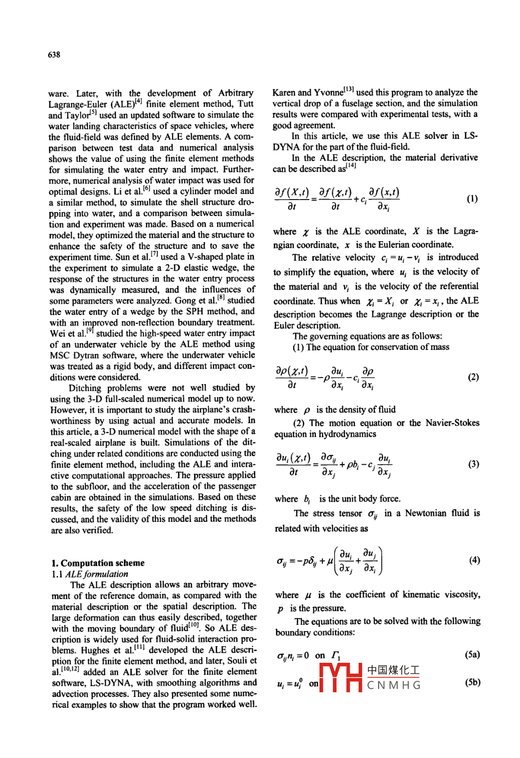 637Available online at www.sciencedirect.comScienceDirecttTTDtJoumal of HydrodynamicsEL SEVIER201 1 ,23(5):637-642www.sciencedirect.com/DOt: 10.1016/S1001-6058(10)60159-Xscienceljounal/10016058SIMULATION OF FLUID-SOLID INTERACTION ON WATER DITCHINGOF AN AIRPLANE BY ALE METHODHUA Cheng, FANG ChaoDepartment of Mechanics and Engineering Science, Fudan University, Shanghai 200433, China,E-mai: huacheng@fudan.edu.cnCHENG JinSchool of Mathematical Sciences, Fudan University, Shanghai 200433, China(Received March 21, 2011, Revised May 8, 2011)Abstract: Ditching is considered as one of the important aspects of safety performances of airplanes. It is related primarily with thefluid-solid interaction, whose studies mainly depend on experiments at the present time. Numerical and analytical methods forfluid- solid interaction by using 3-D full scale airplane' s model will reduce the dependence on the expensive model tests. Numericalstudies can be used to estimate the safety of ditching and provide a reference for the crashworthiness design. This article proposes a3-D dynamical structural model aftere real shapnape 'in airplane and an Arbitrary Lagrange-Euler (ALE) fluid-field model, tosimulate the fluid-solid interactions caused by low speed ditching. The simulation is based on interaction computational methods,within LS-DYNA nonlinear finite-element code. The results of pressure distributions and accelerating time histories of the airplane'ssubfloor are discussed in the context of the safety of ditching, and the simulation results and the analytical methods are verified.Key words: dithing, fluid structure interaction, Arbitrary Lagrange Euler (ALE), finite element methodIntroductiontheretically, experimentally or numerically. VonDitching means that a plane has no altermativeKarman (1929) developed the first theory for this pro-but to land on water surface such as sea or lake, inblem. This pioneering work uses the concept of addedview of the safety of crews and passengers. There aremass for investigation of impact loads on a seaplanesome cases of successful ditching, also some cases ofduring ditching. The majority of the subsequent theo-crashes. Airline companies have strict rules for di-retical work in the early period was based on Vontching". According to structural dynamics, an air-Karman's concept. The experimental techriques rela-plane should be in very low speed when ditching, theted with the problem were mainly developed bdeformation of an airplane can be approximately con-NASA since the late 1950s. Boeing airplanes weresidered as elastic-plastic, and it is feasible to simulatetested and the operating specifications of ditchingan airplane's ditching by using numerical analysiswere developed at that time. Recently, the numericalmethods such as finite element analysis.analysis is widely used in this respect.Unlike a ground impact, a large area of the air-Seddon and Moatamedil2l reviewed the studies ofplane's outer skin contacts with water in ditching.water entry and impact between 1929 and 2003, and itThusthe fluid-solid interaction and someis pointed out that the numerical analysis should be .mechanical problems should be primarily addressed.considered as a main choice, and accurate numericalThe problem of water entry and impact can be studiedmodels of fluid-solid jinteraction may replace expen-sive and time-consuming full-scaled tests. Brooks andAnderson'B] first used the finite element software, LS-* Project supported by the Shanghai Key Basic ResearchDYNA, to investigate the water entrv of spacecraft.Program of China (Grant No. 07JC14001).The simulation中國(guó)煤化工comparisonBiography: HUA Cheng (1963-), Male, Pb. D, Associatewith the full-HC N M H Gsponse afterProfessor30 ms-40 ms isut vcty atisiavwiy uause the fieldof fluid was calculated as a kind of solids in this soft-638with the development of ArbitraryKaren and Yvonnel3] used this program to analyze theLagrange-Euler (ALE)41 finite element method, Tuttvertical drop of a fuselage section, and the simulationand Taylor59 used an updated software to simulate theresults were compared with experimental tests, with awater landing characteristics of space vehicles, wheregood agreement.the fluid-field was defined by ALE elements. A com-In this article, we use this ALE solver in LS-parison between test data and numerical analysisDYNA for the part of the fluid-field.shows the value of using the finite element methodsIn the ALE description, the material derivativefor simulating the water entry and impact. Further-can be described as'more, numerical analysis of water impact was used foroptimal designs. Li et al.!6l used a cylinder model andaf(X,1)_ af(x,1)af(x,t)a similar method, to simulate the shell structure dro-(1)0tpping into water, and a comparison between simula-tion and experiment was made. Based on a numericalwhere x is the ALE coordinate, X is the Lagra-model, they optimized the material and the structure toenhance the safety of the, structure and to save thengian coordinate, x is the Eulerian coordinate.experiment time. Sun et al!T used a V-shaped plate inThe relative velocity c; =u, -v is introducedthe experiment to simulate a 2-D elastic wedge, theto simplify the equation, where u; is the velocity ofresponse of the structures in the water entry processthe material and v; is the velocity of the referentialwas dynamically measured, and the influences ofsome parameters were analyzed. Gong et al.o studiedcoordinate. Thus when x=X; or x=x, the ALEthe water entry of a wedge by the SPH method, anddescription becomes the Lagrange description or thewith an improved non-reflection boundary treatment.Euler description.Wei et al.9I studied the high-speed water entry impactThe goveming equations are as follows:of an underwater vehicle by the ALE method using(I) The equation for conservation of massMSC Dytran software, where the underwater vehiclewas treated as a rigid body, and different impact con-ap(x,t)__o 24_. apditions were considere