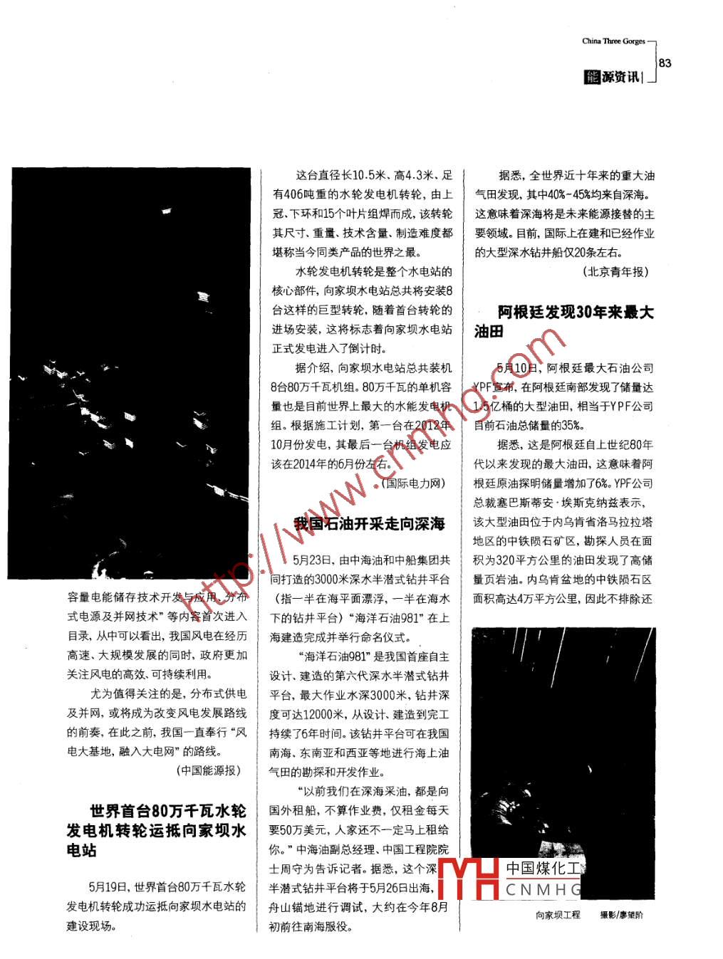 China Three Gorges83髓源資訊|這臺(tái)直徑長(zhǎng)10.5米.高4.3米.足據(jù)悉,全世界近十年來的重大油有406噸重的水輪發(fā)電機(jī)轉(zhuǎn)輪,由上氣田發(fā)現(xiàn),其中40%~ 45%均來自深海。冠、下環(huán)和15個(gè)葉片組焊而成,該轉(zhuǎn)輪這意味著深海將是未來能源接替的主其尺寸重量、技術(shù)含量、制造難度都要領(lǐng)域。目前,國(guó)際上在建和已經(jīng)作業(yè)堪稱當(dāng)今同類產(chǎn)品的世界之最。的大型深水鉆井船僅20條左右。水輪發(fā)電機(jī)轉(zhuǎn)輪是整個(gè)水電站的(北京青年報(bào))核心部件,向家壩水電站總共將安裝8臺(tái)這樣的巨型轉(zhuǎn)輪,隨著首臺(tái)轉(zhuǎn)輪的阿根廷發(fā)現(xiàn)30年來最大進(jìn)場(chǎng)安裝,這將標(biāo)志著向家壩水電站油田正式發(fā)電進(jìn)入了倒計(jì)時(shí)。據(jù)介紹,向家壩水電站總共裝機(jī)5月10日,阿根廷最大石油公司8臺(tái)80萬千瓦機(jī)組。80萬千瓦的單機(jī)容YPF宣布,在阿根廷南部發(fā)現(xiàn)了儲(chǔ)量達(dá)量也是目前世界上最大的水能發(fā)電機(jī)1.5億桶的大型油田,相當(dāng)于YPF公司組。根據(jù)施工計(jì)劃,第一臺(tái)在2012年目前石油總儲(chǔ)量的35%。10月份發(fā)電,其最后-臺(tái)機(jī)組發(fā)電應(yīng)據(jù)悉,這是阿根廷自上世紀(jì)80年該在2014年的6月份左右。代以來發(fā)現(xiàn)的最大油田,這意味著阿(國(guó)際電力網(wǎng))根廷原油探明儲(chǔ)量增加了6%。YPF公司.總裁塞巴斯蒂安.埃斯克納茲表示,我國(guó)石油開采走向深海該大型油田位于內(nèi)烏肯省洛馬拉拉塔地區(qū)的中鐵隕石礦區(qū),勘探人員在面5月23日,由中海油和中船集團(tuán)共積為320平方公里的油田發(fā)現(xiàn)了高儲(chǔ)同打造的3000米深水半潛式鉆井平臺(tái)量頁巖油。內(nèi)烏肯盆地的中鐵隕石區(qū)容量電能儲(chǔ)存技術(shù)開發(fā)與應(yīng)用、分布(指一半在海平面漂浮,一半在海水面積高達(dá)4萬平方公里,因此不排除還式電源及并網(wǎng)技術(shù)”等內(nèi)容首次進(jìn)入下的鉆井平臺(tái))“海洋石油981"在上目錄,從中可以看出,我國(guó)風(fēng)電在經(jīng)歷海建造完成并舉行命名儀式。高速、大規(guī)模發(fā)展的同時(shí),政府更加“海洋石油981”是我國(guó)首座自主關(guān)注風(fēng)電的高效、可持續(xù)利用。設(shè)計(jì).建造的第六代深水半潛式鉆井尤為值得關(guān)注的是,分布式供電平臺(tái),最大作業(yè)水深3000米,鉆井深及并網(wǎng),或?qū)⒊蔀楦淖冿L(fēng)電發(fā)展路線度可達(dá)12000米,從設(shè)計(jì)、建造到完工的前奏,在此之前,我國(guó)一-直奉行“風(fēng)持續(xù)了6年時(shí)間。該鉆井平臺(tái)可在我國(guó)電大基地,融入大電網(wǎng)”的路線。南海、東南亞和西亞等地進(jìn)行海上油(中國(guó)能源報(bào))氣田的勘探和開發(fā)作業(yè)?!耙郧拔覀?cè)谏詈2捎?都是向世界首臺(tái)80萬千瓦水輪國(guó)外租船, 不算作業(yè)費(fèi),僅租金每天發(fā)電機(jī)轉(zhuǎn)輪運(yùn)抵向家壩水要50萬美元,人家還不一定馬上租給電站你?!敝泻S透笨偨?jīng)理、中國(guó)工程院院士周守為告訴記者。據(jù)悉,這個(gè)深中國(guó)煤化工5月19日,世界首臺(tái)80萬千瓦水輪半潛式鉆井平臺(tái)將于5月26日出海,MHCNMHG發(fā)電機(jī)轉(zhuǎn)輪成功運(yùn)抵向家壩水電站的舟山錨地進(jìn)行調(diào)試,大約在今年8月向家壩工程攝影/廖望階建設(shè)現(xiàn)場(chǎng)。初前往南海服役。