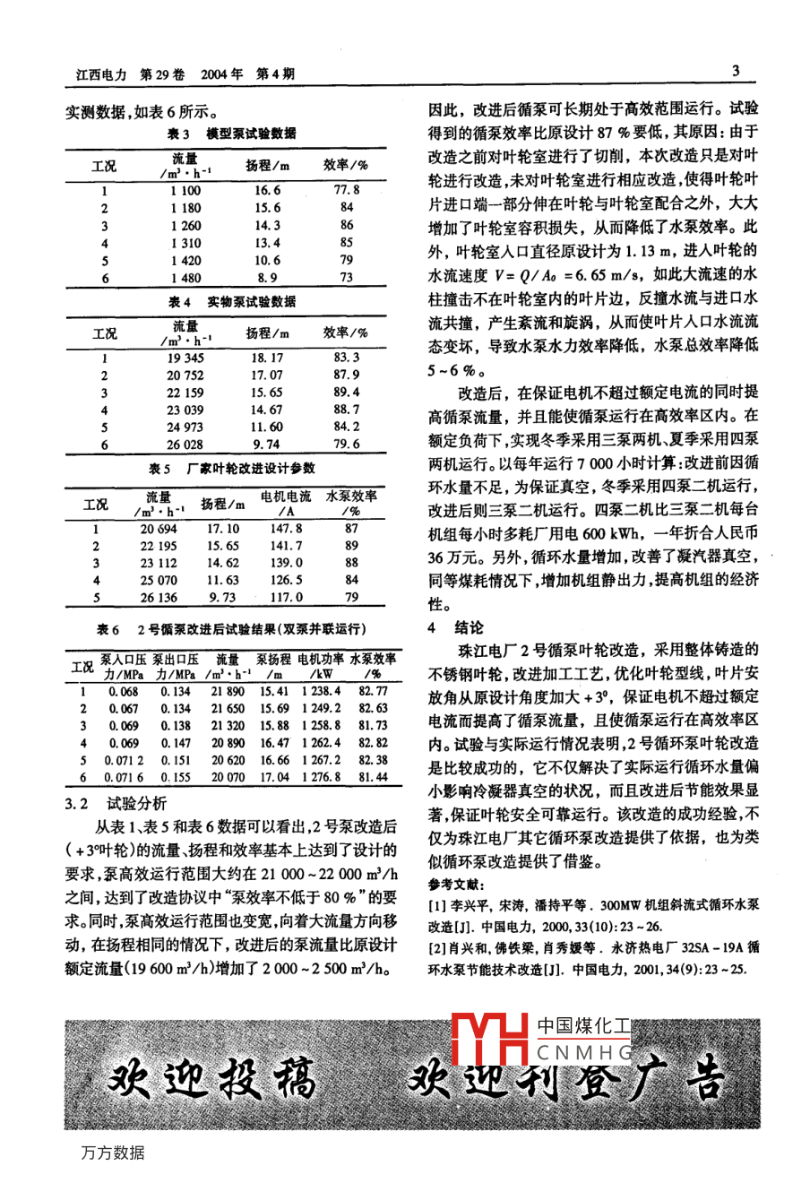 江西電力第29卷2004年 第4期1文章編號:1006 - 348X(2004)04-01 -03珠江電廠300MW 機(jī)組循環(huán)水泵增流改造趙林桂(廣州珠江電廠,廣東廣州511457)摘要:針對珠江電廠循環(huán)水泵供水不足、泵葉片強(qiáng)度不夠等問題,對循環(huán)水泵進(jìn)行了增流節(jié)能技術(shù)改造。在不改變原水泵配套電機(jī)、泵殼和管道等的條件下,將葉片安放角從原設(shè)計(jì)角度加大+30,且對葉片型面進(jìn)行適當(dāng)?shù)男拚?將原組合式葉輪結(jié)構(gòu)改為整體鑄造結(jié)構(gòu),并優(yōu)化葉輪加工工藝,通過這-系列的改進(jìn)達(dá)到提高葉片強(qiáng)度、增加循環(huán)泵流量的目標(biāo)。試驗(yàn)證明,通過技術(shù)改造提高了電廠的經(jīng)濟(jì)運(yùn)行水平和安全可靠性,其經(jīng)濟(jì)效益十分顯著。關(guān)鍵詞:汽輪機(jī);循環(huán)泵;技術(shù)改造;增流中圖分類號:TH313文獻(xiàn)標(biāo)識碼:BAbstract: In the view of insuficiency in water supply of eirculation water pumps in ZhuJiang power plant, the circultionwater pumps were rtrfitted with the aim of increasing flow rate and saving energy. Through adjusting the blade incidencefrom 0 degree to +3 degree, mdifying to suit the moulding surface of impeller, and changing combined type impeller tomonoblock cast impeller, without changing molor, pump case etc, the target of raising impellr intensity and water supplyamount were achieved. Through the retoGit, the economic operation level and safety reliability of the power plant has beenimproved with significant economic benefit obtained.Key words: steam turbines; circulation water pumps; technology retrofit; flow increasing1引言計(jì)要求。這些問題嚴(yán)重影響機(jī)組安全經(jīng)濟(jì)運(yùn)行,且珠江電廠四臺300 MW國產(chǎn)引進(jìn)型汽輪發(fā)電機(jī)循環(huán)水泵是該電廠廠用電的主要消耗源之- -,約占組,配置了八臺1600HLB - 16型立式混流式循環(huán)水整臺機(jī)組廠用電量的20 %,因此,對珠江電廠的循泵,泵參數(shù)如表1,電機(jī)參數(shù)參見表2。由于珠江電環(huán)水泵進(jìn)行增流改造,提高排汽真空、運(yùn)行效率和安使用的汽輪發(fā)電機(jī)組中的凝汽器面積與國產(chǎn)同類全可靠性,具有十分重大的經(jīng)濟(jì)價值和社會效益。型機(jī)組相比相對偏小,冷凝效果較差,導(dǎo)致機(jī)組真2循環(huán)水泵改造空不夠,影響出力。另外電廠使用的1600HLB - 162.1改造方案循環(huán)泵葉輪為組合式結(jié)構(gòu),強(qiáng)度低,在其葉片根部由于循環(huán)泵體積大、質(zhì)量重、價格較貴,為增大曾發(fā)生過裂紋和斷裂現(xiàn)象,泵的實(shí)際出力達(dá)不到設(shè)流量而將葉輪殼體全部進(jìn)行改造,勢必造成很大浪費(fèi)。而且將殼體和葉輪全部重新設(shè)計(jì)制造后,泵的表1循環(huán)水泵原 始設(shè)計(jì)參數(shù)參數(shù)/m'. h-!揚(yáng)程/m/r: min-!轉(zhuǎn)速水泵效率安裝尺寸、進(jìn)出口法蘭直徑等也發(fā)生變化,給安裝帶/%來極大不便。故實(shí)際改造時,采用了殼體不動,電機(jī)值19 600378不換,僅改造葉輪的小改方案。具體要求如下:表2循環(huán)水泵配套 電機(jī)額定參數(shù)2.1.1改造后 的葉輪可以替換原葉輪,泵的其它功率電流/A電壓/V頻率/Hz零部中國煤化工/kW/r. min-12.1|YHCN M H G情況下,改造后的泵1 2501586 00050370性能爹雙必須兩疋沉重增加到21 000 ~ 22000 m2'/h收稿日期:2004 -06-14.作者筒介:趙林桂(1963-) ,工程師,主要從事電廠設(shè)備維修與管理方面工作。:江西電力第29卷2004年 第4期(原設(shè)計(jì)流量為19 600 m2/h),并保證電機(jī)不超功n-實(shí)物泵轉(zhuǎn)速 ,370 r/ min;率。n模型泵泵轉(zhuǎn)速, 1450 r/min;2.1.3將組合式葉輪結(jié)構(gòu)改成整體鑄造葉輪結(jié)實(shí)物泵效率,%; .構(gòu),提高葉片強(qiáng)度。-模型泵效率, %。2.2葉輪改造設(shè)計(jì)2.3加工工藝優(yōu)化因?yàn)楦倪M(jìn)要求泵殼體不動,只改進(jìn)葉輪,葉輪由于高比轉(zhuǎn)速離心泵葉片為扭曲葉片,采用普的設(shè)計(jì)受到原泵殼體幾何尺寸及流體力學(xué)特性限通木模整體鑄造葉輪會產(chǎn)生較大偏差,葉輪過流面制,而且改造后流量大幅度增加,必然導(dǎo)致各過流通也較粗糙。因此,在制造改造后的循環(huán)泵葉輪時,采道內(nèi)流速明顯加大,水力損失也隨之增大。在此條用不變形的塑料模。葉片模具的型面采用組合樣板件下要保證水泵效率不下降,則必須采用先進(jìn)的設(shè)嚴(yán)格檢查,保證符合設(shè)計(jì)要求。造型采用先進(jìn)的組計(jì)方法,優(yōu)化轉(zhuǎn)輪等過流通道,研究各過流部件的匹合泥芯新工藝,型沙采用樹脂砂,以提高鑄件的幾何配關(guān)系,使水力損失最小,取得最佳性能。形狀精度和相對位置精度,降低表面粗糙度為了增強(qiáng)泵葉片強(qiáng)度,改造時將原泵的組合式(Ra12. 5 ~ 25)和減少原始不平衡。對不銹鋼鑄件進(jìn)葉輪,改造成整體鑄造葉輪。結(jié)合實(shí)驗(yàn)與經(jīng)驗(yàn)確定行固溶化處理,提高機(jī)械性能,減少偏析,提高抗蝕新葉輪葉片安放角由原來的0改為+3%。葉片設(shè)計(jì)能力。葉片型面全部進(jìn)行打磨拋光,粗糙度達(dá)到以相似換算法為基礎(chǔ),經(jīng)過初步換算得到葉輪的軸Ra3. 2~6.3。葉輪進(jìn)行嚴(yán)格靜平衡,葉片進(jìn)行無損面尺寸后,根據(jù)殼體和軸的尺寸對葉輪進(jìn)口頸部直探傷。徑和輪轂直徑進(jìn)行必要的