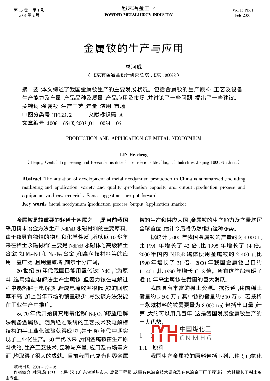 第13卷第1期粉末冶金工業(yè)2003年2月POWDER METALLURGY INDUSTRYFeb.2003金屬釹的生產(chǎn)與應(yīng)用林河成(北京有色冶金設(shè)計研究總院北京10008摘要本文綜述了我國金屬釹生產(chǎn)的主要發(fā)展?fàn)顩r。包括金屬釹的生產(chǎn)原料工藝及設(shè)備生產(chǎn)能力及產(chǎn)量產(chǎn)品品種及質(zhì)量產(chǎn)品應(yīng)用及市場并討論了一些問題提出了一些建議關(guān)鍵詞金屬釹生產(chǎn)工藝產(chǎn)量應(yīng)用市場中圖分類號:TF123.2文獻(xiàn)標(biāo)識碼:A文章編號1006-6543x2003)1-0034-06PRODUCTION AND APPLICATION OF METAL NEODYMIUMLin He-chensBeijing Central Engineening and Research Institute for Non-ferrous Metallurgical Industries Beijing 100038 ChinaAbstract The situation of development of metal neodymium production in China is summarized includingmarketing and application , variety and quality production capacity and output production process andequipment and raw materials. Some suggestions are put forwardKey words metal neodymium production process output 'application market金屬釹是較重要的輕稀土金屬之一是目前我國釹的生產(chǎn)和供應(yīng)大國金屬釹的生產(chǎn)能力及產(chǎn)量均居采用粉末冶金方法生產(chǎn)NFeB永磁材料的主要原料。全球首位估計今后將仍然維持這種態(tài)勢。由于釹具有獨(dú)特的物理和化學(xué)性質(zhì)所以近10多年據(jù)統(tǒng)計2000年我國金屬釹的產(chǎn)量約為4000t來在稀土永磁材料主要是 NdFeB永磁體)高級稀土比1990年增長了42倍,比1995年增長了14倍。合金如MgNd和№d-Fe合金廂高科技材料等的應(yīng)2000年國內(nèi)NFeB磁體使用金屬釹約2400t,比用日益廣泛且用量激增前景十分廣闊。1990年增長了31倍。2000年我國金屬釹出口約20世紀(jì)60年代我國已能用氯化釹(NdCl3)為原1140t比1990年增長了18倍。所有這些都表明了料選用熔鹽電解法生產(chǎn)金屬釹但因為釹在電解過近10年來金屬釹在我國的巨大發(fā)展程中易熔解于電解質(zhì)造成電流效率很低釹的回收我國具有豐富的稀土資源。據(jù)報道我國稀土率不高加上當(dāng)年市場的銷量較少導(dǎo)致該方法沒能儲量約3600萬t其中釹的儲量約510萬t若按稀在工業(yè)生產(chǎn)中推廣。土永磁材料的釹需要量為8000(包括出口量川從丌0年代開始研究用氧化釹Nd2O3)熔鹽電解算大約可以用幾百年這是我國發(fā)展金屬釹生產(chǎn)的法制備金屬釹。隨后經(jīng)過系統(tǒng)的工藝技術(shù)及電解槽大優(yōu)勢結(jié)構(gòu)的半工業(yè)化試驗獲得成功并于80年代中期實中國煤化工現(xiàn)了工業(yè)化生產(chǎn)。90年代以來我國金屬釹在生產(chǎn)原1CNMHG料供給、生產(chǎn)工藝技術(shù)、品種與產(chǎn)量、應(yīng)用及市場等方1.1原料面均取得了很大的成就。目前我國已成為世界金屬我國生產(chǎn)金屬釹的原料包括下列幾種(1瀛氟化收稿日期2001-10-08作者簡介林河成(1935-)男漢)廣東省潮州市人高級工程師從事有色冶金技術(shù)研究及有色冶金工廠工程設(shè)計尤其擅長于稀土冶第林河成金屬釹的生產(chǎn)與應(yīng)用35釹NdCl3)含Nd2O3≥45%Nd2O3/REO≥99%。稀以氯化釹(NdCl3)為原料用金屬鈣作還原劑土雜質(zhì)<1.0%,非稀土雜質(zhì)<0.9%〔Fe2O3BaO,配料壓塊后放入還原爐內(nèi)進(jìn)行還原反應(yīng)。還原結(jié)束cao和sO等(2)氧化釹NlO3):含NO3≥除去雜質(zhì)廢渣CaCl2)再將釹熔化澆注成鑄錠就制99%REO≥99%稀土雜質(zhì)≤1.0%(鑭、鈰、鐠、得了金屬釹產(chǎn)品。其主要工藝過程為釤、釔),非稀土雜質(zhì)≤0.2%(Fe2O3,SiO2和Ca原料→-配料→-壓塊→鈣還原→亠除渣-熔化鑄錠等(3)化釹N3)含M2O3≥99%REO≈81→包裝→入庫釹產(chǎn)品)%F≈27%。稀土雜質(zhì)≤1.0%鑭、鈰、鐠、釤、銪還原過程主要反應(yīng)為和釓等)非稀土雜質(zhì)≤0.09%(Fe2O3,A2O3SiO22NdCl3+3Ca→·2Nd+3CaCCaO和Mg等以上3種原料均可工業(yè)化生產(chǎn)工主要設(shè)備有鈣還原爐、壓塊機(jī)、熔化鑄錠機(jī)、除藝及設(shè)備成熟可靠。渣器和包裝機(jī)等。1.2工藝技術(shù)及設(shè)備工藝指標(biāo)釹純度≈99%回收率≥95%。幾十年來我國自行研究和工業(yè)實踐的金屬釹該工藝作業(yè)簡單工序少。但產(chǎn)品釹的純度及的生產(chǎn)工藝技術(shù)與設(shè)備已取得豐碩成果。我國已有收得率較低。且受設(shè)備限制釹的產(chǎn)量少大量提供的金屬釹的生產(chǎn)方法包括(1)化釹熔融電解法。釹有困難。2氳化釹鈣還原法。(3嵐化釹熔融電解法。前兩1·2.3氧化釹熔融電解法生產(chǎn)金屬釹34種方法缺點(diǎn)較多,目前很少采用。后一種方法是目用氧化釹Nd2O3為原料選用氟化釹N3廂前我國生產(chǎn)金屬釹的主要工業(yè)生產(chǎn)方法。氟化鋰(Li進(jìn)行配、混料構(gòu)成三元電解質(zhì)(Nd2O32.1氯化釹熔融電解法制備金屬釹12NF3工i)將電解質(zhì)放入電解槽內(nèi)進(jìn)行熔化并在用氯化釹(NC)為原料配有氯化鉀KC構(gòu)達(dá)到電解溫度后通入直流電進(jìn)行電解。在電解中成兩元電解質(zhì)N1-KC體系。電解質(zhì)在石墨坩堝要連續(xù)不斷的加入NdO3以保證電解的持續(xù)進(jìn)行。電解槽中熔化后通入直流電進(jìn)行電解。在石墨陽其主要工藝過程是極析出氯氣C2)在鉬陰極析出金屬釹(由瓷碗接原料-配料→?混料亠熔化亠熔融電解→亠熔融釹受)其主要工藝過程為→鑄錠→清洗→晾干→包裝→入庫釹產(chǎn)品)原料→配料丶熔化-