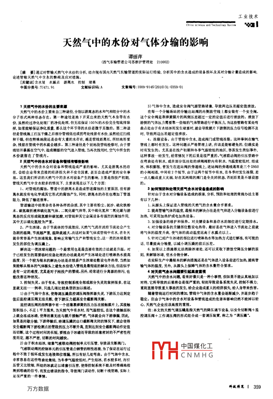 工業(yè)技術(shù)Chine science and Techno ogy Revi天然氣中的水份對氣體分輸?shù)挠绊懽T麗萍西氣東輸管道公司蘇浙滬管理處210002)[摘要]通過對管輸天然氣中水份的分析,結(jié)合現(xiàn)有國內(nèi)天然氣長輸管道的實際運行經(jīng)驗,分析其中的含水造成的設(shè)備損壞及其對分輸計量造成的影響論述管輸天然氣中含永的弊端及應(yīng)對措施[關(guān)鍵詞]含水量水鄯點游離水控制堵塞中圖分類號:T471.91文獻標(biāo)識碼:A文章編號:1009-914X(2010)31-0359011天然氣中的水份的主要來源3)氣體中含水,造成安全閥氣源管路堵塞,導(dǎo)致兩邊壓差超定值泄放天然氣中的水份主要來自三種途徑分別以游離態(tài)的水和氣相組分中的水在每一個分輸場站的分輸出站閥的內(nèi)側(cè)放空線上都安裝有一個安全閥分子形式兩種形態(tài)存在。第一種途徑是地下開采出來的天然氣本身帶有水這個安全閥是靠彈簧膜片的兩側(cè)壓差超過一定的定值后進行泄放的,泄放下份,雖然經(jīng)過凈化處理廠的凈化處理,但無法保證100%的水份完全徹底排除游側(cè)的氣體壓力需要靠一些細(xì)的氣體管路進行平衡壓力當(dāng)這些管路有某處彎掉如果能夠保證凈化質(zhì)量那么這個環(huán)節(jié)帶的水份是微乎其微的。第二種途曲點處由于有水結(jié)冰而發(fā)生堵塞時就會導(dǎo)致膜片下游側(cè)的壓力信號檢測不及徑是管線施工打壓干燥之后部分管線低洼或拐彎處殘留有水份,雖然經(jīng)過掃線時,導(dǎo)致兩邊壓差超定值滑放和千燥,但在特殊地段還是會有大量的水存在,越是管線距離長,所經(jīng)地形復(fù)4、凍裂設(shè)備,由于管線中含水造成閥門或管線凍裂。這種事例在輸氣雜殘留在管線中的水就會越多。第三種途徑是個別地段管線檢修時,由于管管線上都時有發(fā)生,這種問題從嚴(yán)格管理上講,應(yīng)該是能夠避免的,但確實是線切開暴露在空氣中造成潮濕的空氣進入管線當(dāng)再次投用時,空氣中所含的時有發(fā)生的。尤其是在投產(chǎn)初期和冬季氣溫較低的地區(qū),容易發(fā)生類似事件水份就留在了管線內(nèi)這種事故一經(jīng)發(fā)生經(jīng)常情況下的后果是很嚴(yán)重的。氣液聯(lián)動閥的引壓管路中2天然氣中的含水對設(shè)備和管結(jié)有哪些影響在彎曲處有積水,或在部分低洼處的球閥閥腔內(nèi)有積水,當(dāng)溫度較低時,結(jié)成天然氣中的含水會對設(shè)備和管線造成嚴(yán)重的影響。尤其是游離水的存冰,體積膨脹,曾發(fā)生在進站閥的旁通線上進站閥的務(wù)通線通常是三個DN50在,會給企業(yè)帶來直接的經(jīng)濟損失和不安全因素,甚至?xí)斐蓢?yán)重的安全事的小閥相連,中間有2個短節(jié),由于這兩個短節(jié)中有水,在冬季時發(fā)生凍裂差故。這里我們所講的天然氣中的含水對設(shè)備產(chǎn)生的影響,主要是指投產(chǎn)初期,點兒酸成重大災(zāi)禍,好在其兩端的閥門是全關(guān)閉狀態(tài)否則后果是不堪設(shè)想管線天然氣中含水較多的情況下主要表現(xiàn)在以下幾個方面1、對管線的腐蝕。管道中的游離水是造成管道腐蝕的主要原因,沒有游3如何預(yù)防和處理天然氣含水對設(shè)備遺成的影響離水就沒有電化學(xué)或其它形式的腐蝕產(chǎn)生,同時,游離水的存在也增加了管道針對由于含水對分輸設(shè)備造成的損害,分析,預(yù)防和處理的常規(guī)辦法主要阻力,降低了輸送效率有以下幾種管道輸送中經(jīng)常會有各種各樣的雜質(zhì)其中主要有粉塵、泥沙硫化鐵粉從源頭上保證進入管線的天然氣的含水量合乎要求。末、碳?xì)淠鲆汉土蚧瘹錃怏w、二氧化碳?xì)怏w等,其中硫化氫和二氧化碳與游2.提高管輸氣體的溫度最根本的解決辦法是在氣體進入分輸設(shè)備前進行離態(tài)的反應(yīng)形成硫氫酸和碳?xì)渌釋芫€和其它金屬設(shè)備有強烈的腐蝕作用,加熱,可采用加熱爐或電加熱設(shè)備其中尤以硫化氫較為嚴(yán)重。3.加強設(shè)備的維護和保養(yǎng)。對關(guān)鍵設(shè)備和易存水的部位進行定期排水2、產(chǎn)生冰堵。由于節(jié)流體的節(jié)流效應(yīng),天然氣氣流在流經(jīng)節(jié)流處會產(chǎn)生4對分輸設(shè)備的關(guān)鍵部位敷設(shè)電熱帶。最好是在氣體進入節(jié)流處之前就急劇的溫降節(jié)流越嚴(yán)重溫降就越大而這時如果氣體或管線中有水在冬天將氣體的溫度升高,使氣體的流動溫度遠(yuǎn)高于水露點以上。就非常容易產(chǎn)生冰堵現(xiàn)象,影響正常輸氣生產(chǎn)和管線安全,這一類的冰堵最常5針對己經(jīng)產(chǎn)生冰堵的部位進行噴淋熱水等加熱方式進行解凍有可能的發(fā)生的部位為調(diào)壓撬上話,盡量提高分輸量,以減小調(diào)壓撬的前后壓差解決這一類冰堵問題的一個最常用也是最直接有效的方法就是升溫,對6.如果以上措施都無法消除冰堵處還可以采取下游放空降壓分解的原于已經(jīng)發(fā)生的霱要臨時應(yīng)急處理的辦法就是對產(chǎn)生冰堵處進行噴淋熱水提高則,來解除冰堵,使水合物分解溫度;另一個較為根本的解決辦法是在較易產(chǎn)生冰堵處敷設(shè)電伴熱帶,當(dāng)然如在實際生產(chǎn)中最根本的解決措施還是在氣體進入設(shè)備前進行加熱提高管果能夠從根本的氣體源頭上避免水份進入管線是最徹底的解決方