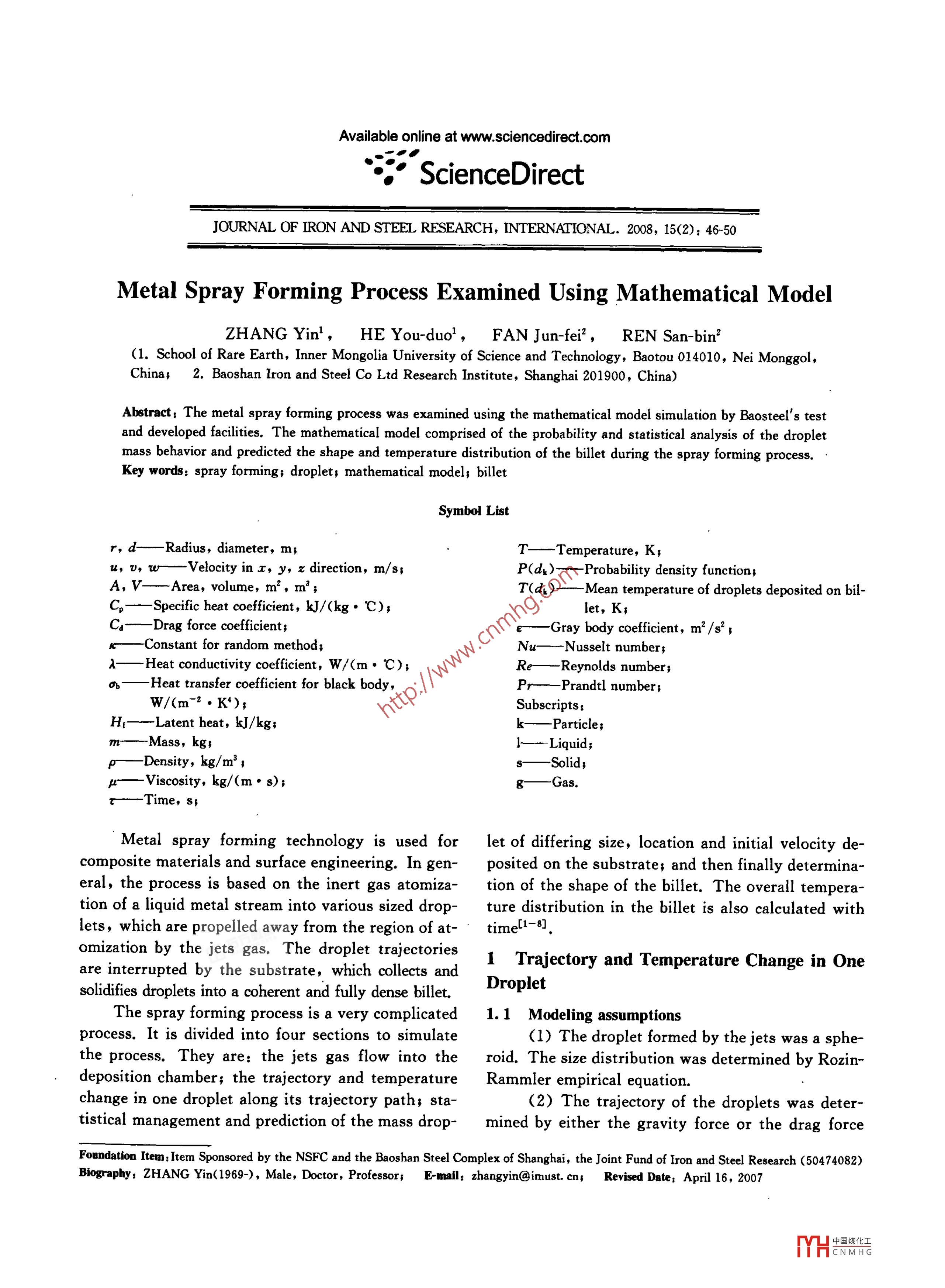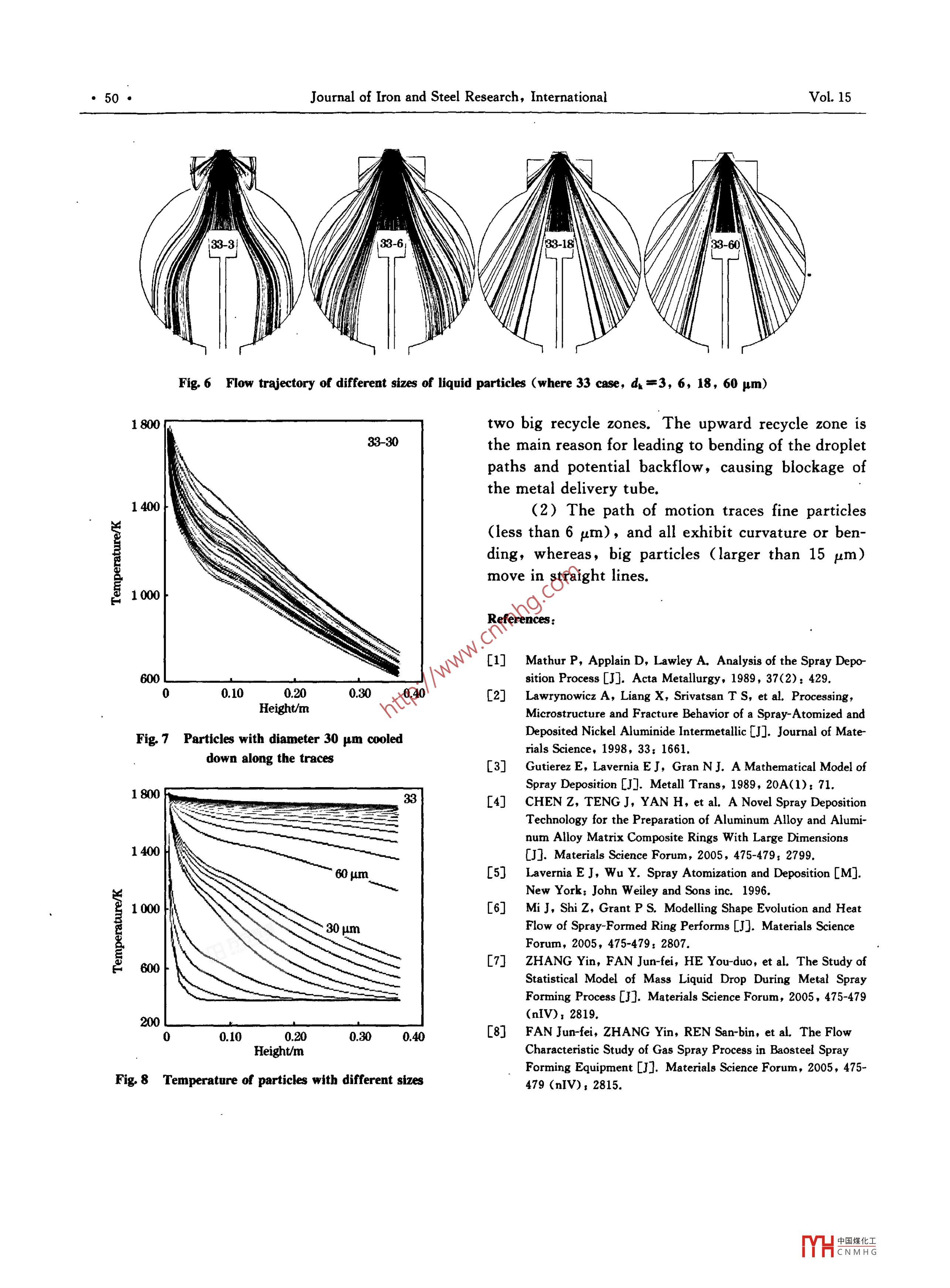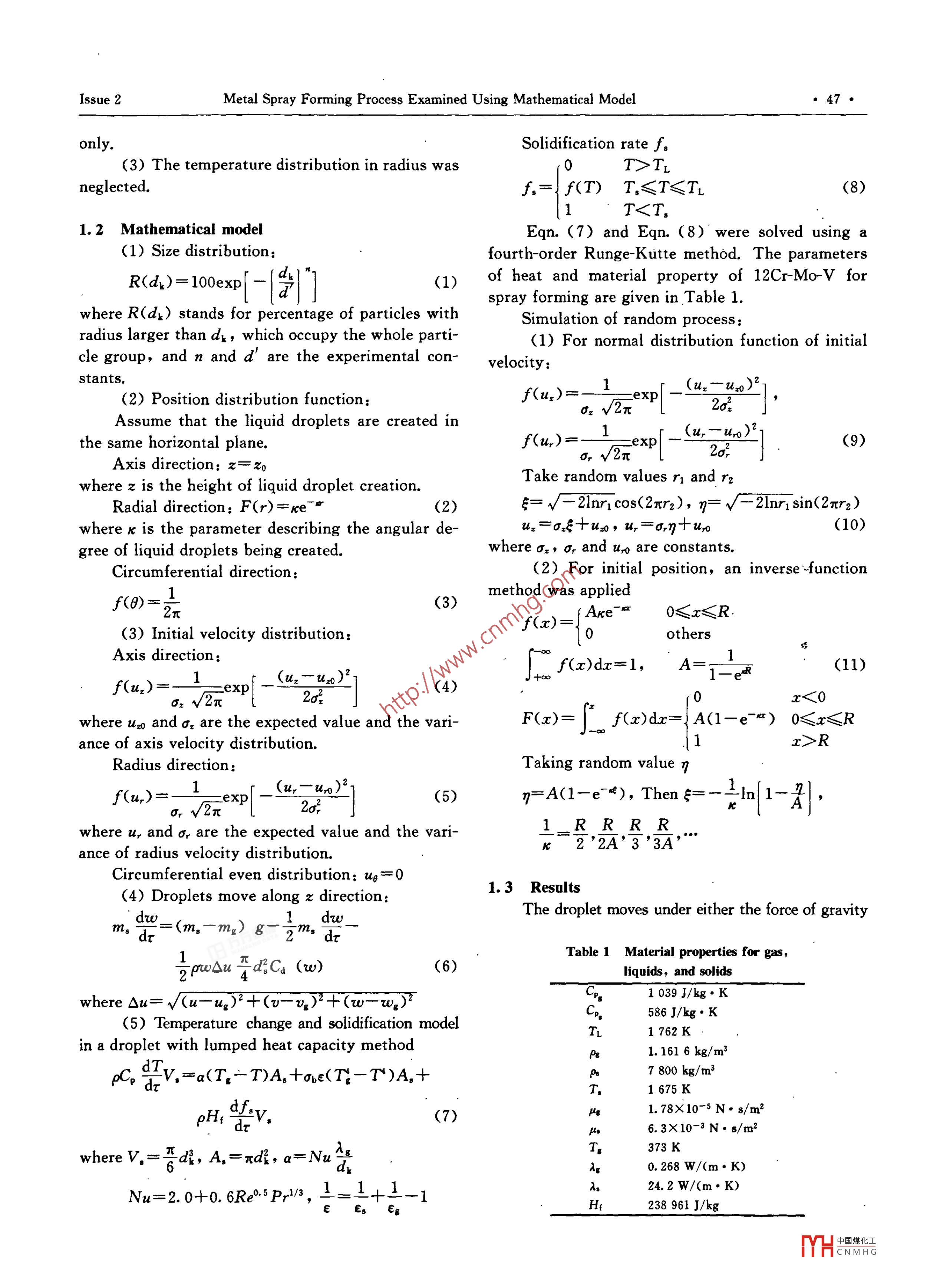 IssueMetal Spray Forming Process Examined Using Mathematical Modelonly.Solidification rate f。(3) The temperature distribution in radius was0T> TLneglected.,={ f(T) T,≤T≤Tr(8)1 T RRadius direction:Taking random value ηu,- uro)f(u,)=-'=exp(5)n=A(1-e~ *), Thenξ=-=In|1-4],2c1RRRRwhere u, and σr are the expected value and the vari-K 2'2A’3'3Aance of radius velocity distribution.Circumferential even distribution: ug=01.3 Results(4) Droplets move along z direction:The droplet moves under either the force of gravityn.9lτkτTable 1 Material properties for gas,(6)liquids, and solidsPg1 039 J/kg. Kwhere Su=v(u- -ug)*+(v- vg)"+(w- wg)2586 J/kg.K(5) Temperature change and solidification modelTl1762Kin a droplet with lumped heat capacity method1. 161 6 kg/m3pC。-V,=a(T。- T)A,+one(Ti- T")A, +7 800 kg/ m31675KpH; dfev,(7)1. 78X10-5 N. s/m2lr '6.3X10-3 N. s/m2373 Kwhere V,=≌di, A.=πdk, a= Nu 20.268 W/(m. K)24.2 W/(m. K)Nu=2.0+0.6Re:5sPr2/3, 2Hq_238 961 J/kgYHCNMHG●48●Journal of Iron and Steel Research, InternationalVol.15or the drag. In Fig. 1, the curves that represent theger than dk. For a given flow rate of molten steel,velocities of jets and droplets with different sizesthe number of droplets with different size can be cal-have an intersection point. This means the droplet isculated. Fig. 3 then shows the fraction of a differentaccelerated by the jets gas at the beginning. Aftersize of droplets present within the whole particleboth velocities of gas and droplet become equal, thegroup. The particle sizes from 30 μm to 150 μm re-velocity of the droplet is decreased with the dragpresent the main fractions, such that, the percent-force being dominant.age of particles with too large a size or too fine a sizeis very small. About 2. 5% of the total particles arewith a diameter of 30 μm. The particles smaller than30 μm are the dust created in the spray formingprocess.400,Gas2.3 Position distribution of droplets00On the basis of the function that provides the,30umposition distribution of the droplets, one can deter-00 tmine the data and spread of droplets created in dif-300 umferent locations. It is assumed that droplets are crea-00 Hted in the same plane and evenly distributed over the00.20.40.Fight distance/mFig 1 Velocity of jets and droplets2Statistical Model of Liquid Droplets andTheir MassIt is necessary to know the deposition velocityof atomized droplets, to model and adjust the shape5 0.2of the billet. The mass of liquid droplets depositingon the substrate has a great influence on the shapeand temperature distribution of the billet. In this).20.4 0.5study a statistical model for droplet mass is used toPellet diameter/mmpredict the results and behavior of a large quantity ofFig. 2 Size distribution of atomizing dropletsdroplets on the billet.2.2. 1 Determination of distribution functionThe size, location, and initial velocity of drop-lets created at random will be obtained through theRandom method. Using these results as initial val-1.ues, in conjunction with the motion of a droplet, themotion of mass droplets has been acquired. Afterstatistically analyzing all these results of motion andheat transfer by mass droplets, the initial conditionof droplets deposited on the substrate can be deter-mined.2.2 Size distribution of dropletsIn Fig. 2, the curve indicates the percentage ofparticles within the group in which the radius is lar-Fig3 Fraction of different size of dropletsY中國煤化