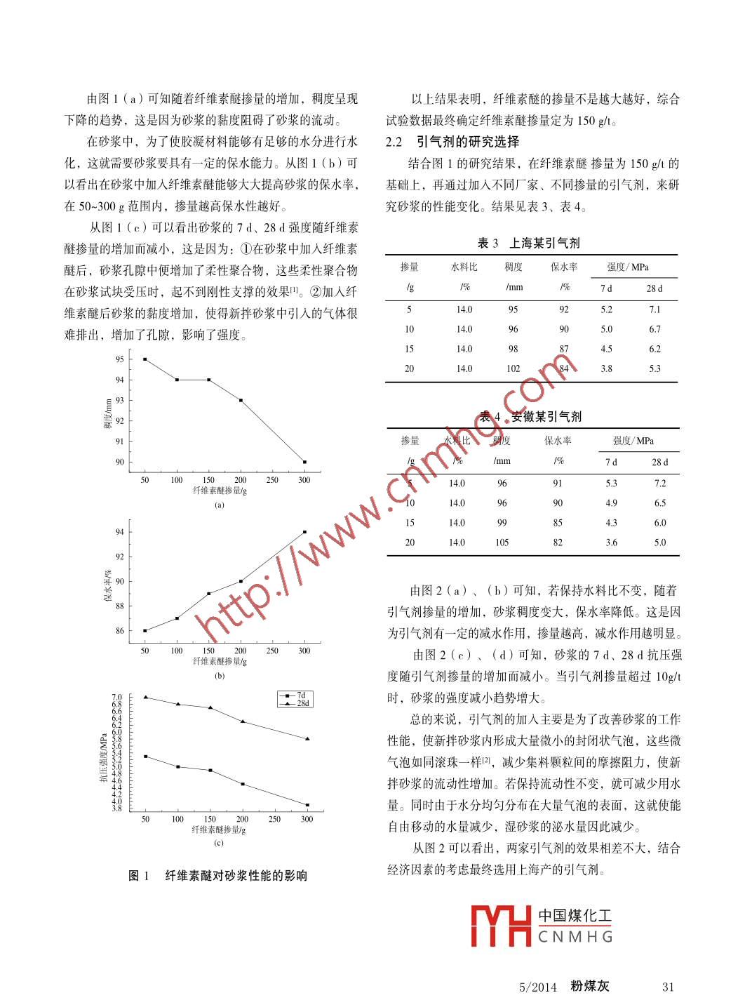文章編號: 1007-046X (2014) 05-0030-03生態(tài)建材一種新型干拌砂漿添加劑的研究Study of A New Additive for Dry-Mixed Mortar薛凱旋,王斌云,楊翔,楊國良,朱祥(鎮(zhèn)江建科建設(shè)科技有限公司,江蘇鎮(zhèn)江212000)摘要:通過對纖維素醚摻量和引氣劑不同摻量及不同品種的研究,確定砂漿添加劑的配比,并研究用此砂漿添加劑生產(chǎn)的兩種砂漿能否滿足砂漿性能的要求。結(jié)果表明:添加適量的纖維素醚能夠改善新拌砂漿的工作性能,但摻量過多會使新拌砂漿的流動性降低,抗壓強度明顯降低,摻量應(yīng)控制在150g/t左右;引氣劑有一定.的減水作用,也能改善砂漿的工作性能,但摻量過多,一樣會降低砂漿的抗壓強度,摻量應(yīng)控制在10g/t左右。關(guān)鍵詞:干拌砂漿;引氣劑;纖維素醚;砂漿添加劑中圖分類號: X701.3文獻標志碼: A0前言(2)粉煤灰:鎮(zhèn)江諫壁電廠生產(chǎn)的II級灰。(3)砂:普通中砂,表觀密度2 660kg/m, 細度模隨著國家四部二局《關(guān)于在部分城市限期禁止現(xiàn)場攪數(shù)2.6。拌砂漿工作的通知》,江蘇省經(jīng)貿(mào)委等委、廳、局《江蘇(4)添加劑:上海某市售引氣劑;市售纖維素醚。省預(yù)拌砂漿生產(chǎn)和使用管理辦法》等文件的發(fā)布,干拌砂1.2 試驗方法 .漿在我省得到了迅速的發(fā)展。根據(jù)JGJT 70- -2009 《建筑砂漿基本性能試驗方法標與傳統(tǒng)砂漿相比,干拌砂漿中的添加劑可以說是整個準 》所規(guī)定的試驗方法進行試件制備、養(yǎng)護和性能砂漿生產(chǎn)的核心技術(shù),添加劑的好壞幾乎決定了干拌砂漿測試。的質(zhì)量。現(xiàn)在市場上各種砂漿添加劑種類繁多,質(zhì)量參1.3 基礎(chǔ)配合比差不齊,這就造成了砂漿生產(chǎn)廠家選擇難的情況,從而影砂漿基礎(chǔ)配合比為公司生產(chǎn)普通砂漿配合比。響了砂漿生產(chǎn)質(zhì)量的控制。所以-.種能夠滿足普通砂漿要求的復(fù)合型添加劑急需面市。本文就以此為目的,配制出2試驗結(jié)果與討論專門用于普通砂漿的復(fù)合型添加劑1-2。2.1纖維素 醚摻量的選擇1原材料與試驗方法在基礎(chǔ)砂漿配合比的基礎(chǔ)上外摻不同量的纖維素醚,研究其對砂漿性能的影響。試驗結(jié)果見表2。1.1 原材料表2纖維素醚對砂漿性能的影響(1)水泥:鶴林水泥廠生產(chǎn)的42.5普通硅酸鹽水泥,摻量水料比調(diào)度 保水率強度/ MPa工作其物理力學(xué)性能指標見表1。/mm%7d 28d性能14.0)5,.3 7.0差表1水泥物理力學(xué)性能100.8一般抗壓強度/ MPa抗折強度/ MPa凝結(jié)時間/min安定細度標準稠度1504.0中國煤化工.7好項目3d 28d 3d 28d 初凝終凝 性1%用水量/%200MHCNM H G3略粘7.6 50s.5 8.8 211 356合格5.0 273000943.9 5.很粘30COALASH 5/2014由圖1(a)可知隨著纖維素醚摻量的增加,稠度呈現(xiàn)以上結(jié)果表明,纖維素醚的摻量不是越大越好,綜合下降的趨勢,這是因為砂漿的黏度阻礙了砂漿的流動。試驗數(shù)據(jù)最終確定纖維素醚摻量定為150 g/t。在砂漿中,為了使膠凝材料能夠有足夠的水分進行水2.2引氣劑的研究選擇化,這就需要砂漿要具有一定的保水能力。從圖1 (b)可結(jié)合圖1的研究結(jié)果,在纖維素醚摻量為150g/t 的以看出在砂漿中加入纖維素醚能夠大大提高砂漿的保水率,基礎(chǔ)上,再通過加入不同廠家、不同摻量的引氣劑,來研在50~300g范圍內(nèi),摻量越高保水性越好。究砂漿的性能變化。結(jié)果見表3、表4。從圖1 (c)可以看出砂漿的7d、28 d強度隨纖維素醚摻量的增加而減小,這是因為:①在砂漿中加人纖維素表3上海某引氣劑醚后,砂漿孔隙中便增加了柔性聚合物,這些柔性聚合物摻量水料比稠度保水率強度/MPa在砂漿試塊受壓時,起不到剛性支撐的效果。②加入纖g19/mm7d28 d維素醚后砂漿的黏度增加,使得新拌砂漿中引入的氣體很14.09:97.11014.0 .969(5.(難排出,增加了孔隙,影響了強度。14.4.6.2203.8.3表4安徽某引氣劑9190一%1%7.50 100 150 200 250 3004.0纖維索醚摻量/g(a;6.996.0)4 t92上遂由圖2(a)、(b) 可知,若保持水料比不變,隨著引氣劑摻量的增加,砂漿稠度變大,保水率降低。這是因86-為引氣劑有一定的減水作用,摻量越高,減水作用越明顯。0 100 150 200 250 300由圖2 (c)、(d)可知,砂漿的7d、28d抗壓強纖維素醚摻量/g(b度隨引氣劑摻量的增加而減小。當(dāng)引氣劑摻量超過10g/t匡邵時,砂漿的強度減小趨勢增大??偟膩碚f,引氣劑的加入主要是為了改善砂漿的工作性能,使新拌砂漿內(nèi)形成大量微小的封閉狀氣泡,這些微氣泡如同滾珠-樣[2, 減少集料顆粒間的摩擦阻力,使新拌砂漿的流動性增加。若保持流動性不變,就可減少用水量。同時由于水分均勻分布在大量氣泡的表面,這就使能) 100 150 200 250 300纖維索醚摻量g自由移動的水量減少,濕砂漿的泌水量因此減少。(c;從圖2可以看出,兩家引氣劑的效果相差不大,結(jié)合圖1纖維素醚對砂漿性能的影響經(jīng)濟因素的考慮最終選用上海產(chǎn)的引氣劑。中國煤化工MHCNMH G5/2014粉煤灰3106 f匡期砂漿,容易產(chǎn)生質(zhì)量問題,因此將纖維素醚、引氣劑和05上粉煤灰按比例配置成復(fù)合型的砂漿添加劑,來取代原砂漿04 E02配比中的-部分粉煤灰,能夠很好地減小這一誤差,解決這個問題。砂漿添加劑JNS-I的配比見表5。99E97E表5砂漿添加劑配比.46810121416182022纖維素醚/ kg引氣劑/ kg粉煤灰/ kg引氣劑摻量/g1584a)用JNS-I添加劑取代10 kg的粉煤灰,生產(chǎn)的砌筑和)2 