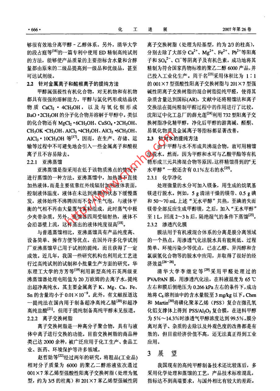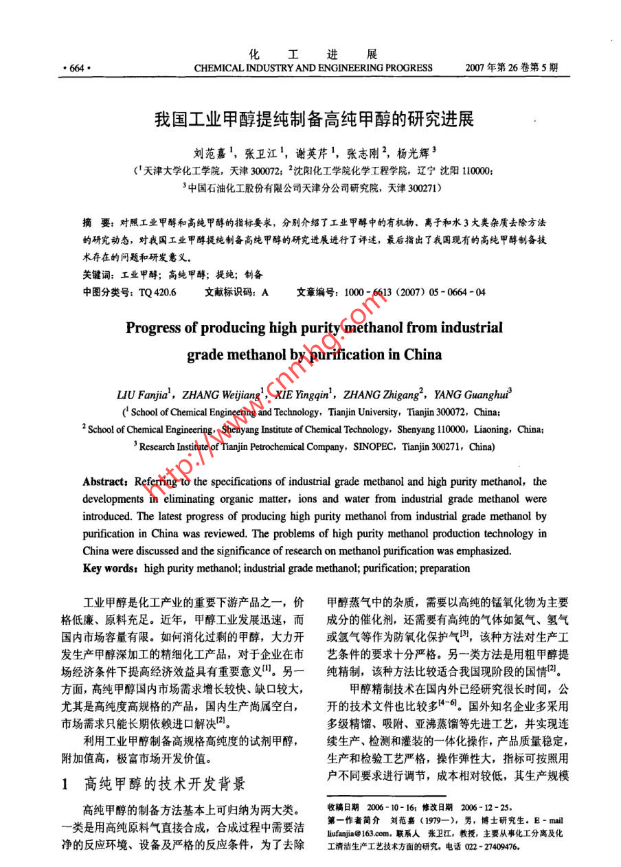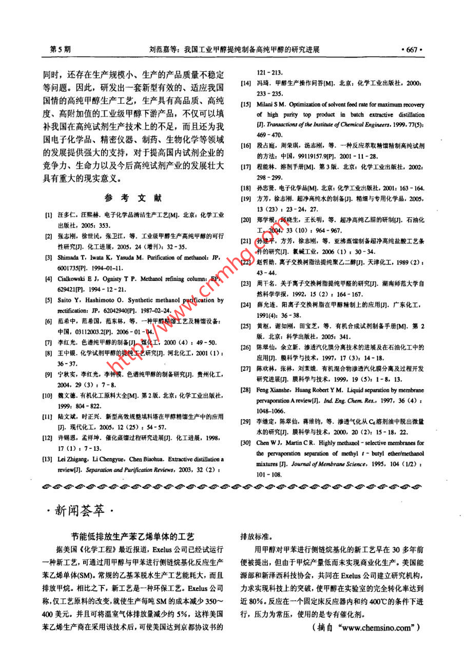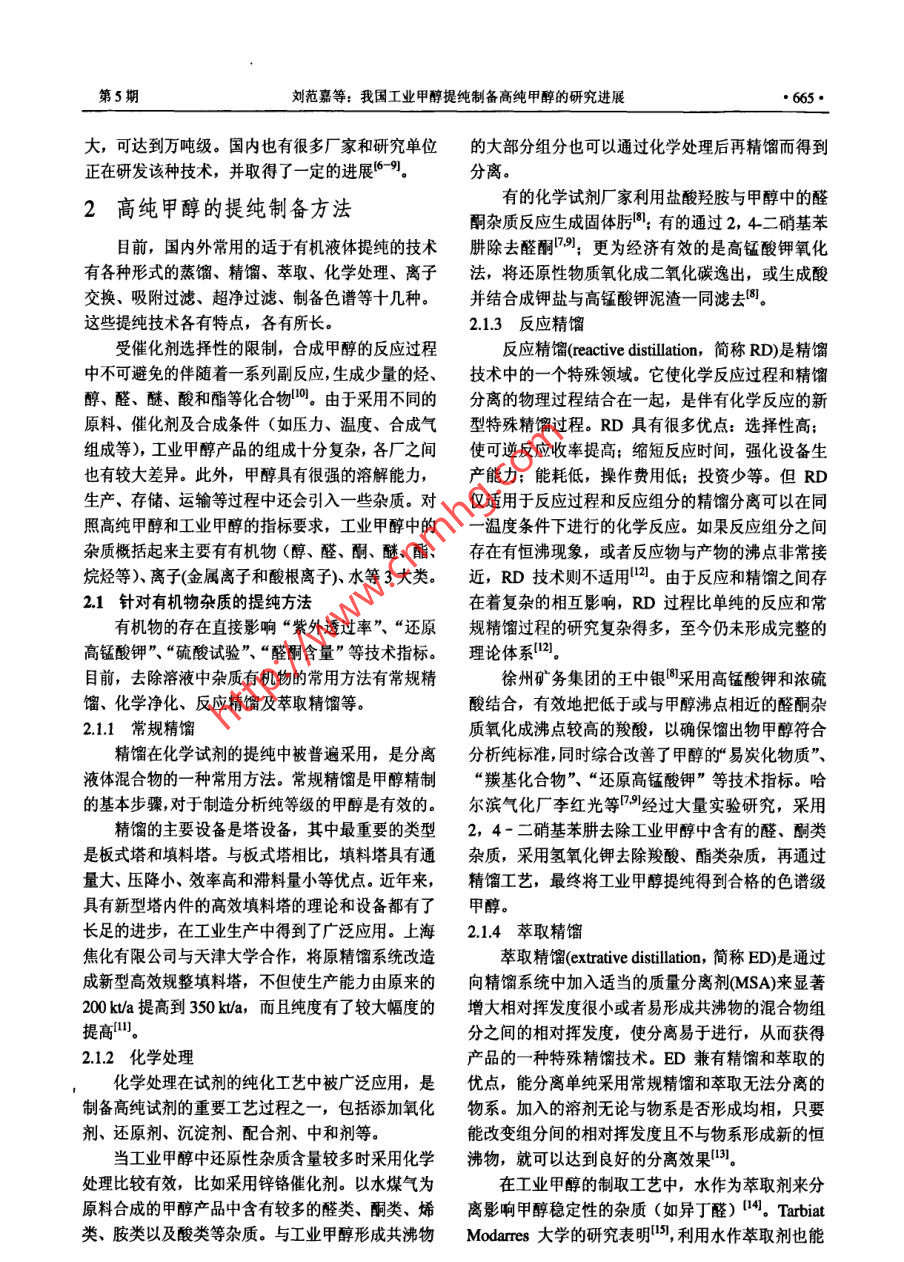 化進(jìn)展●664●CHEMICAL INDUSTRY AND ENGINEERING PROGRESS2007年第26卷第5期我國工業(yè)甲醇提純制備高純甲醇的研究進(jìn)展劉范嘉',張衛(wèi)江',謝英芹',張志剛”,楊光輝3(天津大學(xué)化工學(xué)院,天津300072; 2沈陽化工學(xué)院化學(xué)工程學(xué)院,遼寧沈陽10000;3中國石油化工股份有限公司天津分公司研究院,天津300271)摘要:對照工業(yè)甲醇和高純甲醇的指標(biāo)要求,分別介紹了工業(yè)甲醇中的有機(jī)物、離子和水3大類雜質(zhì)去除方法的研究動態(tài),對我國工業(yè)甲醇提純制備高純甲醇的研究進(jìn)展進(jìn)行了評述,最后指出了我國現(xiàn)有的高純甲醇制備技術(shù)存在的問題和研發(fā)意義。關(guān)鍵詞:工業(yè)甲醇;高純甲醇;提純;制備中圖分類號: TQ 420.6文獻(xiàn)標(biāo)識碼: A文章編號: 1000- 6613 (2007) 05 - 0664 -04Progress of producing high purity methanol from industrialgrade methanol by purification in ChinaLIU Fanjia',ZHANG Weijiang',XIE Yingqin',ZHANG Zhigang',YANG Guanghui'( School of Chemical Engineering and Technology, Tianjin University, Tianjin 300072, China;2 School of Chemical Engineering, Shenyang Institute of Chemical Technology, Shenyang 10000 Liaoning, China;3 Research Institute of Tanjin Petrochemical Company, SINOPEC, Tianjin 300271, China)Abstract: Referring to the specifications of industrial grade methanol and high purity methanol, thedevelopments in eliminating organic matter, ions and water from industrial grade methanol wereintroduced. The latest progress of producing high purity methanol from industrial grade methanol bypurification in China was reviewed. The problems of high purity methanol production technology inChina were discussed and the significance of research on methanol purification was emphasized.Key wordst high purity methanol; industrial grade methanol; purification; preparation工業(yè)甲醇是化工產(chǎn)業(yè)的重要下游產(chǎn)品之- ,價(jià)甲醇蒸氣中的雜質(zhì),需要以高純的錳氧化物為主要格低廉、原料充足。近年,甲醇工業(yè)發(fā)展迅速,而成分的催化劑,還需要有高純的氣體如氮?dú)?、氫氣國?nèi)市場容量有限。如何消化過剩的甲醇,大力開或氬氣等作為防氧化保護(hù)氣引,該種方法對生產(chǎn)工發(fā)生產(chǎn)甲醇深加工的精細(xì)化工產(chǎn)品,對于企業(yè)在市藝條件的要求十分嚴(yán)格。另一類方法是用粗甲醇提場經(jīng)濟(jì)條件下提高經(jīng)濟(jì)效益具有重要意義”。另一純精制, 該種方法比較適合我國現(xiàn)階段的國情[。方面,高純甲醇國內(nèi)市場需求增長較快、缺口較大,甲醇精制技術(shù)在國內(nèi)外已經(jīng)研究很長時間,公尤其是高純度高規(guī)格的產(chǎn)品,國內(nèi)生產(chǎn)尚屬空白,開的技術(shù)文件也比較多14-6。國外知名企業(yè)多采用市場需求只能長期依賴進(jìn)口解決叫。多級精餾、吸附、亞沸蒸餾等先進(jìn)工藝,并實(shí)現(xiàn)連利用工業(yè)甲醇制備高規(guī)格高純度的試劑甲醇,續(xù)生產(chǎn)、檢測和灌裝的一-體化操作,產(chǎn)品質(zhì)量穩(wěn)定,附加值高,極富市場開發(fā)價(jià)值。生產(chǎn)和檢驗(yàn)工藝嚴(yán)格,操作彈性大,指標(biāo)可按照用戶不同要求進(jìn)行調(diào)節(jié),成本相對較低,其生產(chǎn)規(guī)模1高純甲醇的技術(shù)開發(fā)背景高純甲醇的制備方法基本上可歸納為兩大類。收稿日期2006-10-16; 修改日期2006-12 -25. .一類是用高純原料氣直接合成,合成過程中需要潔第一作者簡介劉范嘉 (1979- -),男,博士研究生。E- mailluanja@163.com.聯(lián)系人張衛(wèi)江, 教授,主要從事化工分離及化凈的反應(yīng)環(huán)境、設(shè)備及嚴(yán)格的反應(yīng)條件,為了去除工清潔生產(chǎn)工藝技術(shù)方面的研究。電話022 - 27409476。第5期劉范嘉等:我國工業(yè)甲醇提純制備高純甲醇的研究進(jìn)展●665.大,可達(dá)到萬噸級。國內(nèi)也有很多廠家和研究單位的大部分組分也可以通過化學(xué)處理后再精餾而得到正在研發(fā)該種技術(shù),并取得了一定的進(jìn)展(6-9。分離。有的化學(xué)試劑廠家利用鹽酸羥胺與甲醇中的醛2高純甲醇的提純制備方法酮雜質(zhì)反應(yīng)生成固體肟8);有的通過2, 4二硝基苯目前,國內(nèi)外常用的適于有機(jī)液體提純的技術(shù)肼除去醛酮179];更為經(jīng)濟(jì)有效的是高錳酸鉀氧化有各種形式的蒸餾、精餾、萃取、化學(xué)處理、離子法,將還原性物質(zhì)氧化成二氧化碳逸出,或生成酸交換、吸附過濾、超凈過濾、制備色譜等十幾種。并結(jié)合成鉀鹽與高錳酸鉀泥渣-同濾去8]。這些提純技術(shù)各有特點(diǎn),各有所長。2.1.3反應(yīng)精餾受催化劑選擇性的限制,合成甲醇的反應(yīng)過程反應(yīng)精餾(reactive dilltion,簡稱RD)是精餾中不可避免的伴隨著一系列副反應(yīng), 生成少量的烴、技術(shù)中的一個特殊領(lǐng)域。它使化學(xué)反應(yīng)過程和精餾醇、醛、醚、酸和酯等化合物10]。由于采用不同的分離的物理過程結(jié)合在一起,是伴有化學(xué)反應(yīng)的新原料、催化劑及合成條件(如壓力、溫度、合成氣型特殊精餾過程。RD具有很多優(yōu)點(diǎn):選擇性高;組成等),工業(yè)甲醇產(chǎn)品的組成十分復(fù)雜,各廠之間使可逆反應(yīng)收率提高;縮短反應(yīng)時間,強(qiáng)化設(shè)備生也有較大差異。此外,甲醇具有很強(qiáng)的溶解能力,產(chǎn)能力;能耗低,操作費(fèi