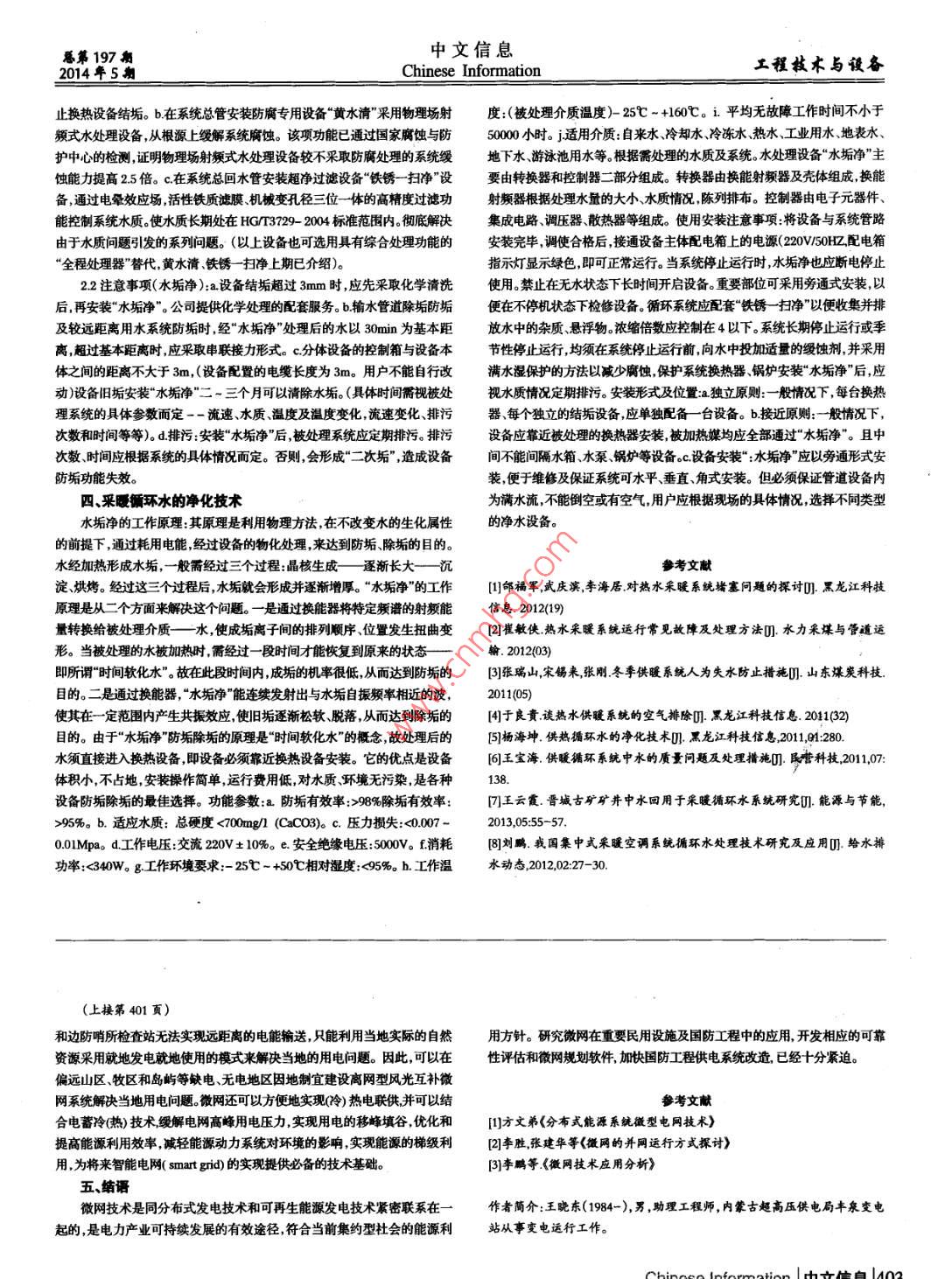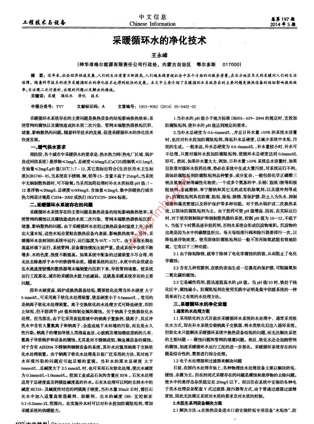 中文信息工程枚術(shù)與設(shè)備幕第197Chinese Information5潮2014年5采暖循環(huán)水的凈化技術(shù)王永峰(神華準(zhǔn)格爾能源有限責(zé)任公司行政處,內(nèi)蒙古自治區(qū)鄂爾多斯017000摘要:近年來,社會(huì)經(jīng)濟(jì)快速發(fā)展,人們的生活質(zhì)量不斷提高,人們?cè)絹碓街匾暽鐣?huì)中各個(gè)方面的而服務(wù)質(zhì)量。在北方地區(qū)冬天的采暖對(duì)人們的生活保障。隨著科學(xué)技術(shù)的進(jìn)步釆暖循環(huán)水的凈化技術(shù)也得到較快的發(fā)展。本文中主要介紹了釆暖循環(huán)水系統(tǒng)存在的主要問題是換熱設(shè)備的結(jié)垢影響換熱效率;當(dāng)出現(xiàn)二次污染時(shí),出現(xiàn)的問題以及解決的措施關(guān)鍵詞:采暖循環(huán)水凈化技術(shù)中圖分類號(hào):TV7文獻(xiàn)標(biāo)識(shí)碼:A文章編號(hào):1003-9082(2014)05-0402-02采暖循環(huán)水系統(tǒng)存在的主要問題是換熱設(shè)備的結(jié)垢影響換熱效率;系1當(dāng)補(bǔ)水的pH值小于地方標(biāo)準(zhǔn)DBJo1-619-2004的規(guī)定時(shí),宜投加統(tǒng)管網(wǎng)的腐蝕以及腐蝕造成的水質(zhì)二次污染,管網(wǎng)末端散熱器鐵垢沉積、防腐阻垢劑使補(bǔ)水的pH值達(dá)到規(guī)定的要求堵塞影響散熱的問題。隨著科學(xué)技術(shù)的發(fā)展,促進(jìn)采暖循環(huán)水的凈化技術(shù)2當(dāng)補(bǔ)水總硬度為06-6 mmolL,并且日補(bǔ)水量10%的系統(tǒng)水容量快速發(fā)展。時(shí),也應(yīng)對(duì)補(bǔ)水投加防腐阻垢劑降低補(bǔ)水總硬度,以減少系統(tǒng)中水垢污氣供水要求泥的生成。一般來說,補(bǔ)水總硬度為06-6mmo/L,補(bǔ)水量較小時(shí),補(bǔ)水可現(xiàn)階段,各個(gè)城市中采暖供水的要求是:熱水熱力網(wǎng)(熱電廠區(qū)域鍋爐不處理,只需對(duì)循環(huán)水投加防腐阻垢劑使循環(huán)水總硬度達(dá)到06mmoL房或間供系統(tǒng))懸浮物≤5mg/L總硬度≤60mg/ LAco3溶解氧≤0lmg/L呵可。然面如果補(bǔ)水量太大,例如,日補(bǔ)水量>10%系統(tǒng)總水容量時(shí)如果含油量≤2mgpH值(2℃)7-12,其它指標(biāo)應(yīng)符合《生活飲用水衛(wèi)生標(biāo)僅依靠對(duì)循環(huán)水投藥處理勢(shì)必在系統(tǒng)中生成大量污泥對(duì)系統(tǒng)運(yùn)行不利。準(zhǔn)》GB5749-85,當(dāng)系統(tǒng)有不銹鋼銅鋁等¢-含量不高于25mg/;當(dāng)系統(tǒng)固體防腐阻垢劑防腐阻垢劑品種繁多,成分復(fù)雜,一般包括化學(xué)正磷酸中無鋼制散熱器時(shí)可不除氧;當(dāng)采用加藥處理時(shí)補(bǔ)水水質(zhì)標(biāo)準(zhǔn)pH值:7-鈉及氫氧化鈉等堿性化物質(zhì);個(gè)或多個(gè)氨基的中、長(zhǎng)鏈(脂族)胺等陽極12懸浮物≤20mgL總硬度≤600g含油量≤2mg幾L集中供暖執(zhí)行城市阻蝕劑;亞硫酸鈉、單寧酸鈉和其它無機(jī)或有機(jī)除氧劑以及緩沖劑等成熱力網(wǎng)設(shè)計(jì)規(guī)范CJ34-2002或執(zhí)行HG3729-2004標(biāo)準(zhǔn)分防腐阻垢劑具有防腐、阻垢除垢除銹、育保護(hù)膜防止人為失水、抑制二、采情環(huán)水系統(tǒng)存在的問題細(xì)菌和藻類繁殖以及停爐保護(hù)等多種功能。對(duì)于熱水鍋爐或二次換熱系暖循環(huán)水系統(tǒng)存在的主要問題是換熱設(shè)備的結(jié)垢影響換熟效率;系統(tǒng),以固體防腐阻垢劑為主。由于投藥可使pH值增高因而在實(shí)際運(yùn)行統(tǒng)管網(wǎng)的腐蝕以及腐蝕造成的水質(zhì)二次污染,管網(wǎng)末端散熱器鐵垢沉積、時(shí),對(duì)于使用鋼制鍋爐和鋼制散熱器的系統(tǒng)控制pH值為1012,不低于堵塞影響散熱的問題。由于采暖循環(huán)水在經(jīng)過換熱設(shè)備時(shí)溫度上升,會(huì)析9當(dāng)?shù)陀?時(shí)需迅速補(bǔ)投藥劑否則水系統(tǒng)會(huì)形成沉淀物堆積沉淀物的出大量水垢這些水垢會(huì)緊貼在換熱設(shè)備內(nèi)表面,影響換熱效率。另外,采出現(xiàn)是因?yàn)樗械奶妓猁}析出。每天每組排污閥和除污器要排污一次,以暖循環(huán)水在封閉的系統(tǒng)中運(yùn)行運(yùn)行溫度為9℃-75℃。由于系統(tǒng)長(zhǎng)期在降低懸浮物濃度。使用固體防腐阻垢劑后一般不用再除氧就能有效地防高溫環(huán)境下運(yùn)行,系統(tǒng)管網(wǎng)設(shè)備腐蝕情況比較嚴(yán)重。造成系統(tǒng)中雜質(zhì)不斷腐。它有以下三種功能:增多,水的色度、濁度不斷提高。如果系統(tǒng)中配備的過濾裝置不盡合理將21由于除垢除銹就等于除掉了電化學(xué)腐蝕的陰極,從而阻業(yè)了電化無法去除懸浮于水中的鐵銹等雜質(zhì)。隨著系統(tǒng)的運(yùn)行水質(zhì)中的雜質(zhì)就會(huì)學(xué)腐蝕;在水流速度較慢的散熱器等末端裝置內(nèi)沉積下來,導(dǎo)致管網(wǎng)堵塞。使系統(tǒng)22含有幾種育膜劑在鐵的表面生成一層黑亮的保護(hù)膜,可阻隔氧和運(yùn)行工況惡化,城市的采暖供水能力也減弱。這就是采暖系統(tǒng)存在的主要二氧化碳的腐蝕問題。23它是堿性藥劑能迅速提高水的pH值。當(dāng)pH值10時(shí)鐵處于鈍因補(bǔ)水硬度高,鍋爐或換熱器易結(jié)垢需要軟化處理當(dāng)補(bǔ)水硬度大于化區(qū)中腐蝕撖小。防腐阻垢劑在使用實(shí)踐中證明是集中供暖系統(tǒng)的一種mmo,可采用離子軟化水處理裝置,使總硬度小于06mmo。常用的簡(jiǎn)單而行之有效的水處理方法。是鈉