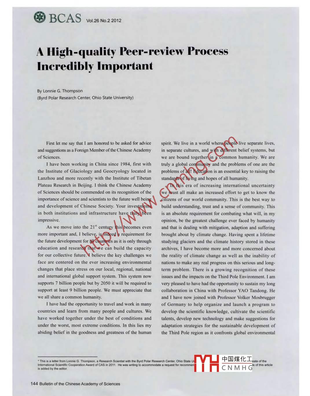 菌BCASVol.26 No.2 2012A High-quality Peer-review ProcessIncredibly ImportantBy Lonnie G. Thompson(Byrd Polar Research Center, Ohio State University)First let me say that I am honored to be asked for advicespirit. We live in a world where people live separate lives,and suggestions as a Foreign Member of the Chinese Academyin separate cultures, and with different belief systems, butof Sciences.we are bound together in a common humanity. We areI have been working in China since 1984, first withtruly a global community and the problems of one are thethe Institute of Glaciology and Geocryology located inproblems of all! Education is an essential key to raising theLanzhou and more recently with the Institute of Tibetanstandards of living and hopes of all humanity.Plateau Research in Bejjing. I think the Chinese AcademyIn this era of increasing international uncertaintyof Sciences should be commended on its recognition of thewe must all make an increased effort to get to know theimportance of science and scientists to the future well beingcitizens of our world community. This is the best way toand development of Chinese Society. Your investmentsbuild understanding, trust and a sense of community. Thisin both institutions and infrastructure have truly beenis an absolute requirement for combating what will, in myimpressive.opinion, be the greatest challenge ever faced by humanityAs we move into the 21# century this becomes evenand that is dealing with mitigation, adaption and sufferingmore important and, I believe, is indeed a requirement forbrought about by climate change. Having spent a lifetimethe future development for all countries as it is only throughstudying glaciers and the climate history stored in theseeducation and research that we can build the capacityarchives, I have become more and more concerned aboutfor our collective future. I believe the key challenges wethe reality of climate change as well as the inability offace are centered on the ever increasing environmentalnations to make any real progress on this serious and long-changes that place stress on our local, regional, nationalterm problem. There is a growing recognition of theseand international global support system. This system nowissues and the impacts on the Third Pole Environment. I amsupports 7 billion people but by 2050 it will be required tovery pleased to have had the opportunity to sustain my longsupport at least 9 billion people. We must appreciate thatcollaboration in China with Professor YAO Tandong. Hewe all share a common humanity.and I have now joined with Professor Volker MosbruggerI have had the opportunity to travel and work in manyof Germany to help organize and launch a program tocountries and learn from many people and cultures. Wedevelop the scientific knowledge, cultivate the scientifichave worked together under the best of conditions andtalents, develop new technology and make suggestions forunder the worst, most extreme conditions. In this lies myadaptation strategies for the sustainable development ofabiding belief in the goodness and greatness of the humanthe Third Pole region as it confronts global environmental. This is a ltter from Lonnie G. Thompson, a Research Scientist with the Byrd Polar Research Center, Ohio State中國(guó)煤化工。Iseanat Se entt Coperaton Award of CAS in 211 He was witing to acomna arequestor rmmfHCNMHGof this article144 Bulletin of the Chinese Academy of Sciences