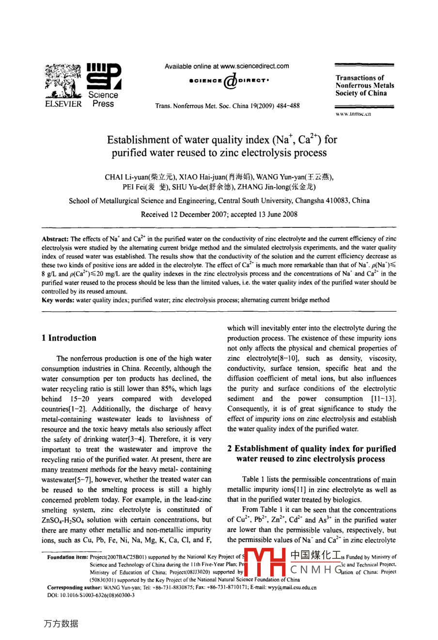 Available online at www.sciencedirect.com●GIENCEdoinet.Transactions ofNonferrous MetalsScienceSociety of ChinaELSEVIER PressTrans. Nonferrous Met. Soc. China 19(2009) 484-488w ww .nmsc.cnEstablishment of water quality index (Na, Ca2*) forpurified water reused to zinc electrolysis processCHAI Li-yuan(柴立元), XIAO Hai-juan(肖海娟), WANG Yun-yan(王云燕),PEI Fei(裴斐), SHU Yu-de(舒余德), ZHANG Jin-long(張金龍)School of Mtallurgical Science and Engineering. Central South University, Changsha 410083, ChinaReceived 12 December 2007; accepted 13 June 2008Abstract: The efects of Na* and Ca+ in the purified water on the conductivity of zinc electrolyte and the current eficiency of zincelectrolysis were studied by the alternating current bridge method and the simulated electrolysis experiments, and the water qualityindex of reused water was established. The results show that the conductivity of the solution and the current efficiency decrease asthese two kinds of positive ions are added in the electrolyte. The efect of Ca2* is much more remarkable than that of Na*. ρ(Na')≤8 g/L and p(Ca*)≤20 mg/L are the quality indexes in the zinc electrolysis process and the concentrations ofNa' and Ca2 in thepurified water reused to the process should be less than the limited values, i.e. the water quality index of the purified water should becontolled by its reused amount.Key words: water quality index; purified water; zinc electrolysis process; alternating current bridge methodwhich will inevitably enter into the electrolyte during the1 Introductionproduction process. The existence of these impurity ionsnot only affects the physical and chemical properties ofThe nonferrous production is one of the high waterinc electrolyte[8-10], such as density, viscosity,consumption industries in China. Recently, although theconductivity, surface tension, specific heat and thewater consumption per ton products has declined, thediffusion ceofficient of metal ions, but also influenceswater recycling ratio is still lower than 85%, which lagsthe purity and surface conditions of the electrolyticbehind 15- -20 years compared with developedsediment and the power consumption [11-13]. .countries[1-2]. Addionally, the discharge of heavyConsequently, it is of great significance to study themetal-containing wastewater leads to lavishness ofeffect of impurity ions on zinc electrolysis and establishresource and the toxic heavy metals also seriously afectthe water quality index of the purified water.the safety of drinking water(3- -4]. Therefore, it is veryimportant to treat the wastewater and improve the2 Establishment of quality index for purifiedreeycling ratio of the purified water. At present, there arewater reused to zinc electrolysis processmany treatment methods for the heavy metal- containingwastewater[5-7], however, whether the treated water canTable 1 lists the permissible concentrations of mainbe reused to the smelting process is still a highlymetallic impurity ions[11] in zinc electrolyte as well asconcerned problem today. For example, in the lead-zincthat in the purified water treated by biologics.smelting system, zinc electrolyte is constituted 0From Table 1 it can be seen that the concentrationsZnSO,-H2SO4 solution with certain concentrations, buofCu", Pb3*, Zn', Cd- and As+ in the purifed waterthere are many other metallic and non-metlic impurityare lower than the permissible values, respectively, butions, such as Cu, Pb, Fe, Ni, Na, Mg, K, Ca, CI, and F,the permissible values ofNa~ and Ca2- in zinc electrolyteFoundation item: Proce(2007BAC25B01) supported by the National Key Project of S中國(guó)煤化工s Funded by Minityor .Science and Tchnology of China during the lIh Five-Year Plan; Priic and Technical Project.Minisry of Education of China: Prie(08113020)1) supported by:YHC N M H Gaion of Chins: Pojet(50830301) supported by the Key Projeet of the National Natural Science Foundation of ChinaCorresponding author; WANG Yun-yan: Tel: +86-731-8830875; Fax: +86-731-8710171; E-mail: wyy@.mail.csu edu.cnDOl: 10.1016/S1003-6326(08)60300-3CHAI Li-yuan, et al/Trans. Nonferous Met. Soc. China 19(2009) 484-488485Table 1 Concentrations of main cations in zinc electrolyte and that in purified water treated by biologicsCu2+Cd2As3-Permissible concentraion in zinc electrolyte(mg:L) <0.2≤1.5≤0.24Average concentration in purified water treated by0.0720.150.0330.140.62~1.0058.70biologis/(mgLhave not been identified for lacking of detailedinvestigations. Additionally, according to Ref.[12], thepotential of such cations as Na*, Mg*, K' and Ca2* aremore negative than that of Zn2- and they will not deposit42on the cathode, but can absorb on the cathodic activepoint selectively as surfactants, resulting in thecrystallization overpotential to some extent and afectingthe surface properties. The hydrogen evolution andimpurity precipitation will also be accelerated, in the end,the current efficiency will decrease. Moreover, when thequantity of these impurities is too high, the viscosity andFig.1 Schematic diagram of experimental equipments foresistance of the electrolyte will increase, the diffusion ofZn2 will be obstructed, and then the power consumptionaltemating current bridge method: 1- -ZX3N4 AC resistancewill increase. Too high concentrations of Ca? and Mg2box; 2- ZX32 AC esistance box; 3- -SBQ6-ocilloscope;will easily from crystal and precipitate, which makes the4- -FMBa teaching denary capacitance boxes; 5- -Audio signalpipelines block and operation trouble[8 -9]. Therefore,generator, 6- Selfmade conductance poolNa' and Ca were chosen in this study as the mainresearch objectives and the establishment of the indexesofNa" and Ca'+ in purifed water were carried out.Lo古3 ExperimentalThe effects ofNa* and Ca2+ in the purified water onthe conductivity of zinc electrolyte were studied by thealtermating current bridge method[14] and the curentefficiency was determined by the simulated electrolysisexperiments to es