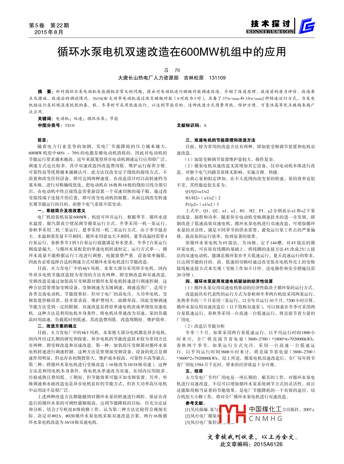 第5卷第22期技術探討2015年8月CONSTRUCTION后循環(huán)水泵電機雙速改造在600MW機組中的應用B陽大唐長山熱電廠人力資源部吉林松原 131109摘要: 針對循環(huán)水泵電動機電能損耗非常大的問題,提出對電動機進行磁極對數調速改造。介紹了改造原理、改造前的潛力評估、改造要點及措施、改造后的調試情況。3600kW 大功率電動機通過改變磁極對數(8對改為9對),具備了370/min和330/min2種轉速運行方式,當發(fā)電機組運行在環(huán)境溫度較低的春、秋、冬季時可采用低速運行,以達到節(jié)能目的。這種改造方式因費用低、維護方便、可靠性高等優(yōu)點被越來越廣泛應用。關鍵詞:電動機;雙速;循環(huán)水泵;節(jié)能中圖分類號: TE08文獻標識碼: A前言:三、雙速電機的節(jié)能原理和改造方法隨著電力行業(yè)競爭的加劇,發(fā)電廠節(jié)能降耗的壓力越來越大,目前,較為常用的改造方法有兩種,即加裝變頻調節(jié)裝置和電機雙600MW機組中60%~70%的電能是被電動機消耗的,因此對電動機的速改造節(jié)能運行要求越來越高。近年來鼠籠型異步電動機調速運行應用很廣泛,( 1 )加裝變頻調節(jié)裝置維護量較大,操作復雜。調速方式也比較多,其中雙速改造因改造費用低、維護運行保養(yǎng)方便、(2)循泵電機雙速改造無需增加其它設備,僅對電動機本體進行改可靠性高等優(yōu)勢越來越被認可。此方法僅改變定子繞組的接線方式,不造, 對整個電氣回路及泵體無影響,實施方便、快捷。添置和改變任何設備,即可達到兩種速度。在改造設計時以高轉速檔為由離心泵相似定律知,在不大范圍內改變泵的轉速,泵的效率近似基本極,進行對稱軸線優(yōu)化,把電動機在16極和18極的繞組引線全部引不變, 其性能近似關系為:出,在電動機中性點接線盒旁重新設置- - 個雙速切換的端子箱,通過改Q1/Q2=n1/n2變接線端子連接片的位置,即可改變電動機的極數,從而達到改變轉速H1/H2= (n1/n2 ) 2實現節(jié)能運行的目的,而整個電氣系統(tǒng)不需變動。P1/p2= (n1/n2)3-、系統(tǒng)簡介及技改意義上式中,Q1、Q. n1、n2、HI、H2、PI、p2分別表示n1和n2下泵電廠機組裝機容量600MW,機組可環(huán)并運行。根據季節(jié)、循環(huán)水進的流量、 揚程和功率。隨著異步電動機變極調速技術的進一步發(fā)展, 研水溫度、凝汽器真空情況調節(jié)循泵運行方式,冬季采用一機- -泵運行,制改進 了低速高效雙速電機,循環(huán)水泵電機進行雙速改造,可增加循環(huán)春秋季采用二機三泵運行,夏季采用一-機二泵運行方式。由于季節(jié)溫差水 量的靈活性,滿足不同季節(jié)的供水需要,避免運行泵工作點的嚴重偏大,水溫和蒸發(fā)量不盡相同,循環(huán)水用量也大不相同,夏季高溫時需要4移 ,提高泵的運行效率,收到顯著的效果。臺泵運行,春秋季節(jié)2到3臺泵運行就能滿足補水要求,冬季2臺泵運行原循環(huán)水泵電機為4Y接法,為16極,定子144槽,對4Y接法的循則流量偏大。與循環(huán)水泵配套的單速電機轉速恒定,運行方式單一,循環(huán)泵電機, 可在原有線圈的基礎上,將線圈的連接方法4Y改成2Y/△接環(huán)水流量不能根據運行工況進行調整,電能浪費嚴重、設備效率偏低,法的 雙速電動機,能滿足循環(huán)泵在冬天低速運行,夏天高速運行的要求,因此有必要選擇合適的調速方式對循環(huán)水泵電機進行節(jié)能改造。以達到節(jié)能的目的。高、低速的切換時通過改變裝在電機外殼上的變極目前,火力發(fā)電廠中的6kV風機、水泵大部分采用異步電機,國內接線 板連接方式來實現(變極工作如不計停、送電操作和安全措施僅需外異步電機節(jié)能改造較為常用的方法有兩種,即變頻改造和雙速改造。變頻改造是通過加裝高壓變頻器對循環(huán)水泵電機轉速進行調速控制。這四、循環(huán)水泵應用雙速電機驅動的經濟性估算種方法需要增加變頻設備,變頻調速為無級調速,調速范圍廣,適用于(1)循環(huán)水泵應用雙速電機驅動的經濟性取決于循環(huán)泵的運行方式。各類交流電動機,節(jié)能效果好。但對于電廠的高電壓、大功率電機,變改造前具有代表性的運行方式為春秋和冬季兩臺機組采用兩泵運行,頻裝置價格昂貴,技術要求高、維護費用大、故障率高,因此變頻調速炎 熱季節(jié)的三個月采用三泵運行,以全年共運行10個月, 7200小時計算,節(jié)能方法受到- -定的限制。 雙速改造是將原單速電機改成單繞組雙速電循環(huán)水 泵應用雙速改造后( 以下簡稱雙速泵),可以探索在冬季可采用兩機。這種方法是利用電機本身條件,將電機從單速改為雙速,泵的負載臺泵低速運行, 春秋季采用一臺高速一臺低速運行, 將直接節(jié)省大量的高時用高速,負載低時用低速,其改造費用低、改造周期短、維護簡單。廠 “用電。二、改造方案的確立(2)改造后節(jié)能分析目前,火力發(fā)電廠中的6kV風機、水泵絕大部分電機都是異步電機,冬季三個月,如果采用兩臺泵低速運行,以平均運行時間1800小國內外經過長期的研究和探索,異步電機的節(jié)能改造技術較為常用方法時來計, 全廠將直接節(jié)省電量( 38002700 ) *1800*4-920000kWh。有兩種,即變頻改造和雙速改造。第-一種: 加裝高壓變頻器對循環(huán)水泵春秋兩個季節(jié), 如果運行方式允許,采用一臺高速一臺低速運電機轉速進行調速控制。這種方