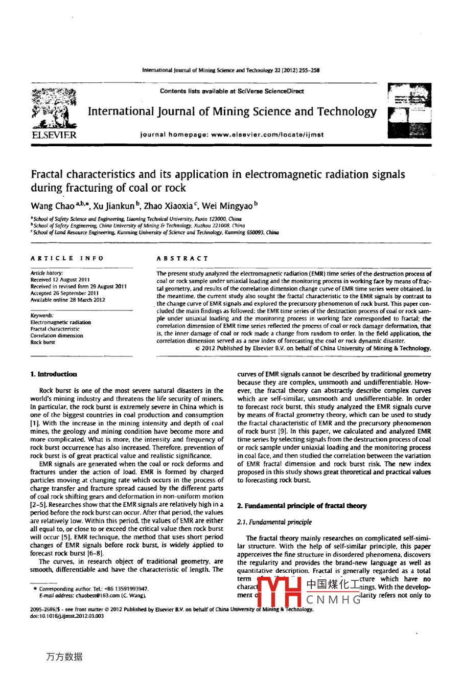 Intemational Joumal of Mining Science and Technoloyy 22(2012)255-258Contents lists available at SciVerse ScienceDirectInternational Journal of Mining Science and TechnoloELSEVIERjournalhomepagewww.elsevier.com/locate/ijmstfractal characteristics and its application in electromagnetic radiation signalsduring fracturing of coal or rockang Chao…*,Ⅺ u Jiankun,zhaoⅪ Xiaoxia, Wei mingyaoSchool of Safety Science and Engineeringg Technical University, Fuxin 123000, Chinahool of Safety Engineerng China University of Mining 8 Technolog. Xuzhou 221008, ChinaSchool of Land Resource Engineering Kunming University of Science and Technology. Kuning 650093, chinaARTICLE INFOABSTRACTThe present study analyzed the electromagnetic radiation(Emr)time series of the destructionofReceived 12 August 2011coal or rock sample under uniaxial loading and the monitoring process in working face by means of frac-Received in revised form 29 August 2011al geometry, and results of the correlation dimension change curve of EMR time series were obtained. InAvailable online 28 March 2012he meantime. the current study also sought the fractal charactenstic to the emr signals by contrast tothe change curve of EMR signals and explored the precursory phenomenon of rock burst. This paper con-cluded the main findings as followed: the EMR time series of the destruction process of coal or rock sarmetic radiationunder uniaxial loading and the monitorng process in working face corresponded to fractal; theactal characteristiccorrelation dimension of EMR time series reflected the process of coal or rock damage deforrelat ion dimensionis, the inner damage of coal or rock made a change from random to order In the field application, theRock burstorrelation dimrved as a new index of forecasting the coal or rock dynamic disaster.e 2012 Published by Elsevier B V. on behalf of China University of Mining Technologyof EMR signals cannot be described by traditional geometrye they are complex unsmooth and undifferentiable. How-Rock burst is one of the most severe natural disasters in thebeer usehe fractal theory can abstractly describe complex curvesworlds mining industry and threatens the life security of miners. which are self-similar, unsmooth and undifferentiable. In orderIn particular. the rock burst is extremely severe in China which is to forecast rock burst, this study analyzed the EMR signals curveone of the biggest countries in coal production and consumption by means of fractal geometry theory, which can be used to study1]. with the increase in the mining intensity and depth of coal the fractal characteristic of EMR and the precursory phenomenonmines, the geology and mining condition have become more and of rock burst (9 In this paper, we calculated and analyzed EMRmore complicated. what is more, the intensity and frequency of time series by selecting signals from the destruction process of coalrock burst occurrence has also increased. Therefore prevention of or rock sample under uniaxial loading and the monitorirock burst is of great practical value and realistic significance.in coal face. and then studied the correlation between thea EMR signals are generated when the coal or rock deforms and of EMR fractal dimension and rock burst risk thectures under the action of load, EMR is formed by charged proposed in this study shows great theoretical and practical valuesarticles moving at changing rate which occurs in the process of to forecasting rock burst.charge transfer and fracture spread caused by the different partsof coal rock shifting gears and deformation in non-uniform motion2-5]. Researches show that the EMR signals are relatively high in a 2. Fundamental principle of fractal theoryperiod before the rock burst can occur. After that period, the valuesare relatively low. Within this period, the values of EMR are either 2.1. Fundamental principleequal to, or close to or exceed the critical value then rock burstll occur 15). EMR technique, the method that uses short periodhanges of EMR signals before rock burst, is widely applied to lar structure. with the help of self-similar principle, this paperforecast rock burst [6-8apperceives the fine structure in disordered phenomena, discoversThe curves, in research object of traditional geometry, are the regularity and provides the brand- new language as well asmooth, differentiable and have the characteristic of length. The quantitative description. Fractal is generally regarded as a totaltermTe:+8613591993947chara中國煤化工 -nings with the develoCNMHG95-2686)s- see front matter e 2012 Published by Elsevier B V. on behalf of China University of Mining Technology.structure and shape, but also to information, function and time. the value of m increasing to certain degree the slope tendsThe self-similarity of statistical fractal is described in certain range stabilize. ie saturated, then the saturated slope is the correlationof scale which is named as non-scale range [91dimension D,, at this moment, the value of m is the smallestThe fractal characteristic of mechanical behavior is common in embedding dimension. The slope of line in the curve increases withnature. Some researches show that fractal characteristics exist from the addition of value m, not focusing on some certain value whichearths plates to grain failure[10]. The damage evolution process of shows that the time series is randomrock is also a kind of fractal while fractal dimension is a character-istic parameter reflecting the degree of damage to the rock [ll]. The 3. Fractal study of EMR experimentation during fracture of coalinteger dimension extending to fractional dimension in the fractalgeometry portrays the complexity of fractal set in the use of fractalor rockdimension and describes the fractal set quantitatively. the correla-ion dimension, which is measured from experimental data, is used 3. 1. Experimental methodto describe the fractal characteristic of meR time series andresearches on the evolution rule of coal o