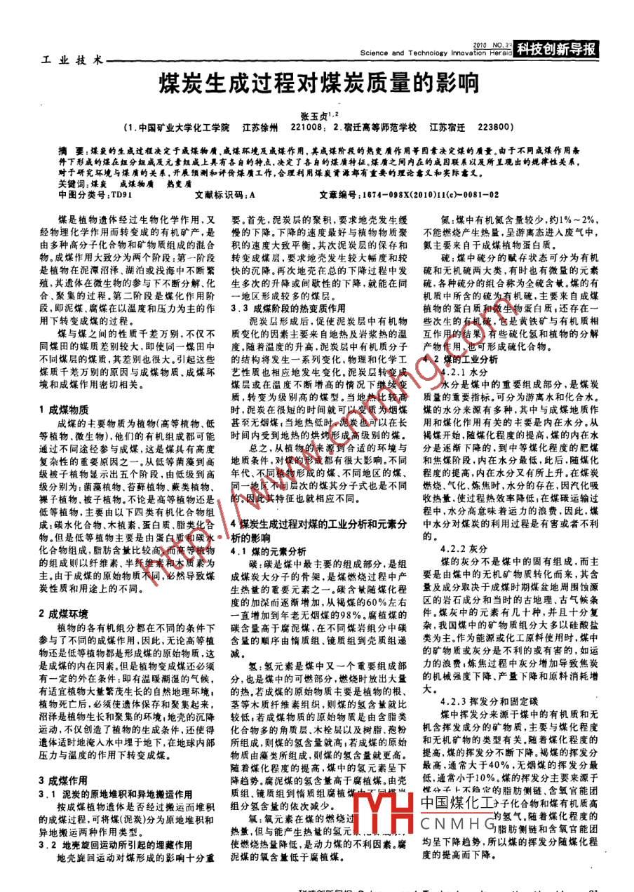 Science and T echnology InnovatR. O科技創(chuàng)新導報|工業(yè)技術(shù)煤炭生成過程對煤炭質(zhì)量的影響張玉貞1.2(1.中國礦業(yè)大學化工學院江蘇徐州 221008; 2.宿遷高等師范學校江蘇宿遷 223800)摘要:煤炭的生成過程決定于成煤物質(zhì).咸堞環(huán)境及威煤作用。其威煤階段的熱變質(zhì)作用等因素決定煤的質(zhì)量。由于不同成煤作用條件下形成的煤在組分朗威及元案組成上具有各自的特點,決定了各自的煤質(zhì)特征。堞質(zhì)之間內(nèi)在的成因聯(lián)系以及所呈現(xiàn)出的規(guī)律性關(guān)系,對于研究環(huán)境與堞質(zhì)的關(guān)系,開展預測和評價煤質(zhì)工作,合理利用煤炭資源都有重要的理論意義和實際需義。關(guān)鍵詞;煤炭威煤物贗中圖分類號:TD91來物質(zhì)文獻標識碼:A文章編號:1674-098%(2010)11(e)-0081-02煤是植物遺體經(jīng)過生物化學作用,又要.首先, 泥炭層的聚積,要求地殼發(fā)生緩氮:煤中有機氮含量較少,約1%~ 2%,經(jīng)物理化學作用而轉(zhuǎn)變成的有機礦產(chǎn),是慢的下降。 下降的速度最好與植物物質(zhì)聚不能燃燒產(chǎn)生熱量.呈游離態(tài)進入廢氣中,由多種高分子化合物和礦物質(zhì)組成的混合積的速 度大致平衡。其次泥炭層的保存和氮主要來自于成煤植物蛋白質(zhì)。物。成煤作用大致分為兩個階段:第一階段轉(zhuǎn)變成媒層,要求地殼發(fā)生 較大幅度和較硫:煤中硫分的賦存狀態(tài)可分為有機是植物在泥潭沼澤、湖泊或找海中不斷繁快的沉降。 再次地殼在總的下降過程中發(fā)硫和無機硫兩 大類,有時也有微量的元素殖,其遺體在微生物的參與下不斷分解、化生 多次的升降或間歇性的下降,就能在同硫, 各種硫分的組合稱為全硫含敏。煤的有合、聚集的過程.第二階段是煤化作用階- 地區(qū)形成較多的煤層。機質(zhì)中所含的硫為有機碗,主要來自成煤段,即泥煤.腐煤在以溫度和壓力為主的作3.3成煤階段的熱變質(zhì)作用植物的蛋白質(zhì)和微生物蛋白質(zhì);還存在一用下轉(zhuǎn)變成煤的過程。泥炭層形成后,促使泥炭層中有機物些次生的有機硫, 它是黃鐵礦與有機質(zhì)相.煤與煤之間的性質(zhì)千差萬別,不僅不質(zhì)變化的因素主要來 自地熱及巖漿熱的溫互作 用的結(jié)果,有些硫化氫和植物的分解同煤田的媒質(zhì)差別較大,即使同一煤田中度.隨 若溫度的升高.泥炭層中有機質(zhì)分子產(chǎn)物作用,也可形成硫化合物。不同煤層的煤質(zhì),其差別也很大.引起這些的結(jié)構(gòu)將發(fā)生 - -系列變化,物理和化學工4.2煤的工業(yè)分析煤質(zhì)千差萬別的原因與成煤物質(zhì)、成煤環(huán)藝性 質(zhì)也相應地發(fā)生變化。泥炭層轉(zhuǎn)變成4.2.1水分境和成煤作用密切相關(guān)。煤層或在溫度不斷增高的情況下繼續(xù)變水分是煤中的重要組成部分,是煤炭質(zhì),轉(zhuǎn)變?yōu)榧墑e高的煤型。當?shù)責岜容^高質(zhì)量的重要指標??煞譃橛坞x水和化合水。1成煤物質(zhì)時,泥炭在很短的時間就可以變質(zhì)為煙煤煤的水分來源有多種,其中與成煤地質(zhì)作成煤的主要物質(zhì)為植物(高等植物、低甚 至無煙煤,當?shù)責岬蜁r,泥炭也可以在長用和煤化作用有關(guān)的主要是內(nèi)在水分。從等植物.微生物),他們的有機組成都可能時 間內(nèi)受到地熱的烘烤形成高級別的煤。褐媒開始 ,隨煤化程度的提高,煤的內(nèi)在水通過不同途徑參與成煤,這是煤具有高度總之,從植物的來源到合適的環(huán)境與分是逐漸 下降的,到中等煤化程度的肥煤復雜性的重要原因之一.從低等蘭藻到高地 質(zhì)條件,對煤的形成都有很大影響。不同和焦煤階段,內(nèi)在水分最低,此后,隨煤化級被子植物顯示出五個階段,由低級到高年 代、不同植物形成的煤.不同地區(qū)的煤、程度的提高,內(nèi)在水分又有所上升。在煤炭級分別為:菌藻植物、苔蘚植物、蕨類植物、同一地區(qū)不同 層次的煤其分子式也是不同燃燒 .氣化、煉焦時,水分的存在,因汽化吸裸子植物、被子植物。不論是高等植物還是的。 因此其特征也就相應不同。收熱量,使過程熱效率降低I在煤碳運輸過低等植物,主要由以下四類有機化合物組程中,水分高意味著運力的浪費,因此,煤成:碳水化合物、木植素.蛋白質(zhì).脂類化合4 煤炭生成過程對煤的工業(yè)分析和元素分中水分對煤炭的利用過程是有軎或者不利物。但是低等植物主要是由蛋白質(zhì)和碳水析的影響化合物組成,脂肪含量比較高,而高等植物4.1 煤的元素分析:4.2.2灰分的組成則以纖維素、半纖維索和木質(zhì)素為碳:碳是煤中最去要的組成部分,是組煤的灰分不是煤中的固有組成,而主主。由于成煤的原始物質(zhì)不同,必然導致煤成煤炭大分子的骨架, 是煤燃燒過程中產(chǎn)要是由煤中的無機礦物質(zhì)轉(zhuǎn)化而來,其含炭性質(zhì)和用途上的不同。生熱量的重要元素之一。碳含斌隨煤化程量及成分取決于成煤時期煤盆地周圍蝕源度的加深而逐漸增加,從褐煤的60%左右區(qū)的巖石成分 和當時的古地理、古氣候條2成煤環(huán)境一直增加到年老無煙煤的98%。腐植煤的件。煤灰中的元素有幾十種,并且十分復植物的各有機組分都在不同的條件下碳含量高于腐泥煤 .在不同煤巖組分中碳雜,我國煤中的礦物質(zhì)組分大多以硅酸鹽參與了不同的