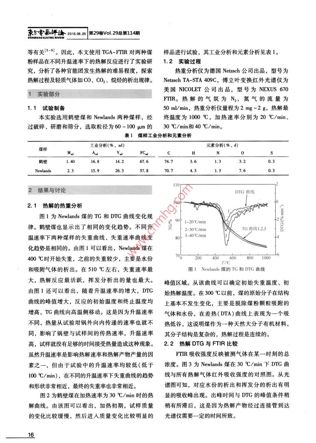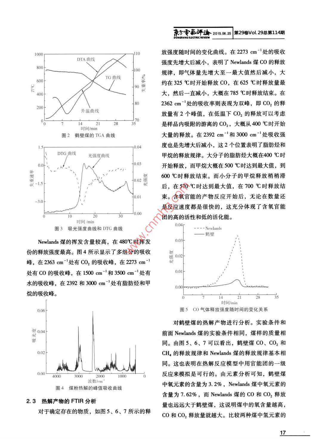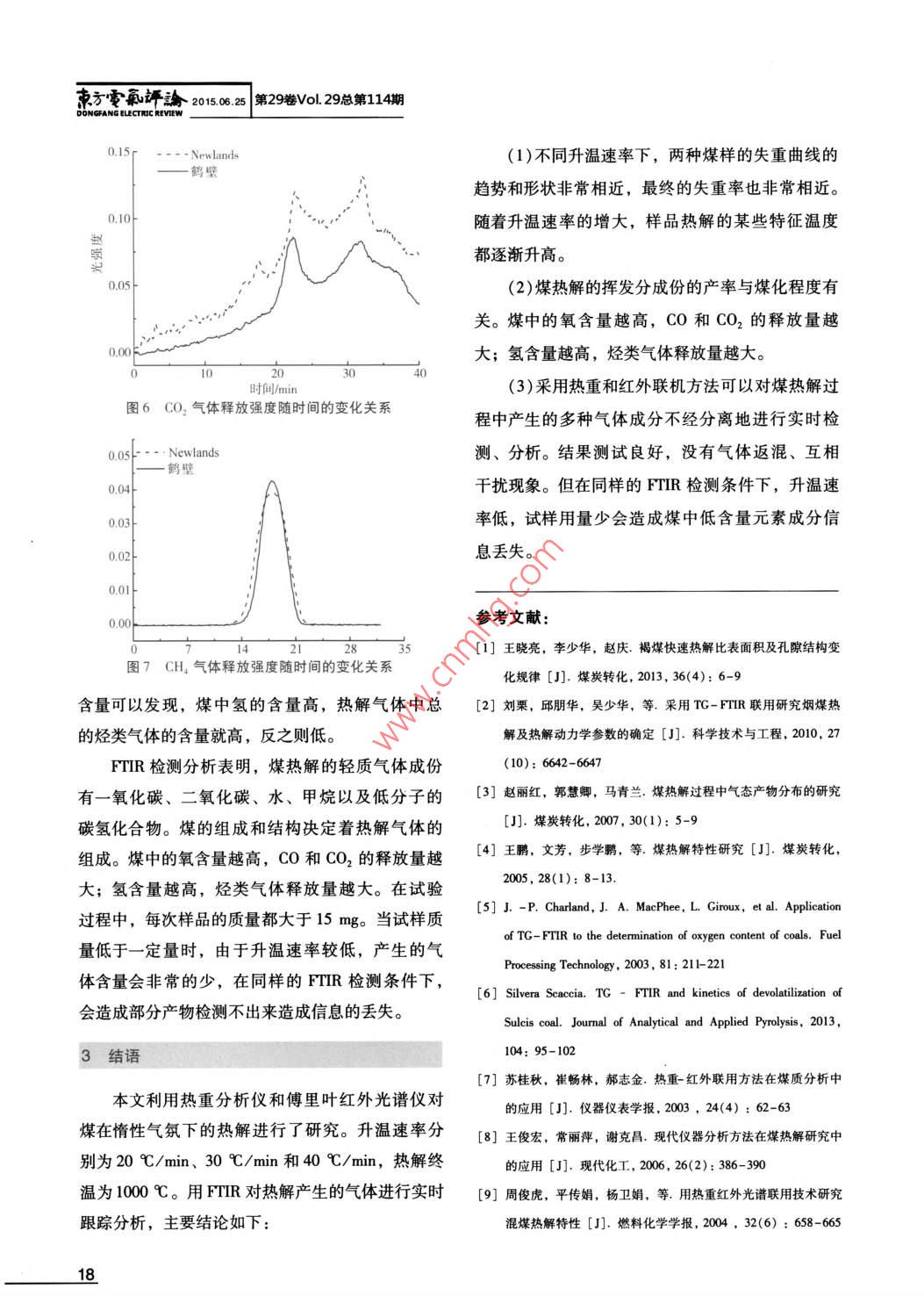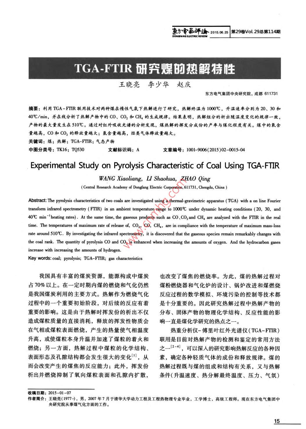 金證2x102卷023總第14TGA-FTIR研究的熱解特性王曉亮李少華趙慶東方電氣集團(tuán)中央研究院,成都611731摘要:利用TGA-FTR聯(lián)用技術(shù)對兩種煤在惰性氣氛下熱解進(jìn)行了研究,熱解終溫為1000℃C,升溫速率分別為20、30和40℃/min,并在線分析了熱解產(chǎn)物中的CO、CO2和CH4的生成規(guī)律。結(jié)果表明,熱解組分的析出隨溫度變化的規(guī)律一致產(chǎn)物的最大量發(fā)生在510℃。通過對紅外吸收光譜的分析發(fā)現(xiàn),煤熱解的揮發(fā)分成份的產(chǎn)率與煤化程度有關(guān)。煤中的氧含量越高,CO和CO2的釋放量越大;氨含量越高,烴類氣體釋放量越大。關(guān)鍵詞:煤;熱解;TGA-FTIR;氣態(tài)產(chǎn)物中圖分類號:TK6;TQ530文獻(xiàn)標(biāo)識碼:A文章編號:1001-9006(2015)02-001504Experimental Study on Pyrolysis Characteristic of Coal Using TGA-FTIRWANG Xiaoliang, LI Shaohua, ZHAO QingCentral Research Academy of Dongfang Electric Corporation, 611731, Chengdu, ChinaAbstract: The pyrolysis characteristics of two coals are investigated using a thermal-gravimetric apparatus(TGA)with a on line Fouriertransform infrared spectrometry FTIR)in an ambient temperature range to 1000C under dynamic heating conditions(20, 30, and40C min"heating rates). At the same time, the gaseous products such as co, CO2 and CH, are analyzed with the FTIR in the reatime. The temperatures of maximum rate of release of, CO2, CO, CHa, are in compliance with the temperature of maximum mass-lossrate around 510C. By investigating the infrared spectrometry, it is discovered that the gaseous species remain remarkably changes withthe coal rank. The quantity of pyrolysis CO and CO2 is enhanced when increasing the amounts of oxygen. and the hydrocarbon gasesKey words: coal; pyrolysis; TGA-FTIR; gas characteristics我國具有豐富的煤炭資源,能源構(gòu)成中煤炭也改變了煤焦的燃燒率。為此,煤的熱解過程對占加0%以上。在一定時期內(nèi)煤的燃燒和氣化仍然煤粉燃燒器和氣化爐的設(shè)計、鍋爐改進(jìn)和煤燃燒是我國煤炭利用的主要方式。熱解作為燃燒氣化反應(yīng)過程的數(shù)學(xué)模擬、環(huán)境污染的控制等技術(shù)都過程中的一個重要初始階段,對后續(xù)的反應(yīng)有著是十分重要的。因此研究熱解過程中熱解產(chǎn)物的重要的影響。這是由于熱解時揮發(fā)份的析出不僅分布、固體產(chǎn)物的物理化學(xué)結(jié)構(gòu)、反應(yīng)性能的影造成煤粒質(zhì)量的直接消耗,釋放的揮發(fā)性物質(zhì)會響一直是煤化學(xué)研究的熱點(diǎn)之在氣相或煤粒表面燃燒,產(chǎn)生的熱量使氣相溫度熱重分析儀-傅里葉紅外光譜儀(TGA-FTIR)升高,或使煤粒本身升溫并加速了煤粒的著火和聯(lián)用是目前對熱解產(chǎn)物的檢測和鑒定的常用方法燃燒;另一方面,熱解過程中煤粒的化學(xué)結(jié)構(gòu)、之一(2-4,可以深入的研究影響熱解反應(yīng)的各種因表面形態(tài)及孔隙結(jié)構(gòu)都會發(fā)生很大的變化,從素,確定各種輕質(zhì)氣體的成份和釋放規(guī)律。煤的而會改變產(chǎn)生的煤焦的反應(yīng)能力;此外,揮發(fā)份熱解過程既與煤的組成和結(jié)構(gòu)有關(guān)系,又與熱解析出并燃燒抑制了氧向煤粒表面和孔隙內(nèi)擴(kuò)散,條件(升溫速度、熱分解最終溫度、壓力、氣氛)收稿日期:2015-01-07作者簡介:王曉亮(1977-),男,207年7月于清華大學(xué)動力工程及工程熱物理專業(yè)畢業(yè),工學(xué)博士,高級工程師?,F(xiàn)在東方電氣集團(tuán)中央研究院從事煤氣化方面的工作。束方氟評蠢2002第29卷ol29總第114期ELECTRIC REVIEW等有關(guān)5-9。因此,本文使用TGA-FTR對兩種煤樣品進(jìn)行試驗,其工業(yè)分析和元素分析見表1。粉樣品在不同升溫速率下的熱解反應(yīng)進(jìn)行了實驗研1.2實驗過程究,分析了各種官能團(tuán)發(fā)生熱解的難易程度,探索熱重分析儀為德國 Netzsch公司出品,型號為熱解過程及輕質(zhì)氣體如CO0、CO2、烷烴的析出規(guī)律。 Netzsch tA-STA409C,傅立葉變換紅外光譜儀為1實驗部分美國 NICOLET公司出品,型號為NEXU670FTR。熱解的氣氛為N2,氮?dú)獾牧髁繛?.1試驗制備50ml/min,熱重分析儀量程為2mg~2g,熱解最本實驗選用鶴壁煤和 Newlands兩種煤樣,經(jīng)終溫度為1000℃,加熱速率分別為20℃/min、過破碎、研磨和篩分,選取粒徑為60~100μm的30℃/min和40℃/min表1煤樣工業(yè)分析和元素分析工業(yè)分析(%,ad)元素分析(%,d)煤樣0鶴壁14.267.63.20.3Newlands 2.315.926.357.870.74.31.37.60.32結(jié)果與討論DTG曲線2.1熱解的熱重分析圖1為 Newlands煤的TG和DTG曲線變化規(guī)1-20℃/min律。鶴壁煤也顯示出了相同的變化趨勢。不同升20℃mTG曲線123溫速率下兩種煤樣的失重曲線、失重速率曲線變3-40℃化趨勢是相同的。由圖1可以看出, Newlands煤在400℃時開始失重,之前的失重較少,主要是水份4006008001000和吸附氣體的析出。在510℃左右,失重速率最圖1 Newlands煤的TG和DTG曲線大,熱解反應(yīng)最活躍,揮發(fā)分析出的量也最大。峰值區(qū)域。從該曲線可以確定初始失重溫度、初由圖1還可以看出,隨著升溫速率的增大,DG始熱解溫度。在300℃以前,煤的原始分子在結(jié)構(gòu)曲線的峰值增大,反應(yīng)的初始溫度和終止溫度均上基本不發(fā)生變化,主要是脫除煤粉顆粒吸附的增高,TG曲線向高溫側(cè)移動。這是因為升溫速率氣體和水份,在差熱(DTA)曲線上表現(xiàn)為一個吸不同,熱量從試驗坩鍋外向內(nèi)傳遞的速率也就