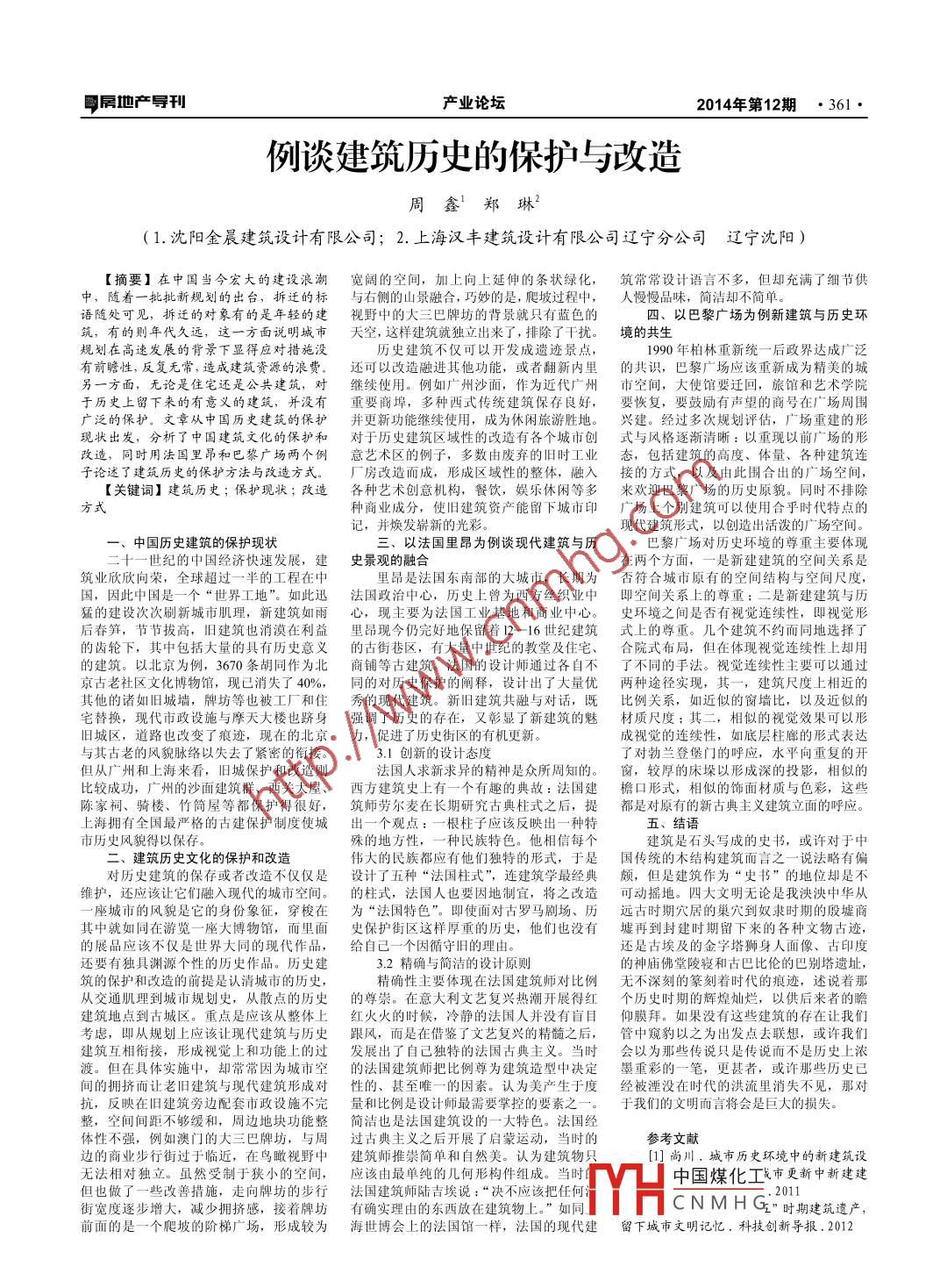 甲層血產(chǎn)導(dǎo)刊產(chǎn)業(yè)論壇2014年第12期·361·例談建筑歷史的保護(hù)與改造周鑫鄭琳2(1.沈陽(yáng)金晨建筑設(shè)計(jì)有限公司;2.上海漢豐建筑設(shè)計(jì)有限公司遼寧分公司遼寧沈陽(yáng))【摘要】在中囯當(dāng)今宏大的建設(shè)浪潮寬闊的空間,加上向上延伸的條狀綠化,筑常常設(shè)計(jì)語(yǔ)言不多,但卻充滿了細(xì)節(jié)供中,隨著一批批新規(guī)劃的出臺(tái),拆遷的標(biāo)與右側(cè)的山景融合,巧妙的是,爬坡過(guò)程中,人慢慢品味,簡(jiǎn)潔卻不簡(jiǎn)單語(yǔ)隨處可見(jiàn),拆遷的對(duì)象有的是年輕的建視野中的大三巴牌坊的背景就只有藍(lán)色的四、以巴黎廣場(chǎng)為例新建筑與歷史環(huán)筑,有的則年代久遠(yuǎn),這一方面說(shuō)明城市天空,這樣建筑就獨(dú)立岀來(lái)了,排除了干擾。境的共生規(guī)劃在高速發(fā)展的背景下顯得應(yīng)對(duì)措施沒(méi)歷史建筑不僅可以開(kāi)發(fā)成遺跡景點(diǎn),1990年柏林重新統(tǒng)一后政界達(dá)成廣泛有前瞻性,反復(fù)無(wú)常,造成建筑資源的浪費(fèi)。還可以改造融進(jìn)其他功能,或者翻新內(nèi)里的共識(shí),巴黎廣場(chǎng)應(yīng)該重新成為精美的城另一方面,無(wú)論是住宅還是公共建筑,對(duì)繼續(xù)使用。例如廣州沙面,作為近代廣州市空間,大使館要遷回,旅館和藝術(shù)學(xué)院于歷史上留下來(lái)的有意義的建筑,并沒(méi)有重要商埠,多種西式傳統(tǒng)建筑保存良好,要恢復(fù),要鼓勵(lì)有聲望的商號(hào)在廣場(chǎng)周圍廣泛的保護(hù)。文章從中國(guó)歷史建筑的保護(hù)并更新功能繼續(xù)使用,成為休閑旅游勝地。興建。經(jīng)過(guò)多次規(guī)劃評(píng)估,廣場(chǎng)重建的形現(xiàn)狀出發(fā),分析了中國(guó)建筑文化的保護(hù)和對(duì)于歷史建筑區(qū)域性的改造有各個(gè)城市創(chuàng)式與風(fēng)格逐漸清晰:以重現(xiàn)以前廣場(chǎng)的形改造,同時(shí)用法國(guó)里昂和巴黎廣場(chǎng)兩個(gè)例意藝術(shù)區(qū)的例子,多數(shù)由廢棄的舊時(shí)工業(yè)態(tài),包括建筑的高度、體量、各種建筑連子論述了建筑歷史的保護(hù)方法與改造方式。廠房改造而成,形成區(qū)域性的整體,融入接的方式,以及由此圍合出的廣場(chǎng)空間,【關(guān)鍵詞】建筑歷史;保護(hù)現(xiàn)狀;改造各種藝術(shù)創(chuàng)意機(jī)構(gòu),餐飲,娛樂(lè)休閑等多來(lái)歡迎巴黎廣場(chǎng)的歷史原貌。同時(shí)不排除方式種商業(yè)成分,使舊建筑資產(chǎn)能留下城市印廣場(chǎng)上個(gè)別建筑可以使用合乎時(shí)代特點(diǎn)的記,并煥發(fā)嶄新的光彩現(xiàn)代建筑形式,以創(chuàng)造出活潑的廣場(chǎng)空間中國(guó)歷史建筑的保護(hù)現(xiàn)狀三、以法國(guó)里昂為例談現(xiàn)代建筑與歷巴黎廣場(chǎng)對(duì)歷史環(huán)境的尊重主要體現(xiàn)世紀(jì)的中國(guó)經(jīng)濟(jì)快速發(fā)展,建史景觀的融合在兩個(gè)方面,一是新建建筑的空間關(guān)系是筑業(yè)欣欣向榮,全球超過(guò)一半的工程在中里昂是法國(guó)東南部的大城市,長(zhǎng)期為否符合城市原有的空間結(jié)構(gòu)與空間尺度,國(guó),因此中國(guó)是一個(gè)“世界工地”。如此迅法國(guó)政治中心,歷史上曾為西方絲織業(yè)中即空間關(guān)系上的尊重;二是新建建筑與歷猛的建設(shè)次次刷新城市肌理,新建筑如雨心,現(xiàn)主要為法國(guó)工業(yè)基地和商業(yè)中心。史環(huán)境之間是否有視覺(jué)連續(xù)性,即視覺(jué)形后春筍,節(jié)節(jié)拔高,舊建筑也消漠在利益里昂現(xiàn)今仍完好地保留著1-16世紀(jì)建筑式上的尊重。幾個(gè)建筑不約而同地選擇了的齒輪下,其中包括大量的具有歷史意義的古街巷區(qū),有大量中世紀(jì)的教堂及住宅、合院式布局,但在體現(xiàn)視覺(jué)連續(xù)性上卻用的建筑。以北京為例,3670條胡同作為北商鋪等古建筑。法國(guó)的設(shè)計(jì)師通過(guò)各自不了不同的手法。視覺(jué)連續(xù)性主要可以通過(guò)京古老社區(qū)文化博物館,現(xiàn)已消失了40%,同的對(duì)歷史保護(hù)的闡釋,設(shè)計(jì)出了大量?jī)?yōu)兩種途徑實(shí)現(xiàn),其一,建筑尺度上相近的其他的諸如舊城墻,牌坊等也被工廠和住秀的現(xiàn)代建筑。新舊建筑共融與對(duì)話,既比例關(guān)系,如近似的窗墻比,以及近似的宅替換,現(xiàn)代市政設(shè)施與摩天大樓也躋身強(qiáng)調(diào)了歷史的存在,又彰顯了新建筑的魅材質(zhì)尺度;其二,相似的視覺(jué)效果可以形舊城區(qū),道路也改變了痕跡,現(xiàn)在的北京力,促進(jìn)了歷史街區(qū)的有機(jī)更新成視覺(jué)的連續(xù)性,如底層柱廊的形式表達(dá)與其古老的風(fēng)貌脈絡(luò)以失去了緊密的銜接。3.1創(chuàng)新的設(shè)計(jì)態(tài)度了對(duì)勃蘭登堡門的呼應(yīng),水平向重復(fù)的開(kāi)但從廣州和上海來(lái)看,舊城保護(hù)和改造則法國(guó)人求新求異的精神是眾所周知的。窗,較厚的床垛以形成深的投影,相似的比較成功,廣州的沙面建筑群、西關(guān)大屋、西方建筑史上有一個(gè)有趣的典故:法國(guó)建檐口形式,相似的飾面材質(zhì)與色彩,這些陳家祠、騎樓、竹筒屋等都保護(hù)得很好,筑師勞爾麥在長(zhǎng)期研究古典柱式之后