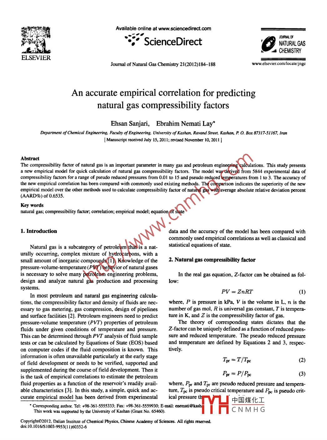 Availableonlineatwww.sciencedirect.coe Science Direct峽8ELSEVIERournal of Natural Gas Chemistry 21(2012)184-188www.elsevier.com/locate/jngcAn accurate empirical correlation for predictingnatural gas compressibility factorsEhsan Sanjari, Ebrahim Nemati LayDepartment of Chemical Engineering, Faculry of Engineering, University of Kashan, Ravand Street, Kashan, P. O. Box 87317-51167, IranI Manuscript received July 15, 2011: revised November 10, 2011 IAbstractThe compressibility factor of natural gas is an important parameter in many gas and petroleum engineering calculations. This study presentsa new empirical model for quick calculation of natural gas compressibility factors. The model was derived from 5844 experimental data ofcompressibility factors for a range of pseudo reduced pressures from 0.01 to 15 and pseudo reduced temperatures from 1 to 3. The accuracy ofhe new empirical correlation has been compared with commonly used existing methods. The comparison indicates the superiority of the newempirical model over the other methods used to calculate compressibility factor of natural gas with average absolute relative deviation percent(AARD%)of0.6535Key wordsnatural gas; compressibility factor; correlation; empirical model; equation of state1. Introductiondata and the accuracy of the model has been compared withcommonly used empirical correlations as well as classical andNatural gas is a subcategory of petroleum that is a natstatistical equations of stateurally occurring, complex mixture of hydrocarbons, with asmall amount of inorganic compounds [1 ]. Knowledge of the 2. Natural gas compressibility factorpressure-volume-temperature (PVT)behavior of natural gasesis necessary to solve many petroleum engineering problems,In the real gas equation, Z-factor can be obtained as fol-design and analyze natural gas production and processing low:PV= ZnRTIn most petroleum and natural gas engineering calcula-tions, the compressibility factor and density of fluids are nec- where, P is pressure in kPa, V is the volume in L, n is theessary to gas metering, gas compression, design of pipelines number of gas mol, R is universal gas constant, T isand surface facilities [2]. Petroleum engineers need to predict ture in K, and Z is the compressibility factor of g tempera-pressure-volume temperature(PVT) properties of petroleumThe theory of corresponding states dictates that thefluids under given conditions of temperature and pressure. Z-factor can be uniquely defined as a function of reduced pres-This can be determined through PVT analysis of fluid sample sure and reduced temperature. The pseudo reduced pressuretests or can be calculated by Equations of State(EOS)based and temperature are defined by Equations 2 and 3, respec.on computer codes if the fluid composition is known. This tively.information is often unavailable particularly at the early stageof field development or needs to be verified, supported andTpr=T/Tsupplemented during the course of field development. Then itis the task of empirical correlations to estimate the petroleumPpr=P/Ppcfluid properties as a function of the reservoir's readily avail- where, Ppr and Tpr are pseudo reduced pressure and tempera-able characteristics [3]. In this study, a simple, quick and ac- ture, Tpc is pseudo critical temperature and Ppe is pseudo crit-curate empirical model has been derived from experimental ical pressure th中國(guó)煤化工Corresponding author. Tel: +98-361-5555333: Fax: +98-361-5559930: E-mail: enema @kashiThis work was supported by the University of Kashan( Grant No. 65460)HCNMHGCopyrighto201, Dalian Institute of Chemical Physics, Chinese Academy of Sciences. All rights reserved.doi:l0.o16s1003-9953(11)603526Joumal of Natural Gas Chemistry Vol 21 No. 2 2012pirical models to predict compressibility factorof com-F=∑Pv(4) monly used empirical correlations and equationstate forcalculating of Z-factor are presented as followTk=∑Tv(5) 2.1. Dranchuk and Abu-Kassem correlation and Heidaryani=1Salarabadi-Moghadasi (HMs)correlationwhere, Pci is critical pressure, Tci is critical temperature, andyi is the mole fraction of componentIn 1975, Dranchuk and Abu -Kassem(DA) proposedBy knowing the composition of natural gas, pseudo pres- Equation 6 with eleven-constant for calculating the gas comsure and temperature of gas can be obtained and used in em- pressibility factors [4]A2A3.A4,A5A7 Asz=A1+rPr+[A6+Tpr r lp2[+第]Ao(1+A1)p+A1n的]+1where, P is reduced density of gas.on Standing and Katz chart for rapid estimation of natural gasIn 2010, Heidaryan et al. presented a correlation based Z-factor as Equation 7[5]:A1+A2In(Ppr)+A3(npP)2+A4(In Ppr)3As A6,,八,AA1+4h(p)+4(mP+m+衛(wèi)2.2. Azizi-Behbahani-Isazadeh(ABlcorrelationmedium to high pressures. Good results have been obtainedby this method for demethanizer, de-ethanizers, depropaniz-Azizi, Behbahani and Isazadeh in 2010 presented a new ers, debutanizer and wellhead processes. The compressibilitycorrelation for calculating compressibility factor of natural factors for both vapor and liquid phases can be calculated bygases based on 3038 points from Standing and Katz Z-factor the PR equation of state. The PR EOS has been presented byEquation14[小z=A⊥B+CRTPV-b V(V+b-b(V-b(14)+e2.4. Statistical association fluid theory(SAFT) equation ofA=am216+bP108+cP13-21+dln(T)05(9)sfateThe SAFT equation of state is similar to perturbed hardB=e+fr+gPl.56+hPo.124r3033 (10) chain equations, but provides competitive accuracy with UNI-QUAC, NRTL, or Wilsons equation for hydrogen bondingC=iln(T)-1.28+jIn(T-).37+kIn(P)+lIn(P)2+mIn(P)In(T)(11) mixtures. Unlike the interpolation methods, the SAFT equation is based on treating the hydrogen bonding interactionsas chemical reactions. The compressibility factor can be ob-D=1+nr5+oP0680(12) tained from SAFT EOS as Equation 15[8]E=pIn(Tr)8qIn(T)2+rIn(P)+ (13)RI1+zsg+Z+Z25soc(15)8In(P)+tIn( P)In(Tr)3. New proposed compressibility factor correlationThe tuned coefficients in equatio