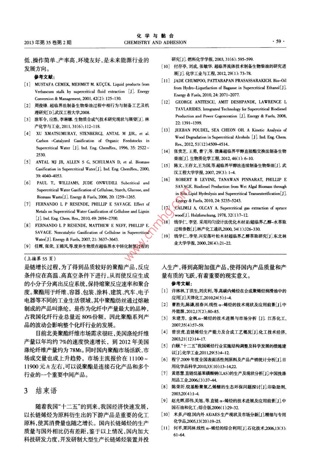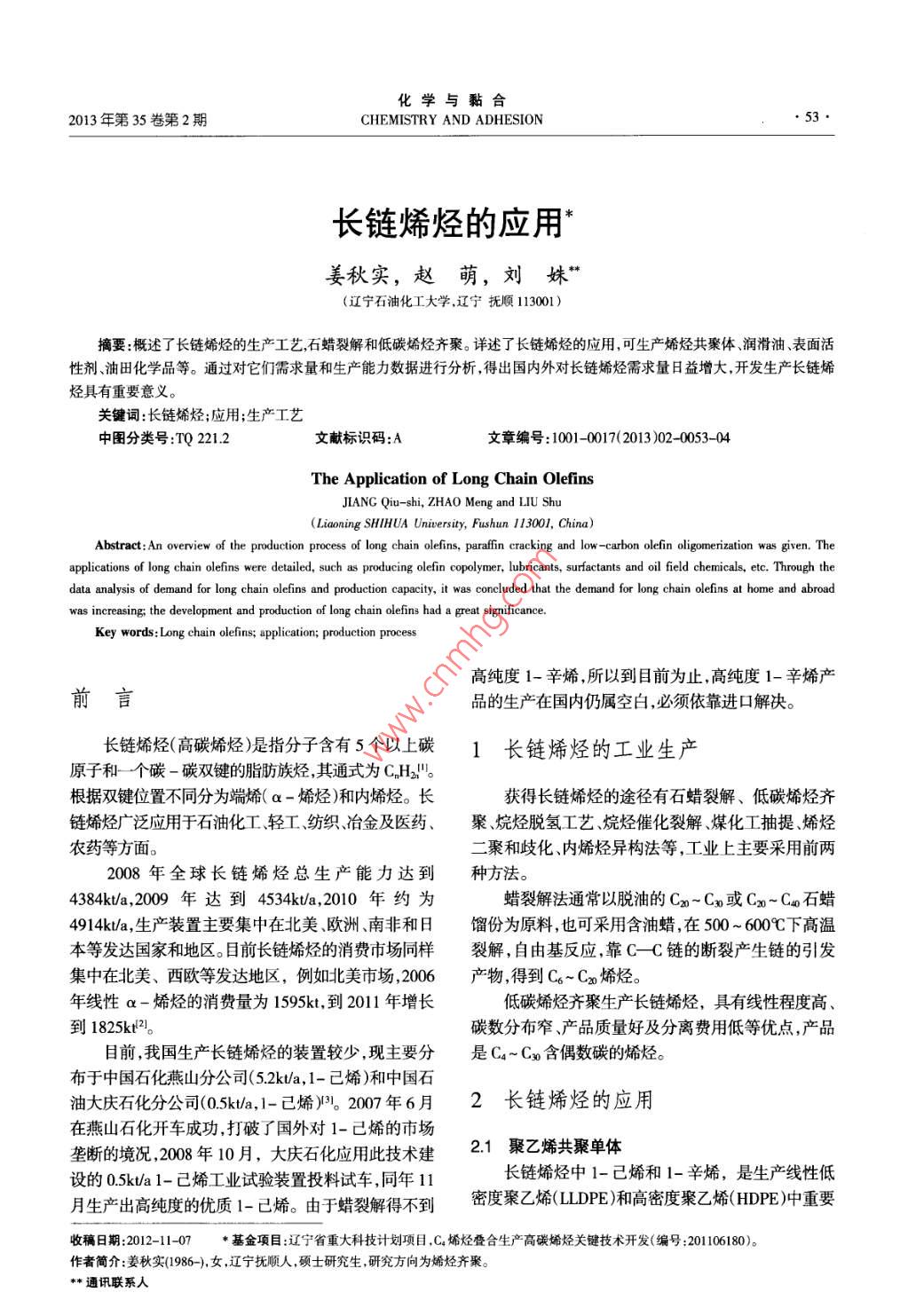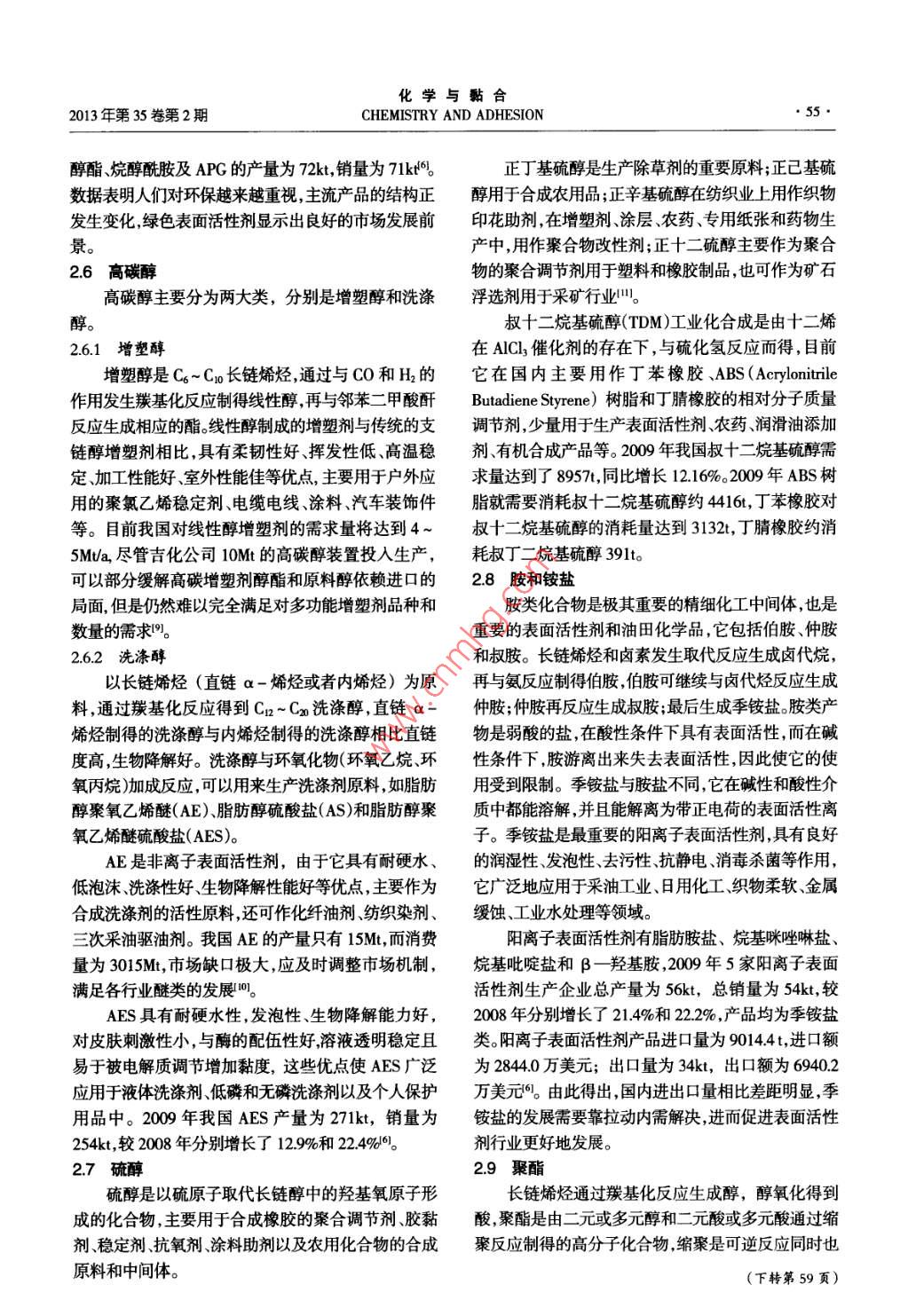 化學(xué)與黏合2013年第35卷第2期CHEMISTRY AND ADHESION●53●長(zhǎng)鏈烯烴的應(yīng)用*姜秋實(shí),趙萌,劉姝”(遼寧石油化工大學(xué),遼寧撫順113001)摘要:概述了長(zhǎng)鏈烯烴的生產(chǎn)工藝,石蠟裂解和低碳烯烴齊聚。詳述了長(zhǎng)鏈烯烴的應(yīng)用,可生產(chǎn)烯烴共聚體、潤(rùn)滑油、表面活性劑油田化學(xué)品等。通過對(duì)它們需求量和生產(chǎn)能力數(shù)據(jù)進(jìn)行分析,得出國(guó)內(nèi)外對(duì)長(zhǎng)鏈烯烴需求量日益增大,開發(fā)生產(chǎn)長(zhǎng)鏈烯烴具有重要意義。關(guān)鍵詞:長(zhǎng)鏈烯烴;應(yīng)用;生產(chǎn)工藝中圖分類號(hào):TQ 221.2文獻(xiàn)標(biāo)識(shí)碼:A文章編號(hào):1001-0017(2013)02-0053-04The Application of Long Chain OlefinsJIANG Qiu- shi, ZHAO Meng and IIU Shu(Liaoning SHIHUA Universily, Fushun 113001, China)Abstract:An overview of the production process of long chain olefins, parafn cracking and low - -carbon olefin oligomerization was given. Theapplications of long chain olefins were detailed, such as producing olefin copolymer, lubricants, surfactants and oil field chemicals, etc. Through thedata analysis of demand for long chain olefins and production capacity, it was concluded that the demand for long chain olefins at home and abroadwas increasing; the development and production of long chain olefins had a great significance.Key words: Long chain olefins; application; production process高純度1-辛烯,所以到目前為止,高純度1-辛烯產(chǎn)前言品的生產(chǎn)在國(guó)內(nèi)仍屬空白,必須依靠進(jìn)口解決。長(zhǎng)鏈烯烴(高碳烯烴)是指分子含有5個(gè)以上碳1長(zhǎng)鏈烯烴的工業(yè)生產(chǎn)原子和-個(gè)碳-碳雙鍵的脂肪族烴,其通式為C.H2"。根據(jù)雙鍵位置不同分為端烯( a -烯烴)和內(nèi)烯烴。長(zhǎng)獲得長(zhǎng)鏈烯烴的途徑有石蠟裂解、低碳烯烴齊鏈烯烴廣泛應(yīng)用于石油化工輕工紡織、冶金及醫(yī)藥、聚、烷烴脫氫工藝、烷烴催化裂解、煤化工抽提、烯烴農(nóng)藥等方面。二聚和歧化、內(nèi)烯烴異構(gòu)法等,工業(yè)上主要采用前兩2008年全球長(zhǎng)鏈烯烴總生產(chǎn)能力達(dá)到種方法。4384k/a,2009年達(dá)到4534kt/a,2010 年約為蠟裂解法通常以脫油的Cx~ Cxo或Cxo~Cao石蠟4914k/a,生產(chǎn)裝置主要集中在北美.歐洲、南非和日餾份為原料,也可采用含油蠟,在500 ~ 6009C下高溫本等發(fā)達(dá)國(guó)家和地區(qū)。目前長(zhǎng)鏈烯烴的消費(fèi)市場(chǎng)同樣裂解,自由基反應(yīng),靠C- C鏈的斷裂產(chǎn)生鏈的引發(fā)集中在北美、西歐等發(fā)達(dá)地區(qū),例如北美市場(chǎng),2006產(chǎn)物,得到Co~ Cxo烯烴。年線性a -烯烴的消費(fèi)量為1595kt, 到2011年增長(zhǎng)低碳烯烴齊聚生產(chǎn)長(zhǎng)鏈烯烴,具有線性程度高、到1825kt2。碳數(shù)分布窄、產(chǎn)品質(zhì)量好及分離費(fèi)用低等優(yōu)點(diǎn),產(chǎn)品.目前,我國(guó)生產(chǎn)長(zhǎng)鏈烯烴的裝置較少,現(xiàn)主要分是Ca~ Cxo含偶數(shù)碳的烯烴。布于中國(guó)石化燕山分公司(5.2k/a, 1-己烯)和中國(guó)石油大慶石化分公司(0.5kt/a,1-己烯)B。2007 年6月2長(zhǎng)鏈烯烴的應(yīng)用在燕山石化開車成功,打破了國(guó)外對(duì)1-己烯的市場(chǎng)壟斷的境況,2008年10月,大慶石化應(yīng)用此技術(shù)建2.1聚乙烯共聚單體設(shè)的0.5kt/a 1-己烯工業(yè)試驗(yàn)裝置投料試車,同年11長(zhǎng)鏈烯烴中1-己烯和1-辛烯,是生產(chǎn)線性低月生產(chǎn)出高純度的優(yōu)質(zhì)1-己烯。由于蠟裂解得不到密度聚乙烯(LLDPE)和高密度聚乙烯(HDPE)中重要收稿日期:2012-11-07*基金項(xiàng)目:遼寧省重大科技計(jì)劃項(xiàng)目,Co烯烴疊合生產(chǎn)高碳烯烴關(guān)鍵技術(shù)開發(fā)(編號(hào):201106180)。作者簡(jiǎn)介:姜秋實(shí)(1986-),女,遼寧撫順人,碩士研究生,研究方向?yàn)橄N齊聚。**通訊聯(lián)系人.●54.姜秋實(shí)等,長(zhǎng)鏈烯烴的應(yīng)用Vol. 35, No. 2,2013的共聚單體,也是生產(chǎn)增塑劑的重要原料[4。它們使堵劑、選礦起泡劑乳液聚合乳化劑等。共聚物的性能得以提高,尤其是1-己烯共聚的線性近年來,A0S發(fā)展速度劇增,我國(guó)2004年生產(chǎn)聚乙烯樹脂,在抗張強(qiáng)度、抗沖擊強(qiáng)度抗撕裂性及使能力約為20 kVa,到2009年AOS產(chǎn)量為52kt,銷量用壽命等方面具有1-丁烯共聚的線性聚乙烯難以為43kt,較2008年產(chǎn)量增長(zhǎng)了9.3% 161。Cu~ C1g原料比擬的優(yōu)異性能,適用于生產(chǎn)包裝膜和家用覆蓋膜、幾乎全靠外來引進(jìn),因此限制了AOS的價(jià)格,隨著中管材.電線電纜、塑料制品等。國(guó)a-烯烴的技術(shù)不斷進(jìn)步以及洗滌行業(yè)對(duì)產(chǎn)品生全球1-丁烯作為共聚單體的比例已降到30%物降解性和去污能力提出更高要求,AOS性能指標(biāo)以下,用高碳x-烯烴取代1-丁烯生產(chǎn)高性能樹脂明顯優(yōu)于其它產(chǎn)品,它作為一個(gè)新興品種迅速發(fā)展起產(chǎn)品已成為-種發(fā)展趨勢(shì)。我國(guó)2010年聚乙烯產(chǎn)量來,市場(chǎng)前景十分廣闊。為10330kt,同比增長(zhǎng)27.1%。預(yù)計(jì)從2012年到20162.4 烷基苯磺酸鹽年產(chǎn)量將增長(zhǎng)23.3%,消費(fèi)將增長(zhǎng)7.1% ,均高于世界烷基苯與Cro~ C14的內(nèi)烯烴反應(yīng)得到線性烷基的水平,但仍將有5000kt/a 的缺口(5。目前我國(guó)將擴(kuò)苯(LAB),再以三氧化硫作磺化劑生成烷基