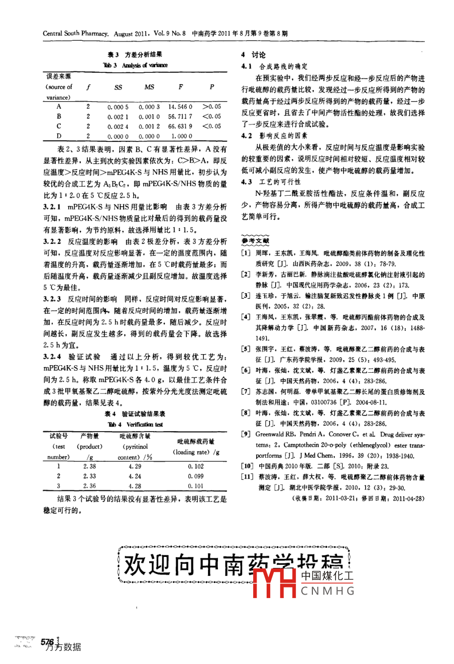 中南藥學(xué)2011年8月第9卷第8期Central South Pharmacy. August 2011, Vol.9 No.8炎性細(xì)胞因子,實(shí)驗(yàn)證實(shí)I-10可抑制I-1、L-6. II-8 、TNF-a及自身的合成心。降低黏附分子表達(dá),對(duì)組織器官的參考文獻(xiàn)損傷起著保護(hù)作用。TNF-a 是炎性反應(yīng)過(guò)程中出現(xiàn)最早、最[1] Kaminska J, Kowalska M,Kotowicz B, et al . Pretreatment重要的炎性介質(zhì),能激活中性粒細(xì)胞和淋巴細(xì)胞,促使細(xì)胞serum levels of cytokines and cytokine receptors in patients with因子的合成和釋放,其升高程度與疾病嚴(yán)重程度相關(guān)"。nonr small-ell lung cancer, and correlations with clinic opatho-國(guó)內(nèi)學(xué)者研究發(fā)現(xiàn)某些中藥具有明確的改善急性肺損logical features and prognosis, M CSF-an independent prognos-傷,抗多器官功能障礙綜合癥(MODS)的作用,參麥注射tic factor [J]. Oncology, 2006, 70 (2) 115-125.液是其中較常用的藥物7日]。作用機(jī)制與其顯著抑制TNF-[2] 楊陽(yáng),毛黎明.參友配伍川芩嗪注射液對(duì)心肌缺血再濮注損傷的臨床療效觀察U].中華實(shí)用中西醫(yī)雜志,2004, 4 (17) ;a,堿少細(xì)胞因子的釋放,抑制炎癥反應(yīng)有關(guān)。2919- 2920.參麥注射液是在古方參麥散的基礎(chǔ)上.運(yùn)用現(xiàn)代科學(xué)技術(shù)3] 李建生。趙君玫.郭勝典,等川芎嗪和參麥注射液對(duì)腦缺血改型的中藥?kù)o脈注射液,由人參、麥冬2味藥物提取精制而再灌注肺臟損傷的保護(hù)作用U]. 河南中醫(yī)藥學(xué)刊,2003. 18成。具有補(bǔ)元?dú)?、益氣固脫、養(yǎng)陰生津之功效,可增強(qiáng)單核(2): 17-19. .巨噬細(xì)胞系統(tǒng)功能及非特異性抗感染作用,并能抑制炎性介[4] NgCS, Wan s, Hui CW. et al. Video ssisted thoracie sur-質(zhì)的過(guò)度釋放,有效調(diào)控IL-6、Il-10、 TNF-a等炎性細(xì)胞gery for early stage lung cancer can short-termn immunological因子的產(chǎn)生,改善微循環(huán)和組織灌注,減輕肺損傷}20)。advantages improve long term survival? U] Ann Thorac Card-本研究表明,肺癌根治術(shù)后4h2組血漿TNF-a、IL-6、iovasc Surg, 2006, 12 (3): 308-312.IL 10濃度均升高并達(dá)到-峰值.說(shuō)明肺癌根治術(shù)后發(fā)生全5] Newrnan MS. Colbem GT. Working PK. et al. Comparative身炎性反應(yīng),隨著促炎細(xì)胞因子的大斌釋放,抗炎細(xì)胞因子pharmacokinetics, tissue distribution, and therapeutic efec-水平亦隨之升高,而炎性細(xì)胞因子與抗炎細(xì)胞因子之間的動(dòng)tiveness of cisplatin encapsulated in long circulating, pegylated態(tài)平衡對(duì)于決定炎性反應(yīng)程度是非常重要的。本研究發(fā)現(xiàn),liposomnes (SP1-077) in tumor bearing mice [J] Cancer Che-肺癌根治術(shù)患者圍術(shù)期應(yīng)用參麥注射液后可明顯抑制血漿促mother Pharmacol, 199, 43 (1): 1-7.6] Khan AY, Talegaonker S, Lqbal Z, et al Muliple emulsions; an炎性細(xì)胞因子lI6. TNF-a生成釋放,促進(jìn)抗炎性細(xì)胞因overview D]. Cur I)rug Deliv. 2006. 3 (4); 429-443.子IL10生成,觀察組TNF-a濃度在術(shù)后第3日已降至術(shù)前7] 王敬民,金煒,孫秀箋.參麥注射液對(duì)心力衰竭患者血ET及水平,觀察組IL-6. TNFa濃度比較在術(shù)后4h及第1日、TNF-a的影響D]浙江中西醫(yī)結(jié)合雜志,2004,0 14 (1): 46.3日均明顯低于對(duì)照組,Il-10 濃度均明顯高于對(duì)照組,提8] 鈕煒西,華寧,齊幟,等心力衰竭患者心功能的改善與參麥?zhǔn)緟Ⅺ溩⑸湟嚎赏ㄟ^(guò)調(diào)節(jié)血漿細(xì)胞因子水平,進(jìn)而減輕肺癌注射液及血清炎癥因子水平的關(guān)系[J]. 中國(guó)臨床康復(fù),根治術(shù)患者園術(shù)期全身炎性反應(yīng)。2005. 19 (9); 134-136.綜上所述,參麥注射液給藥后可明顯抑制促炎性細(xì)胞因9]毛靜遠(yuǎn),王恒和,王強(qiáng),等生脈注射液對(duì)心力衰竭患者血清子生成,促進(jìn)抗炎性細(xì)胞因子生成,提示參麥注射液叮通過(guò)TNF-a水平影響的臨床研究[J]新中醫(yī), 2003, 35 (6):調(diào)節(jié)血漿細(xì)胞因子水平,從而減輕肺癌切除術(shù)患者圍術(shù)期全32-34.身炎性反應(yīng)。(收稿日期: 2011-06-03; 修回日期: 2011-06-13)甲氧基聚乙二醇吡硫醇制備條件的優(yōu)化研究萬(wàn)芬',王紅'*,昊紅菱”,蔡波濤',馬俊' (1, 湖北中醫(yī)藥大學(xué)藥學(xué)院藥物化學(xué)教研室,武漢430065;5 2.潮北醫(yī)藥學(xué)院藥檢系,湖北十堰442000摘要:目的優(yōu)化甲氧基聚 乙二醇吡硫醇的制備條件。方法采用N羥基丁二酰亞胺活性酯法合成甲氧基聚乙二醇吡硫醇,并以紫外分光光度法測(cè)定的甲氧基聚乙二醇吡硫醇中吡硫醇的載藥量為考察指標(biāo),通過(guò)正交試驗(yàn)對(duì)合成工藝進(jìn)行優(yōu)化。結(jié)果甲氧基聚乙二酵吡硫醇較優(yōu)工藝條件為: 單甲氧基聚乙二醇4000琥珀酸單酯(mPEG4K-S)與N~羥基丁二酰亞胺(NHS) 物質(zhì)的量比為1:1.5,在5 C反應(yīng)2.5h后再在5 C下加入吡硫醇和4二甲氨基吡啶(DMAP)反應(yīng)20h.結(jié)論該合成工藝操作簡(jiǎn)便, 穩(wěn)定可行,產(chǎn)物中吡硫醇的載藥量高。關(guān)鍵詞:甲氧基聚乙二醇吡硫醇;單甲氧基聚乙二醇4000琥珀酸單酯;合成工藝;正交試驗(yàn)中圈分類號(hào): R914, TQ460. 31文獻(xiàn)標(biāo)識(shí)碼: A-573-04doi: 10. 3969/j. issn. 1672-2981. 2011.08. 005中國(guó)煤化工基金項(xiàng)目:湖北省自然科學(xué)基金資助課題(編號(hào): 2007ABA213).MHCNMHG作者簡(jiǎn)介:萬(wàn)芬,男,在讀碩t:
