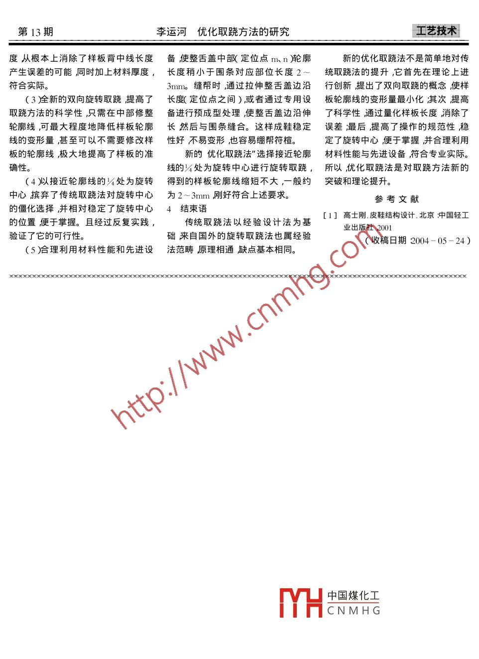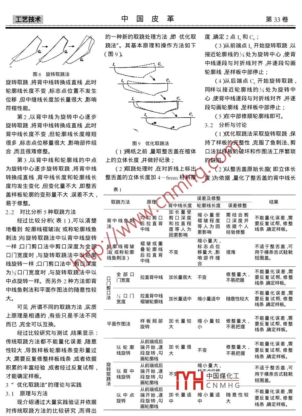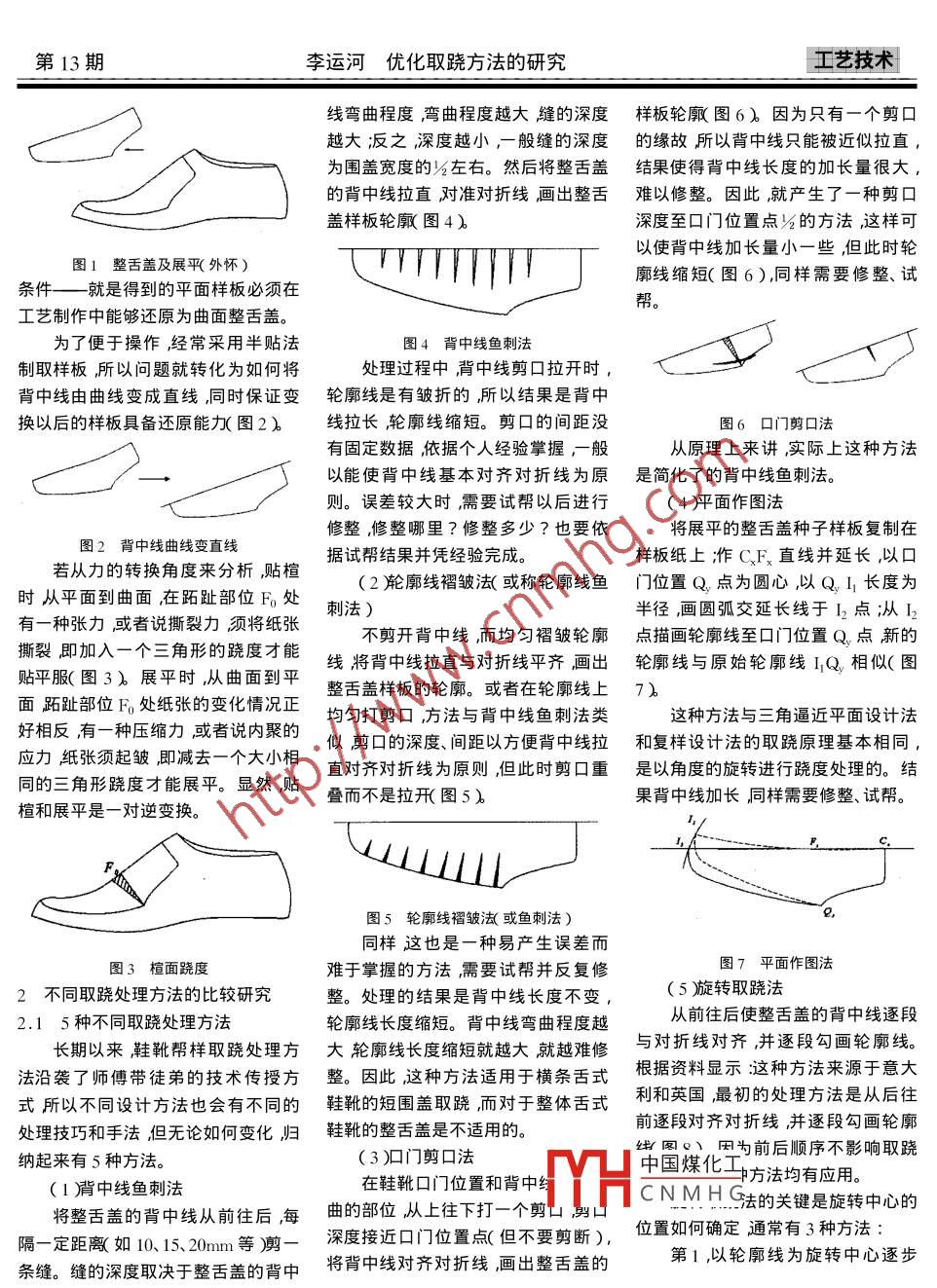 第33卷第13期中國皮革Vol.33 No. 132004年7月CHINA LEATHERJul.2004優(yōu)化取蹺方法的研究Study on the optimize warpage李運(yùn)河”( 溫州師范學(xué)院,溫州325015)Li Yunhe( Wenzhou Normal College , Wenzhou 325015 )要重新定義了蹺度的概念及形成原因揭示了取蹺的實質(zhì)。通過對5種傳統(tǒng)取蹺方法的比較研究發(fā)現(xiàn)不同取蹺方法本質(zhì)上是相通的有些甚至是可以互換的。同時針對傳統(tǒng)取蹺方法不能量化誤差線條變形量大經(jīng)驗性強(qiáng)不易掌握等缺陷進(jìn)行了深入研究與實踐找到了一種新的優(yōu)化取蹺法”。提出了雙向取蹺概念量化了樣板長度穩(wěn)定了旋轉(zhuǎn)中心是對取蹺方法的新的突破和理論提升。關(guān)鍵詞取蹺方法比較研究優(yōu)化制鞋中圖分類號Is 56文獻(xiàn)標(biāo)識碼BAbstractThe conception and the form of the warpage was redefined , as well as the essential was opened out. According tothe research about the method , the discovery is that the traditional different five kinds of methods in warpage areactually interlinked , even some of them can be substituted. Moreover , a optimizing method on the basis of deepresearching and practice was presented , which correct some disadvantages that can not measure error betweenthem , obvious change occur on the line , need plenty of experience as well as hard to master. Meanwhile the newconception of the warpage was put forward , which can be rotated from two directions , the length of the prototypecan be measured and the center of rotation is more steady. The new method is more great breakthrough and pro-motion in theory than that of before.Keywords warpage study on the comparision optimize shoemaking取蹺處理是鞋靴幫樣設(shè)計中的關(guān)式鞋楦整舌蓋取蹺處理為例,因為整大所以要完成樣板設(shè)計中平面和曲鍵技術(shù)多年來在鞋靴幫樣設(shè)計方法舌蓋蹺度大是取蹺處理中的難點(diǎn)。面的轉(zhuǎn)換,就需要將產(chǎn)生的誤差給予的演變中形成了不同的取蹺處理方1取蹺 處理的理論分析適當(dāng)修正。法。帶來的問題是方法不同結(jié)果不1.1 蹺度 的形成原因結(jié)合取蹺的實踐,可以看出平面同,對鞋靴成型效果產(chǎn)生不良影響。就制鞋過程而言,樣板設(shè)計是從和曲 面之間相互轉(zhuǎn)換的誤差就是蹺而在實際工作中,這類不良影響部分鞋楦曲面到平面樣板的轉(zhuǎn)換,工藝制度消除誤差的過程就是取蹺處理。依靠修正樣板來消除,部分依靠材料作是從平面材料到曲面鞋楦的轉(zhuǎn)換,鞋靴款式千變?nèi)f化部件形狀各彈性來消.....所以都是采取了一實質(zhì) 上是平面和曲面的轉(zhuǎn)換。不相同產(chǎn)生的蹺度千差萬別但蹺度種先產(chǎn)生誤差后修正消除誤差”的在樣板設(shè)計中,貼楦是從平面紙產(chǎn)生的部位主要在楦面跖跗部位其方法。實踐證明,這種消除誤差的方張到曲面鞋楦的轉(zhuǎn)換,展平是從曲面大小取決于部件的彎曲程度。顯然,法需要豐富的實踐經(jīng)驗,且難于掌握;鞋楦到平 面樣板的轉(zhuǎn)換,實質(zhì)上也是部件跨過伏面彎曲部位時蹺度就大實際操作時需要反復(fù)試幫多次修整平面和曲面的轉(zhuǎn)換。-些,反之就小-一些。整體舌式鞋靴(即修改樣板尺寸大小整理線條形狀鞋楦是一個不規(guī)則的幾何形體,整舌 蓋部件跨過彎曲部位,所以蹺度等)楦面是多向彎曲的三維曲面,本身是較大(圖1 )通過對不同取蹺方法的比較研究不可展開的,只能在一定條件下并借取蹺的目的是將曲面部件轉(zhuǎn)換為和多年實踐的總結(jié),找到了一種能夠.助外力的作用展平(即近似展中國煤化工活蓋為例就是如何將降低誤差、量化并規(guī)范處理方法、便于三維楦面多向彎曲的程MHCNMH c整舌蓋轉(zhuǎn)換為平面樣板掌握的優(yōu)化取蹺法"。下面以整體舌越復(fù) 雜展平的難度就越大、誤差也越” (圖1 ) ,而這樣的轉(zhuǎn)換必須滿足一個<作者簡介李運(yùn)河男,1963年生大學(xué)本科副教授22第13期李運(yùn)河優(yōu)化取蹺方 法的研究.工藝技術(shù)線彎曲程度彎曲程度越大縫的深度樣板輪廓( 圖6%因為只有-個剪口越大;派之深度越小,-般縫的深度的緣故所以背中線只能被近似拉直,為圍蓋寬度的%左右。然后將整舌蓋結(jié)果使得背中線長度的加長量很大,的背中線拉直對準(zhǔn)對折線畫出整舌難以修整。因此就產(chǎn)生了一種剪口蓋樣板輪廓圖4)深度至口門位置點(diǎn)%的方法,這樣可以使背中線加長量小一些,但此時輪圖1 整舌蓋及展平(外懷)條件一 就是得到的平面樣板必須在T TTTTTTTT廓線縮短(圖6),同樣需要修整、試幫。工藝制作中能夠還原為曲面整舌蓋。為了便于操作經(jīng)常采用半貼法圖4背中線魚刺法制取樣板,所以問題就轉(zhuǎn)化為如何將處理過程中,背中線剪口拉開時,背中線由曲線變成直線,同時保證變輪廓線是有皺折的所以結(jié)果是背中換以后的樣板具備還原能力(圖2)線拉長,輪廓線縮短。剪口的間距沒圖6口門剪口法有固定數(shù)據(jù)依據(jù)個人經(jīng)驗掌握,-般從原理上來講,實際上這種方法以能使背中線基本對齊對折線為原是簡化了的背中線魚刺法。則。誤差較大時需要試幫以后進(jìn)行(4平面作圖法修整,修整哪里?修整多少?也要依將展平的整舌蓋種子樣板復(fù)制在圖2背中線曲線變直線據(jù)試幫結(jié)果并憑經(jīng)驗完成。樣板紙上;作CFx直線并延長,以口若從力的轉(zhuǎn)換角度來分析貼楦(