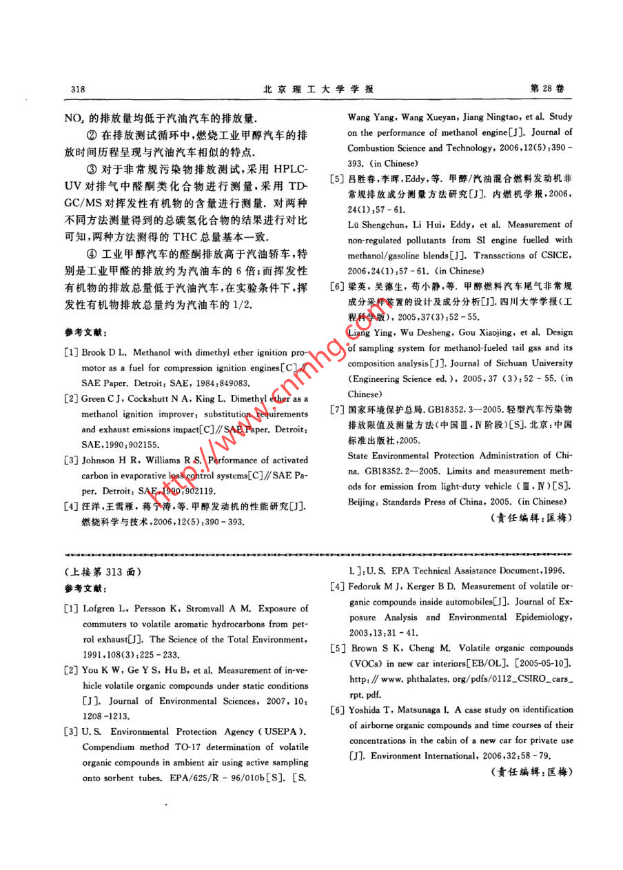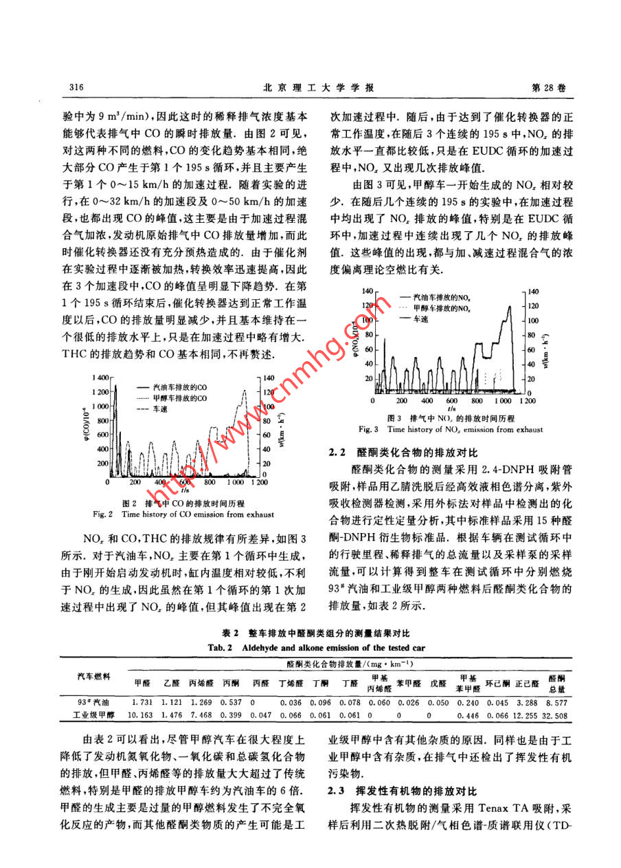 .第28卷第4期北京理工大學(xué)學(xué)報(bào)Vol, 28 No. 42008年4月.Transactions of Bejing Institute of TechnologyApr.2008甲醇燃料汽車的排放特性研究葛蘊(yùn)珊',尤可為',王軍方',姜磊',韓秀坤',高力平1,王向東”, 宋玉祥2(1.北京理工大學(xué)機(jī)械與車輛工程學(xué)院,北京100081; 2.北京創(chuàng)意杰發(fā)動(dòng)機(jī)有限公司,北京100102)摘要;研究滿足國m排放標(biāo)準(zhǔn)的汽油轎車燃燒工業(yè)甲醇后的常規(guī)和非常規(guī)污染物排放特性,采用熱脫附-氣相色.譜/質(zhì)譜聯(lián)用技術(shù)和高效液相色譜法對汽油和工業(yè)甲醇燃料的非常規(guī)污染物排放進(jìn)行定量及定性研究.研究結(jié)果表明:甲醇轎車的常規(guī)污染物Co,THC(總碳?xì)浠衔?和NO,排放低于汽油轎車;非常規(guī)排放污染物中,甲醇汽車的醛酮尾氣排放高于汽油轎車,其甲醛的排放量約是汽油車的6倍,而其揮發(fā)性有機(jī)物(VOCs)排放的總量只有汽油車的1/2左右.關(guān)鍵詞:甲醇;排放;非常規(guī)污染物中圖分類號(hào): TK 412.文獻(xiàn)標(biāo)識(shí)碼: A文章編號(hào):1001-0645<2008)04-0314-05A Study on Exhaust Emission from Methanol VehicleGE Yun-shan',YOU Kewei', WANG Jun-fang',JIANG Lei,HAN Xiu-kun',GAO Li-ping',WANG Xiang-dong,SONG Yu- xiang2(1. School of Mechanical and Vehicular Engineering, Beijing Institute of Technology, Beijing 100081, China;2. Beiing Chuangyiie Engine Ltd, Being 100102 , China)Abstract: Regulated and unregulated emission of a gasoline vehicle that meets national standardNo.四and fuelled with methanol were investigated. Thermal desorption-gas chromatography/mass spectrometer ( TD-GC/MS) was used for aromatic compounds emission and high pressureliquid chromatography (HPLC) was used for aldehyde and alkone emission. Test results showedthat THC, CO and NO, emission from the methanol vehicle were less than the case usinggasoline, but the aldehyde and alkone emission appeared higher than the gasoline vehicle,especially its formaldehyde emission is six times than the gasoline vehicle, but the volatile organiccompounds( VOCs) emission amounted to only half that of the gasoline emission.Key words: aldehyde; emission; unregulated emission甲醇的沸點(diǎn)低.辛烷值高,適用于點(diǎn)燃式發(fā)動(dòng)含有較多的甲醛、甲醇等非常規(guī)有害污染物質(zhì).這機(jī),在汽油機(jī)上使用甲醇燃料,發(fā)動(dòng)機(jī)不需做大的變些物質(zhì)嚴(yán)重危害人體健康,具有強(qiáng)烈的致癌和促癌動(dòng)".對甲醇作為代用燃料的早期研究致力于提高的作用,因此開展甲醇燃料汽車排氣中的醇、醛類物發(fā)動(dòng)機(jī)的動(dòng)力性和燃油經(jīng)濟(jì)性.2000 年以后的研質(zhì)的分析研究非常有必要。到目前為止,國內(nèi)對于究重點(diǎn)轉(zhuǎn)向甲醇發(fā)動(dòng)機(jī)的排放特性,并開始進(jìn)行甲甲醇發(fā)動(dòng)機(jī)排放特性的研究重點(diǎn)主要集中于發(fā)動(dòng)機(jī)醇發(fā)動(dòng)機(jī)非常規(guī)污染物排放特性的研究.研究結(jié)果臺(tái)架實(shí)驗(yàn)[20],不能反映車輛實(shí)際運(yùn)行工況的排放表明,汽油機(jī)采用甲醇或者甲醇/汽油的混合燃料,情況.發(fā)動(dòng)機(jī)的動(dòng)力性和經(jīng)濟(jì)性有所改善,尾氣中的常規(guī)作者通過整車排放實(shí)驗(yàn),對比了汽油轎車改裝污染物質(zhì)如CO,HC的排放大幅度降低,但排氣中成純甲醇轎車前后,按國家第川階段排放標(biāo)準(zhǔn)收稿日期: 2007-04-19作者篙介:葛蘊(yùn)珊(1965- -),男,教授,博士生導(dǎo)師,E-mai:geyunshan@bit edu. cn.316北京理工大學(xué)學(xué)報(bào)第28卷驗(yàn)中為9m'/min),因此這時(shí)的稀釋排氣濃度基本.次加速過程中,隨后,由于達(dá)到了催化轉(zhuǎn)換器的正能夠代表排氣中CO的瞬時(shí)排放量.由圖2可見,常工作溫度,在隨后3個(gè)連續(xù)的195 s中,NO,的排對這兩種不同的燃料,CO的變化趨勢基本相同,絕放水平一直都比較低,只是在EUDC循環(huán)的加速過大部分CO產(chǎn)生于第1個(gè)195s循環(huán),并且主要產(chǎn)生程中,NO,又出現(xiàn)幾次排放峰值.于第1個(gè)0~15 km/h的加速過程.隨著實(shí)驗(yàn)的進(jìn)由圖3可見,甲醇車一開始生成的NO,相對較行,在0~32 km/h的加速段及0~50 km/h的加速少.在隨后幾個(gè)連續(xù)的195 s的實(shí)驗(yàn)中,在加速過程段,也都出現(xiàn)CO的峰值,這主要是由于加速過程混中均出現(xiàn)了NO,排放的峰值,特別是在EUDC循合氣加濃,發(fā)動(dòng)機(jī)原始排氣中CO排放量增加,而此環(huán)中,加速過程中連續(xù)出現(xiàn)了幾個(gè)NO,的排放峰時(shí)催化轉(zhuǎn)換器還沒有充分預(yù)熱造成的.由于催化劑值.這些峰值的出現(xiàn),都與加、減速過程混合氣的濃在實(shí)驗(yàn)過程中逐漸被加熱,轉(zhuǎn)換效率迅速提高,因此度偏離理論空燃比有關(guān).在3個(gè)加速段中,Co的峰值呈明顯下降趨勢.在第40r1 140. 汽油車排放的NO,1個(gè)195s循環(huán)結(jié)束后,催化轉(zhuǎn)換器達(dá)到正常工作溫20一甲醇車排放的NO,t 120度以后,CO的排放量明顯減少,并且基本維持在一0-車道I 100個(gè)很低的排放水平上,只是在加速過程中略有增大.80-80金s0THC的排放趨勢和CO基本相同,不再贅述.幾U14007140201 200汽油車排放的CO120.... 甲醇車排放的CO200 400 600 800 1000 12001 000---車速0080圖3排氣中NO,的排放時(shí)間歷程Fig. 3 Time history of NO% emission from exhaust0曼402.2醛酮類化合物的排放對比醛酮類化合物的測量采用2. 4-D