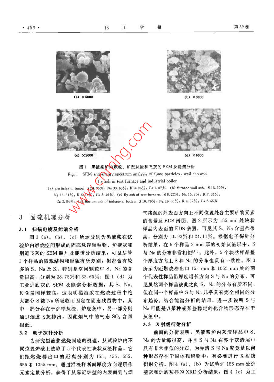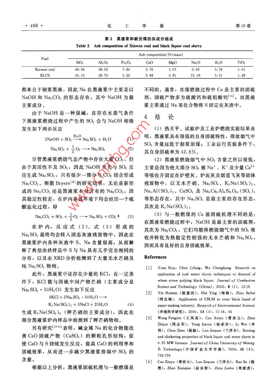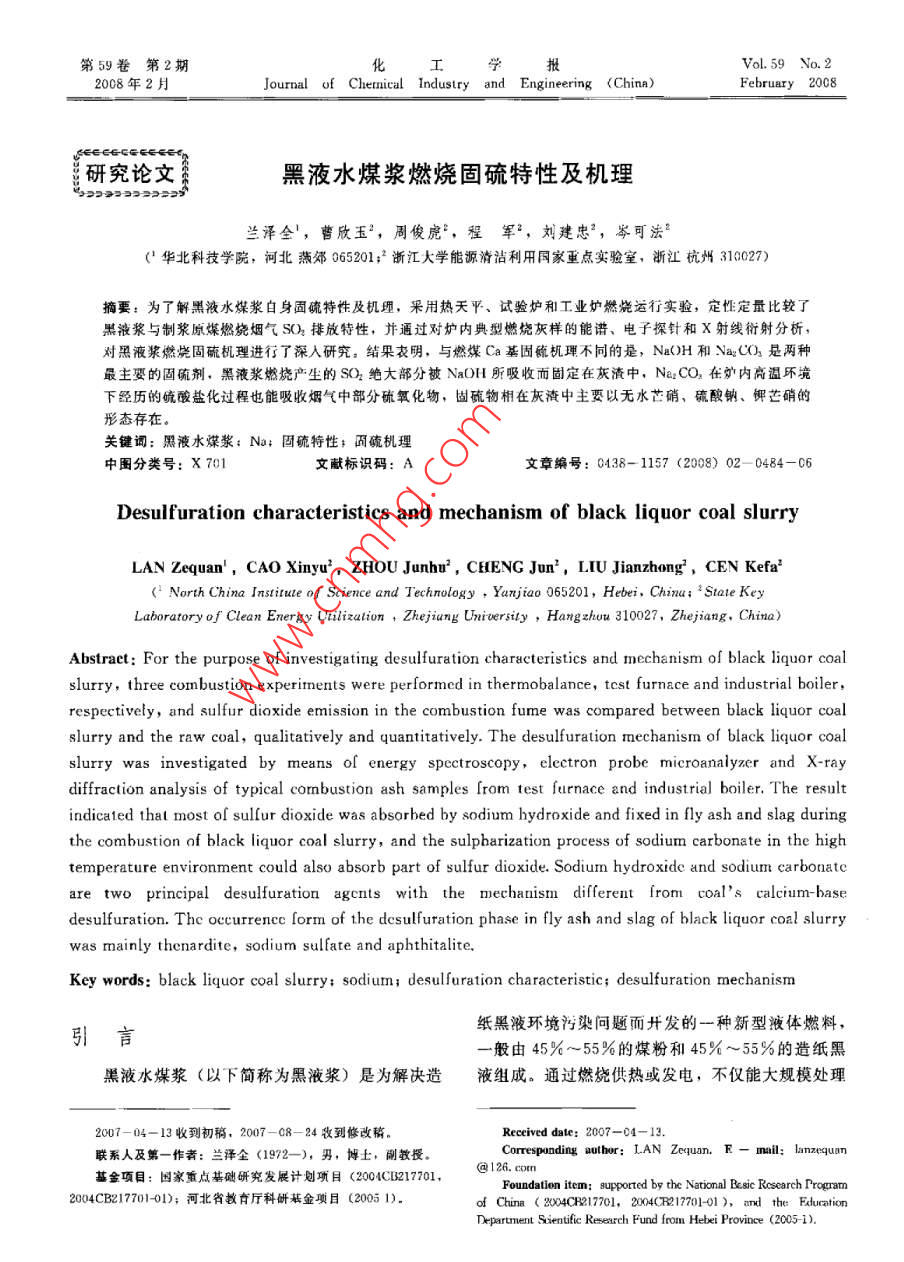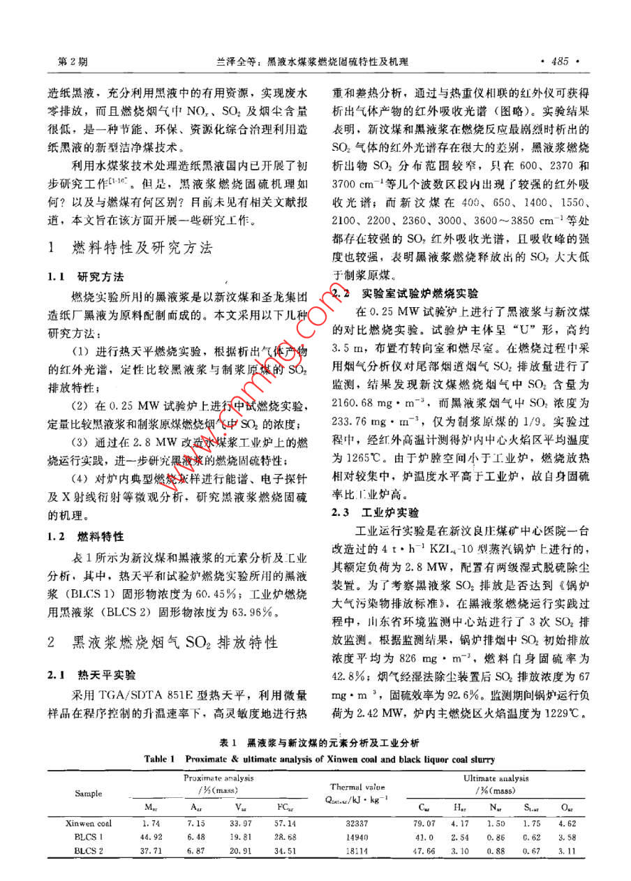 第59卷第2期學(xué)報(bào)Vol. 59 No. 22008年2月Journal of Chemical Industry and Engineering (China)Fe研究論文黑液水煤漿燃燒固硫特性及機(jī)理蘭澤全',曹欣玉2,周俊虎2,程軍2,劉建忠2,岑可法2華北科技學(xué)院,河北燕郊065201;2浙江大學(xué)能源清潔利用國家重點(diǎn)實(shí)驗(yàn)室,浙江杭州319027)摘要:為了解黑液水煤漿自身固硫特性及機(jī)理,采用熱天平、試驗(yàn)爐和工業(yè)爐燃燒運(yùn)行實(shí)驗(yàn),定性定量比較了騏液漿與制漿原煤燃燒煙氣SO2排放特性,并通過對爐內(nèi)典型燃燒灰樣的能譜、電子探針和X射線衍射分析,對黑液漿燃燒固硫機(jī)理進(jìn)行了深入研究。結(jié)果表明,與燃煤Ca基固髖機(jī)琿不問的是,NO)H和Na2CO是兩種最主要的固硫劑,黑液漿燃燒產(chǎn)生的SO2絕大部分被NaOH所吸收而固定在灰渣中,Na2CO在爐內(nèi)高溫環(huán)境下經(jīng)歷的硫酸鹽化過程也能吸收煙氣中部分硫氧化物,固硫物相在灰渣中主要以無水芒硝、硫酸鈉、鉀芒硝的形態(tài)存在。關(guān)鍵詞:黑液水煤漿;Na;固硫特性;面硫機(jī)理中圖分類號(hào):X701文獻(xiàn)標(biāo)識(shí)碼:A文章編號(hào):0438-1157(2008)02-0484-06Desulfuration characteristics and mechanism of black liquor coal slurryLAN Zequan', CAO Xinyu, ZHOU Junhu, CHENG Jun', LIU Jianzhong,CEN KefaLaboratory of Clean Energy Utilization Zhejiang University Hangzhou 310027, Zhejiang, China)Abstract: For the purpose of investigating desulfuration characteristics and mechanism of black liquor coalslurry, three combustion experiments were performed in thermobalance, test furnace and industrial boiler,respectively, and sulfur dioxide emission in the combustion fume was compared between black liquor coalslurry and the raw coal, qualitatively and quantitatively. The desulfuration mechanism of black liquor coalslurry was investigated by means of energy spectroscopy, electron probe microanalyzer and X-raydiffraction analysis of typical combustion ash samples from test furnace and industrial boiler. The resultindicated that most of sulfur dioxide was absorbed by sodium hydroxide and fixed in fly ash and slag duringthe combustion of black liquor coal slurry and the sulphurization process of sodium carbonate in the hightemperature environment could also absorb part of sulfur dioxide. Sodium hydroxide and sodiu carbonateare two principal desulfuration agents with the mechanism different from coals calcium-basedesulfuration. The occurrencc form of the desulfuration phase in fly ash and slag of black liquor coal slurrywas mainly thenardite, sodium sulfate and aphthitaliteKey words: black liquor coal slurry sodium: desulfuration characteristic; desulfuration mechanism引言紙黑液環(huán)境污染問題而開發(fā)的一種新型液體燃料,一般由45%~55%的煤粉和45%~55%的造紙黑黑液水煤漿(以下簡稱為黑液漿)是為解決造液組成。通過燃燒供熱或發(fā)電,不僅能大規(guī)模處理2007—04-13收到初稱,2007-08-24牧到修改蘛,Received date: 2007-04-12.聯(lián)系人及第一作者:蘭澤全(1972-),男,博上,教授rresponding author: LAN Zequan. E-mail: lanzequan基金項(xiàng)目:國家重點(diǎn)基礎(chǔ)研究發(fā)展計(jì)劃項(xiàng)目(204CB217701,Foundation item: supported by the National Bsic Research Program2004CB2177011);河北省教育廳科研基金項(xiàng)目(20051)of China( 2004CR17701, 2004CR217701-01), and the EDucationDepartment Sientific Research Fund from Hebei Province (2005-1)第2期蘭澤全等:黑液水煤漿燃燒固硫特性及機(jī)理造紙黑液,充分利用黑液中的有用資源,實(shí)現(xiàn)廢水重和差熱分析,通過與熱重儀相聯(lián)的紅外儀可獲得岺排放,而且燃燒煙氣中NO-、SO2及煙塵含量析出氣體產(chǎn)物的紅外吸收光譜(圖略)。實(shí)驗(yàn)結(jié)果很低,是一種節(jié)能、環(huán)保、資源化綜合治理利用造表明,新汶煤和黑液漿在燃燒反應(yīng)最劇緦時(shí)析出的紙黑液的新型潔凈煤技術(shù)。SO2氣體的紅外光譜存在很大的差別,黑液漿燃燒利用水煤漿技術(shù)處理造紙黑液國內(nèi)已開展了初析出物SO2分布范圍較窄,只在600、2370和步研究工作1°。但是,黑液漿燃燒固硫機(jī)理如3700cm-1等幾個(gè)波數(shù)區(qū)段內(nèi)出現(xiàn)了較強(qiáng)的紅外吸何?以及與燃煤有何區(qū)別?目前未見有相關(guān)文獻(xiàn)報(bào)收光譜;而新汶煤在400、650、1400、1550道,本文旨在該方面開展一些研究工作。2100、2200、2360、3000、3600~3850cm1等處1燃料特性及研究方法都存在較強(qiáng)的SO紅外吸收光譜,且吸收峰的強(qiáng)度也較強(qiáng),表明黑液漿燃燒釋放岀的SO2大大低1.I研究方法于制漿原煤燃燒實(shí)驗(yàn)所用的黑液漿是以新汶煤和圣龍集團(tuán)2.2實(shí)驗(yàn)室試驗(yàn)爐燃燒實(shí)驗(yàn)造紙廠黑液為原料配制而成的。本文采用以下幾種在0.25MW試驗(yàn)爐上進(jìn)行了黑液漿與新汶煤研究方法:的對比燃燒實(shí)驗(yàn)。試驗(yàn)爐主體呈“U”形,高約(1)進(jìn)行熱天平燃燒實(shí)驗(yàn),根據(jù)析出氣體產(chǎn)物35m,布置有轉(zhuǎn)向室和燃盡室。在燃燒過程中采的紅外光譜,定性比較黑液漿與制漿原煤的SO2用煙氣分析儀對尾部煙道煙氣S2排放量進(jìn)行了排放特性;監(jiān)測,結(jié)果發(fā)現(xiàn)新汶煤燃燒煙氣中SO2含量為(2)在0.25MWw試驗(yàn)爐上進(jìn)行中試燃燒實(shí)驗(yàn),2160.68mg·m-,而黑液漿煙氣屮SO濃度為定量比較黑液漿和制漿原煤燃燒煙氣中SQ2的濃度;2376mg·m-3,僅為制漿原煤的1/9。實(shí)驗(yàn)過(3)通過在2.8MW改造水煤漿工業(yè)爐上