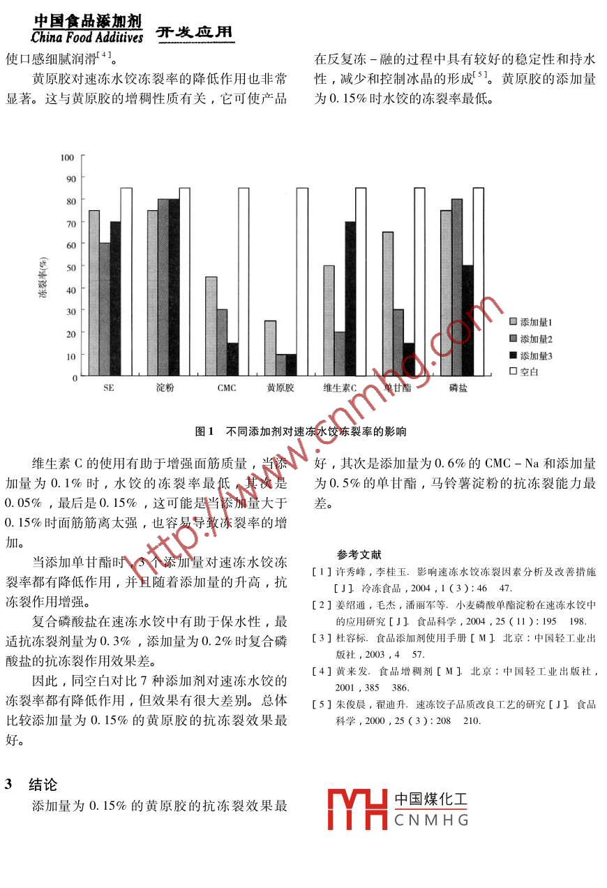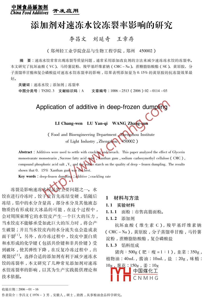 中國食品添加劑開發(fā)應(yīng)用China Food Additives添加劑對速凍水餃凍裂率影響的研究李昌文劉延奇王章存(鄭州輕工業(yè)學院食品與生物工程學院,鄭州450002 )摘要:速凍水餃常常出現(xiàn)凍裂等質(zhì)量問題,通常采用添加改良劑的方法來減少速凍凍水餃的凍裂率。本文研究了抗壞血酸( VC)馬鈴薯淀粉、羧甲基纖維素鈉( CMC- Na)蔗糖脂肪酸酯( SE)黃原膠、分子蒸餾單甘酯和復合磷酸鹽對速凍水餃凍裂率的影響,結(jié)果表明添加量為0.15%的黃原膠的抗凍裂效果最好。關(guān)鍵詞:速凍水餃;添加劑;凍裂率中圖分類號: TS202.3文獻標識碼 : A文章編號: 1006-2513 ( 2006) 02 -0114-03Application of additive in deep-frozen dumplingLI Chang-wen LU Yan-qi WANG Zhang-cun( Food and Bioengineering Department , Zhengzhou Institule :of Light Industry , Zhengzhou 450002 )Abstract : Additives were used to settle with cracking and breach. This paper analyzed the effect of Glycerinmonostearate monostearin , Sucrose fatty acid ester , Xanthan gum , sodium carboxymethyl cellulose( CMC ),compound phosphoric acid salt , Vc and the potato starch on the quality of deep - frozen dumpling. The resultsshown that 0.15% Xanthan gum was the best.Key words : deep-frozen dumpling ; additive ; crackling rate凍裂是影響速凍水餃品質(zhì)主要問題之一。水餃在進行冷凍時,餃子皮首先凍結(jié)變硬,餡隨后1材料與方法凍結(jié),餡中的水分含量高,部分水分及其他液態(tài)1.1 實驗材料物質(zhì)仍有形成較大冰晶的可能,在這個過程中,1.1.1 面粉:市售高筋面粉。會對周圍束縛它的水餃皮產(chǎn)生一個巨大的壓力,1.1.2 添加劑當水餃皮不能夠承受如此巨大的壓力時,將會產(chǎn)抗壞血酸(維生素C),羧甲基纖維素鈉生破裂;并且當水餃皮內(nèi)的水分流失也會造成表.( CMC-Na),黃原膠,分子蒸餾單甘酯,馬鈴薯面干裂。另外,在冷凍過程中,餃皮中蛋白質(zhì)淀粉,蔗糖脂肪酸酯,復合磷酸鹽和水形成的化學鍵(包括共價鍵和非共價鍵)受1.1.3餡料組成到破壞,使其彈性下降,在反復冷凍過程中,出豬肉:500g(肥:瘦=1:1),韭菜:350g,現(xiàn)裂紋[2。選擇合適的添加劑有利于減少速凍水植物油:40mL,醬油:10mL,鹽:20g,味精:餃的凍裂率,本文研究了幾種常見添加劑對速凍10g,蔥花:150g,姜:10g水餃凍裂率的影響,以其為生產(chǎn)實踐提供理論和中國煤化工技術(shù)依據(jù)。.HCNMHG收稿日期: 2006-01 -16.作者簡介:李昌文(1976-)男,安徽人,碩士,助教,從事糧油食品科學研究。114中國食品添加劑開發(fā)應(yīng)用China Food Adities1.2儀器 與設(shè)備壓面機(家用小型壓面機)低溫冰箱,冷藏柜。1.3實驗方法1.3.1速凍水 餃的生產(chǎn)工藝流程面粉」混勻-加適量水和面-→醒面-→餃子皮添加劑刀包制一+裝盤- +速凍- +成品-→貯存豬肉-→絞制-→加蔬菜和調(diào)味料-→餃子餡入1.3.2速效 水餃凍裂率評定添加量太大將面筋稀釋的結(jié)果,造成面筋質(zhì)量下凍裂率:(餃子的凍裂個數(shù)/餃子的總個數(shù))降。x 100%。1.3.3實驗設(shè)計表2單因素實驗水 餃凍裂率統(tǒng)計表選用的7種添加劑為:抗壞血酸(維生素添加劑添加量完整破裂凍裂率C)馬鈴薯淀粉、羧甲基纖維素鈉( CMC -(% )(個數(shù))Na).蔗糖脂肪酸酯( SE)黃原膠、分子蒸餾0.155157:單甘酯和復合磷酸鹽。每--種添加劑做3個不同SE0. 2026(的水平,使用量見表1[3。0.3047C0. 5075表1單因素實驗添 加劑用量淀粉0. 6068(添加量(% )0. 70添加齊130. 401145CMC- Na3C蔗糖脂肪酸酯0. 150.200. 2571:馬鈴薯淀粉0.500.600.700.1025羧甲基纖維素鈉0.40黃原膠81C黃原膠.10維生素C0.050. 0505(單甘酯維生素2(復合磷酸鹽.0. 107(0. 30652結(jié)果與分析添加劑對速凍水餃凍裂率的影響結(jié)果見表2。將表2用圖1表示出來。由表2和圖1知,同空白相比,蔗糖脂肪酸.酯(SE)的添加量為0.20%時,速凍水餃的凍裂率最低,并且大于或小于此添加量時,都不能CMC-Na對速凍水餃凍裂率的降低作用同空提高其抗凍裂能力,即0.20%的添加量為的最適白相比縣北??h苦的,并且隨著添加量的增加,添加量。中國煤化__CMC-Na的添加量為馬鈴薯淀粉的抗凍裂效果同空白相比不明0.6HCNMH G果最好。這與CMC-顯。相對而言,添加量為0.50%時抗凍裂效果較Na獨特的增稠性、懸浮性、黏合性和水分保持性好,大于此添加量時抗凍裂能力降低,這是由于等特性有關(guān),它可以增強面團的韌性、耐煮性,115中國食品添加劑開發(fā)應(yīng)用China Food Aditives使口感細膩潤滑4。在反復凍-融的過程中具有較好的穩(wěn)定性和持水黃原膠對速凍水餃凍裂率的降低作用也非常性,減少和控制冰晶的形成[5。黃原膠的添加量顯著。這與黃原膠的增稠性質(zhì)有關(guān),它可使產(chǎn)品為0.15%時水餃的凍裂率最低。00[908070605040300添加量120■添加量2■添加量30空白E淀粉CMC黃原膠維生素C單甘酯磷鹽圖1不同添加劑對速凍水餃凍裂率的影響維生素C的使用有助于增強面筋質(zhì)量,當添好,其次是添加量為0.6%的CMC-Na和添加量加量為0.1%時,水餃的凍裂率最低,其次是為0.5%的單甘酯,馬鈴薯淀粉的抗凍裂能力最0.05%,最后是0.15%,這可能是當添加量大于差。0.15%時面筋筋離太強,也容易導致凍裂率的增加。當添加單甘酯時,3個添加量對速凍水餃凍[1]許秀峰,李桂玉.影響速凍水餃凍裂因索分析及改善措施參考文獻裂率都有降低作用,并且隨著添加量的升高,抗[J]冷凍食品, 2004 ,1 (3):46 47.凍裂作用增強。[2]姜紹通,毛杰,潘麗軍等,小麥磷酸單酯淀粉在速凍水餃中復合